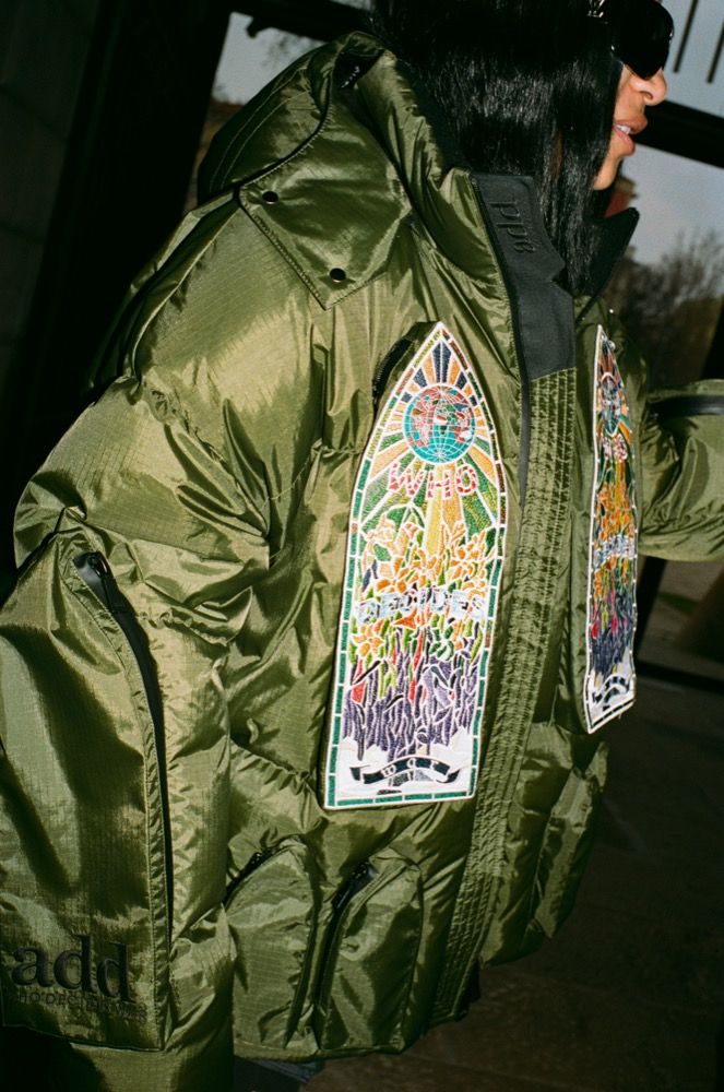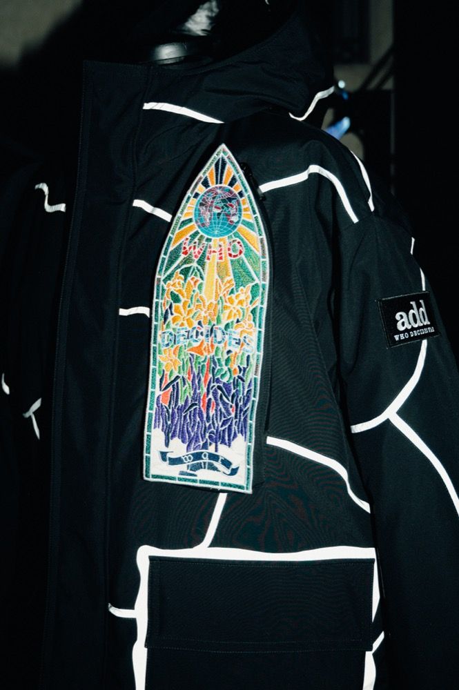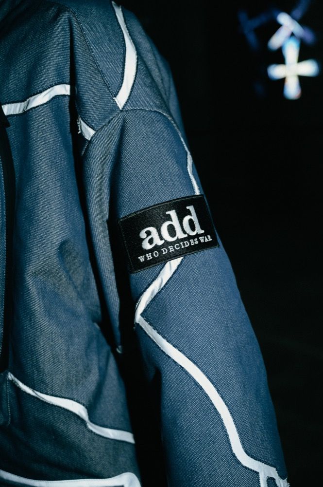 «Volevamo sviluppare l’outerwear, e volevamo farlo nel modo giusto,» spiega D’Amore, «La collaborazione con Add è stata così fluida, hanno davvero capito cosa volevamo fare. Non avevamo mai lavorato con un marchio di abbigliamento tecnico prima d’ora.» Fin dal primo meeting, Add e Who Decides War hanno saputo unire al meglio i propri strumenti di produzione, diversi tra loro e perfettamente complementari. «Quando vedi il prodotto finito è così incontaminato,» dice D’Amore a proposito della tecnicità sartoriale di Add, «L’italianità è questo: il prestigio nella manifattura degli abiti.» Ricordando con grande ammirazione il lavoro che ha compiuto Add, Téla D’Amore traccia con le dita il movimento lineare di una macchina da cucito, riprendendo i motivi e il taglio delle giacche in esposizione al centro della stanza, mentre Bravado, seduto al suo fianco, annuisce.