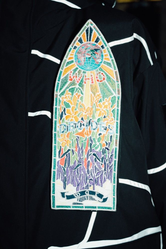 Nascosta sotto il denim strutturato di Who Decides War c’è dell’intimità, non tanto perché il brand è stato fondato da una coppia, quanto più perché ogni capo racconta la storia del designer con rara onestà: Bravado ha lanciato il suo primo brand, Lease on Life Society ancor prima di finire il liceo, producendo intere collezioni che hanno riscosso un successo imminente, indirizzandolo conseguentemente verso una vita sfrenata, marcata da abitudini autodistruttive come l’uso sregolato di sostanze stupefacenti. Nel 2016 volta pagina, e fonda il brand Ev Bravado per riscrivere le sorti della propria carriera attirando l’attenzione di creativi come Virgil Abloh, che lo ospita da Off-White™ per creare look in total denim, e di Heron Preston, per cui disegna hoodies con la grafica Anti 666, la stampa simbolo dell’autentica devozione cattolica di Bravado, ripresa tutt’oggi dal logo di Who Decides War. «All'inizio eravamo molto letterali, c'erano molte immagini del crocifisso e della Madonna,» dice Bravado, spiegando di aver minimizzato i riferimenti al Cristianesimo dopo averne discusso con amici che appartenevano ad altre religioni. «Mi dicevano: "Vorrei indossarlo, ma c'è un crocifisso", così ci siamo orientati verso la strada delle vetrate.» In “Politics As Usual” il cattolicesimo è espresso velatamente nell’inserimento di pannelli in pizzo sul denim, nell’utilizzo di collane di perle, e anche nei manici delle borse, che imitano la corona di spine di Gesù.