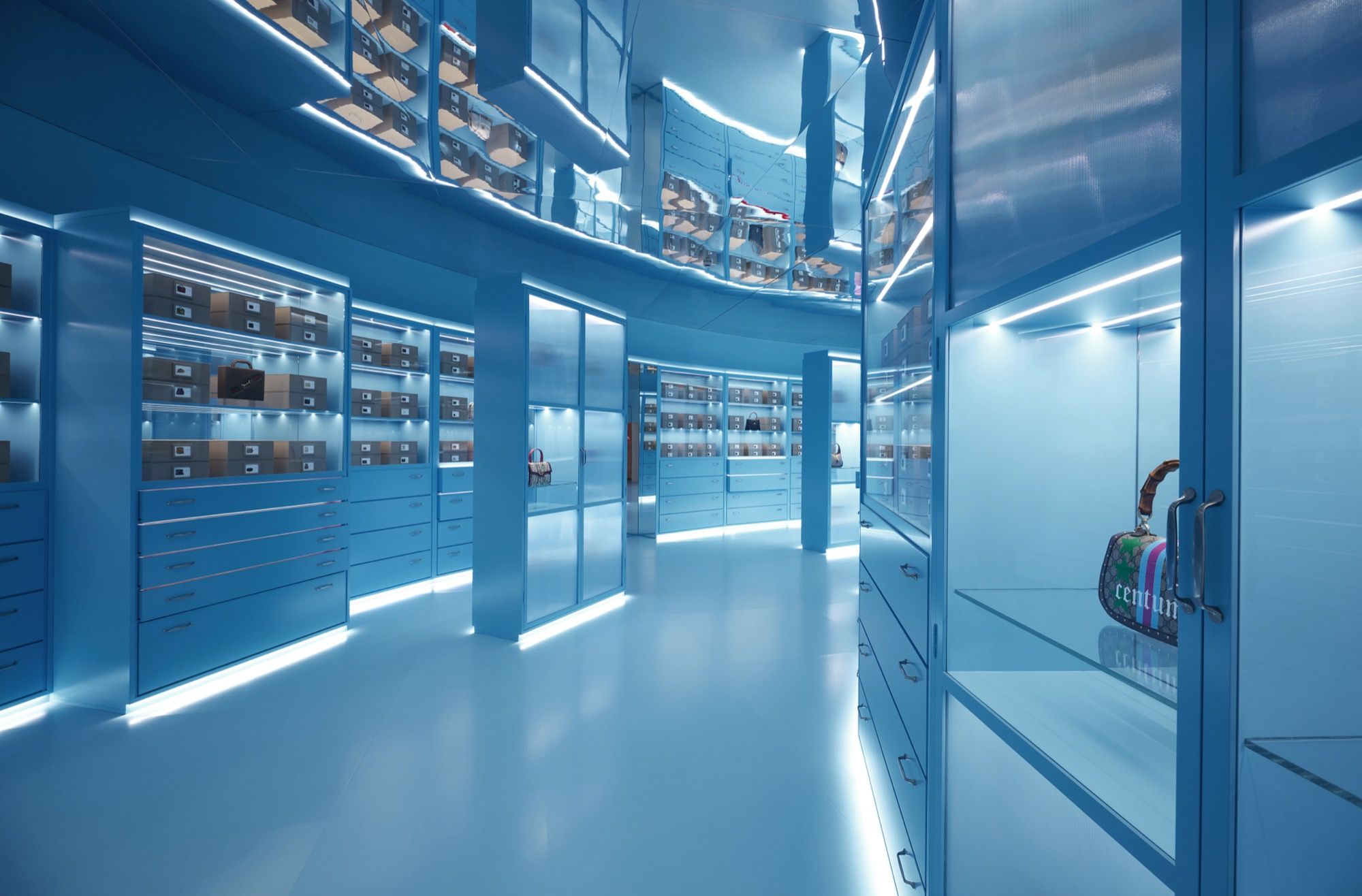 Archivio è costituito da un labirinto di corridoi, costellati a loro volta da armadi e cassetti ricchi delle borse più iconiche di Gucci ed alcune delle loro rare edizioni, e poi Cabinet of Wonders, un cubo monolitico tinto rosso scuro, svela al visitatore una selezione di capi vintage che hanno segnato la storia della Maison, riflettendo l’audacia con cui gli stilisti che hanno fatto parte di Gucci hanno interpretato i suoi codici stilistici. A seguire, una serie anacronistica propone alcuni look dagli anni ’70 ad oggi, affiancati da disegni di artisti cinesi quali Victo Ngai, Vikki Zhang, Li Jianmei e Currynew, a conferma dell’impegno di Gucci nel supportare le collaborazioni artistiche intercontinentali. L’ultimo mondo di Gucci Cosmos, Duomo, ritorna invece alle radici fiorentine del brand grazie a due riproduzioni speculari che rendono un affettuoso omaggio alla cupola di Santa Maria del Fiore disegnata da Filippo Brunelleschi. In un paesaggio caleidoscopico, Gucci Cosmos regala a ciascun visitatore un momento in cui poter lasciarsi andare, stimolati da una costellazione di luci, fiori e motivi antichi.