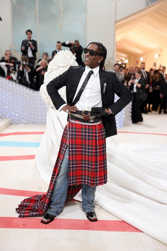 I completi indossati dagli uomini presenti al Met di quest’anno erano come di consueto abbastanza basic, nulla di nuovo rispetto alle proposte innovative viste durante le ultime fashion week, e non divertenti quanto i look scelti per le donne. Alcuni, però, hanno deciso di rendere omaggio a Karl Lagerfeld interpretando a pieno il suo personaggio copiando dalla testa ai piedi i suoi completi, parrucca esclusa. Il migliore è stato l’attore protagonista di Everything Everywhere all At Once, Ke Huy Quan, che ha percorso la sfilata di fronte ai fotografi del Met in un abito gessato blu Dior Men, guanti a mezze dita neri tempestati di anelli, e una grossa spilla al centro della cravatta, anch’essa gessata. Come lui, hanno provato a copiare il look tipico di Lagerfeld anche Asap Rocky, che si è presentato in un kilt come aveva fatto il designer per l’inchino al termine di una sfilata nel 2004, Usher, in un semplice look Bianca Saunders e guanti di pelle, e Olivier Rousteing, che ha reso omaggio ad un’iconica tote bag disegnata da Naco Paris e sfoggiata da Karl Lagerfeld nel 2009, che recitava «Karl Who?»
