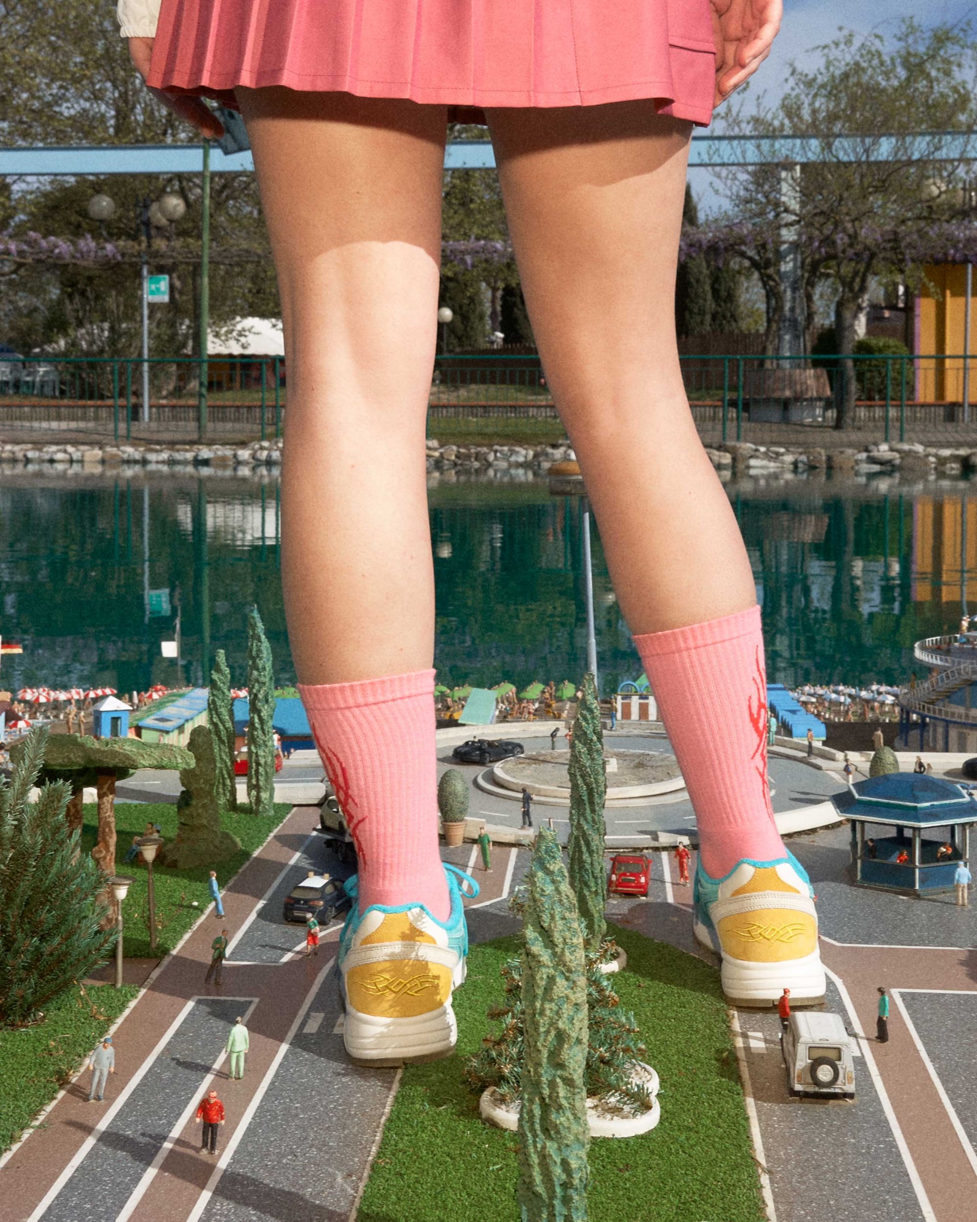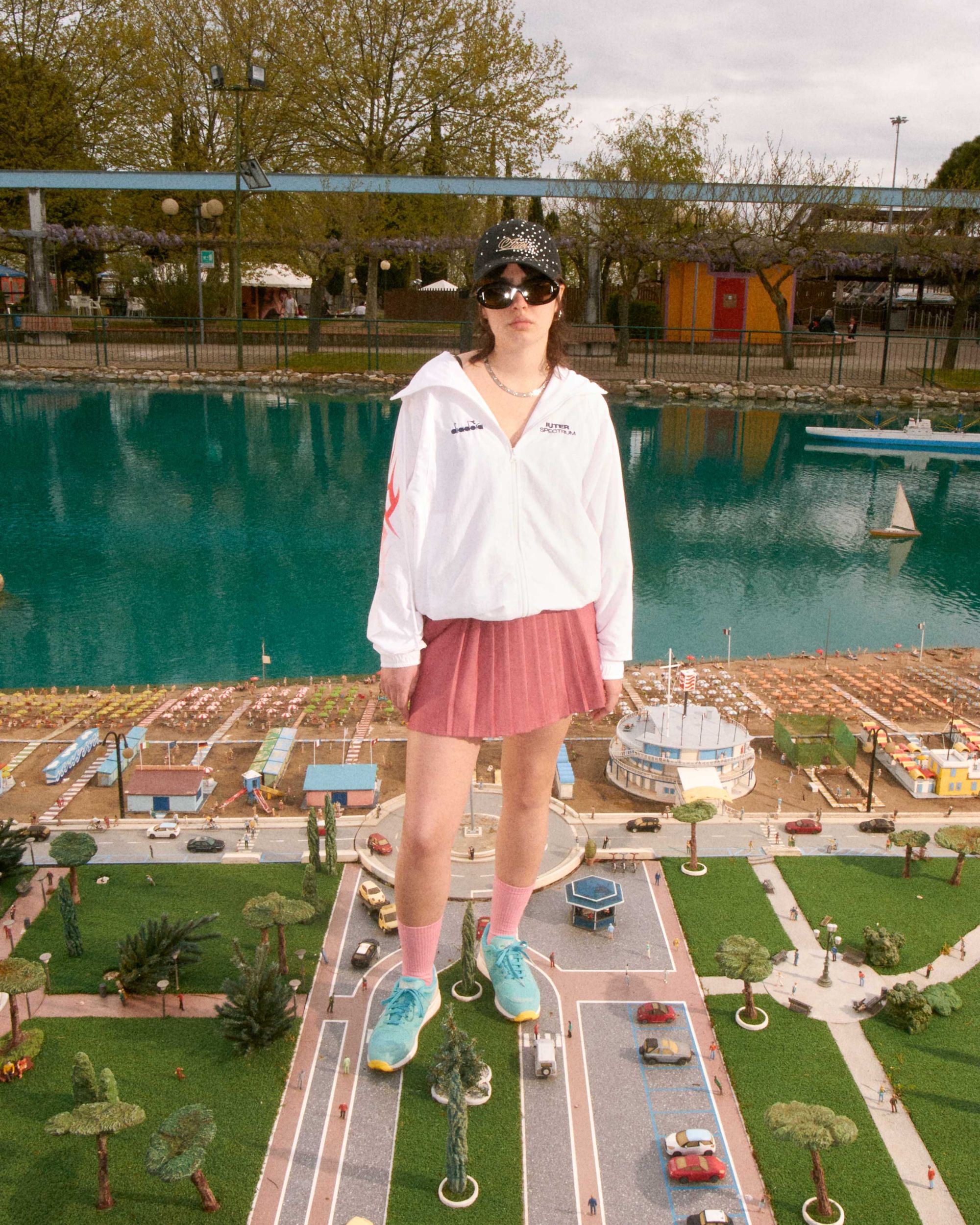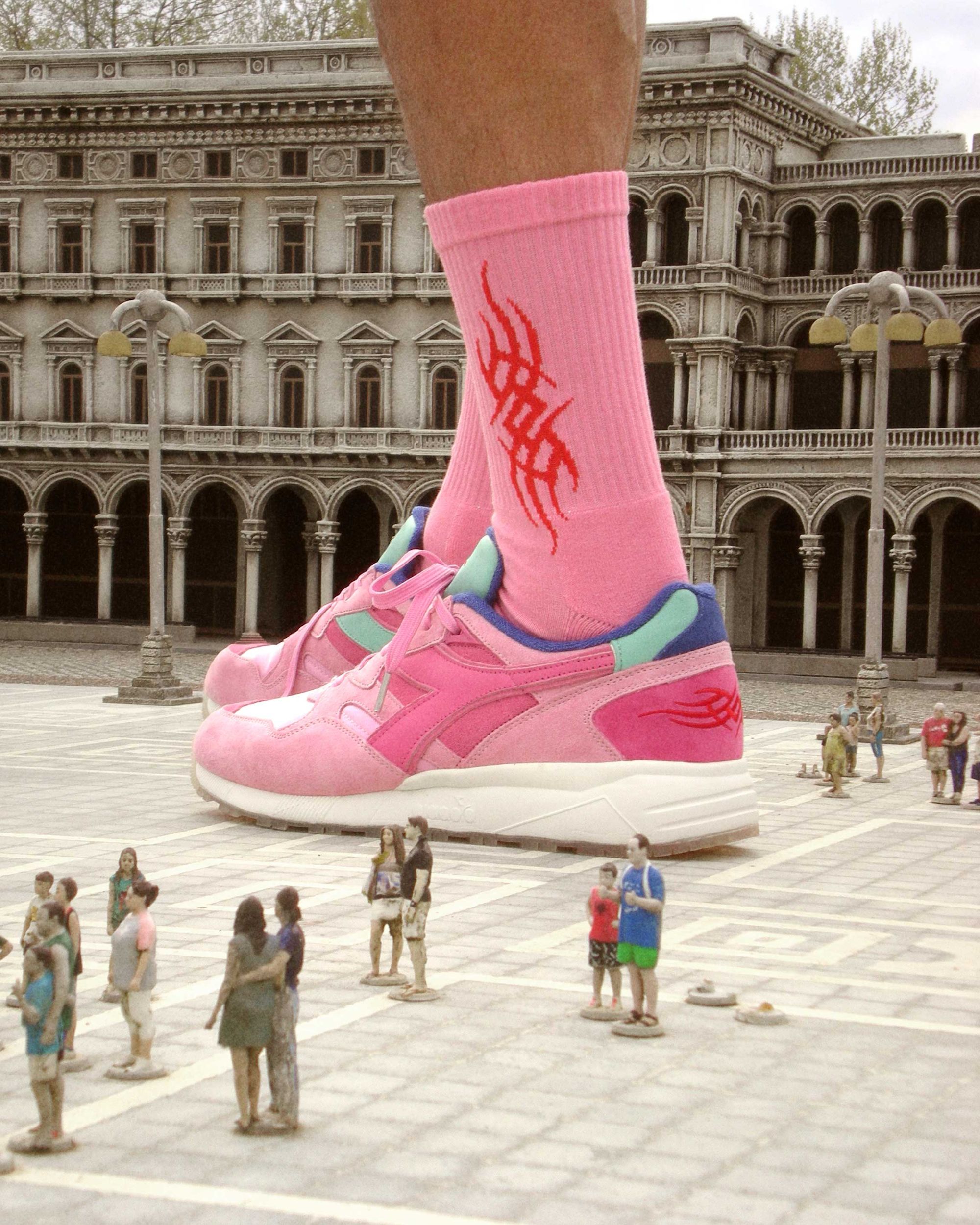 Le N9002 “Giro” sono quasi completamente rosa, con un mix di pigskin suede, pelle pieno fiore e mesh chiuso in nylon tecnico sulla tomaia. Le N9002 “Tour” invece hanno il toebox in pelle traforata. Entrambe le colorazioni hanno in comune diversi particolari custom: suola trasparente con stampa tribale, logo IUTER e SPECTRUM sulla linguetta sinistra, icona del pirata simbolo della collaborazione su quella destra, soletta stampata e lace tip a contrasto. La collaborazione a tre teste tra IUTER, Diadora e SPECTRUM include anche alcuni capi IUTER (made in Italy) realizzati per l’occasione: una Track Jacket con cappuccio bianco in tessuto traspirante e water repellent, con stampe tribali sulle maniche e loghi ricamati sul petto; una long sleeve pocket t-shirt con ricamo e stampe tribali sulle maniche; un calzino sportivo in cotone rosa con tribale rosso.