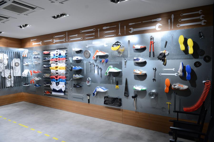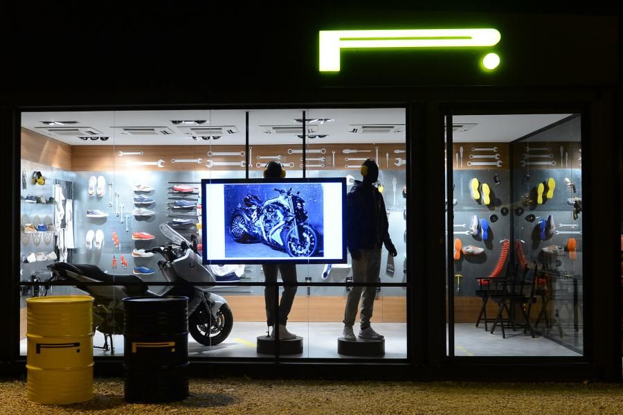 Un paddock-laboratorio dove sono ordinatamente esposti attrezzi gommati, cerchioni di moto e caschi, che si alternano a scarpe, polo e giubbotti della nuova collezione per la Primavera-Estate 2013 fortemente ispirata al mondo motorsport.