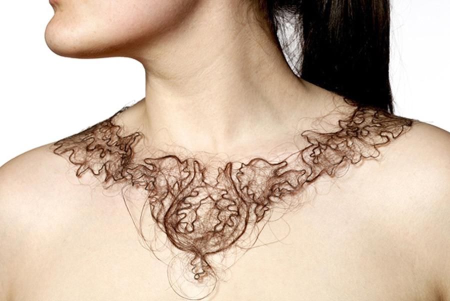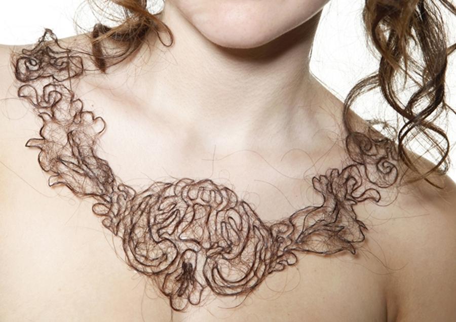 Il motivo? Basta guardarla per capire. A primo acchito sembrerebbero collane costituite di fili sottilissimi di nylon rossastri, invece l'anima di queste creazioni è qualcosa che, se vogliamo, possiede un'identità un tantino macabra. Gli intricati motivi d'ispirazione siriana, infatti, prendono vita grazie all'intreccio di capelli umani. Lunghi capelli appartenenti ad un'amica della madre di Kerry Howley, giovane designer proveniente dalla Middlesex University che, attraverso una loro scrupolosa lavorazione è come se avesse voluto regalargli una seconda vita perpetuandone, così, il loro lato attraente.