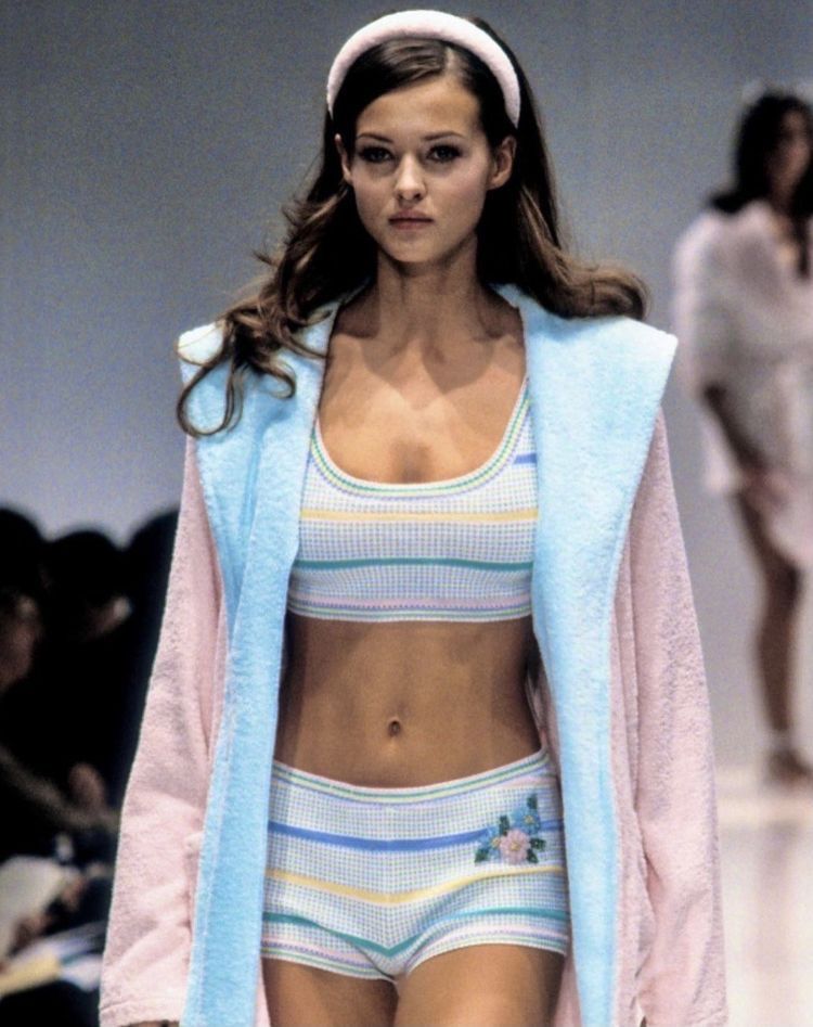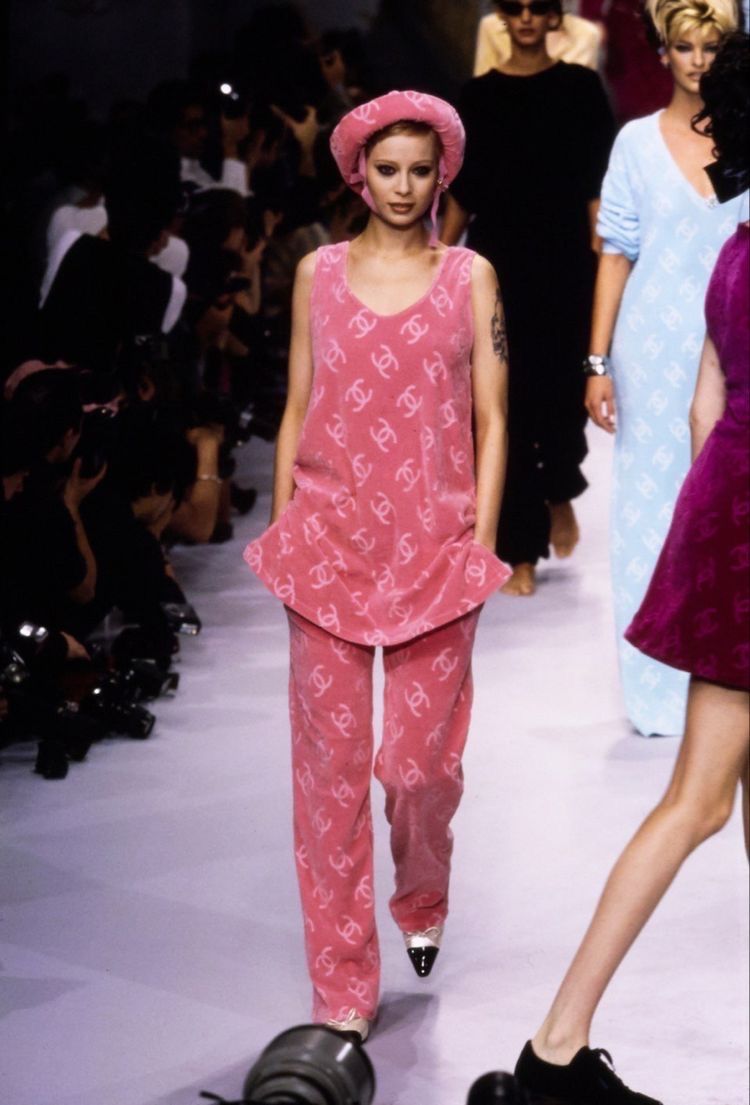 Iconica la SS96 di Chanel, una collezione prêt-à-porter che ha visto protagonisti costumi da bagno e mini dress rigorosamente in spugna color pastello, con l’emblematico monogram impresso nel tessuto. Dalle passerelle con Claudia Schiffer e Cindy Crawford alle strade di LA: l’athleisure di alta gamma ha finalmente notato le potenzialità glamour del tessuto tra la fine degli anni ‘90 e i primi 2000. Erano gli anni in cui J.Lo veniva paparazzata con una tuta da ginnastica di un colore diverso quasi ogni giorno - tanto da voler celebrare il suo amore per le tracksuit y2k nel video musicale di "I'm Real" del 2001 - mentre Paris Hilton e Kim Kardashian apparivano in look coordinati Juicy Couture, borse metalliche Louis Vuitton e cellulari Motorola Razr.
