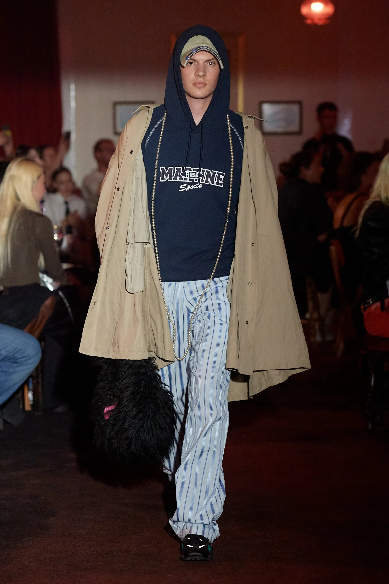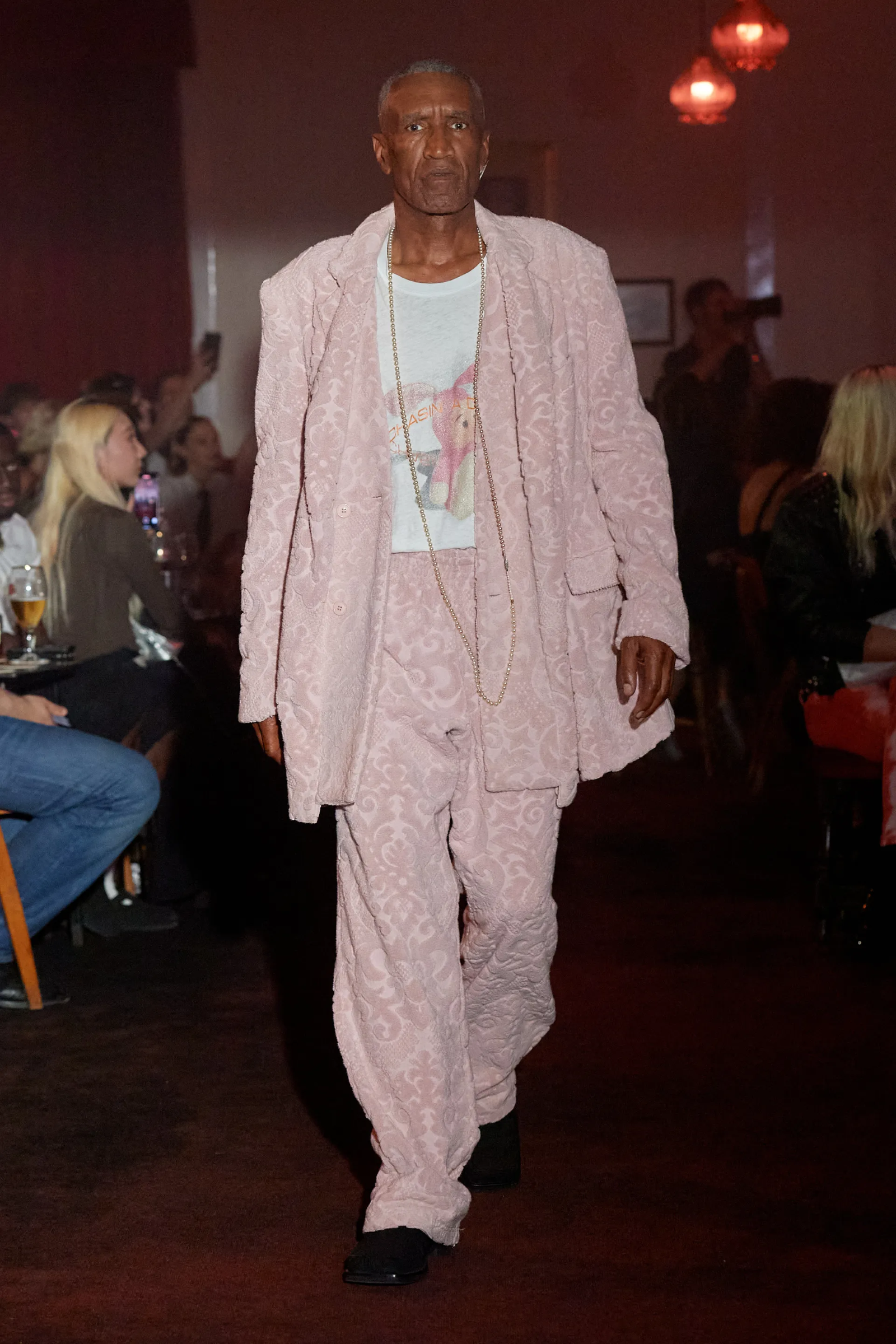 Martine Rose guarda sempre alla strada, come il suo mentore Demna, per tornare a raccontarla – con meno ironia e nostalgia che il suo maestro, ma anche senza provare a prendere il quotidiano e trasformarlo in qualcosa “da ricchi”, la sua moda è un lavoro espressivo, riguarda poco la lussificazione rapace dei codici della working class. C’è solo nobilitazione, elevazione e celebrazione di un archetipo, affettuoso racconto del presente e, in breve, un linguaggio che chi vuole può fare proprio ma che nasce per includere e non escludere, anche se sulle prime non è scontato comprenderlo. Per la collezione andata in scena ieri, Rose ha esplorato questi codici riproducendo la dimensioni eccessive e l’usura degli abiti usati, esprimendo la loro personalità singolare in maniera così spinta da raccontare, attraverso l’abbinamento degli abiti, estro e attitudini straordinariamente radicate nella realtà, quotidiani, ma anche espressivi di cambiamenti culturali più generali, riletti in un orizzonte conosciuto e riconoscibile che dunque diventa una sorta di lente con cui guardare al resto del mondo. I community center inglesi sono luoghi dove si va a ballare, poniamo, in un’atmosfera che non è quella ovattata e upscale del club esclusivo – sono posti dove comunità di quartiere, unite dalla stessa provenienza nazionale e culturale, spesso unite dalla semplice vicinanza si incontrano e si contaminano a vicenda riaffermando le proprie origini ma anche portando aggiornamenti ai "vecchi" costumi con l'inevitabile ricambio delle generazioni. Sono luoghi dove la bellezza o la desiderabilità di un abito o di un outfit non servono a prevaricare e conquistare gli altri o a sfuggire verso realtà di sogno ma a esprimere se stessi come individui e come parte di un gruppo. La dimensione è nota, rilassata ma anche profondamente originale dato che si risponde a esigenze più genuine del rimarcare il proprio status sociale.