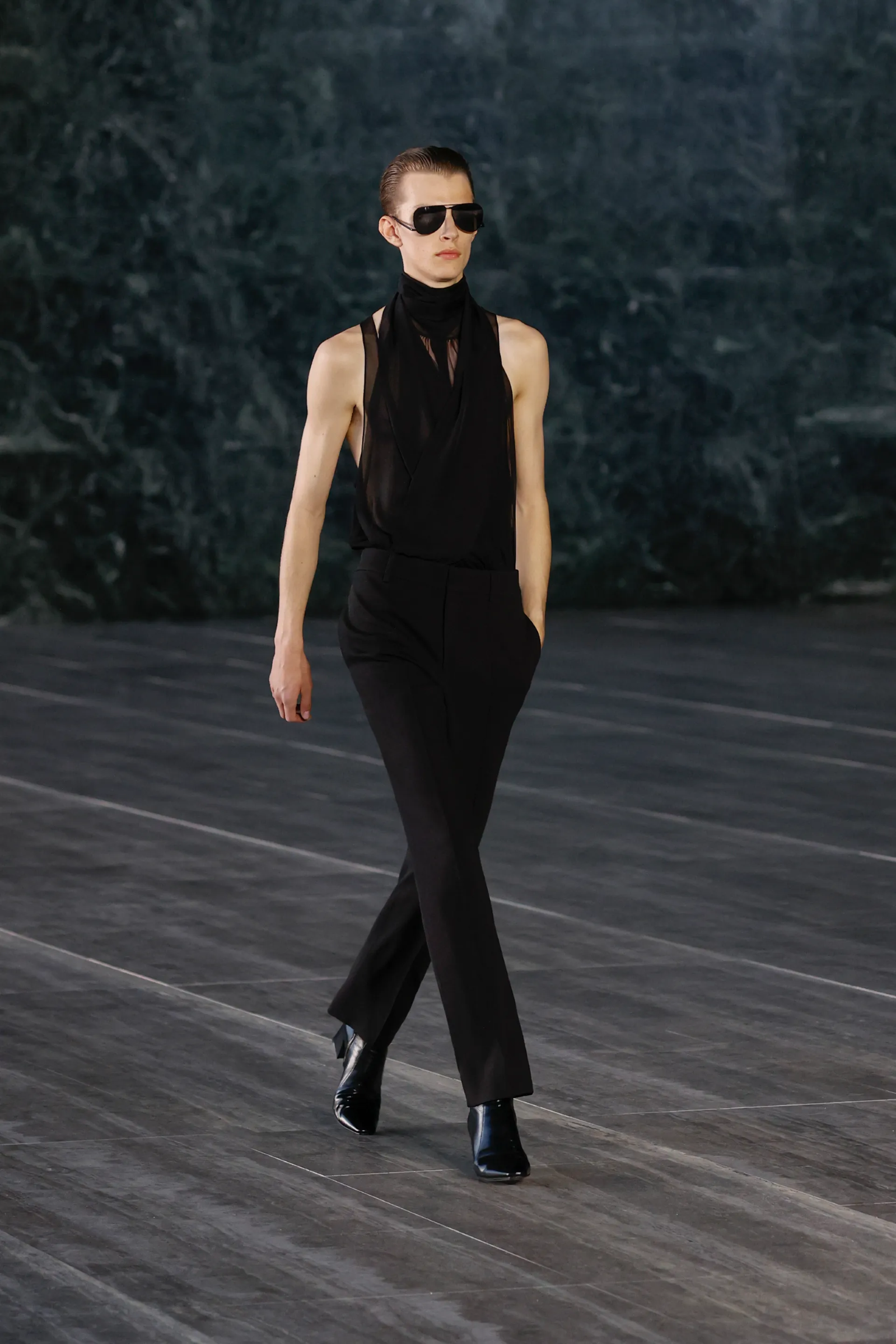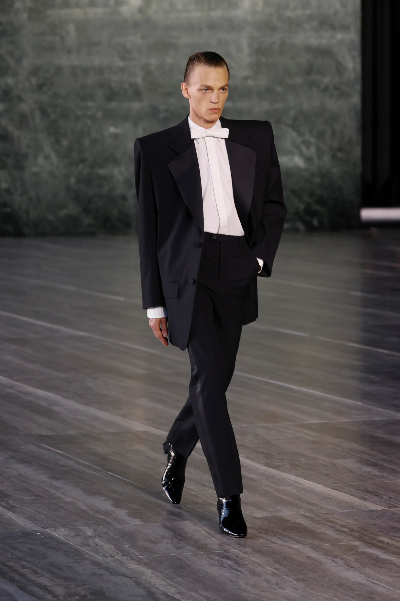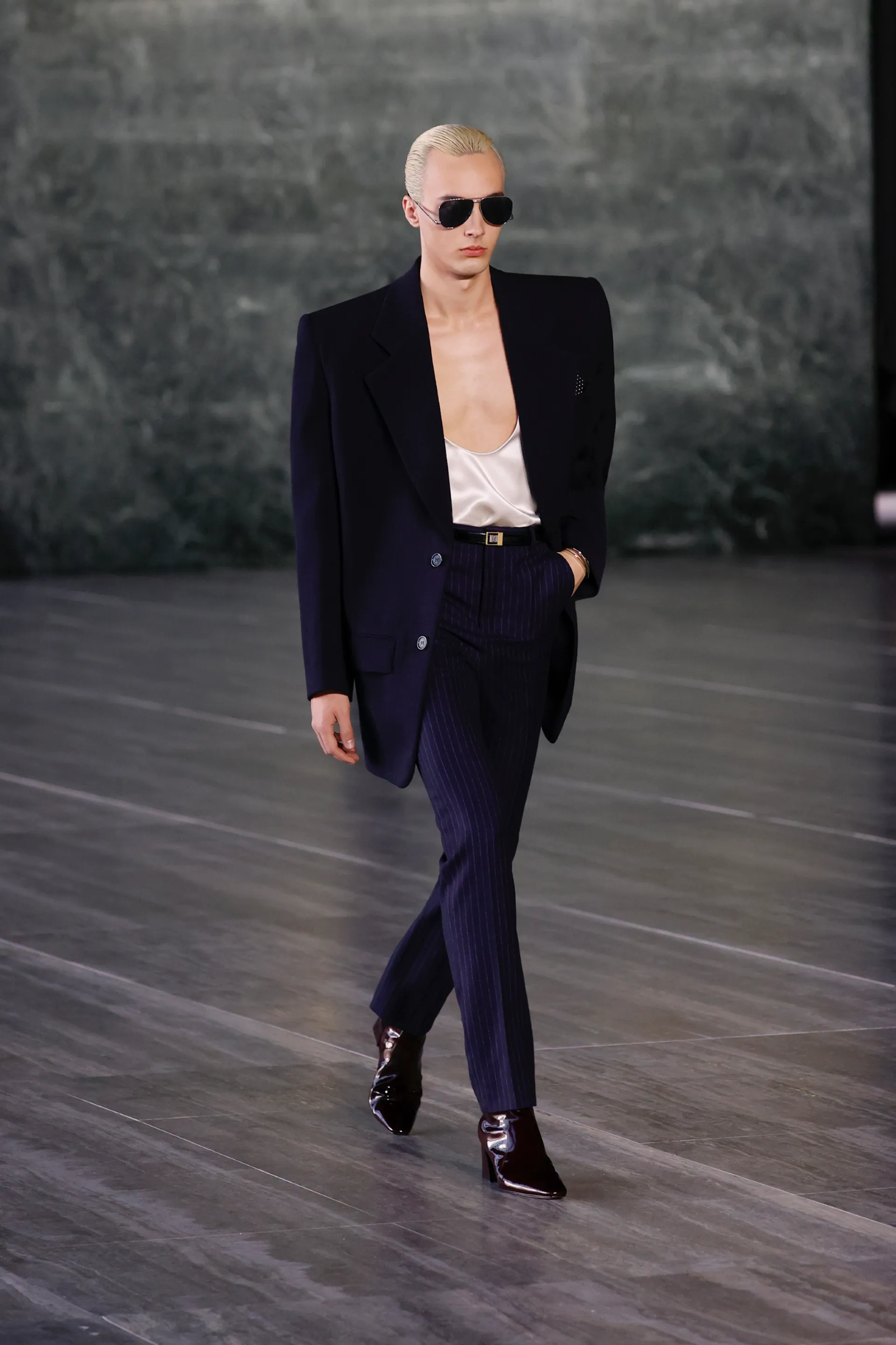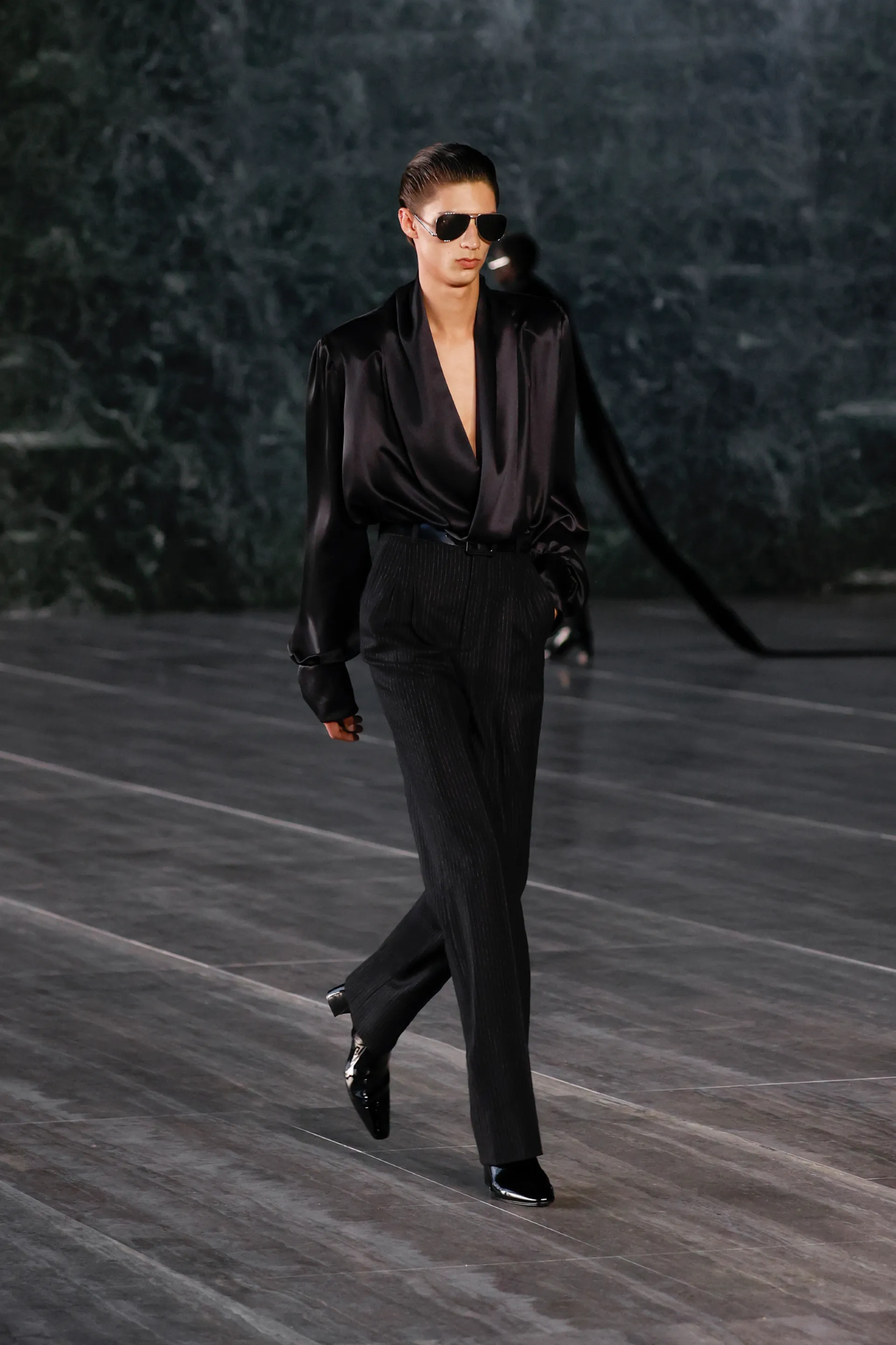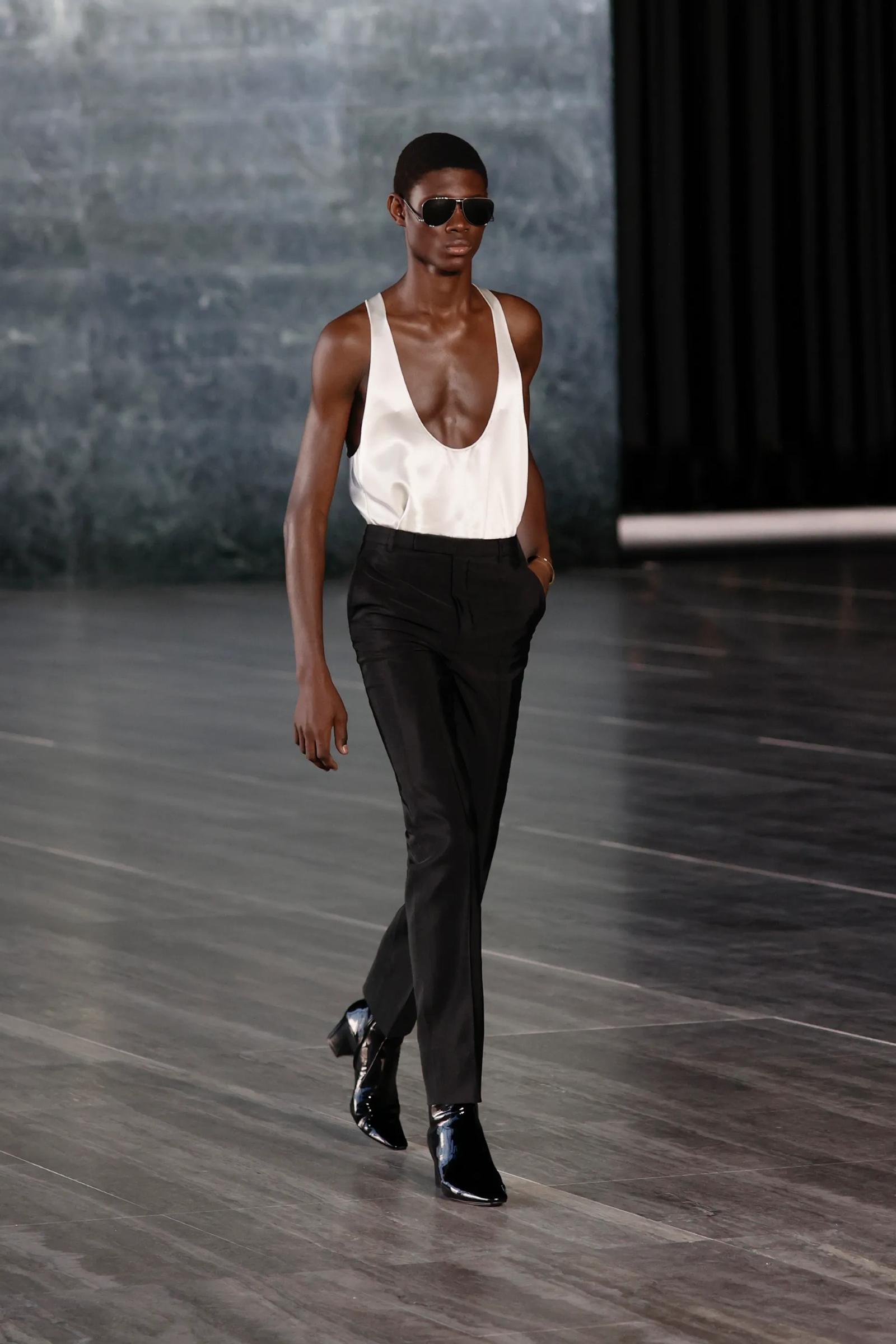 Ma al di là dei top privi di schiena, degli chiffon trasparenti, degli strascichi e delle canotte in satin scollate fino all’ombelico, si scoprono le tracce di un sensuale e molto più indossabile minimalismo. Forse andando contro l’opinione generale, possiamo dire che il look più sorprendente dello show è composto da una t-shirt squadrata di satin bianco dal collo spesso infilata in un paio di pantaloni a vita alta con una cintura dalla grossa fibbia e gli onnipresenti stivali. Un look che esemplifica come taglio e materiali possano sublimare all’infinito un ensemble incredibilmente portabile – un design così semplice e sofisticato a un tempo da sembrare quasi privo di sforzo, un lusso inequivocabile ma anche profondamente quotidiano in cui la vision di Vaccarello è compressa e concentrata all’ennesima potenza. Forse è questa la direzione in cui il direttore creativo dovrebbe portare il menswear del brand, spostando verso i margini l'abbigliamento da sera più concettuale e provando a rielaborare ed elevare una proposta concreta di guardaroba quotidiano attraverso dei codici che non sono mai stati più definiti, forti e precisi.