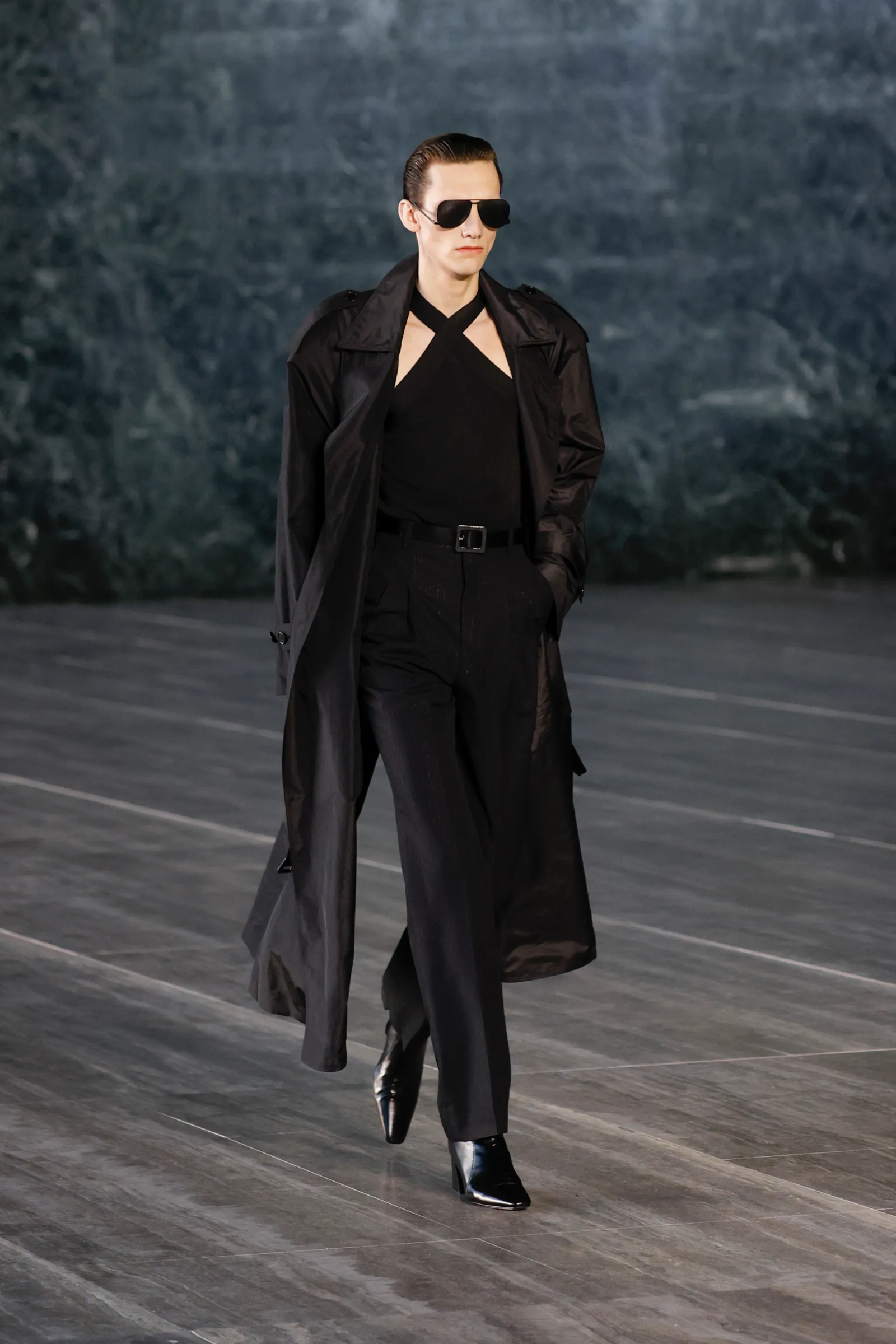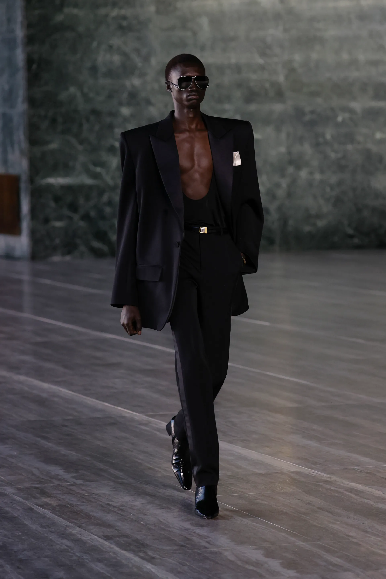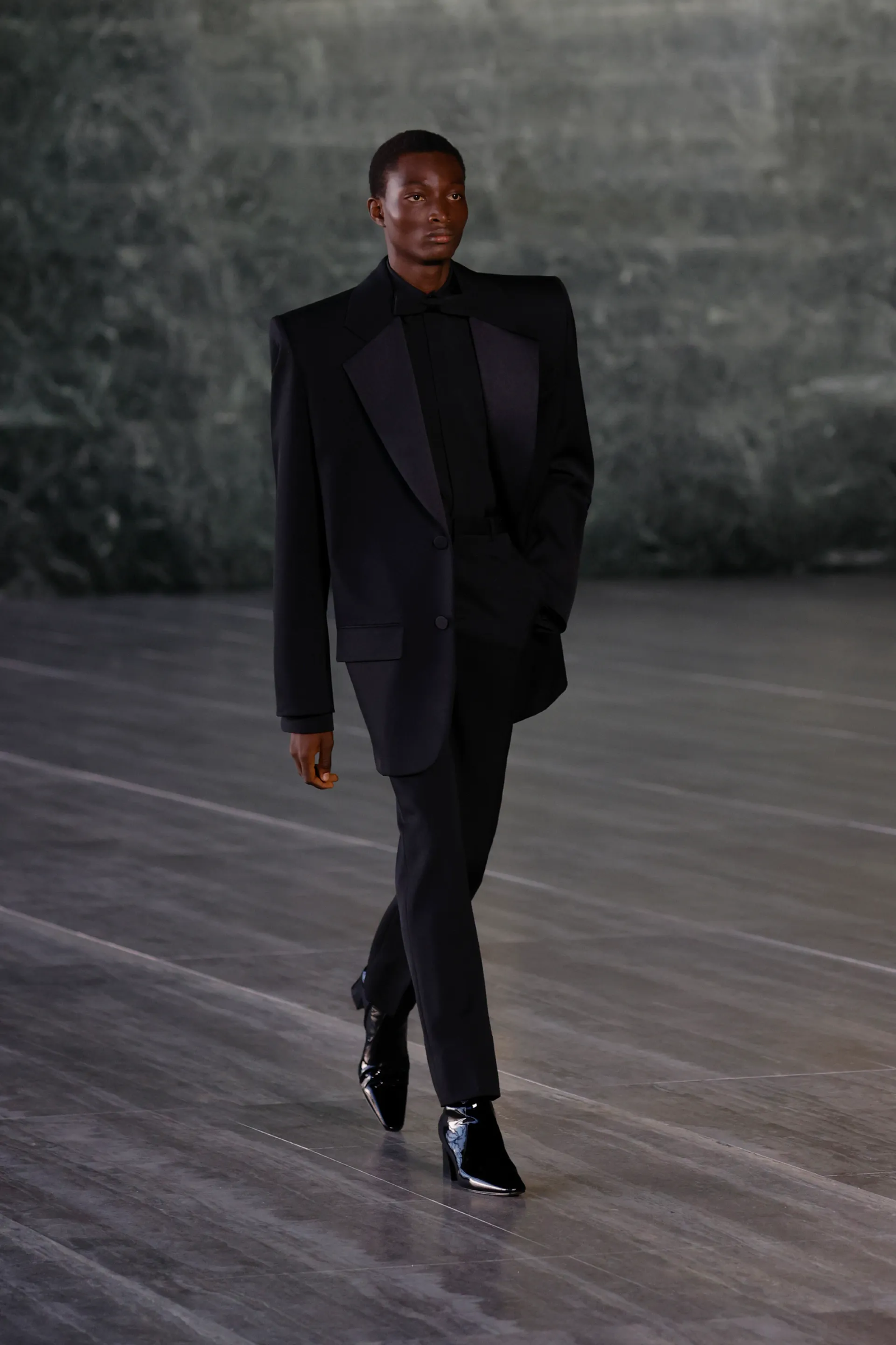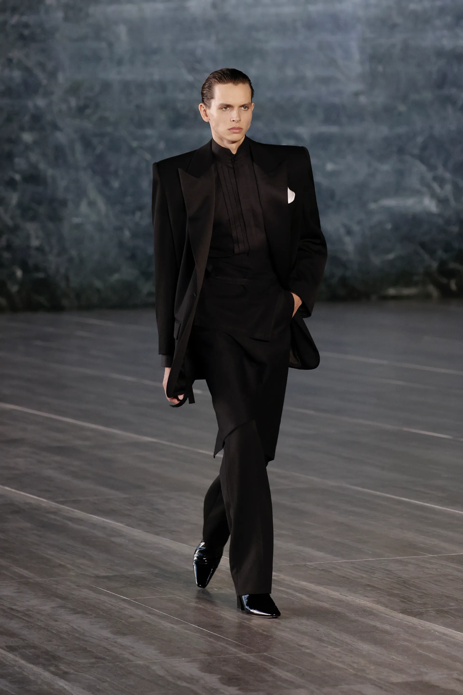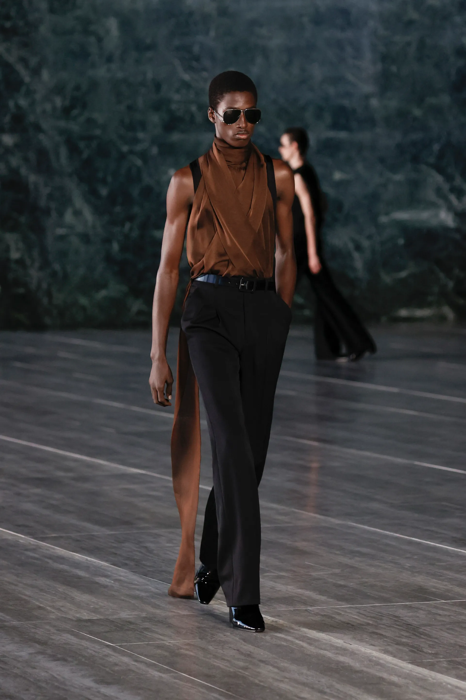 Ma al di là dei top privi di schiena, degli chiffon trasparenti, degli strascichi e delle canotte in satin scollate fino all’ombelico, si scoprono le tracce di un sensuale e molto più indossabile minimalismo. Forse andando contro l’opinione generale, possiamo dire che il look più sorprendente dello show è composto da una t-shirt squadrata di satin bianco dal collo spesso infilata in un paio di pantaloni a vita alta con una cintura dalla grossa fibbia e gli onnipresenti stivali. Un look che esemplifica come taglio e materiali possano sublimare all’infinito un ensemble incredibilmente portabile – un design così semplice e sofisticato a un tempo da sembrare quasi privo di sforzo, un lusso inequivocabile ma anche profondamente quotidiano in cui la vision di Vaccarello è compressa e concentrata all’ennesima potenza. Forse è questa la direzione in cui il direttore creativo dovrebbe portare il menswear del brand, spostando verso i margini l'abbigliamento da sera più concettuale e provando a rielaborare ed elevare una proposta concreta di guardaroba quotidiano attraverso dei codici che non sono mai stati più definiti, forti e precisi.