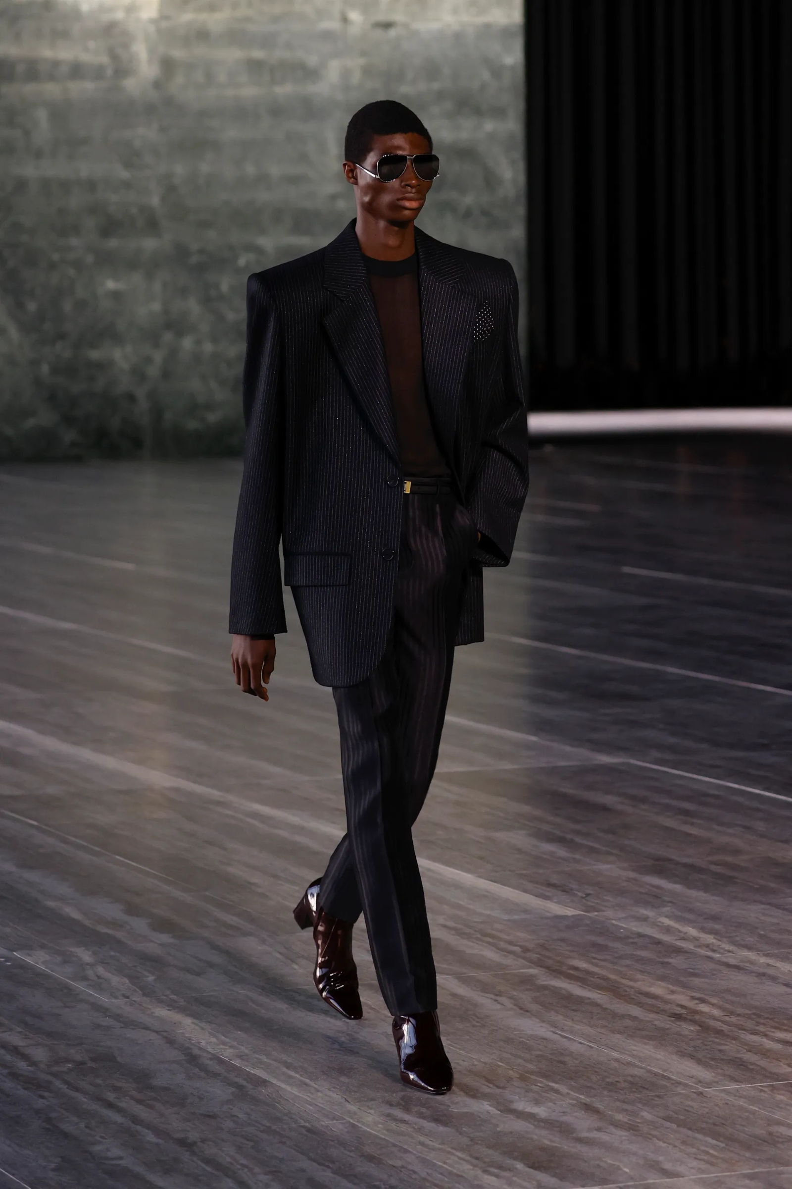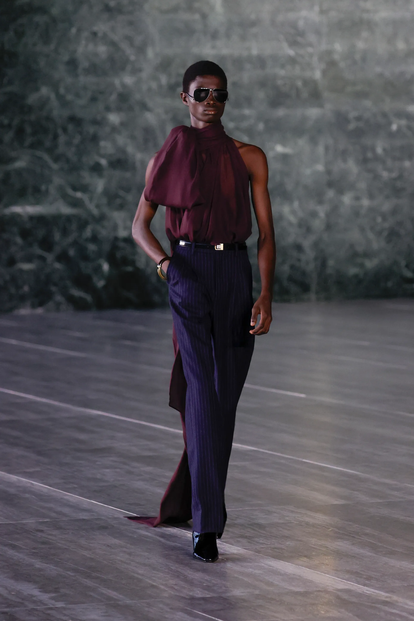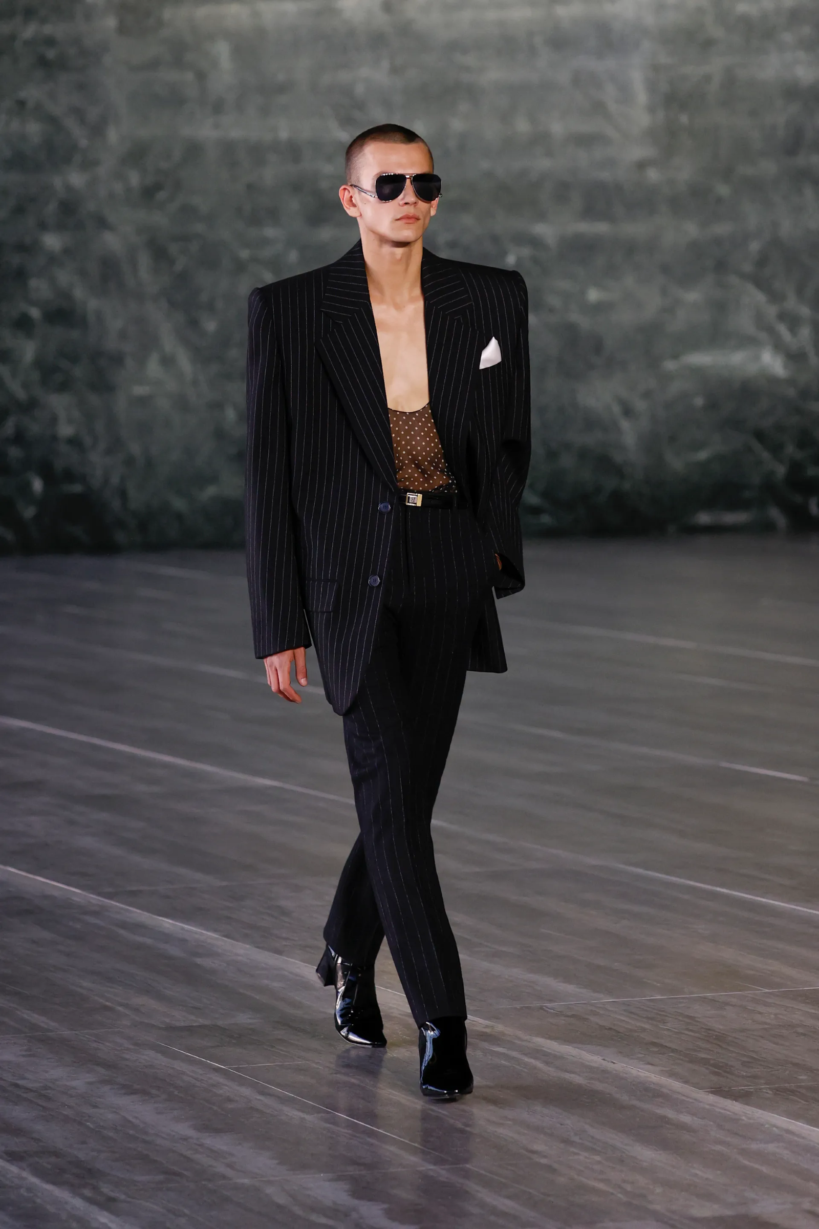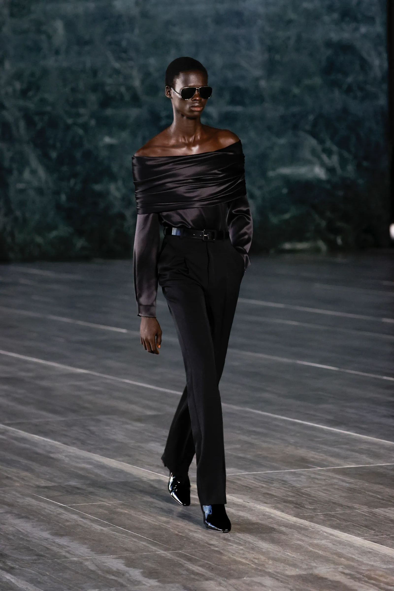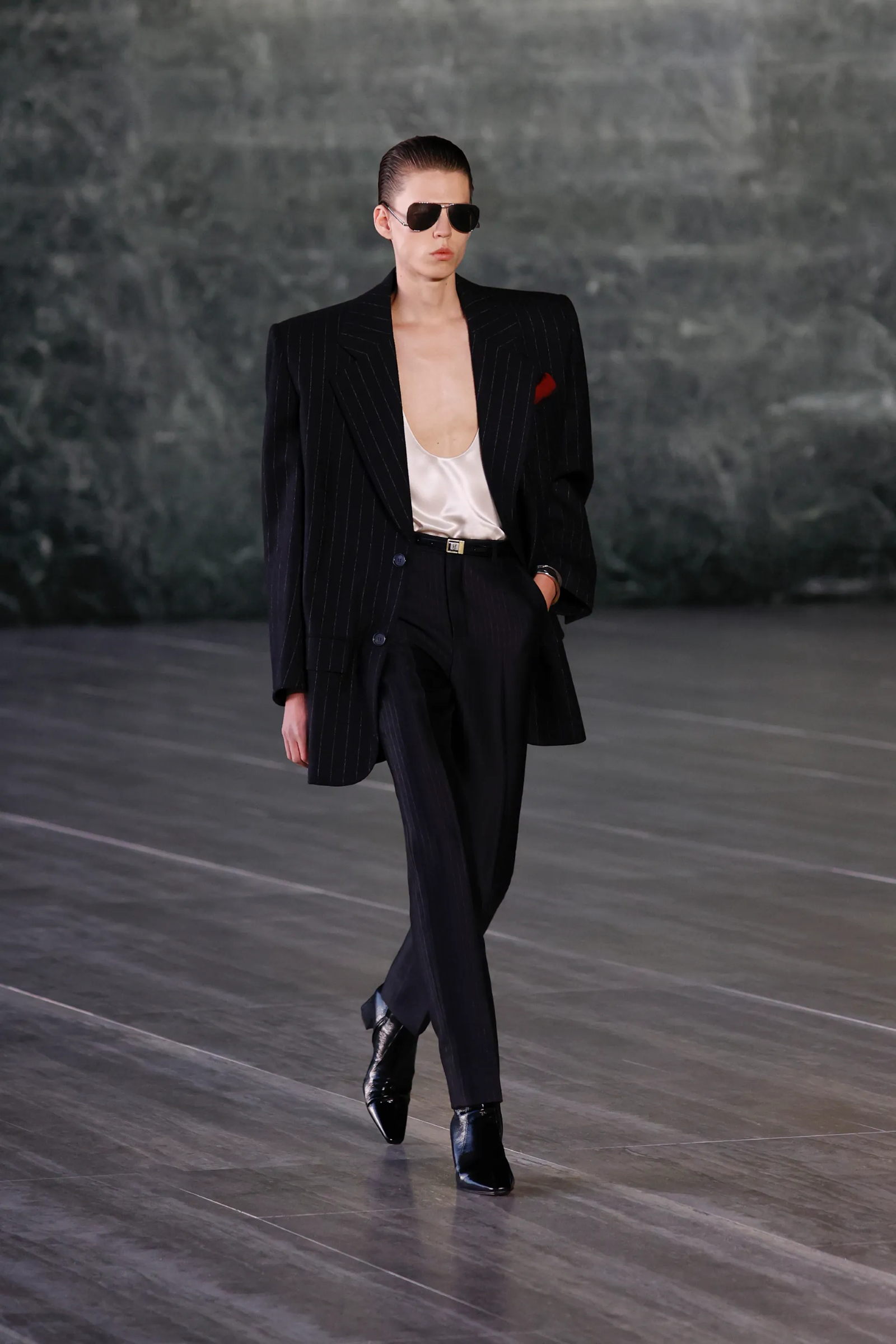 Ma al di là dei top privi di schiena, degli chiffon trasparenti, degli strascichi e delle canotte in satin scollate fino all’ombelico, si scoprono le tracce di un sensuale e molto più indossabile minimalismo. Forse andando contro l’opinione generale, possiamo dire che il look più sorprendente dello show è composto da una t-shirt squadrata di satin bianco dal collo spesso infilata in un paio di pantaloni a vita alta con una cintura dalla grossa fibbia e gli onnipresenti stivali. Un look che esemplifica come taglio e materiali possano sublimare all’infinito un ensemble incredibilmente portabile – un design così semplice e sofisticato a un tempo da sembrare quasi privo di sforzo, un lusso inequivocabile ma anche profondamente quotidiano in cui la vision di Vaccarello è compressa e concentrata all’ennesima potenza. Forse è questa la direzione in cui il direttore creativo dovrebbe portare il menswear del brand, spostando verso i margini l'abbigliamento da sera più concettuale e provando a rielaborare ed elevare una proposta concreta di guardaroba quotidiano attraverso dei codici che non sono mai stati più definiti, forti e precisi.