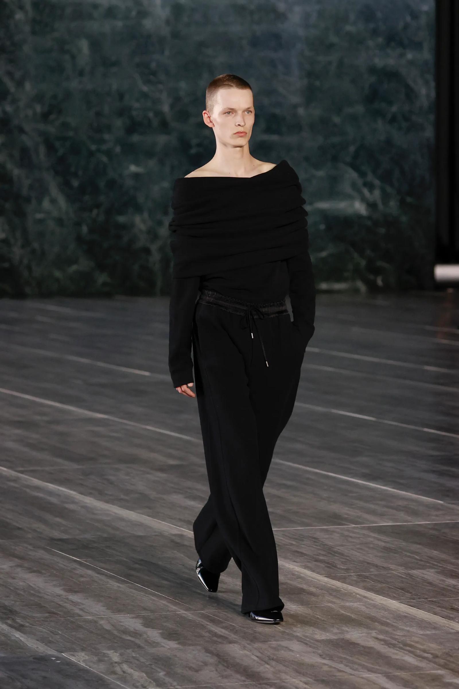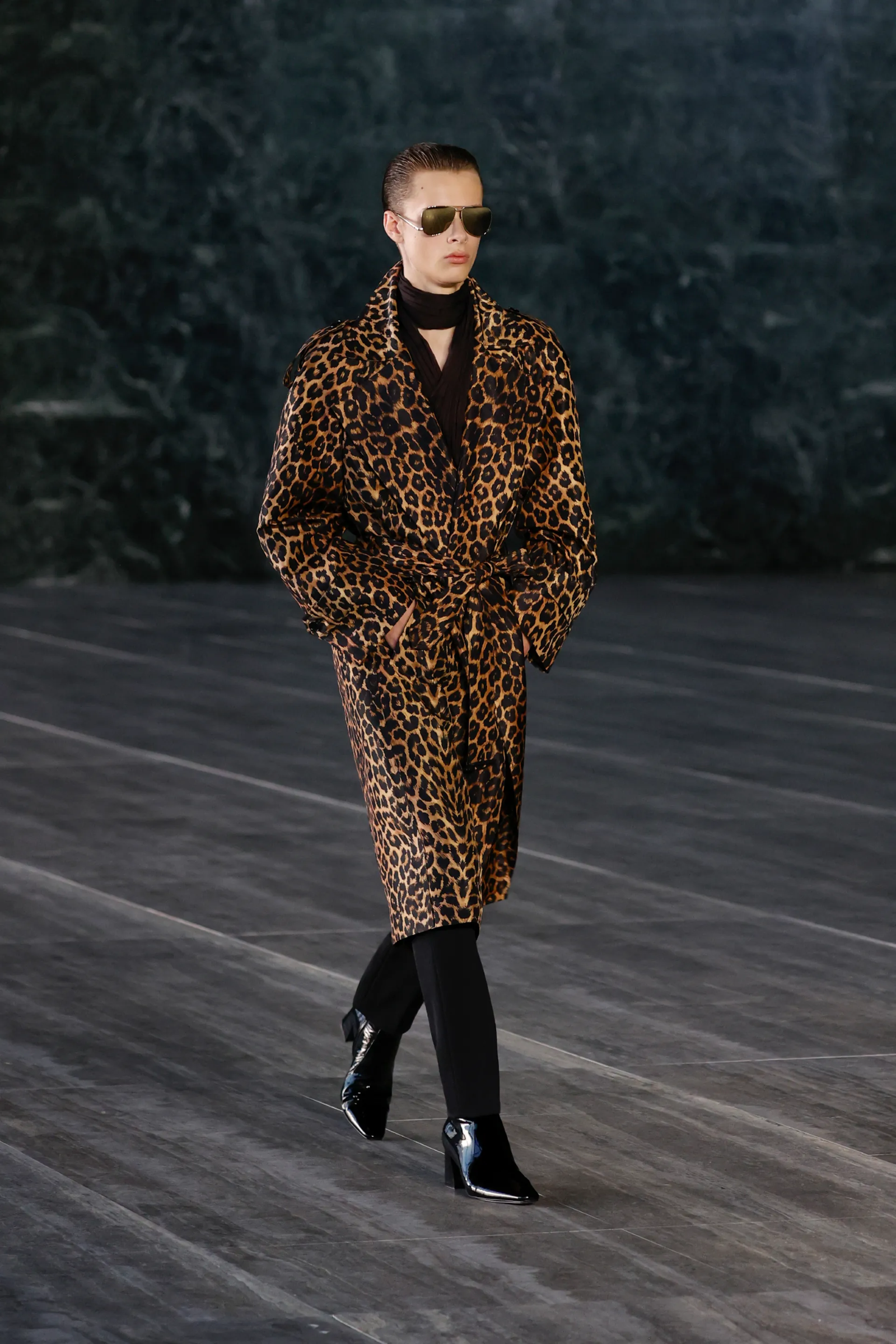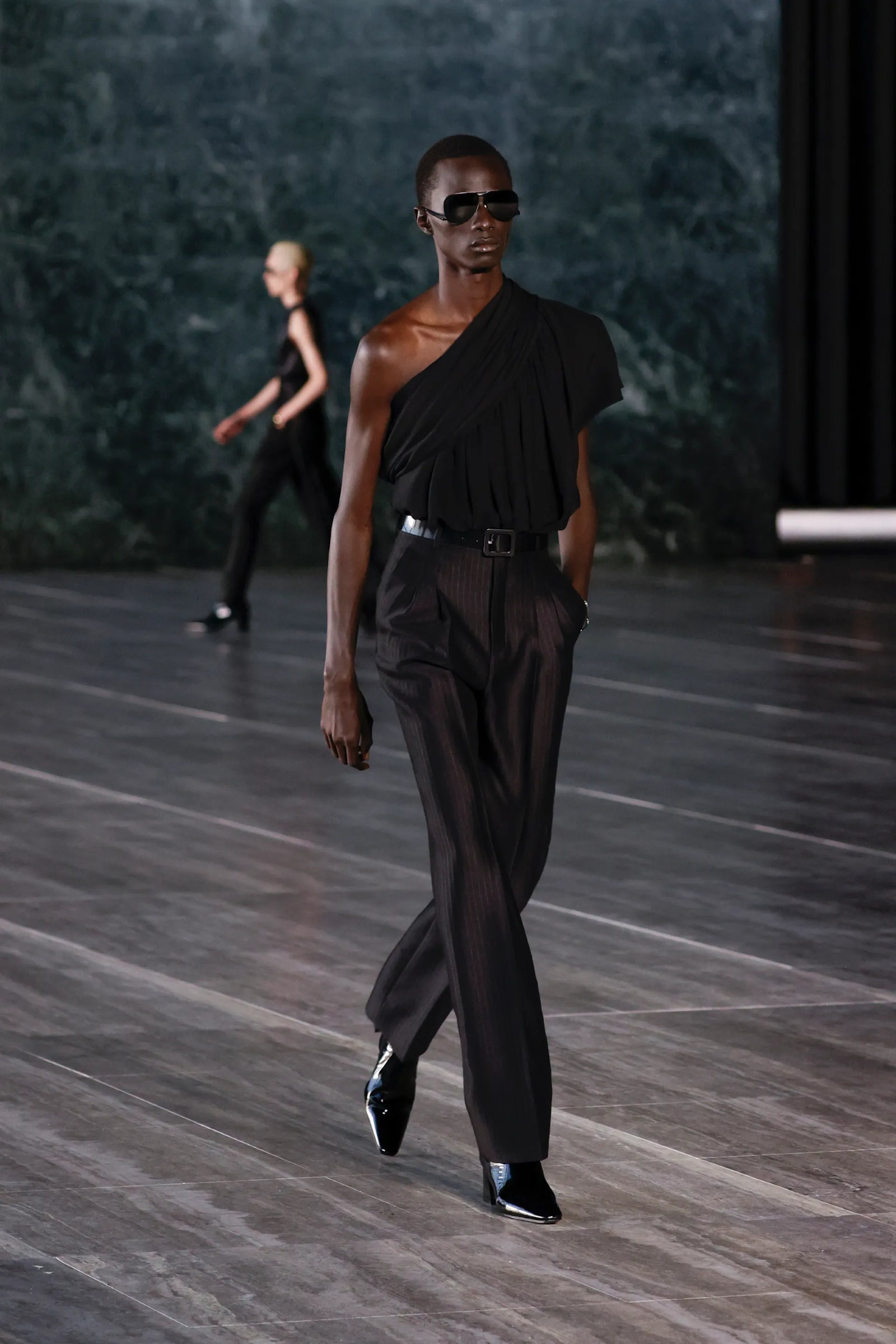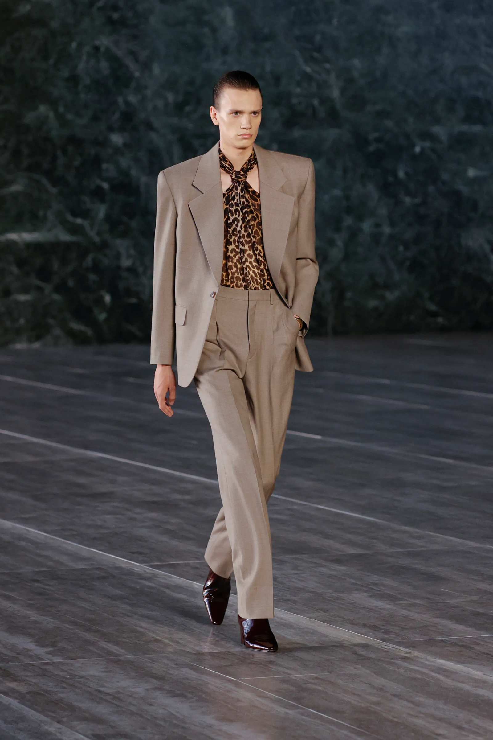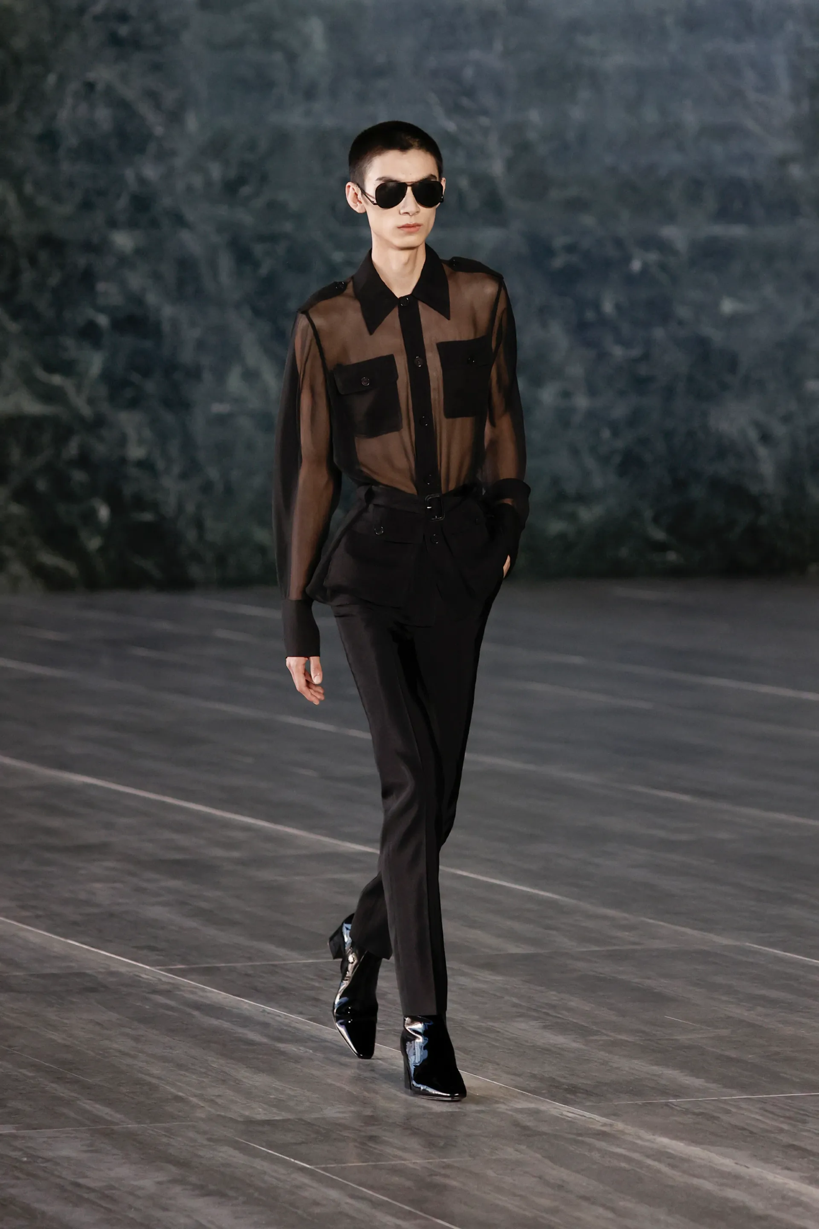 Ma al di là dei top privi di schiena, degli chiffon trasparenti, degli strascichi e delle canotte in satin scollate fino all’ombelico, si scoprono le tracce di un sensuale e molto più indossabile minimalismo. Forse andando contro l’opinione generale, possiamo dire che il look più sorprendente dello show è composto da una t-shirt squadrata di satin bianco dal collo spesso infilata in un paio di pantaloni a vita alta con una cintura dalla grossa fibbia e gli onnipresenti stivali. Un look che esemplifica come taglio e materiali possano sublimare all’infinito un ensemble incredibilmente portabile – un design così semplice e sofisticato a un tempo da sembrare quasi privo di sforzo, un lusso inequivocabile ma anche profondamente quotidiano in cui la vision di Vaccarello è compressa e concentrata all’ennesima potenza. Forse è questa la direzione in cui il direttore creativo dovrebbe portare il menswear del brand, spostando verso i margini l'abbigliamento da sera più concettuale e provando a rielaborare ed elevare una proposta concreta di guardaroba quotidiano attraverso dei codici che non sono mai stati più definiti, forti e precisi.