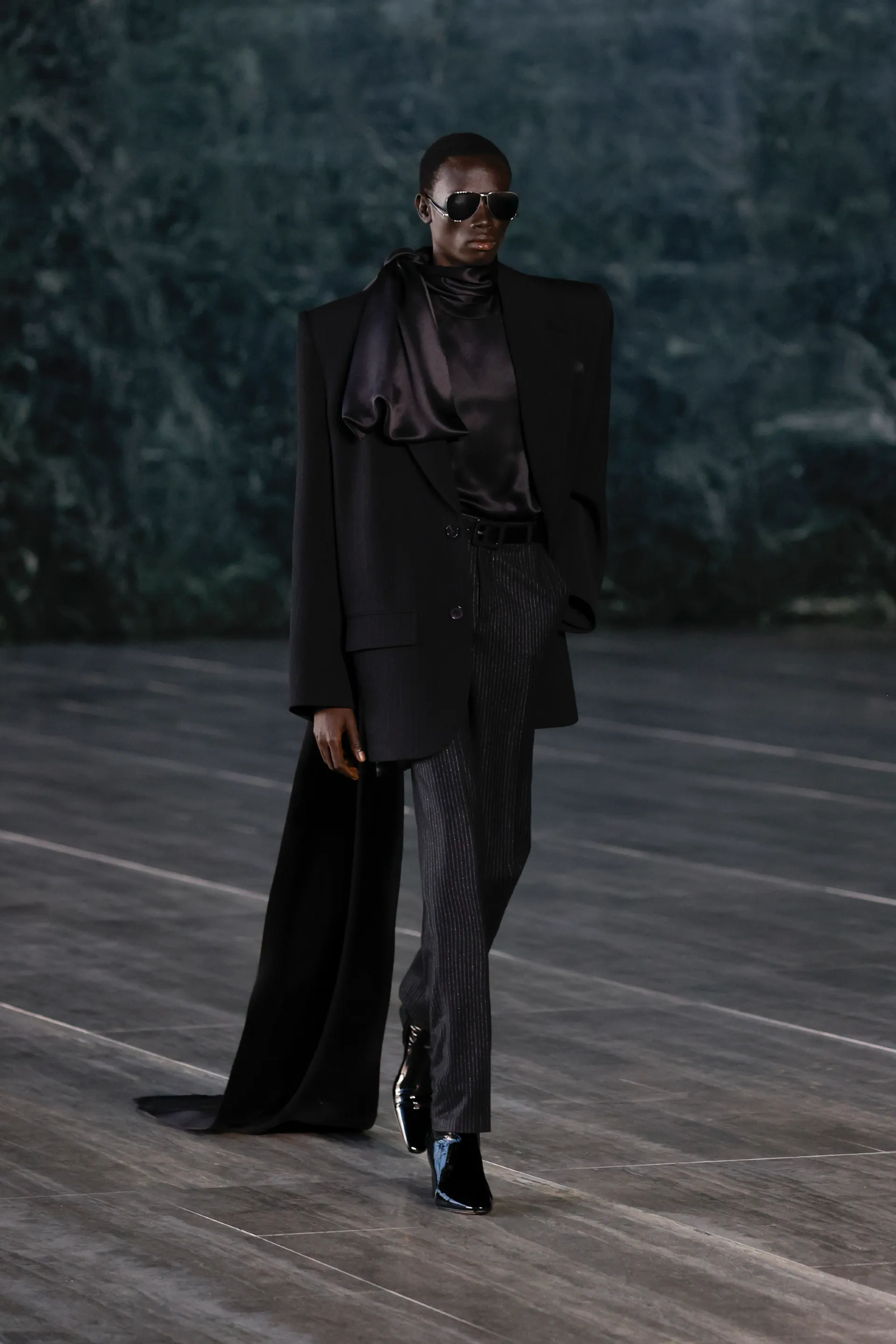 Stivali neri, lunghissime gambe fasciate da pantaloni dal taglio impeccabile, maglie e camicie di satin fluente e occhiali d’aviatore che paiono usciti da un video dei The Sisters of Mercy: questa è la divisa del nuovo uomo Saint Laurent – o forse dovremmo dire “ragazzo” Saint Laurent dato che un buon numero di questi look, eccettuati forse gli smoking e le power suit anni ’80, sono pensati per vestire corpi efebici, dalla pelle immacolata e dai tricipiti tonici. È interessante, comunque, notare come i codici anni ’80 di Saint Laurent, estremamente drammatici e signorili ma spesso anche rigonfi, pomposi e fin troppo impostati, siano stati spogliati fino all’osso da Vaccarello che comunque ne ha colto l’essenza e il fascino. Paradossalmente, questa idea di sontuoso minimalismo concepita da Vaccarello si fonda proprio sull’epoca più sfarzosa e ornata del brand, quella che avrebbe preceduto di poco il suo tracollo a inizio anni ’90. Forse memore di un’epoca del brand ora iconica ma all’epoca profondamente instabile, il direttore creativo ha concepito una visione, rispecchiata tanto nei look che nella location, che non era quella di una scarna austerità, anzi, ma di una presentazione e di ensemble puliti e stringati in cui il fascino di un singolo elemento (il drappeggio, la consistenza dei materiali) potesse lampeggiare puro, senza gli impicci di uno styling sovraccarico.