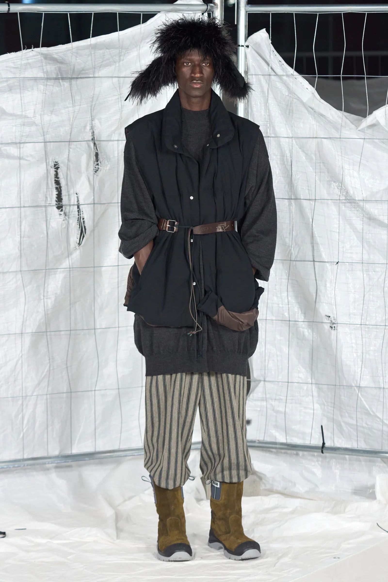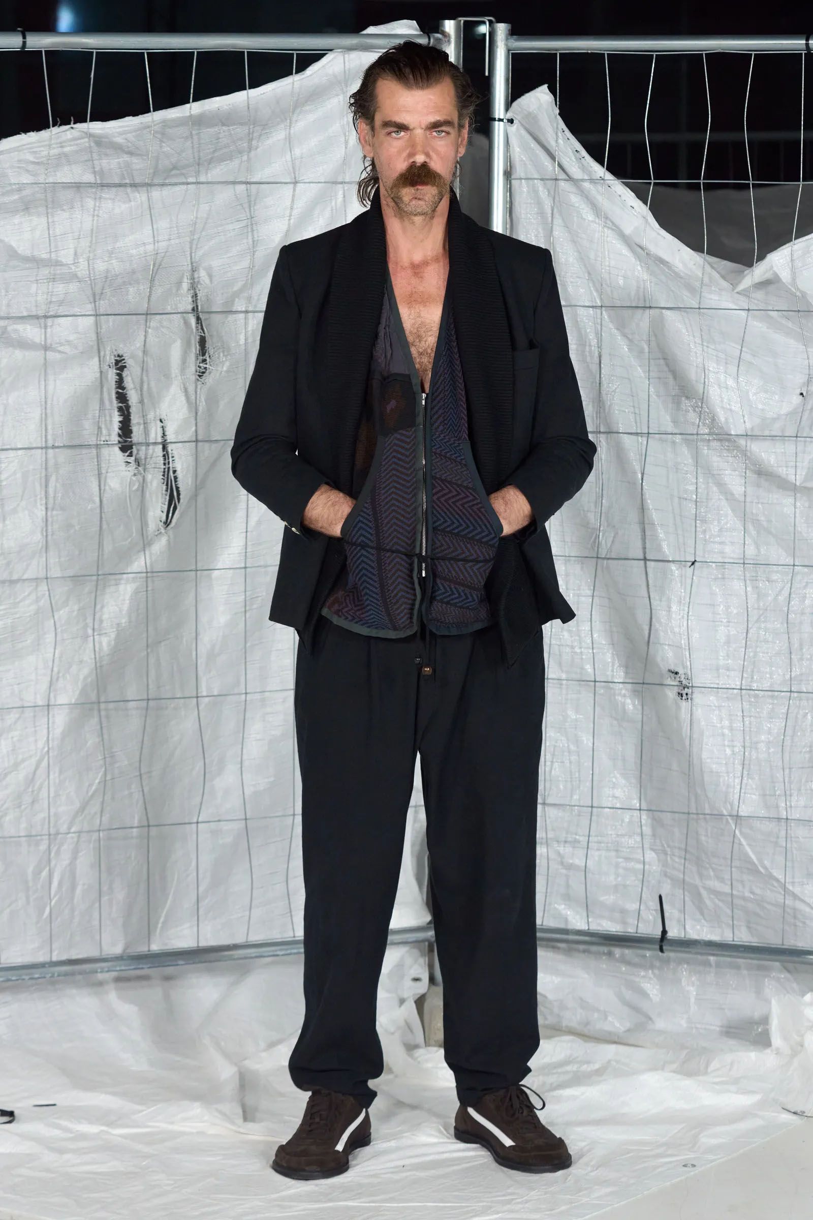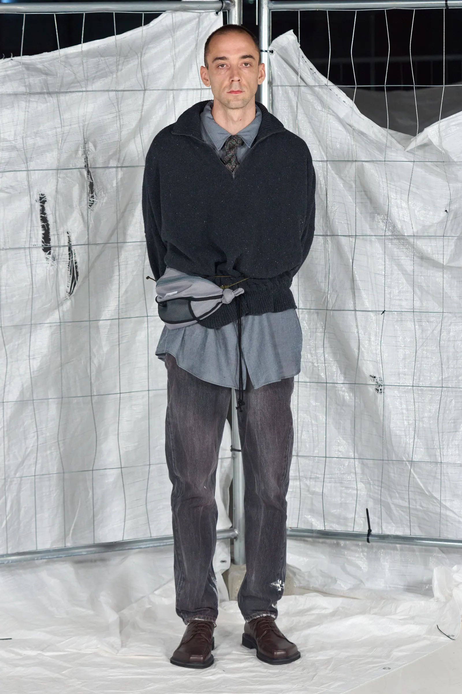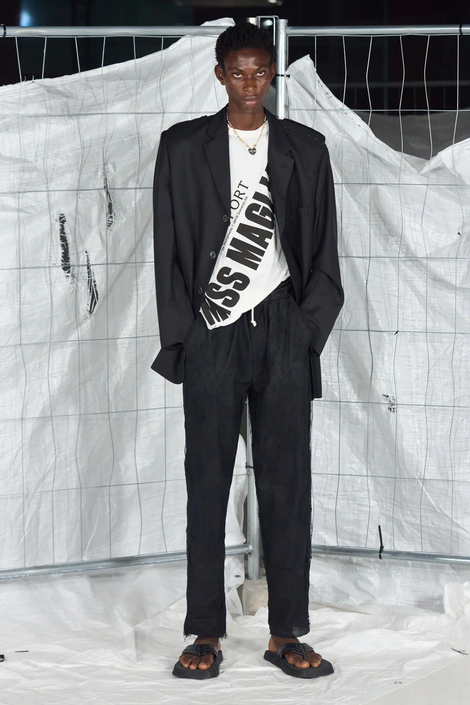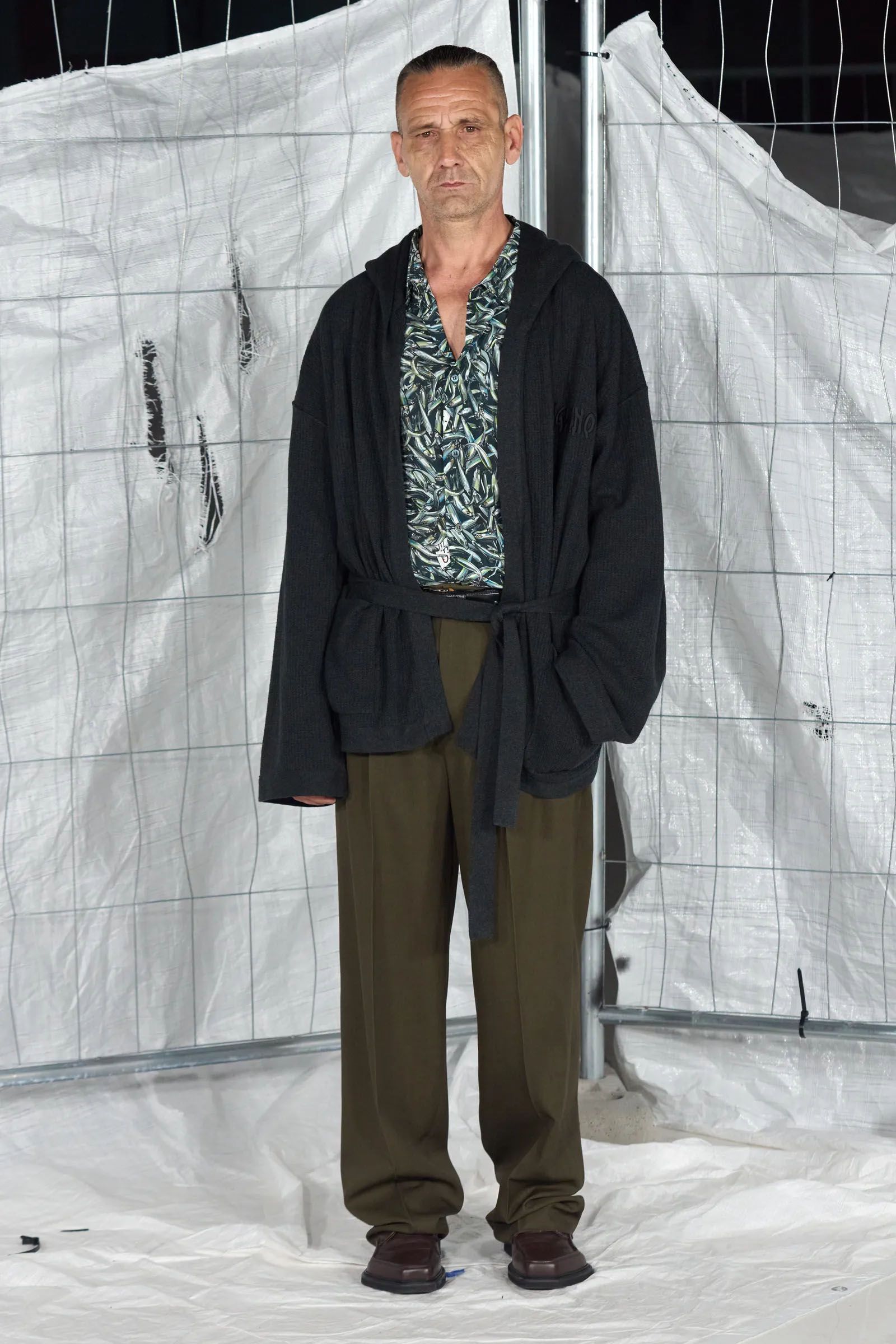 «Il nostro brand è sempre stato una sorta di progetto 'citazionista', nel senso che è stato generato nella mia città natale ed è profondamente impregnato della sua cultura underground e della mia esperienza personale,» ha raccontato Magliano dopo lo show. Nel Pala Magliano, tanto palazzo quanto cantiere, i lavori non si fermano, sia nella location (che ricorda appunto un cantiere in costruzione), sia nella collezione. Il jeans è sporco e rovinato, i look creati per avere un fascino caotico e spontaneo che si ricollega alla volontà ultima di Magliano: destrutturare l'identità maschile per come la conosciamo, che si tratti di un blazer, di un maglione o di una borsa legata in vita. Ultimo aspetto, ma non per ordine di importanza, è quello del colore, "trattato in maniera elementare" come ha scritto lo stesso designer, ma che in realtà, nelle sue tonalità di bianchi e neri, sembra non voler ricorrere all'escamotage delle palette più accese per togliere l'attenzione dal lavoro fatto da Luca Magliano e dal suo team.