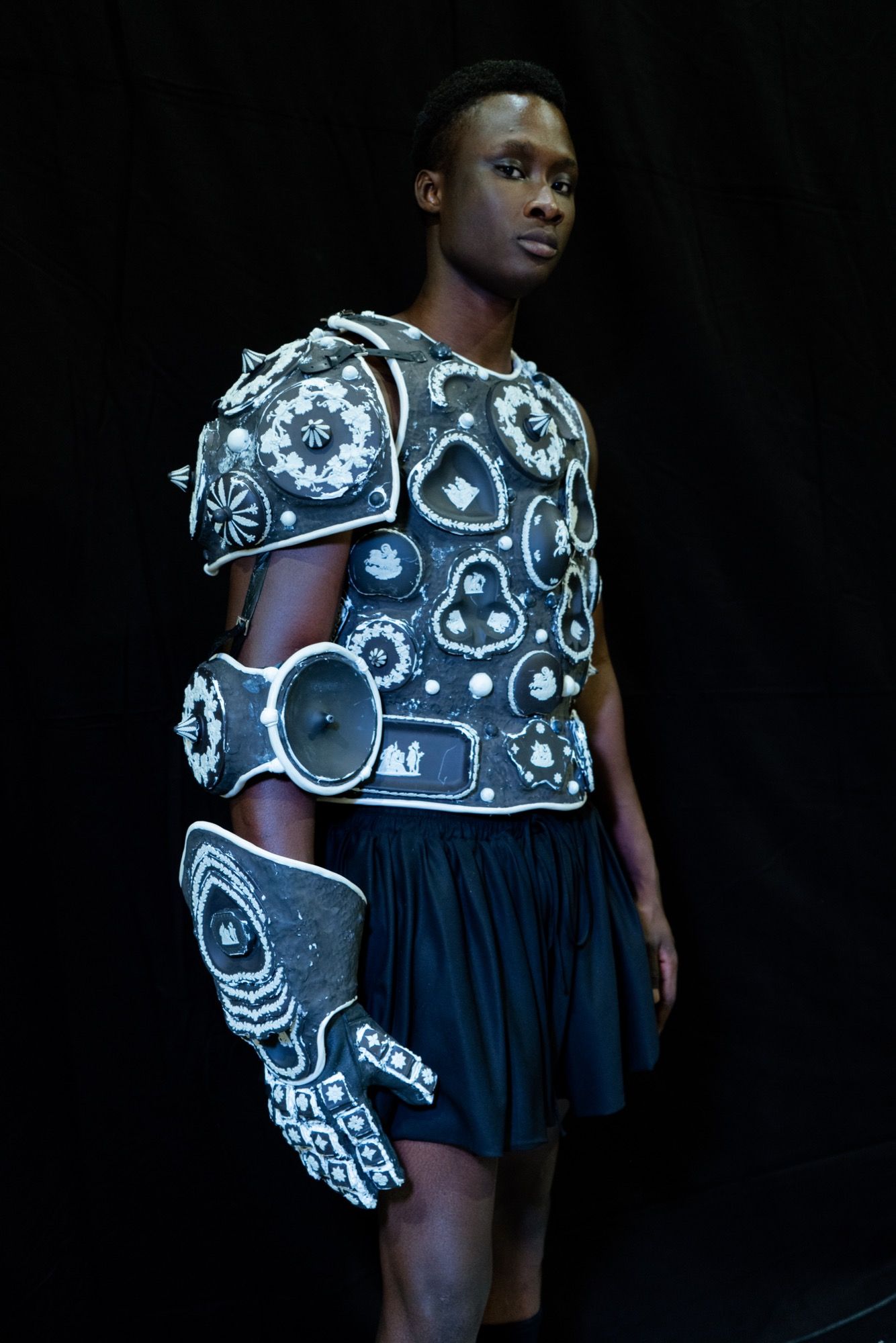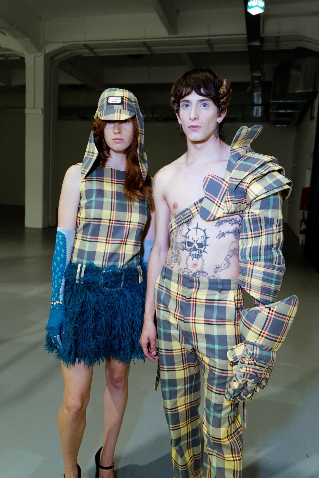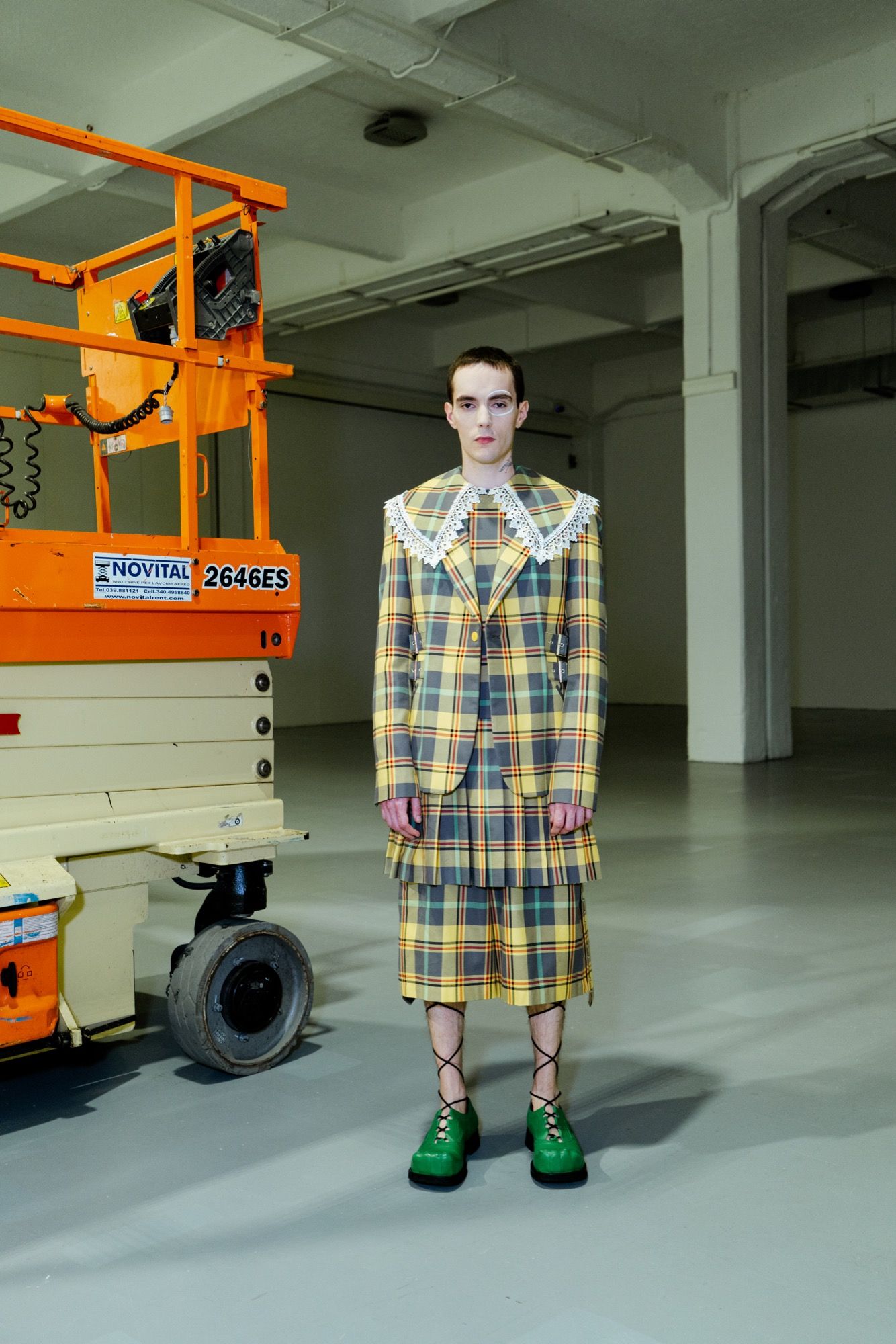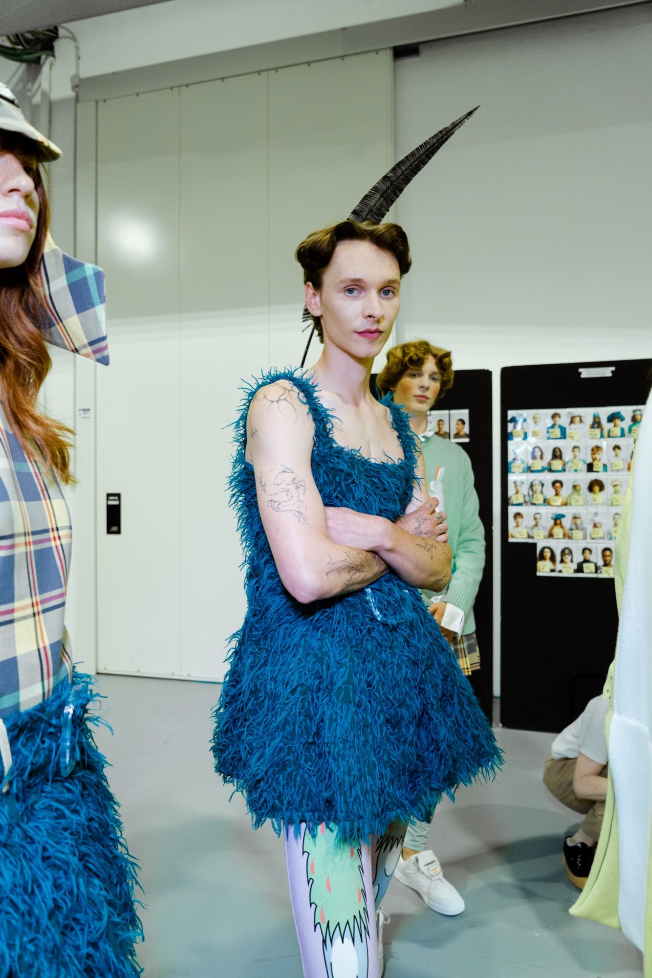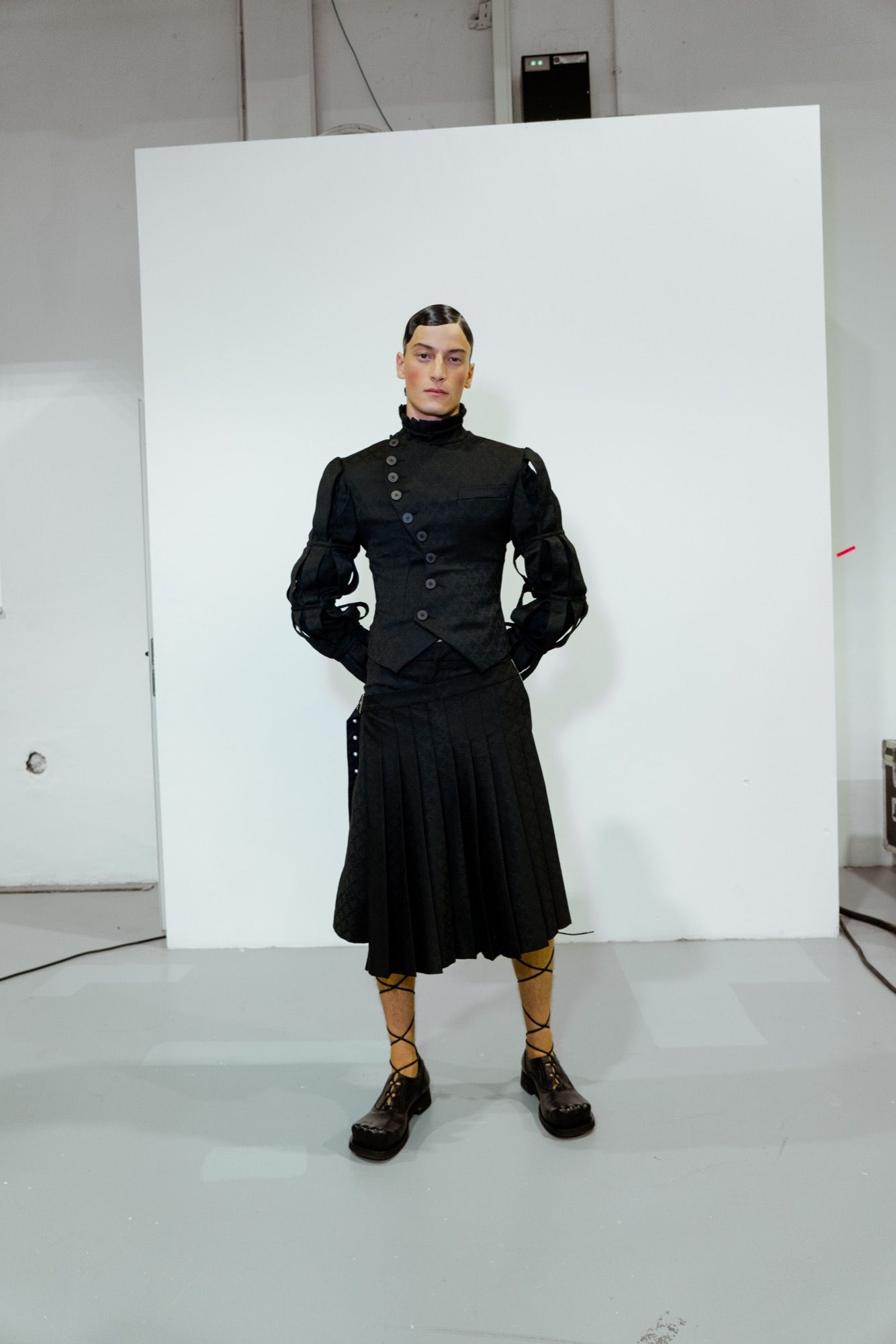 Giunto al suo secondo show alla Milan Fashion Week, Charles Jeffrey pare sentirsi abbastanza a casa qui a Milano. Con uno show dal respiro assai più ampio del precedente, il designer scozzese ha portato sulla passerella una visione completamente nuova per la nuova stagione estiva, con una collezione che apre un dialogo tra il presente e il passato più mitico del Regno Unito – fatto di cavalieri arturiani, di cappelli a tricorno, colletti degni di Oliver Cromwell e farsetti elisabettiani. Il ragionamento è chiaro: ora che la Gran Bretagna si trova in una congiuntura storica, in cui sono in gioco tutti i suoi valori e le sue idee identitarie, usare il passato come filtro narrativo del presente significa porsi domande sul futuro. Un futuro tanto incerto quanto è esuberante e variopinta la nuova collezione concepita da Jeffrey, che abbiamo raggiunto nel backstage dopo lo show per farci raccontare meglio l’idea dietro la sua ultima sfilata.