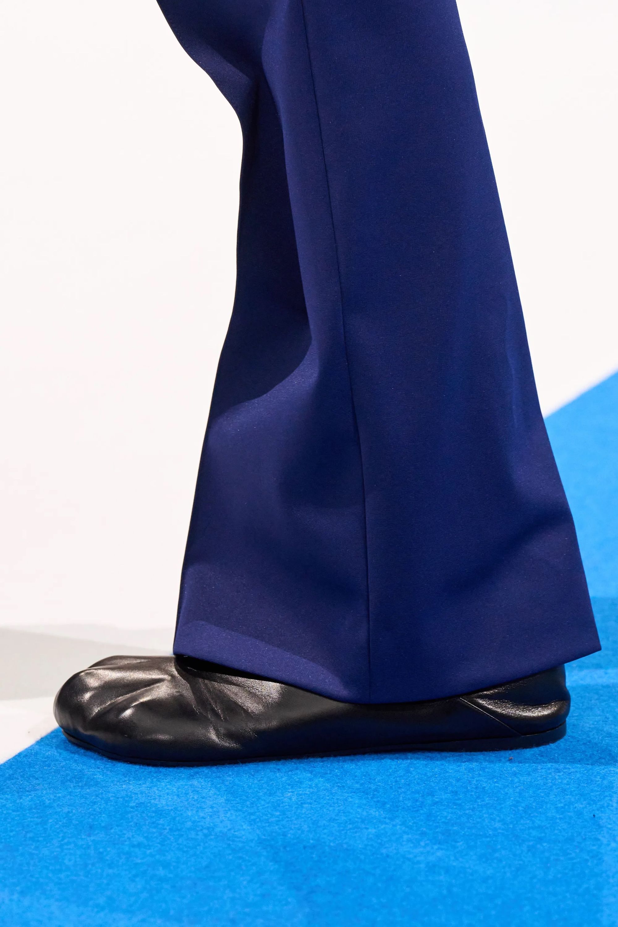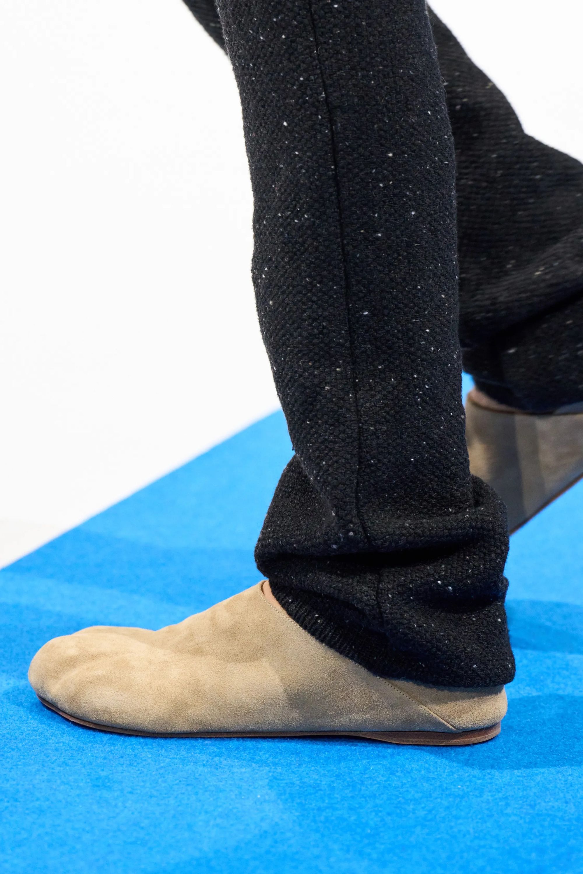Partiamo da JW Anderson, un brand che per i propri show è solito sfruttare l’ironia e l’energia nostalgica dei ricordi d’infanzia per suscitare stupore negli spettatori: oltre ad una vasta gamma di zoccoli in diversi colori e materiali, tra i design presentati alla sfilata spiccavano mules e scarpe stringate in pelle che, sulla punta, si arricciavano come se i modelli che le indossavano avessero al posto dei piedi delle grandi zampe da felino. Un design già presentato a febbraio in versione tacco a spillo durante la Fashion Week FW23, e che aveva invogliato giornalisti e critici a divertirsi con tutti i giochi di parole del caso, dopo che Jonathan Anderson stesso aveva incluso nella caption di un post che le svelava anticipatamente, «CATWALK show fittings…»