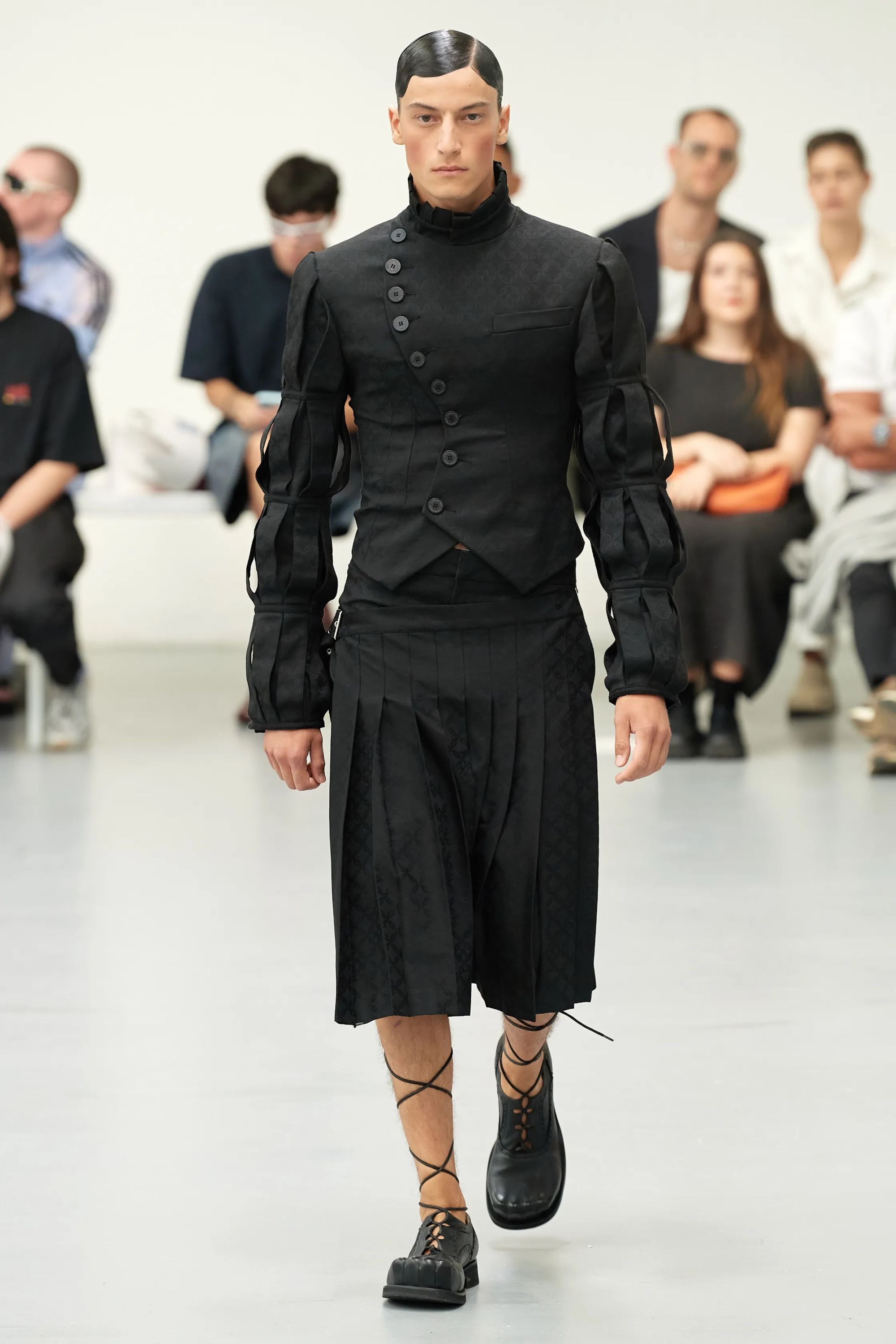 Di simile estro anche le calzature di Charles Jeffrey Loverboy, una particolare fusion tra le brogue e le ballerine, goffrate con una tecnica simile a quella di JW che rendeva la loro forma un rimando agli arti di un cane, e poi maryjane e loafer decorate da affilati artigli argentati - i simpatici direbbero «un design graffiante.» Al limite dell’assurdo, lo show di Charles Jeffrey non era punk, nonostante gli spunzoni appuntiti e il plaid inglese che si alternava in ogni look, ma si rifaceva all’epoca Carleiana del XVII secolo, proprio perché l’Inghilterra in questo momento sta vivendo un rinascimento di quell’era, come ci ha spiegato il designer in un’intervista prima dello show.