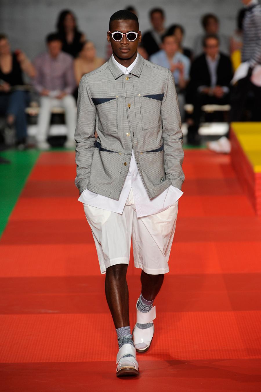 We focused on comfort, functionality and durability so you’ll see a looser, more fluid silhouette with oversized tees and woven dress shirts paired with deep-pleated trousers and wide knee-length shorts in a range of fabrics from cotton to lightweight nylon ideal for hot climates. There are permeable, semi translucent striped tees and reversible mesh pieces to provide coolness in the jungle and safari jackets and suits are constructed with drawstrings for the possibility of customization.