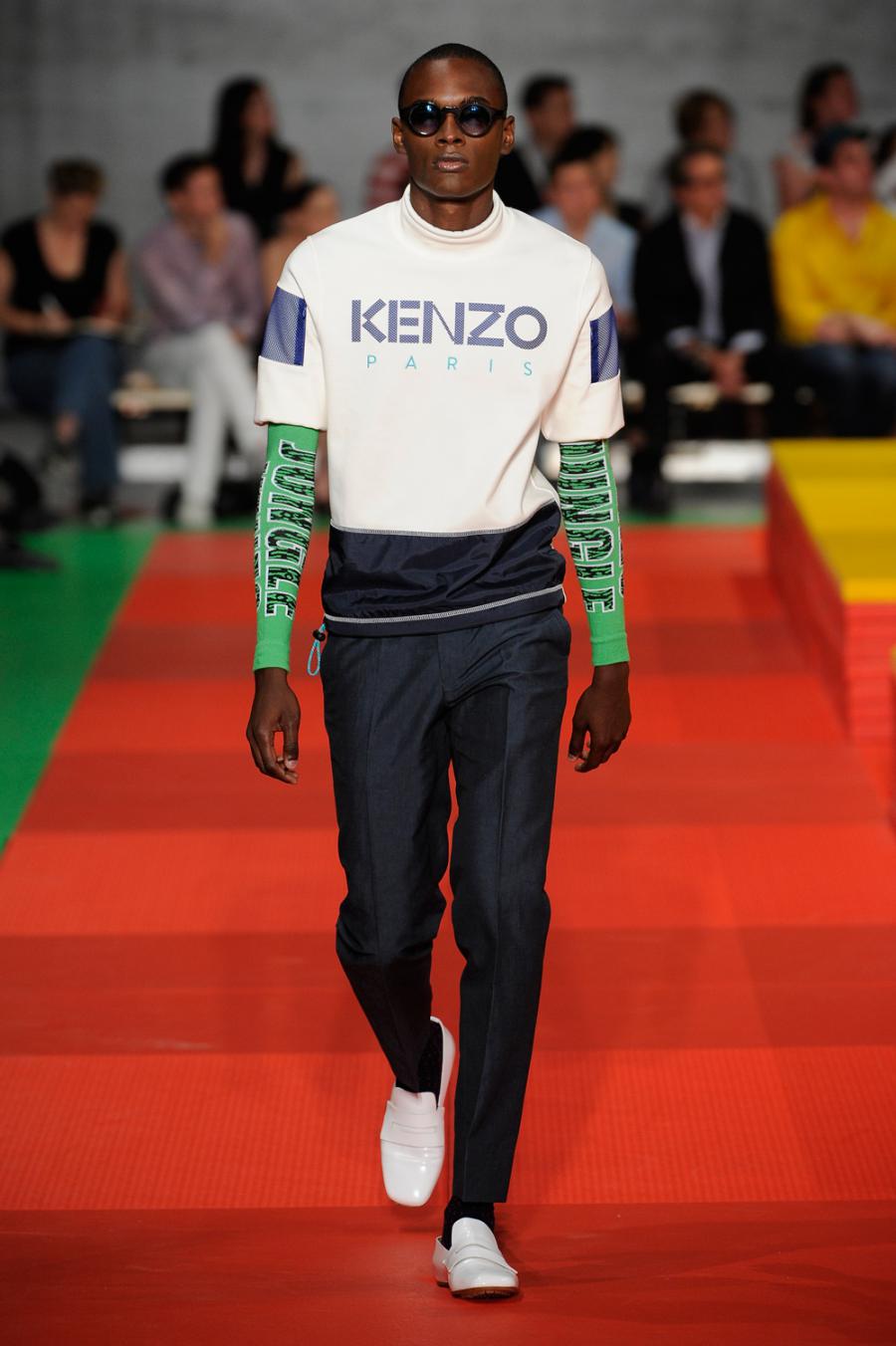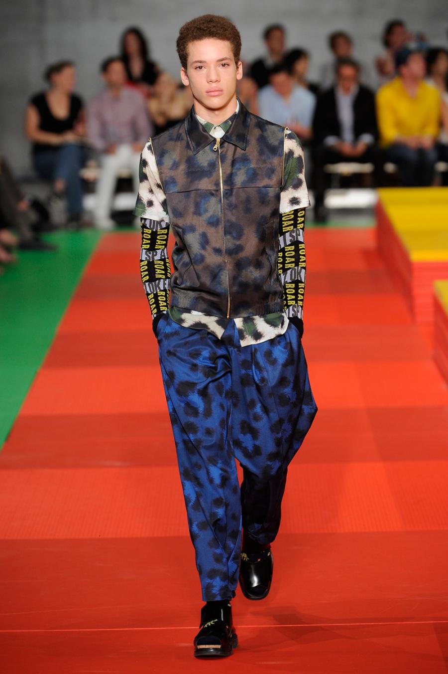 Our prints are created with tiger stripes and slashes, blurred leopard spots and basket weave as well as a new Kenzo camouflage which is offered bright jewel tones of azure, emerald and mango. Glass beaded embroidery embellishes classic sportswear pieces throughout the collection such as polos, sweatshirts and t-shirts.