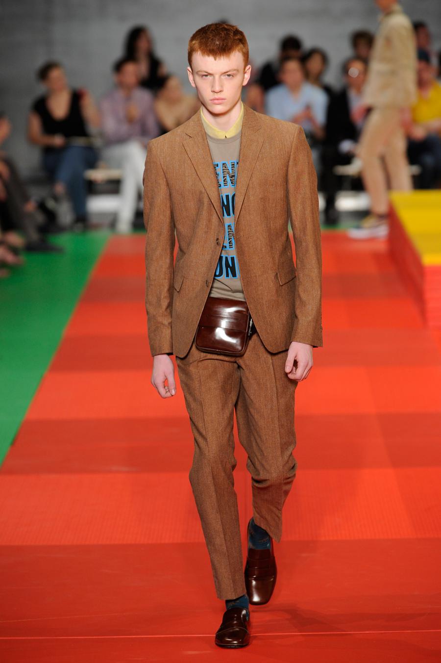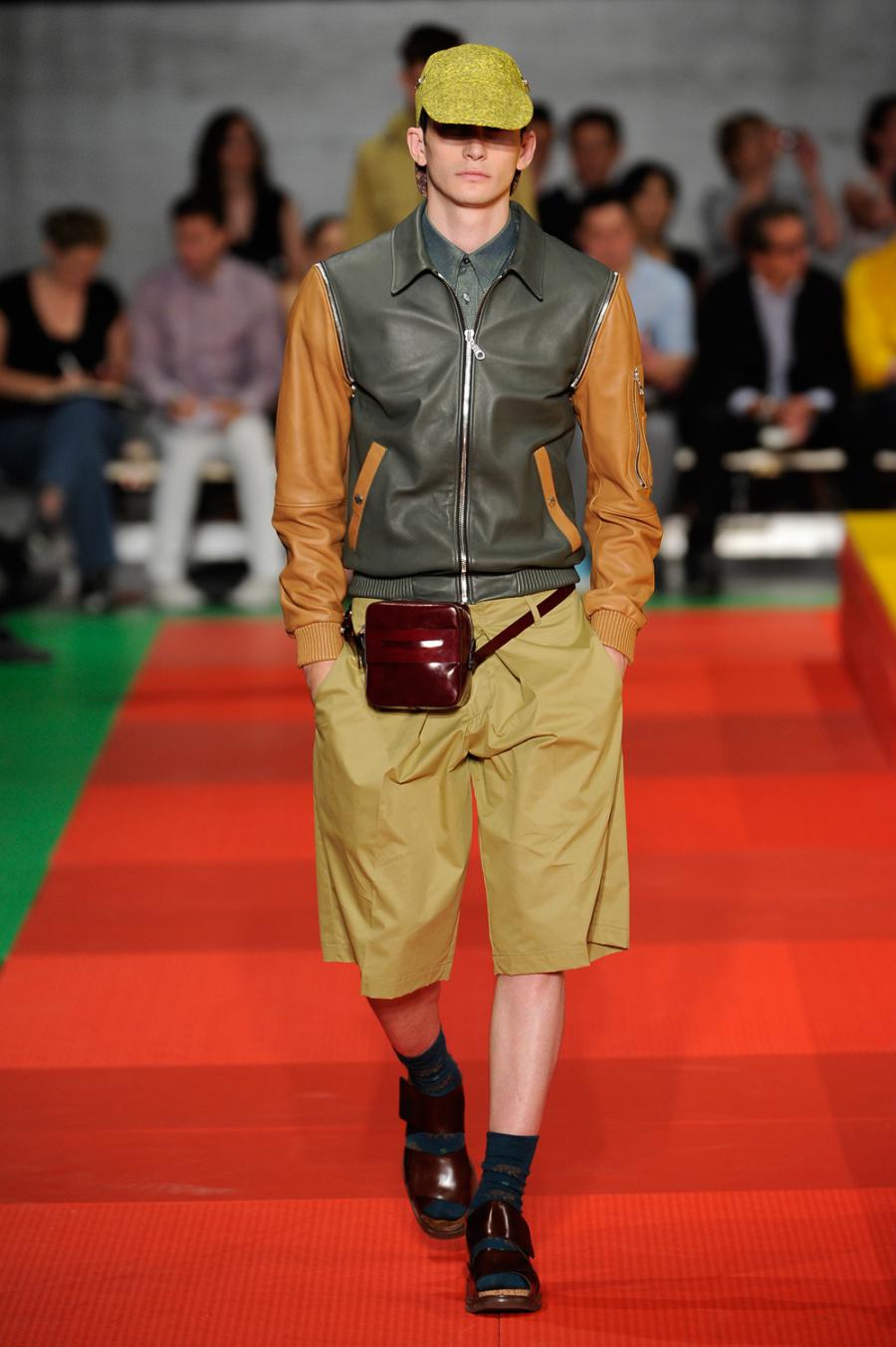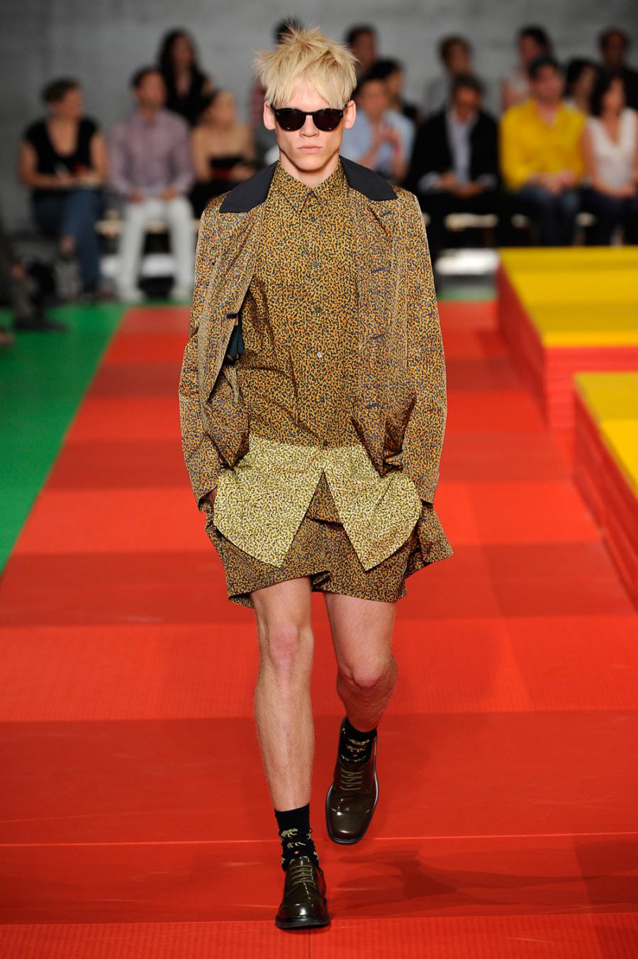 Accessories include multicolored tiger stripe chukka sneakers, square toe patent leather lace-ups, ultra wide velcro strap sandals, croc-printed round sunglasses, and a canteen with harness to stay hydrated on the urban trek.