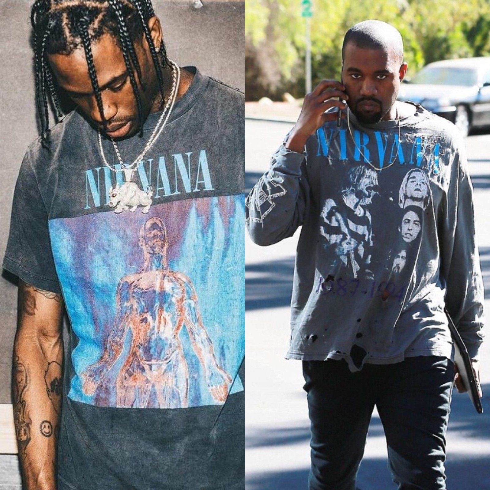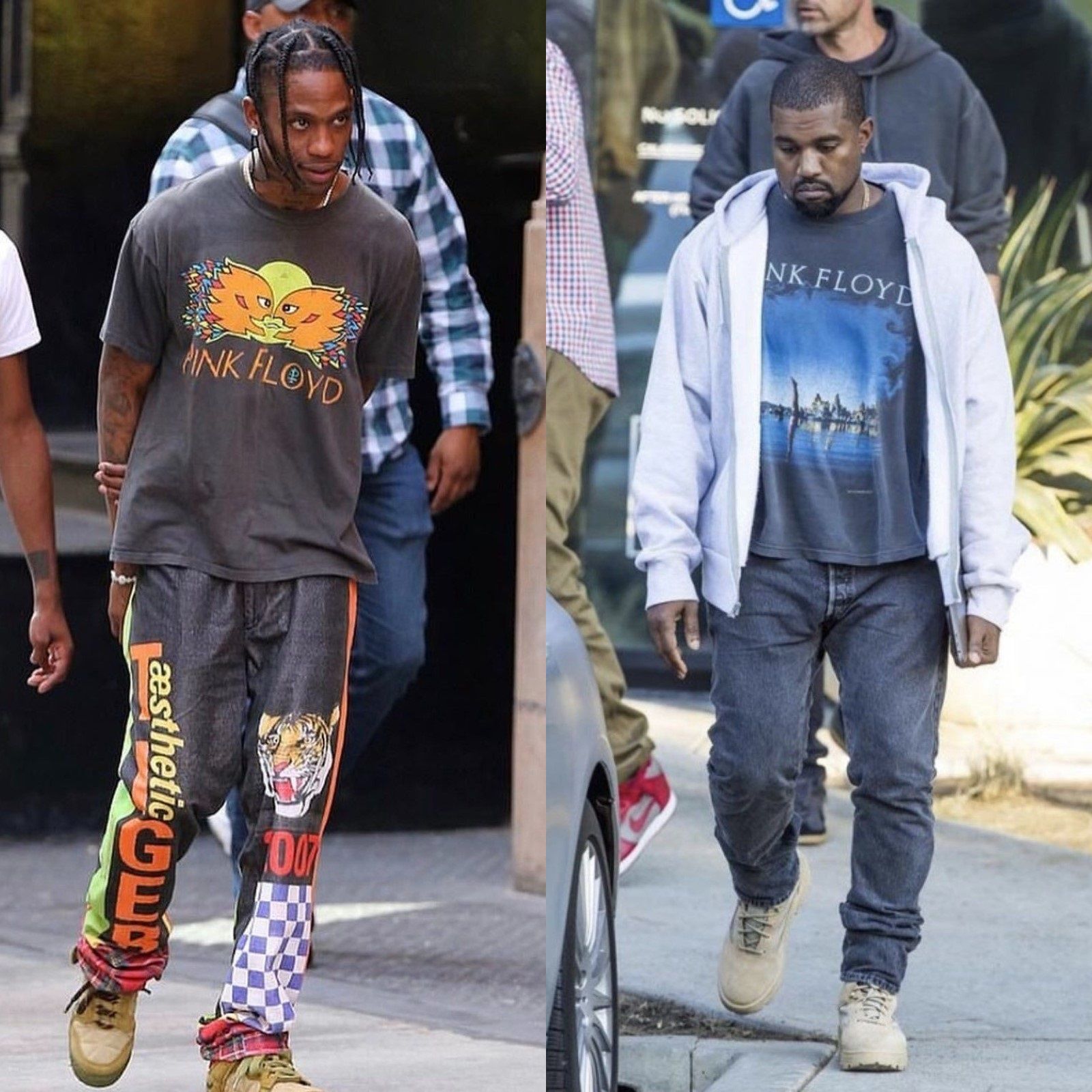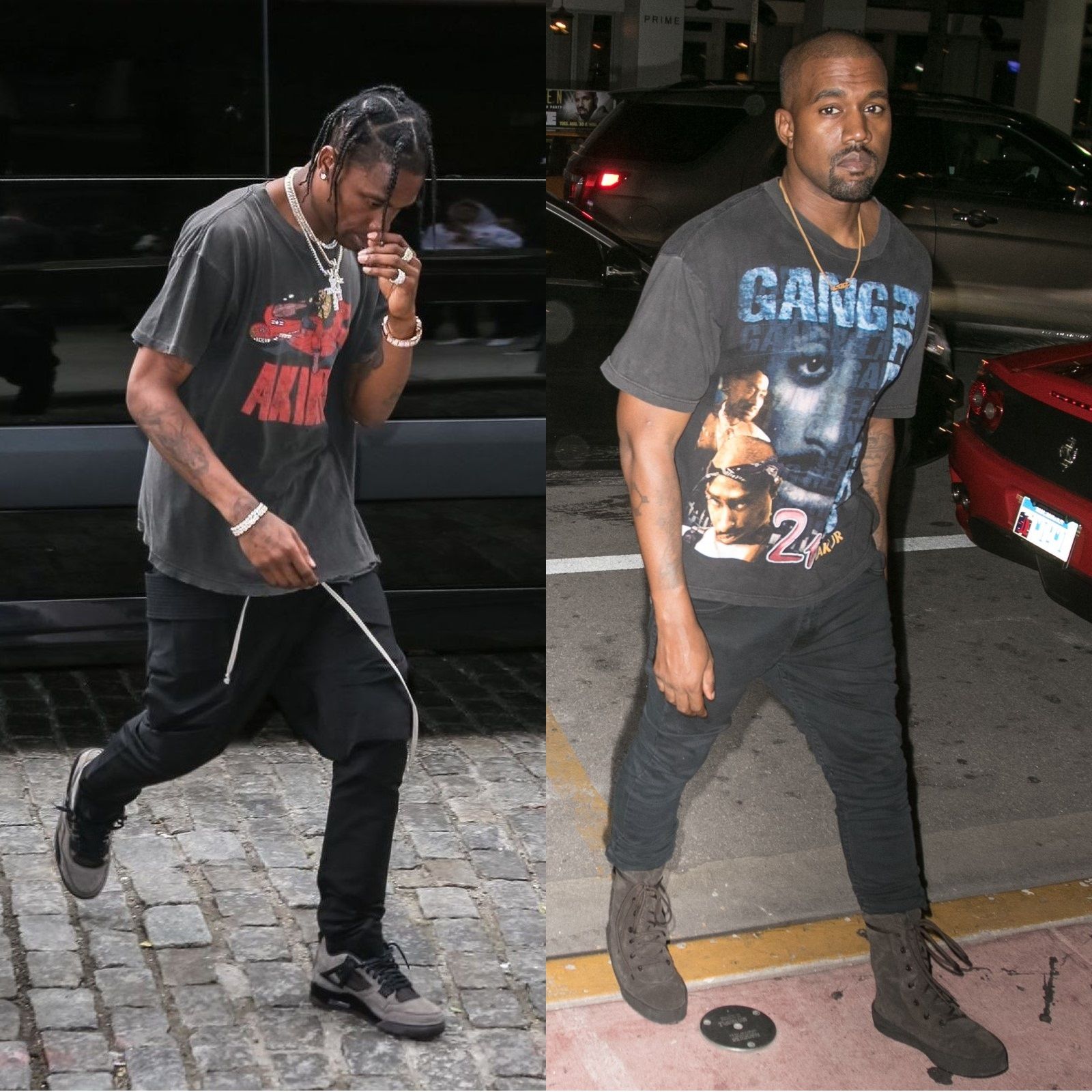 Senza nemmeno menzionare la t-shirt vintage di Akira (anime che più di ogni altro è associato con Ye) indossata da Scott, entrambi gli artisti sono molto amanti delle t-shirt più rare, vecchie e spesso malmesse. Il vibe si è poi progressivamente esteso al resto della moda mainstream, ma fa del tutto parte della cifra stilistica di entrambi. E se Kanye fu il pioniere della riscoperta delle t-shirt vintage, fu Scott a renderle immensamente popolari per la Gen Z.
