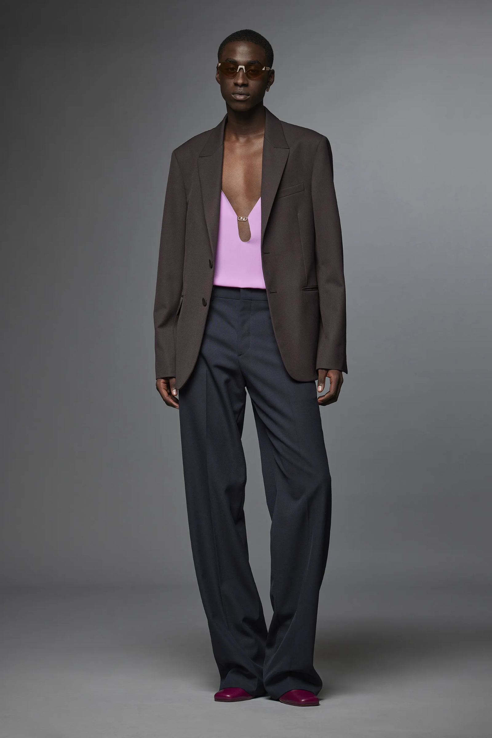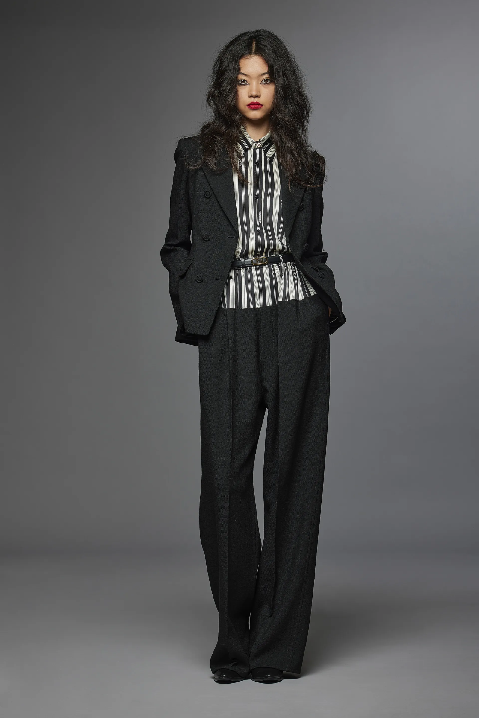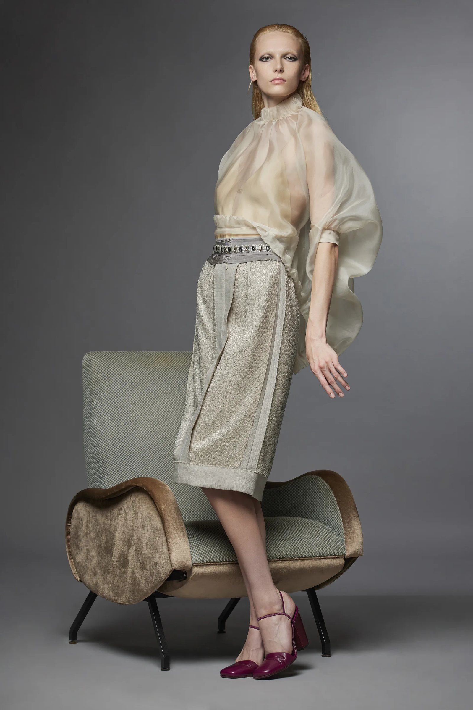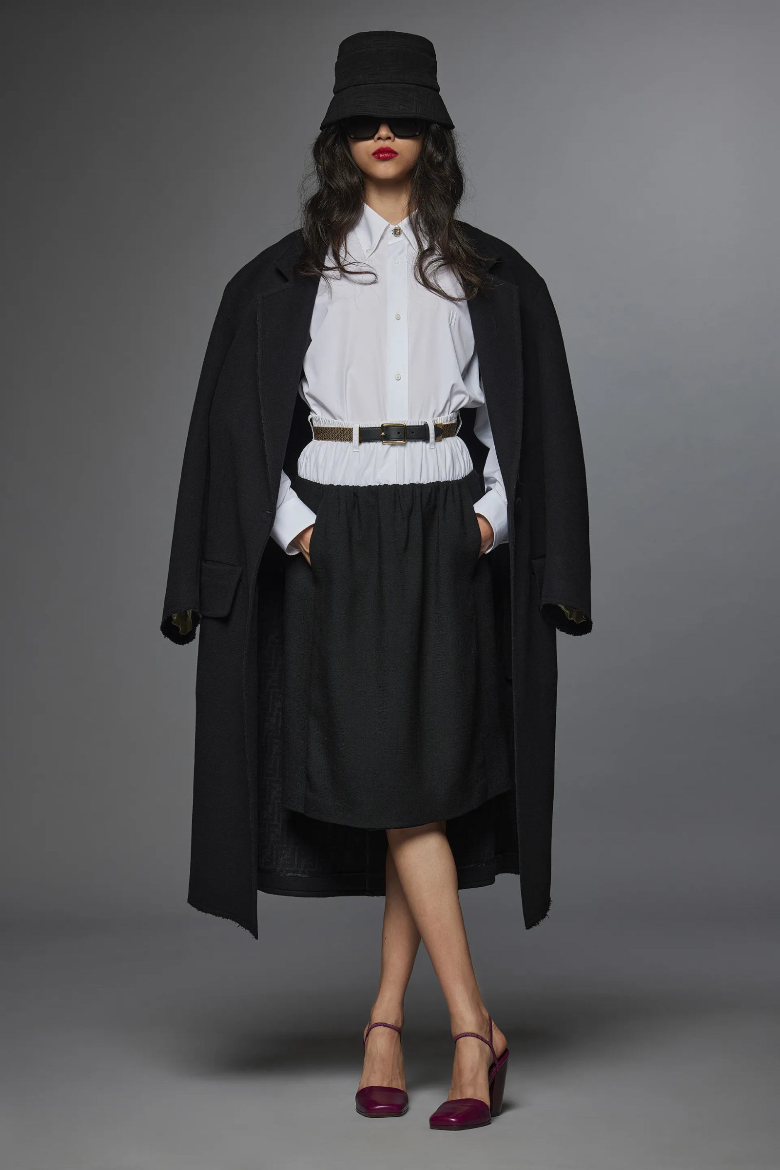 Per la sua Resort 2024 di Fendi, Pilati ha fatto riferimento alle epoche progressiste degli anni '20 e '60, due momenti storici definiti dalle lotte di genere per l’emancipazione femminile. Dagli anni ’20 proviene l’ispirazione alle flapper, le donne in bob cut che guidavano e ascoltavano jazz rivendicando la propria indipendenza e simboleggiate dalla diva del cinema muto Louise Brooks. Erano donne viste come una minaccia per la mascolinità ma che oggi rappresentano un simbolo di liberazione. Riferendosi al loro costume tradizionale Pilati ha riempito la collezione di vite basse, di bucket hat che fanno cenno alla silhouette anni ’20, tacchi décolleté con un cinturino che ricorda le Mary Jane, forme libere che avvolgono il corpo, abiti il cui busto e la cui vita ricorda il classico robe de style ma privo della gonna voluminosa. In particolare, è notevole il taglio delle giacche vagamente spioventi e dai revers rettangolari. Inoltre, Pilati ha rifatto il logo "F" di Fendi, incorporandolo in stampe e jacquard. Il riferimento alla pellicceria, l'origine di Fendi, è evidente in un maglione di shearling e in un elegante cappotto a forma di uovo in tweed "animalier". Anche gli accessori sono stati disegnati da lui.