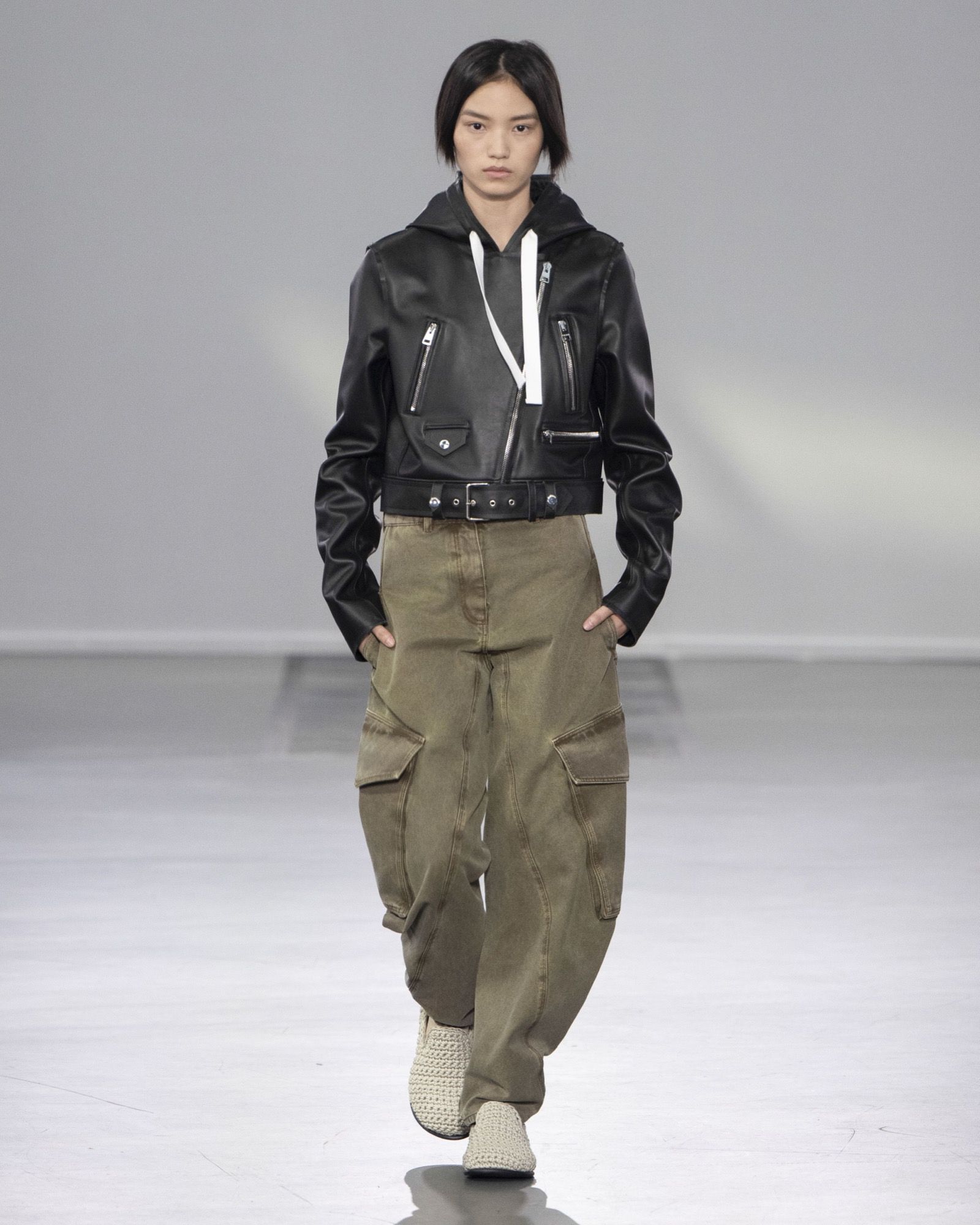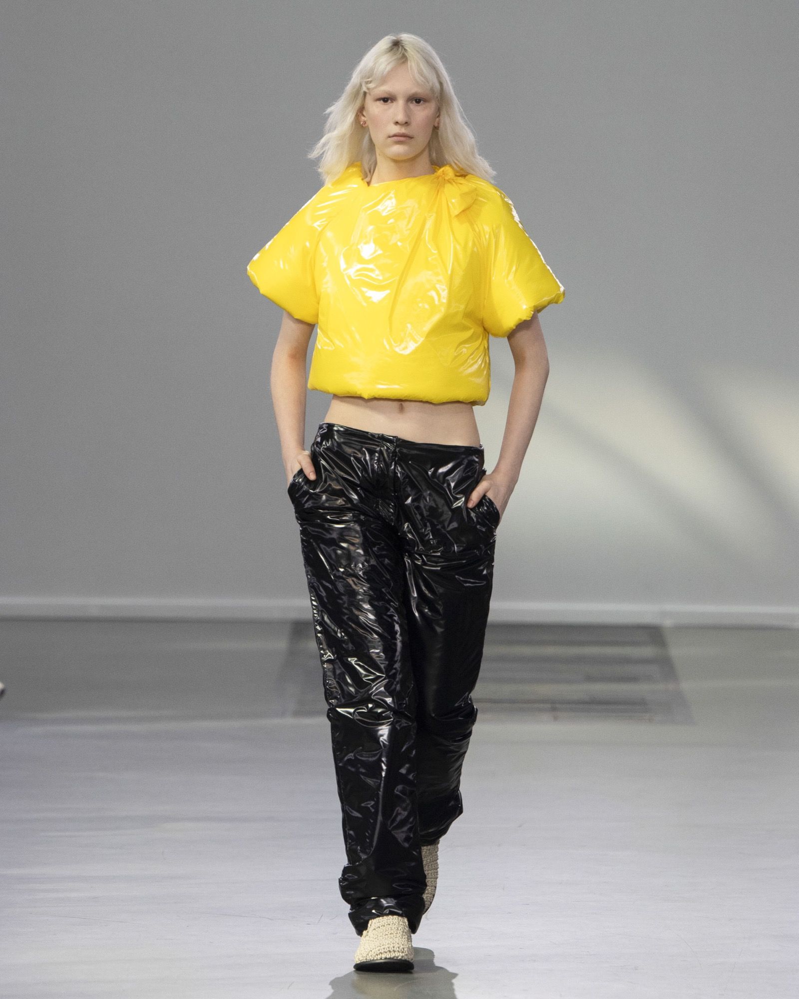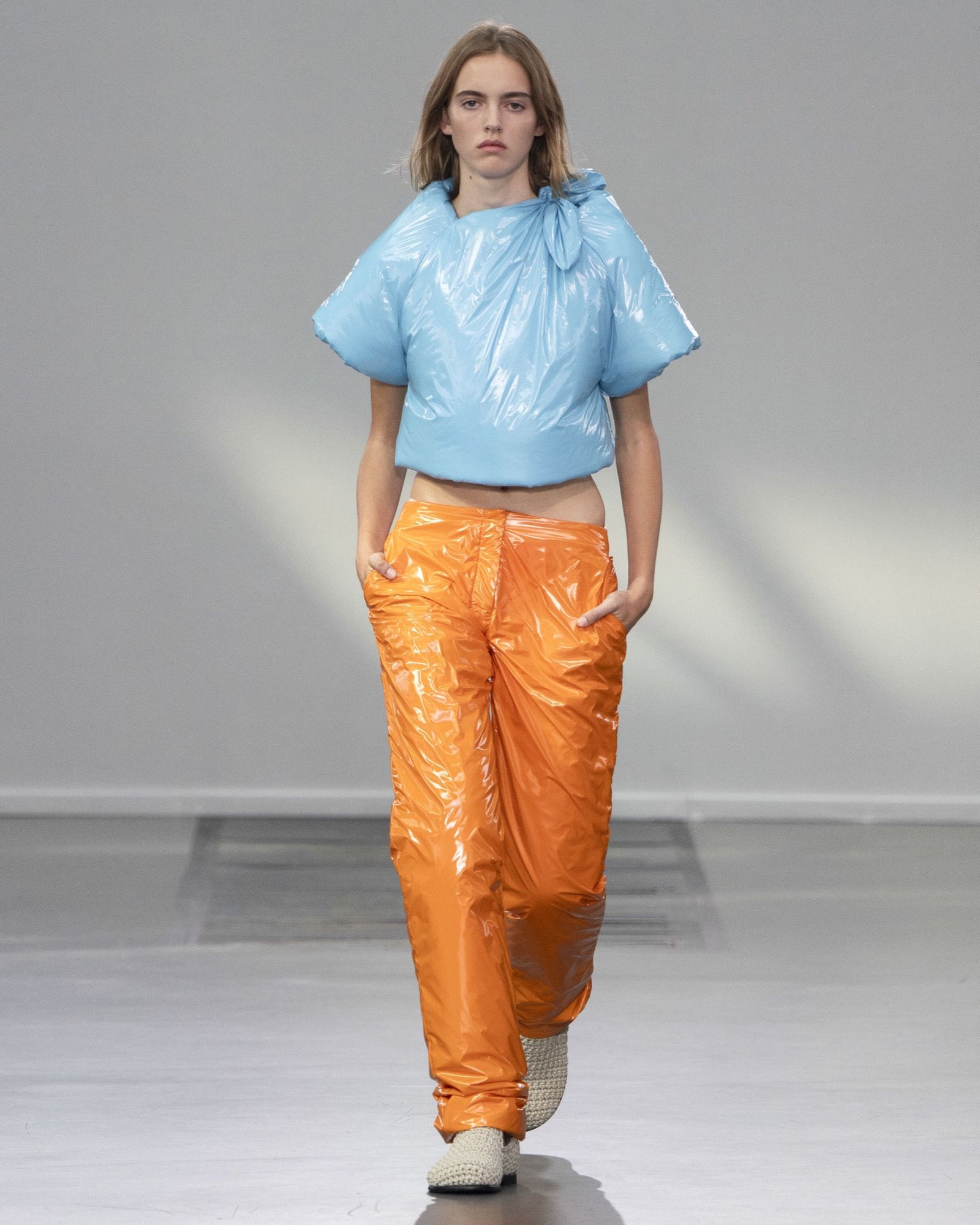 Partendo dallo street style delle principali città europee, il designer ha scelto di portare gli abiti che indossano oggi i giovani - biker jacket e pantaloni cargo - indietro nel tempo, intrecciando i codici stilistici dello stile contemporaneo, sportivo e aggressivo, con il suo inimitabile approccio autoironico e sperimentale. Il blu elettrico era accesissimo, così come l’arancione, le proporzioni erano esagerate, le silhouette spigolose e quasi comiche, i primi look, come voleva anticipare l’invito, sembravano prodotti in plastilina. A prima vista, la collezione sembra una presa in giro della moda attuale, troppo ostinata nel limitarsi a hoodie e pantaloni kaki, ma con l’ingresso in passerella dei look imbottiti, la giocosità benevola di Anderson appare ben chiara. Quelli che il designer ha presentato sono abiti che non vanno presi sul serio, non vanno studiati minuziosamente, non vanno forse neanche troppo capiti; come un gioco da bambini, come la plastilina, prendono la forma e il senso che la persona che li indossa vuole conferirgli. «Un senso di semplicità che non è così semplice» recita il comunicato della sfilata.