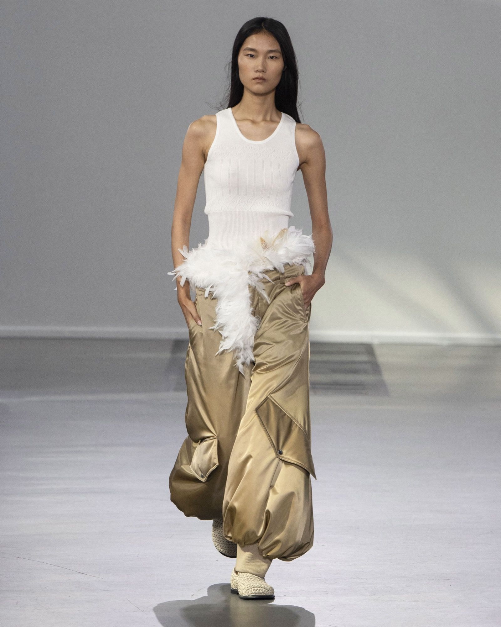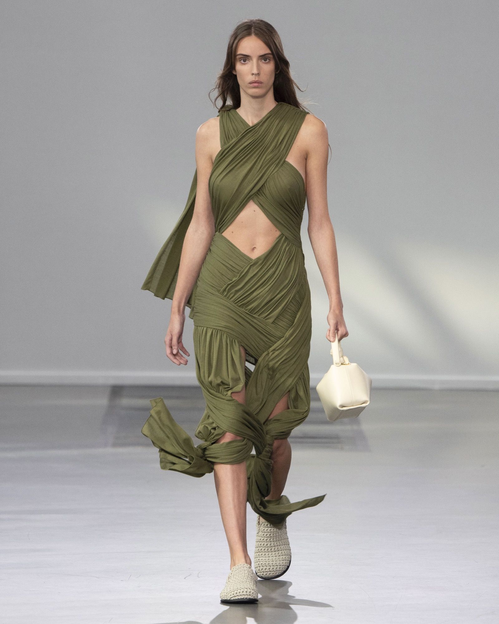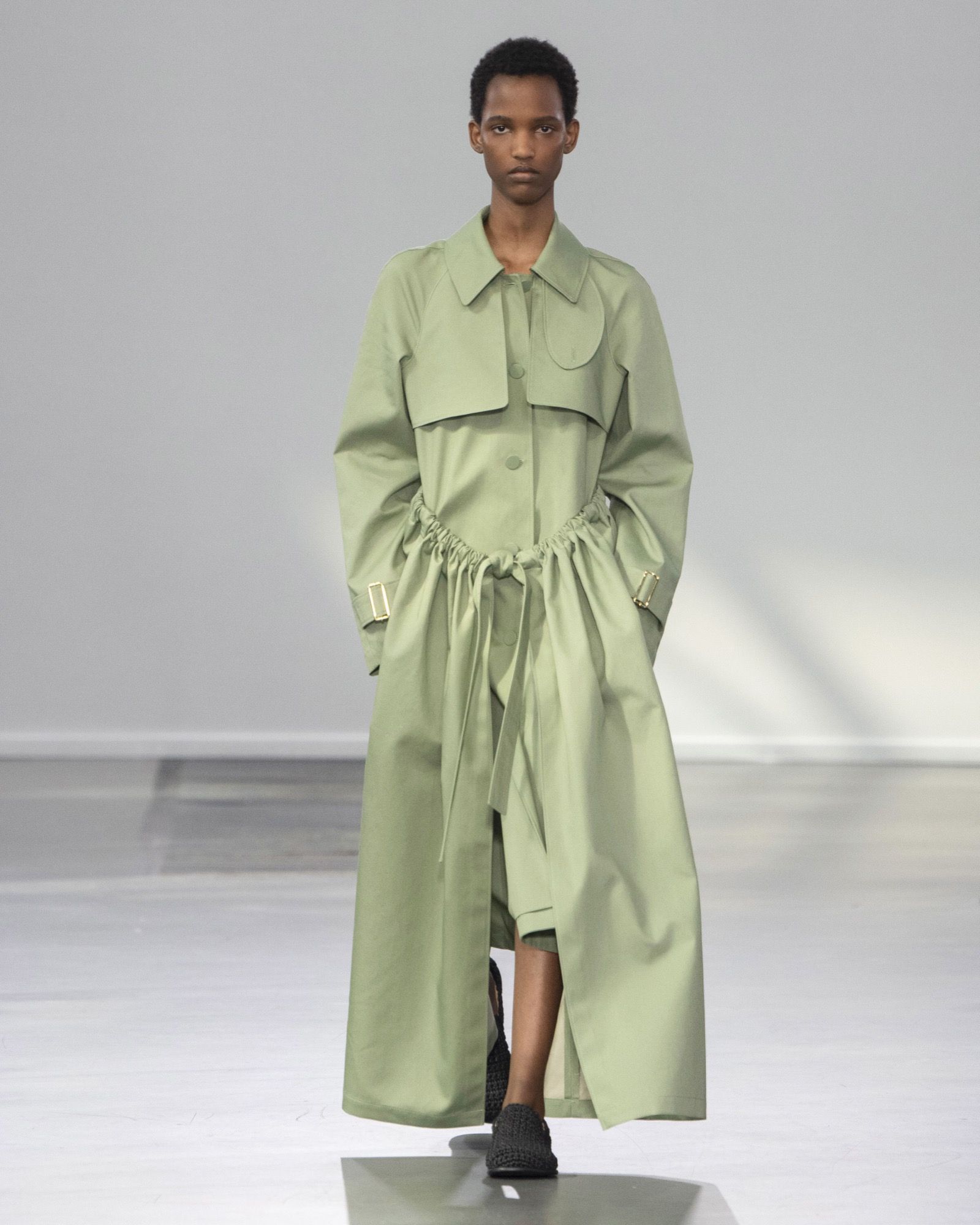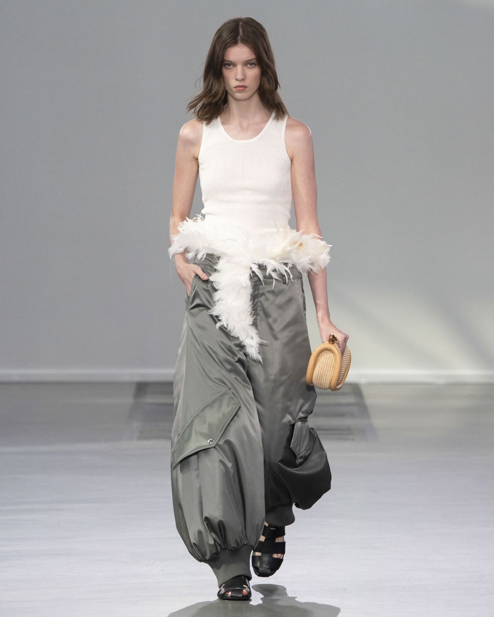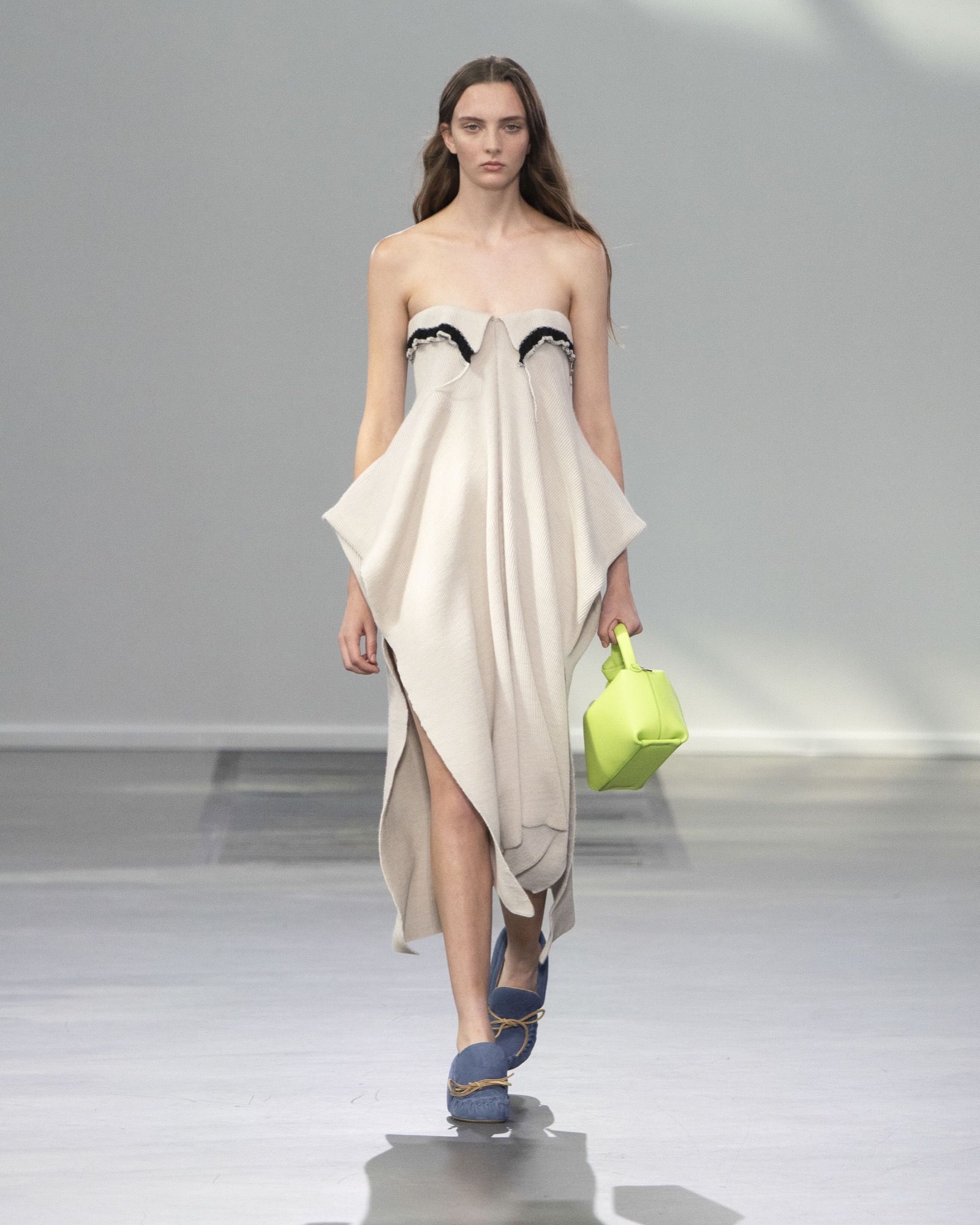 Nonostante la molteplicità di look che evidenziavano la radice spiritosa del brand, la collezione ha proposto abiti pratici. I trench verde menta e beige, scultorei ed elasticizzati in vita, ricoprono esattamente il ruolo che questi conservano da sempre, come del resto anche le bomber jacket, arricchite da piume bianche, i pantaloni della tuta, in pannelli di cotone verde foresta, gli abiti da sera, drappeggiati sensualmente sul corpo delle modelle, e quelli in uncinetto, un simpatico ricordo di un’estate anni ’70. Ogni collezione di Anderson pone una speciale attenzione per il footwear, e questa stagione le star dello show sono stati i sandali da spiaggia, un classico della moda bambino reinterpretata per l’occasione in pelle goffrata marrone, arancione e panna, con il nome del brand. Mocassini e mule all’uncinetto facevano capolino dai pantaloni cargo di molte modelle, mentre alcune indossavano loafer in camoscio con kitten heel, la pantofola della nonna, ha ammesso Anderson, con qualche anno in meno.