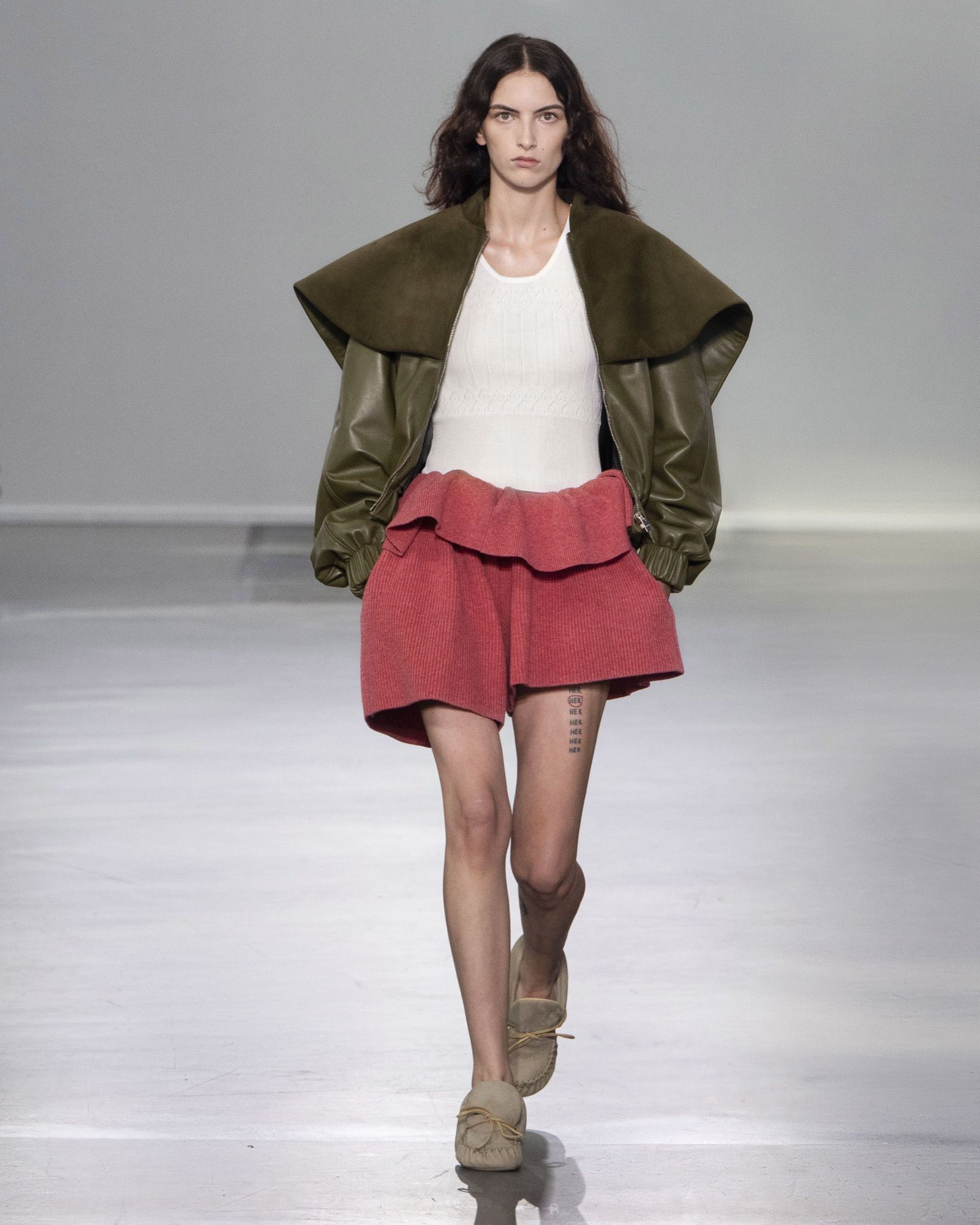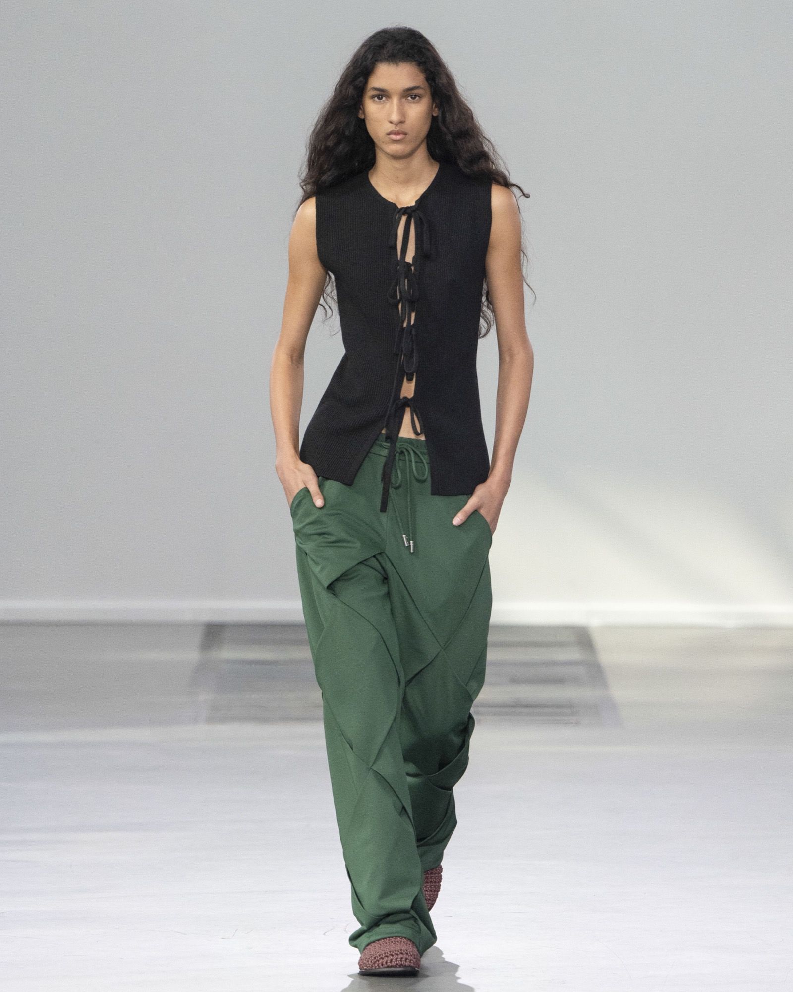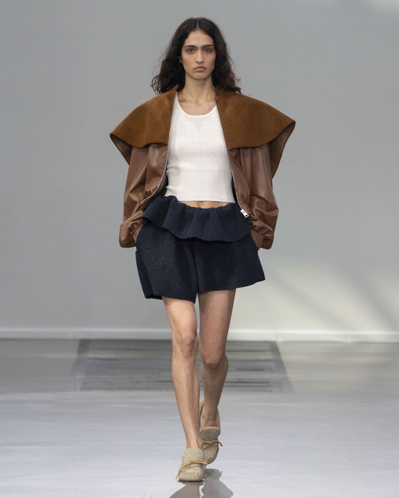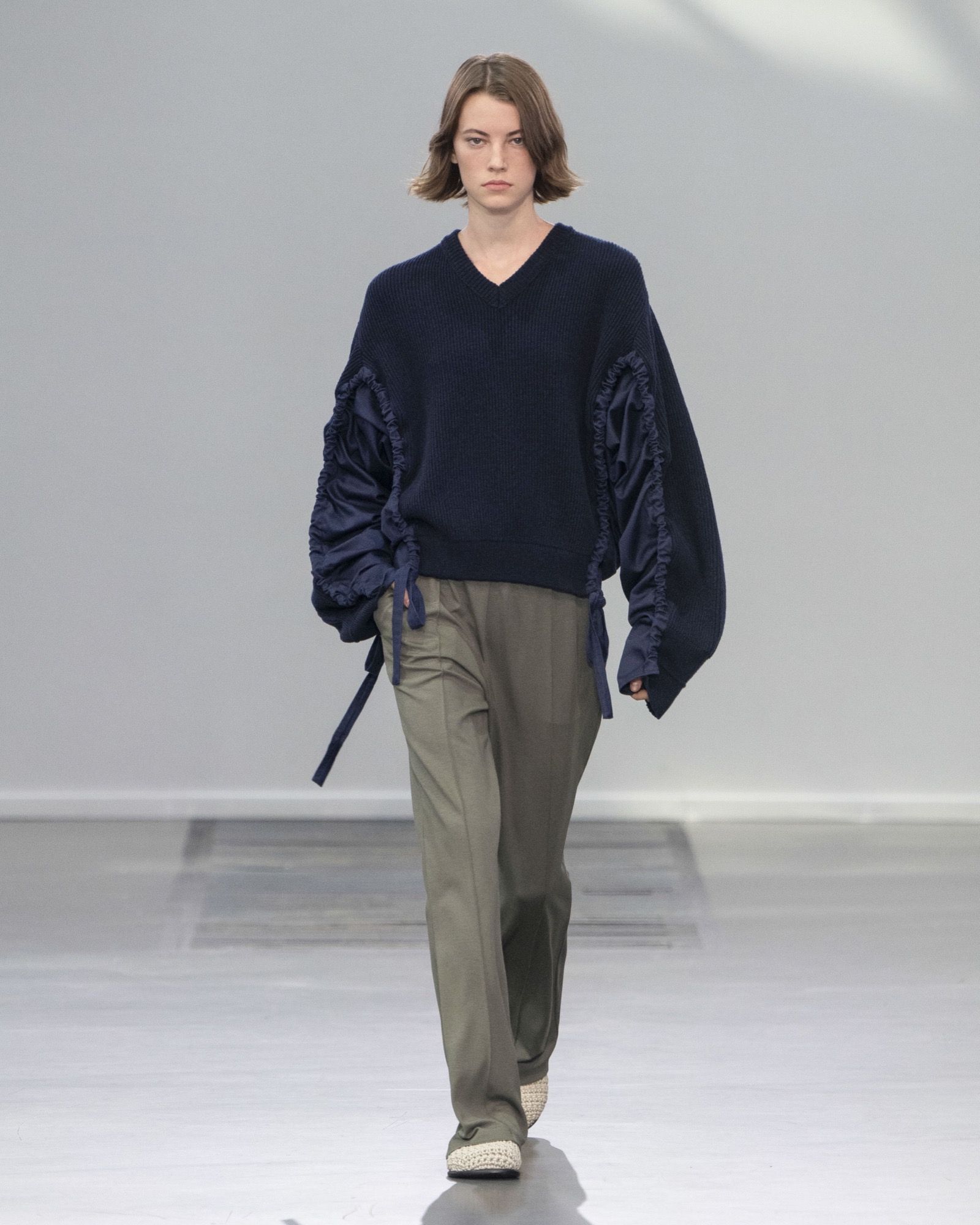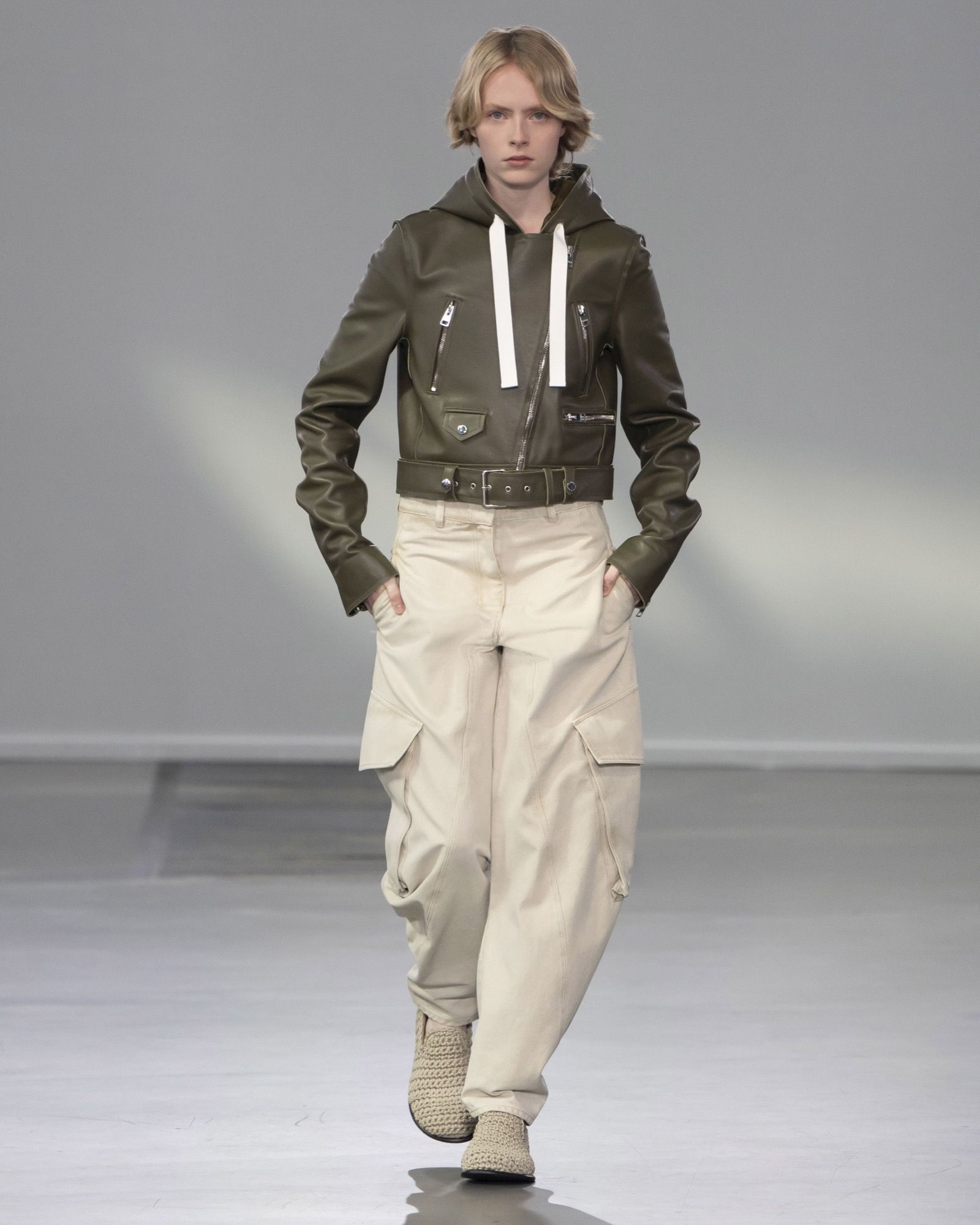 Nonostante la molteplicità di look che evidenziavano la radice spiritosa del brand, la collezione ha proposto abiti pratici. I trench verde menta e beige, scultorei ed elasticizzati in vita, ricoprono esattamente il ruolo che questi conservano da sempre, come del resto anche le bomber jacket, arricchite da piume bianche, i pantaloni della tuta, in pannelli di cotone verde foresta, gli abiti da sera, drappeggiati sensualmente sul corpo delle modelle, e quelli in uncinetto, un simpatico ricordo di un’estate anni ’70. Ogni collezione di Anderson pone una speciale attenzione per il footwear, e questa stagione le star dello show sono stati i sandali da spiaggia, un classico della moda bambino reinterpretata per l’occasione in pelle goffrata marrone, arancione e panna, con il nome del brand. Mocassini e mule all’uncinetto facevano capolino dai pantaloni cargo di molte modelle, mentre alcune indossavano loafer in camoscio con kitten heel, la pantofola della nonna, ha ammesso Anderson, con qualche anno in meno.