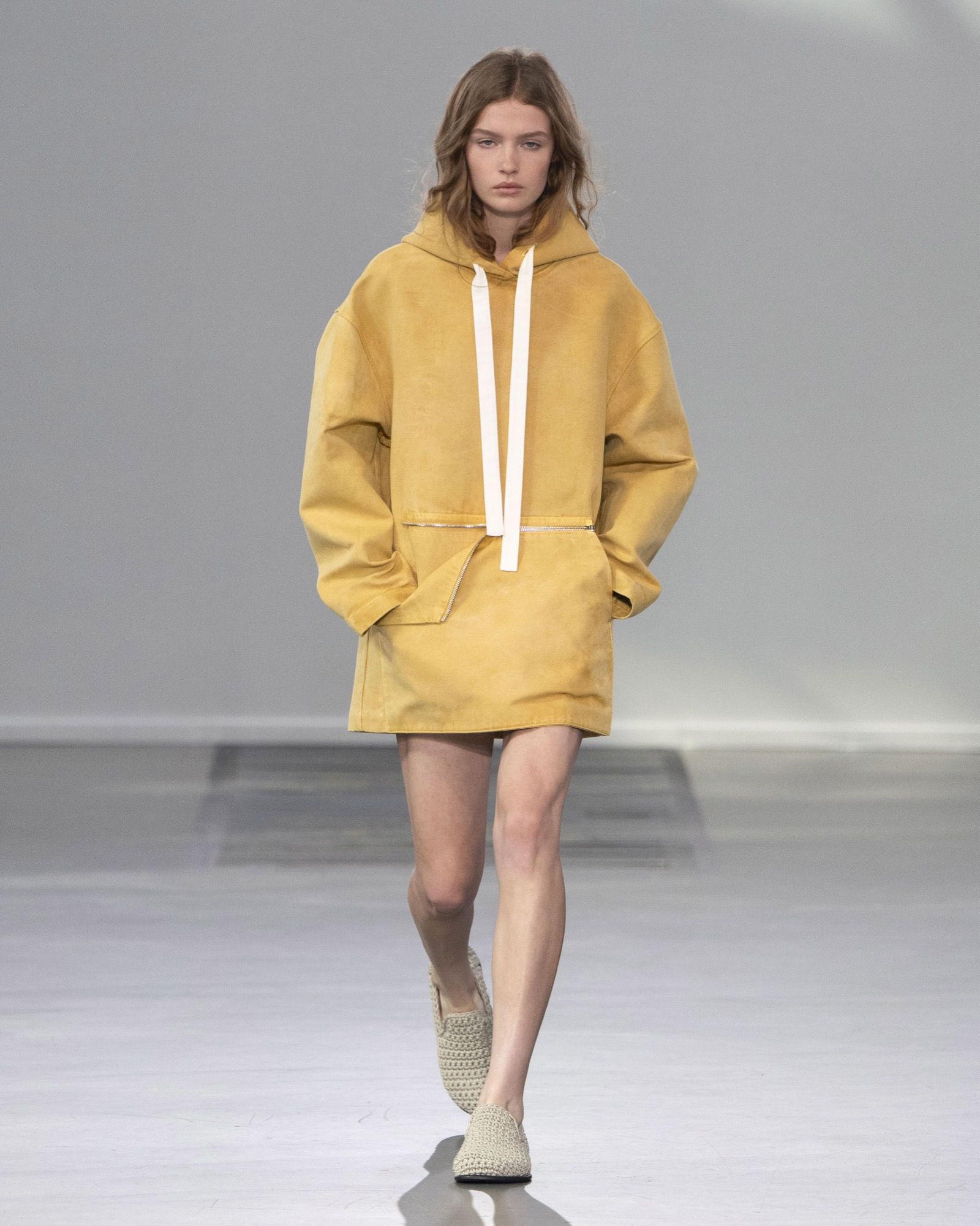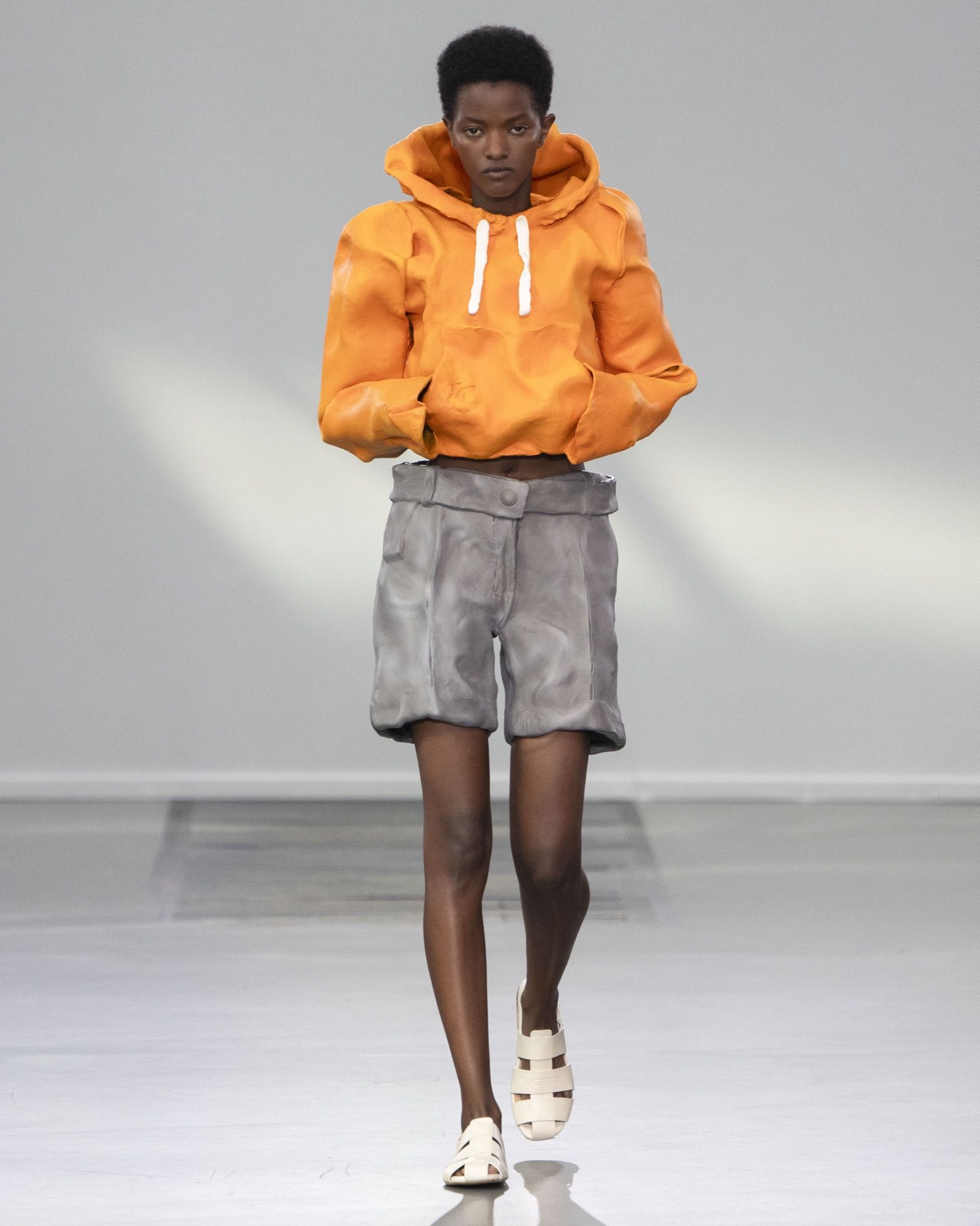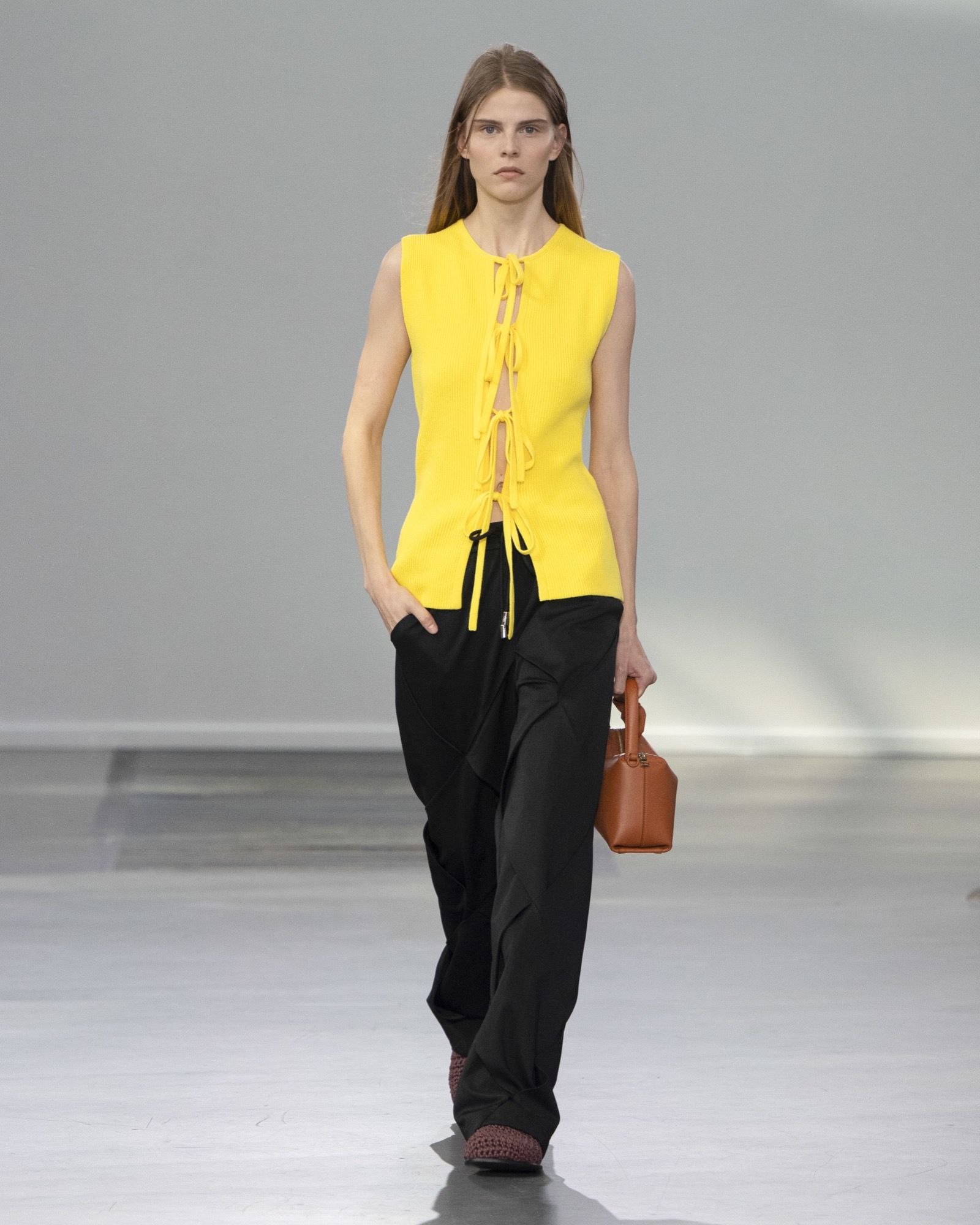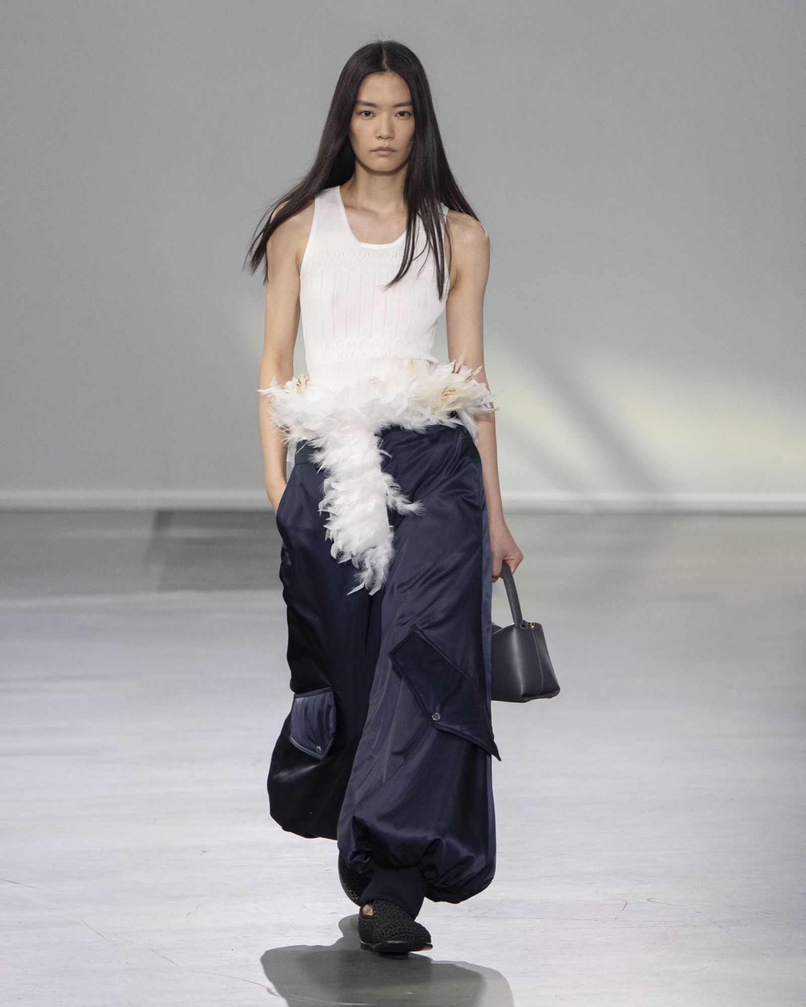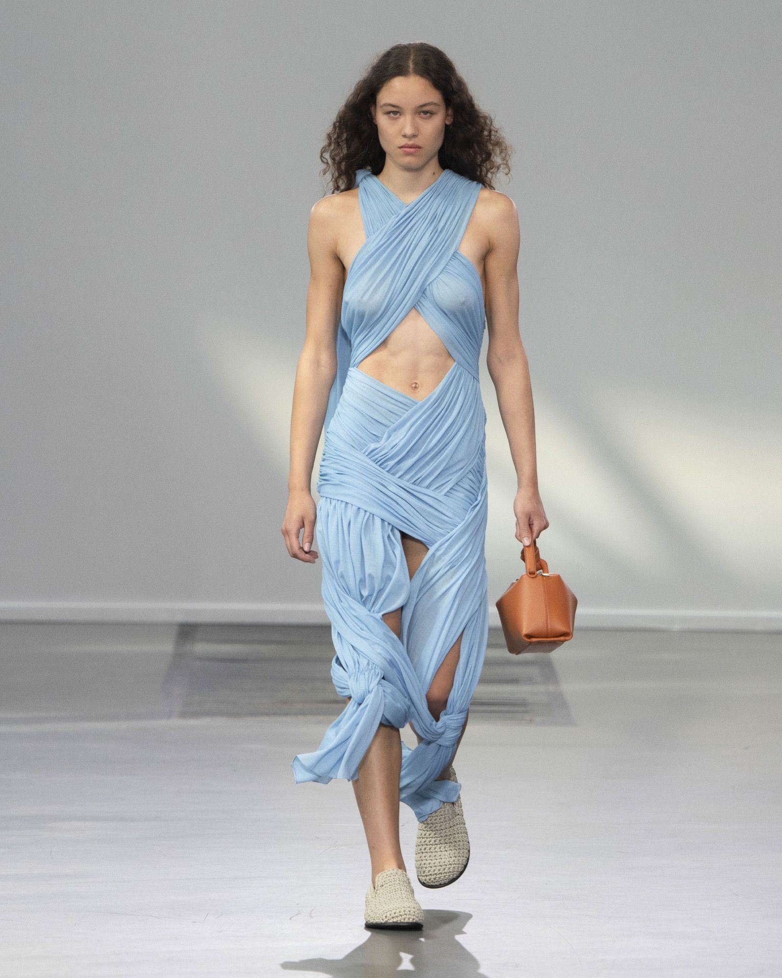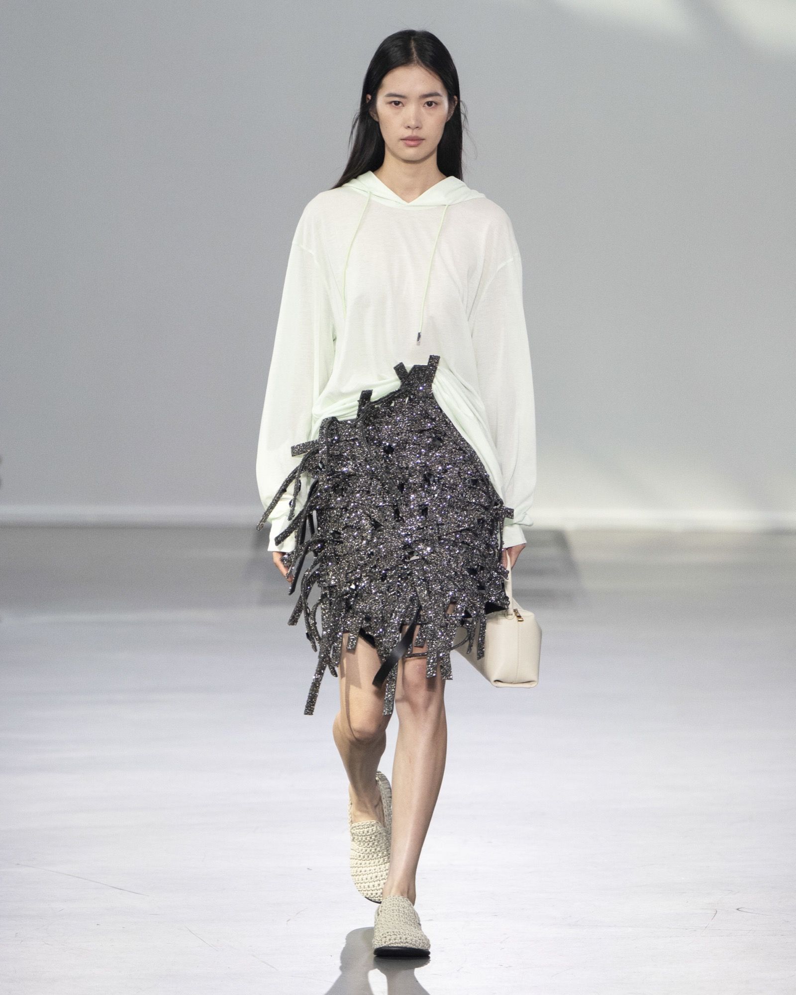 Nonostante la molteplicità di look che evidenziavano la radice spiritosa del brand, la collezione ha proposto abiti pratici. I trench verde menta e beige, scultorei ed elasticizzati in vita, ricoprono esattamente il ruolo che questi conservano da sempre, come del resto anche le bomber jacket, arricchite da piume bianche, i pantaloni della tuta, in pannelli di cotone verde foresta, gli abiti da sera, drappeggiati sensualmente sul corpo delle modelle, e quelli in uncinetto, un simpatico ricordo di un’estate anni ’70. Ogni collezione di Anderson pone una speciale attenzione per il footwear, e questa stagione le star dello show sono stati i sandali da spiaggia, un classico della moda bambino reinterpretata per l’occasione in pelle goffrata marrone, arancione e panna, con il nome del brand. Mocassini e mule all’uncinetto facevano capolino dai pantaloni cargo di molte modelle, mentre alcune indossavano loafer in camoscio con kitten heel, la pantofola della nonna, ha ammesso Anderson, con qualche anno in meno.