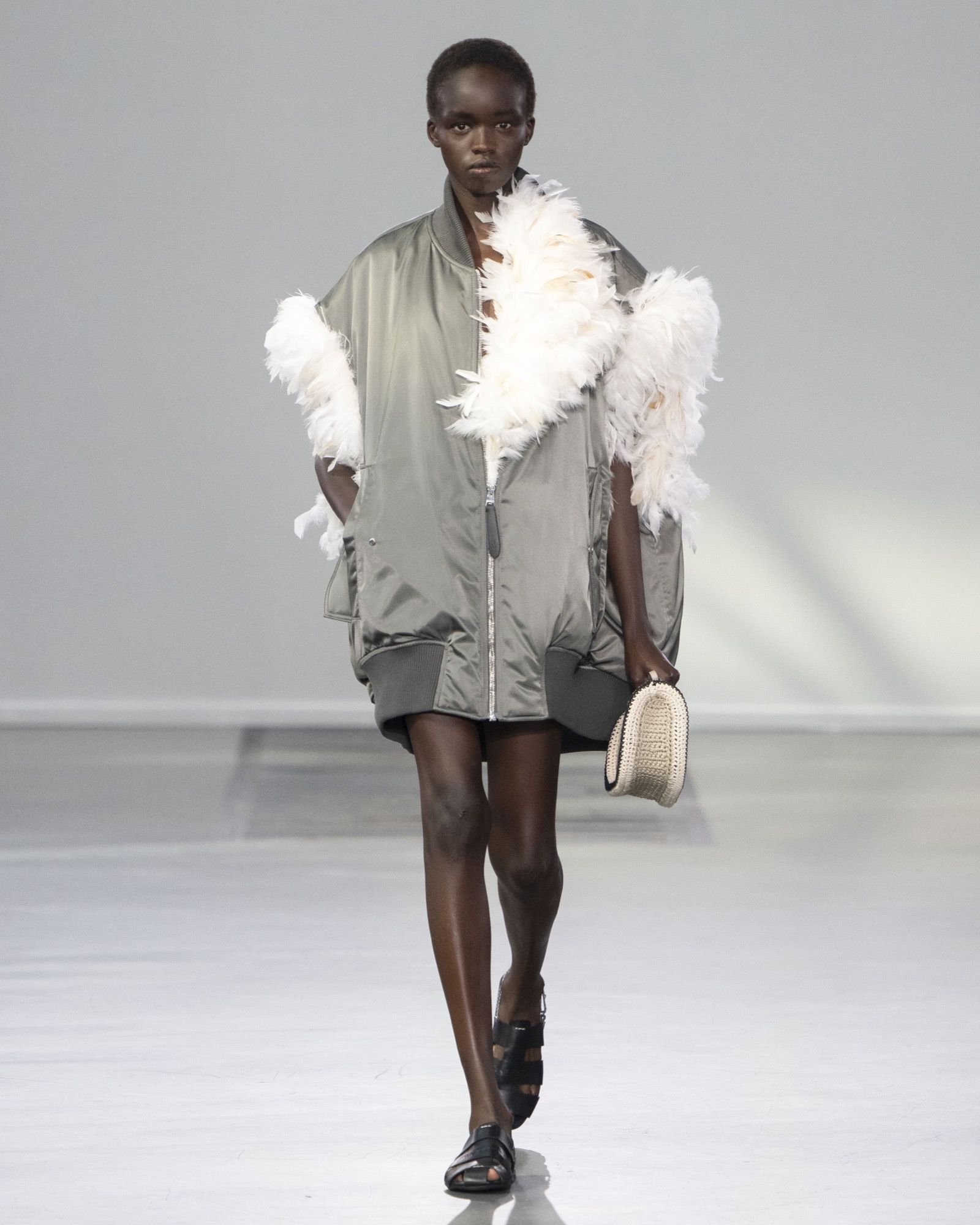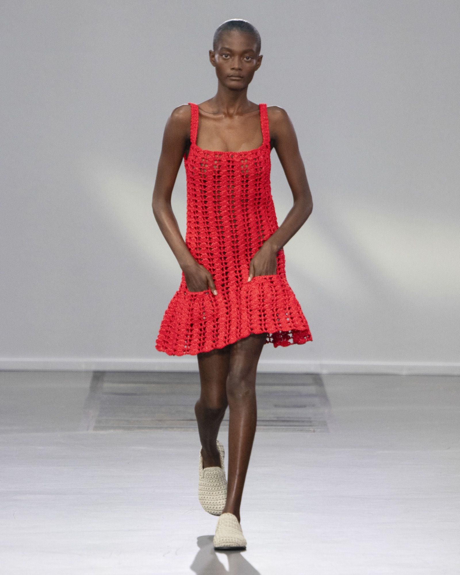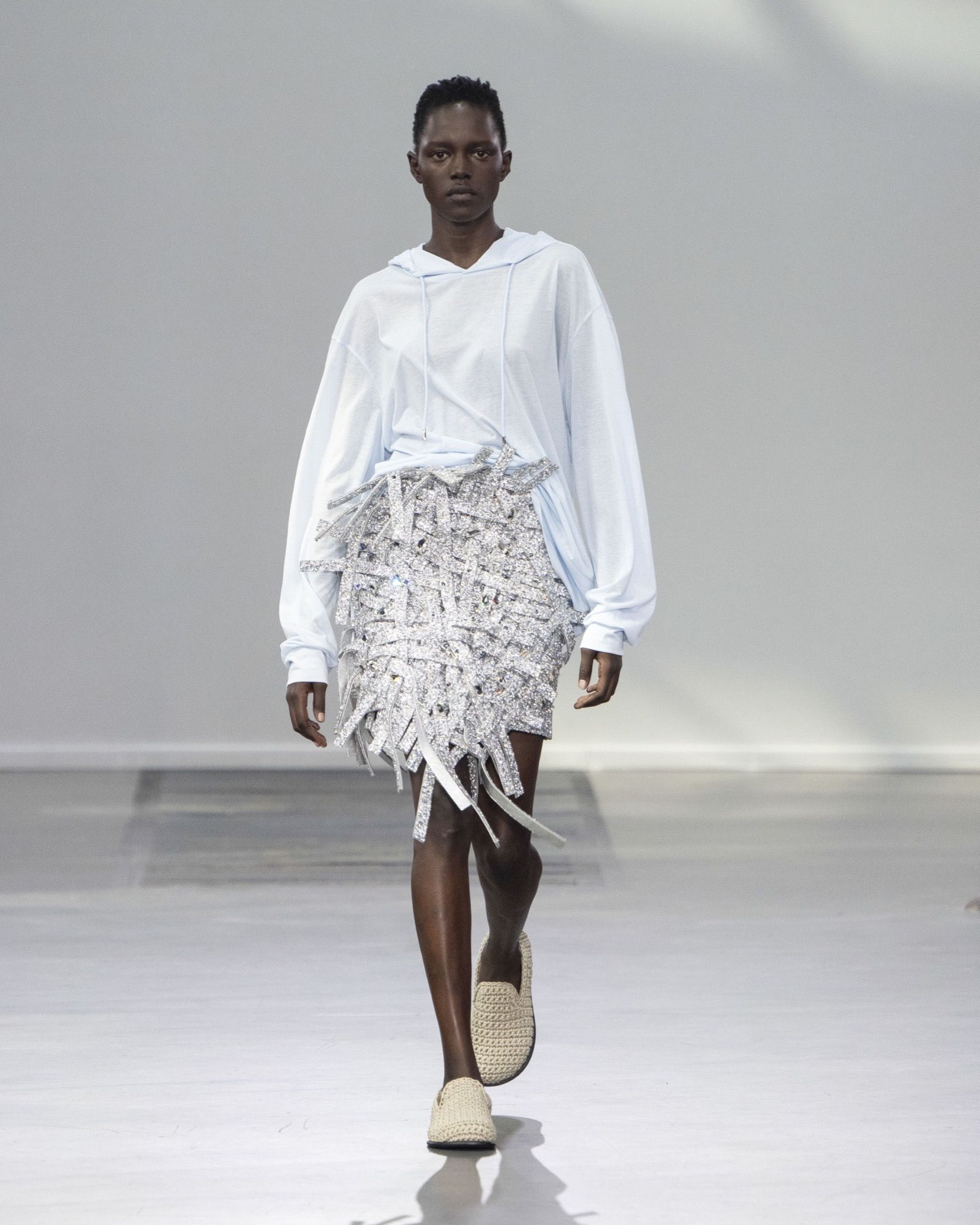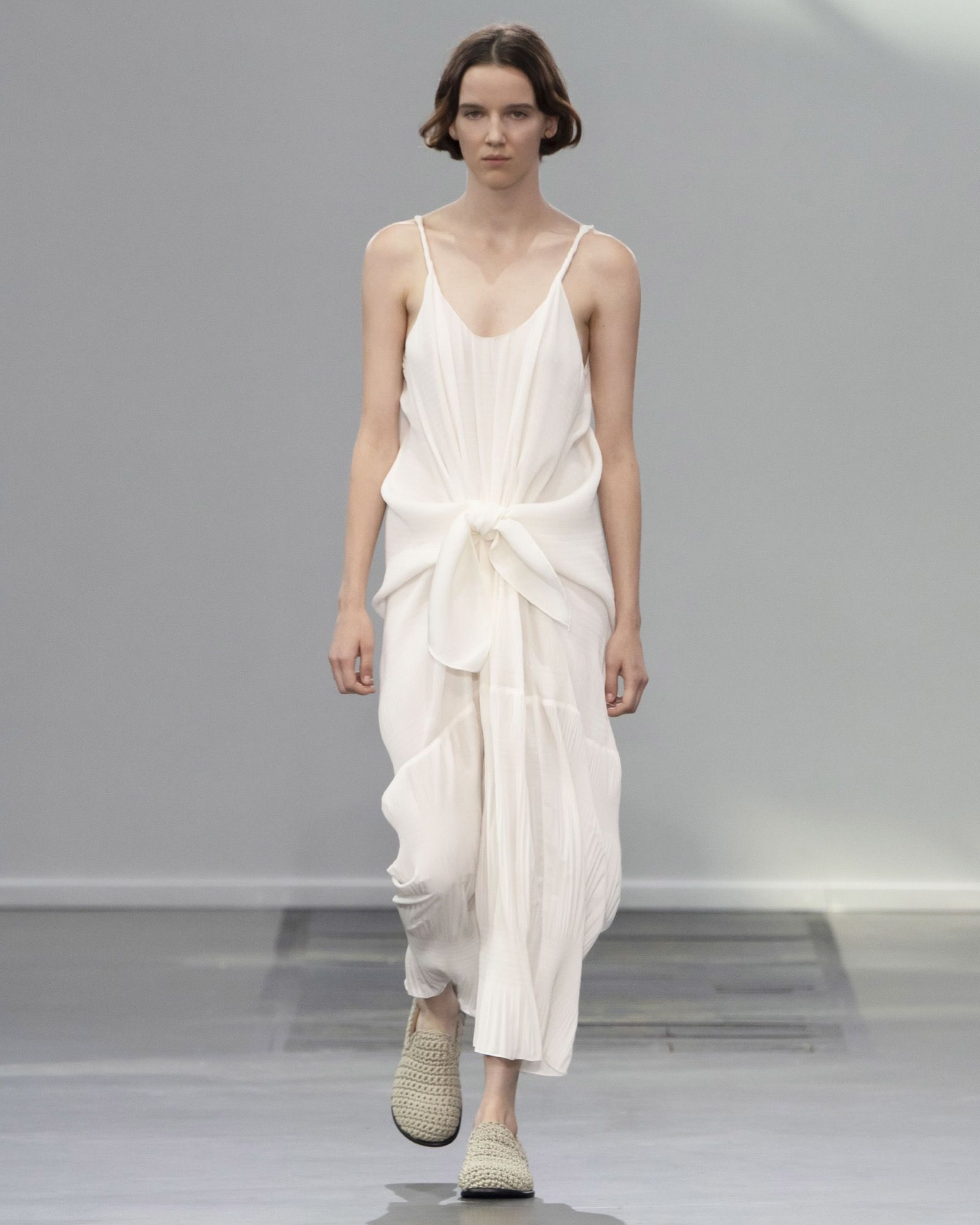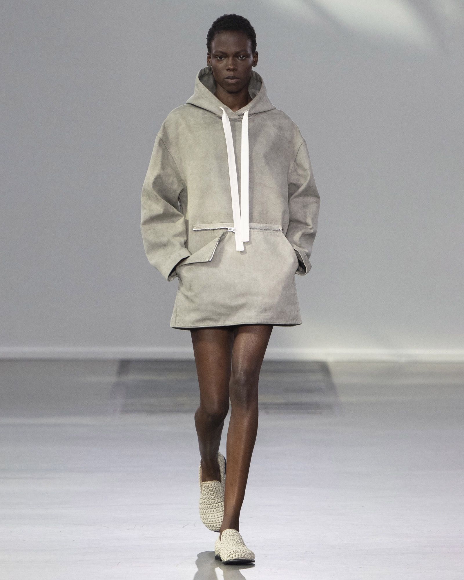 Nonostante la molteplicità di look che evidenziavano la radice spiritosa del brand, la collezione ha proposto abiti pratici. I trench verde menta e beige, scultorei ed elasticizzati in vita, ricoprono esattamente il ruolo che questi conservano da sempre, come del resto anche le bomber jacket, arricchite da piume bianche, i pantaloni della tuta, in pannelli di cotone verde foresta, gli abiti da sera, drappeggiati sensualmente sul corpo delle modelle, e quelli in uncinetto, un simpatico ricordo di un’estate anni ’70. Ogni collezione di Anderson pone una speciale attenzione per il footwear, e questa stagione le star dello show sono stati i sandali da spiaggia, un classico della moda bambino reinterpretata per l’occasione in pelle goffrata marrone, arancione e panna, con il nome del brand. Mocassini e mule all’uncinetto facevano capolino dai pantaloni cargo di molte modelle, mentre alcune indossavano loafer in camoscio con kitten heel, la pantofola della nonna, ha ammesso Anderson, con qualche anno in meno.
