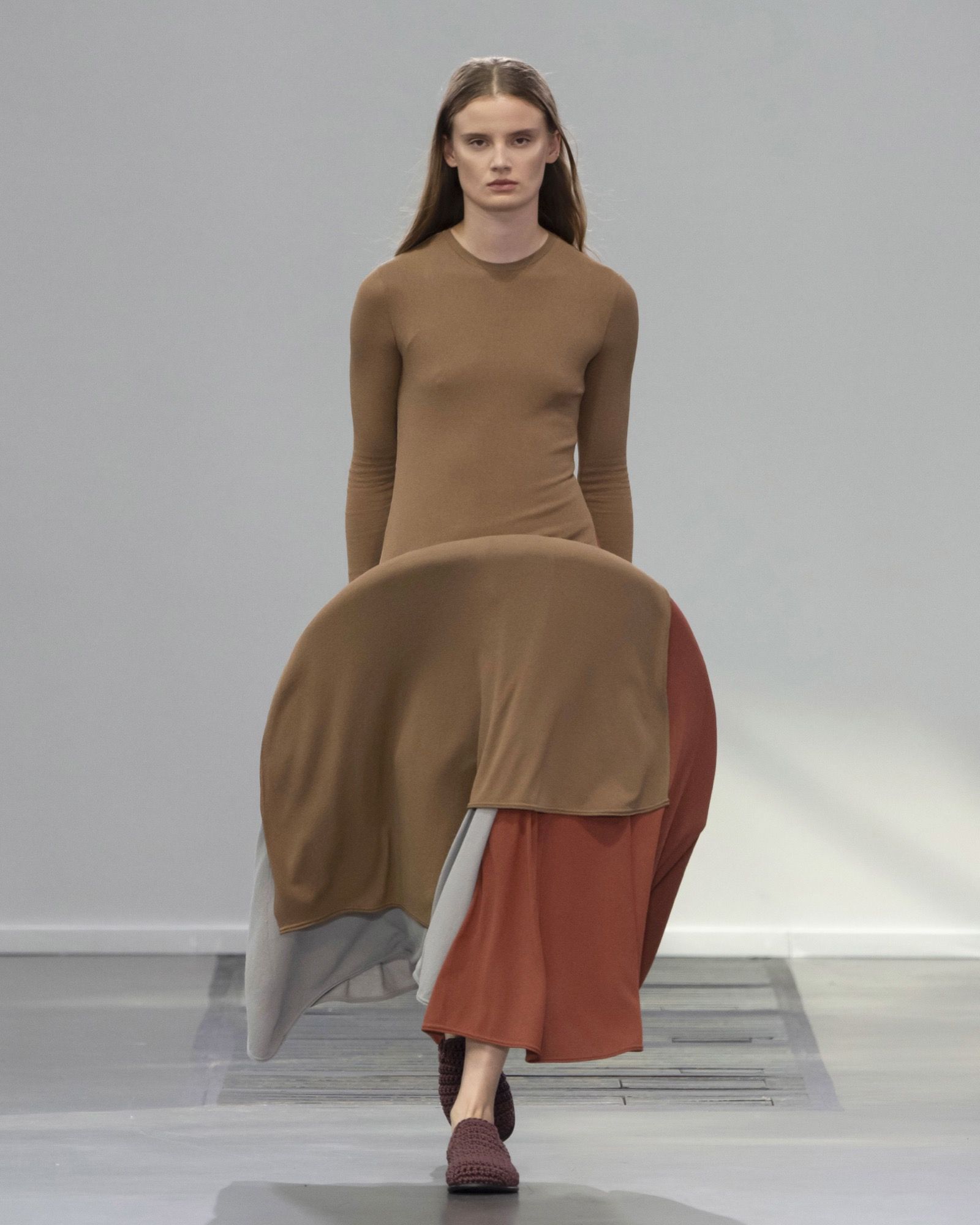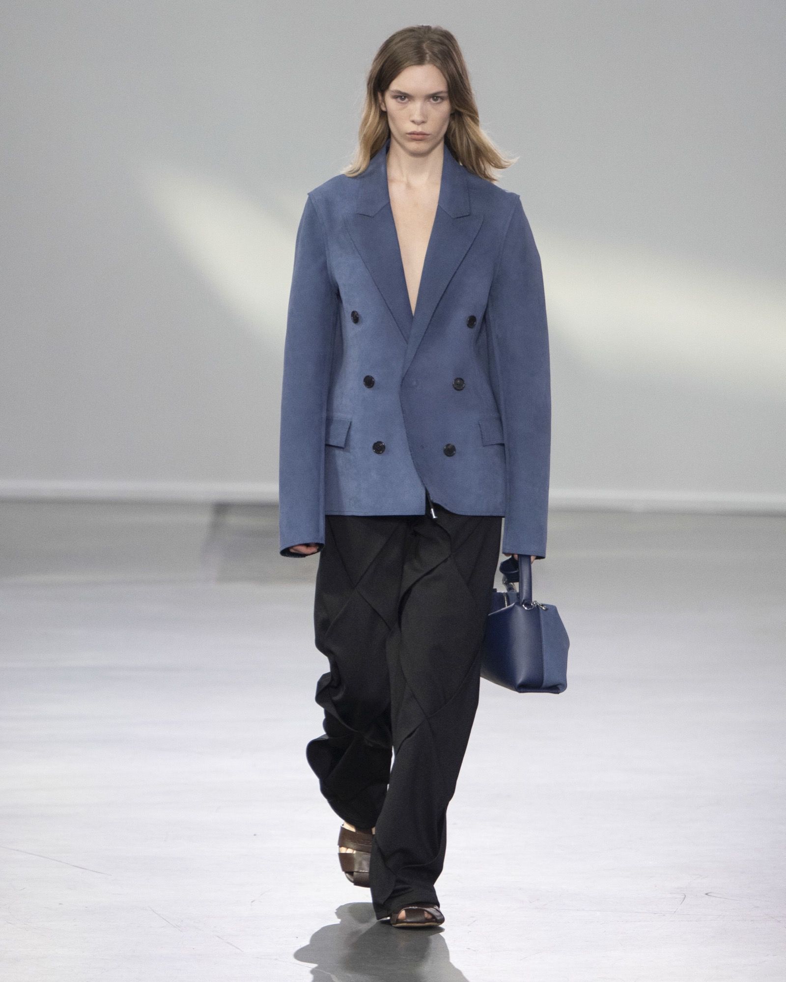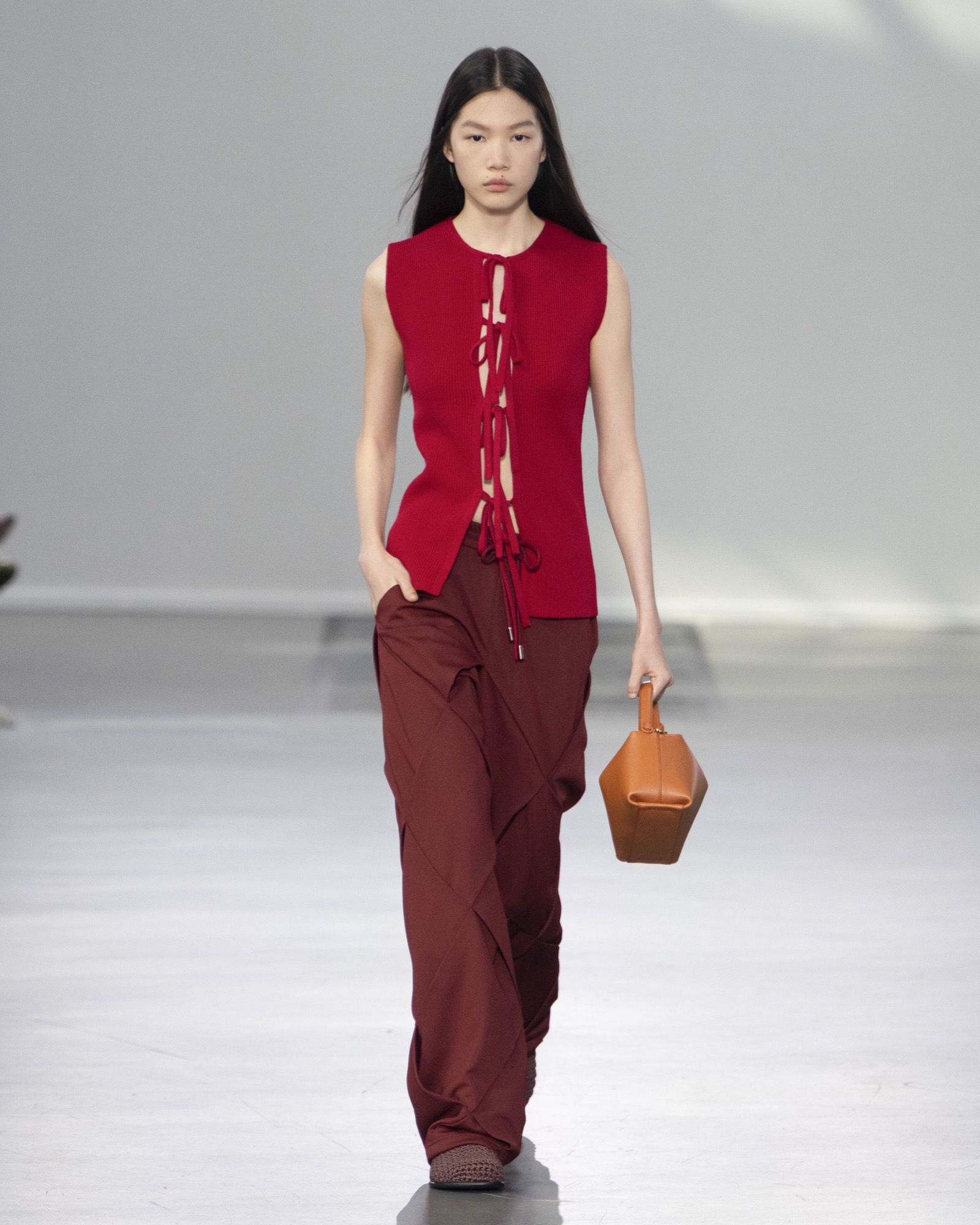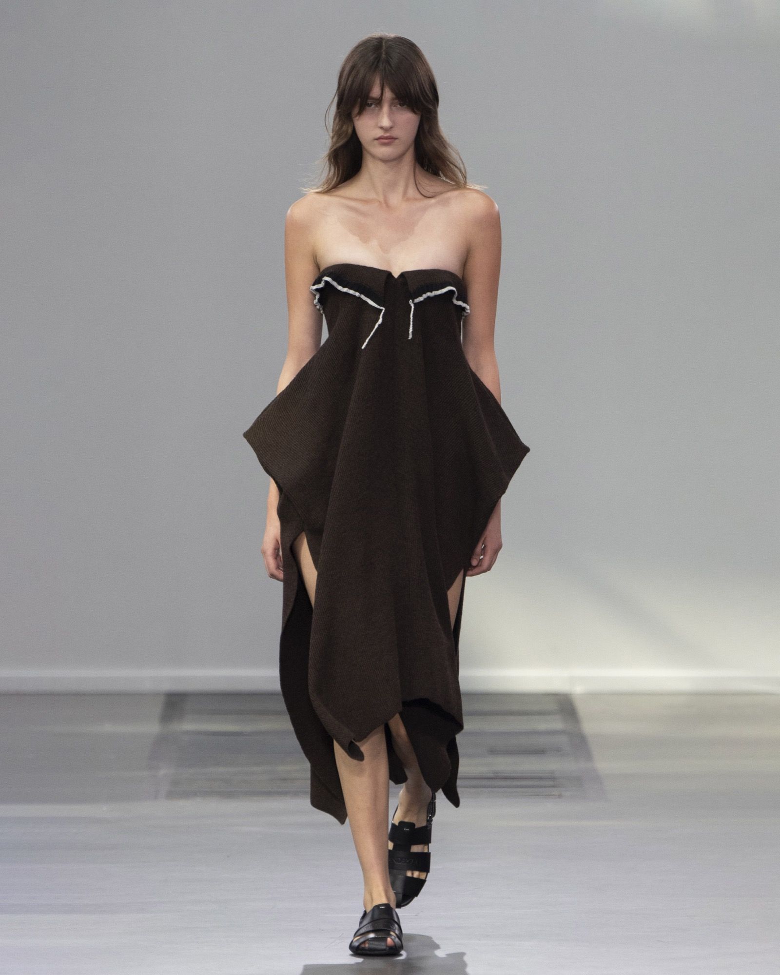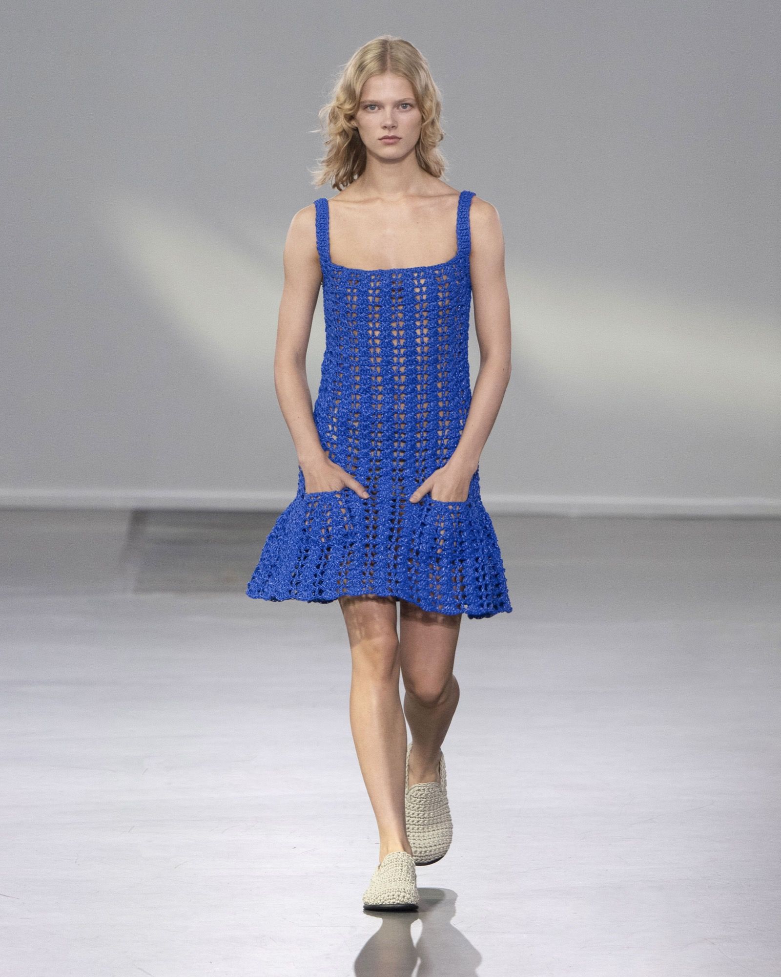 Nonostante la molteplicità di look che evidenziavano la radice spiritosa del brand, la collezione ha proposto abiti pratici. I trench verde menta e beige, scultorei ed elasticizzati in vita, ricoprono esattamente il ruolo che questi conservano da sempre, come del resto anche le bomber jacket, arricchite da piume bianche, i pantaloni della tuta, in pannelli di cotone verde foresta, gli abiti da sera, drappeggiati sensualmente sul corpo delle modelle, e quelli in uncinetto, un simpatico ricordo di un’estate anni ’70. Ogni collezione di Anderson pone una speciale attenzione per il footwear, e questa stagione le star dello show sono stati i sandali da spiaggia, un classico della moda bambino reinterpretata per l’occasione in pelle goffrata marrone, arancione e panna, con il nome del brand. Mocassini e mule all’uncinetto facevano capolino dai pantaloni cargo di molte modelle, mentre alcune indossavano loafer in camoscio con kitten heel, la pantofola della nonna, ha ammesso Anderson, con qualche anno in meno.