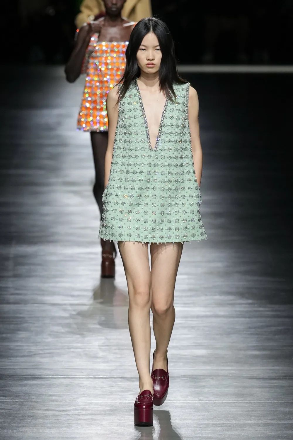 La collezione non ha mancato di fornire look degni di una serata extra-glamour. Abitini di linea composti da pietre preziose coloratissime e brillanti hanno preso la scena durante lo show, inserendosi a gamba tesa tra i look di più ordinaria compostezza. Non vedevamo l'ora di scoprire i nuovi accessori Gucci, ma alla fine ci è stato impossibile distogliere lo sguardo da questi vestiti luccicosi.