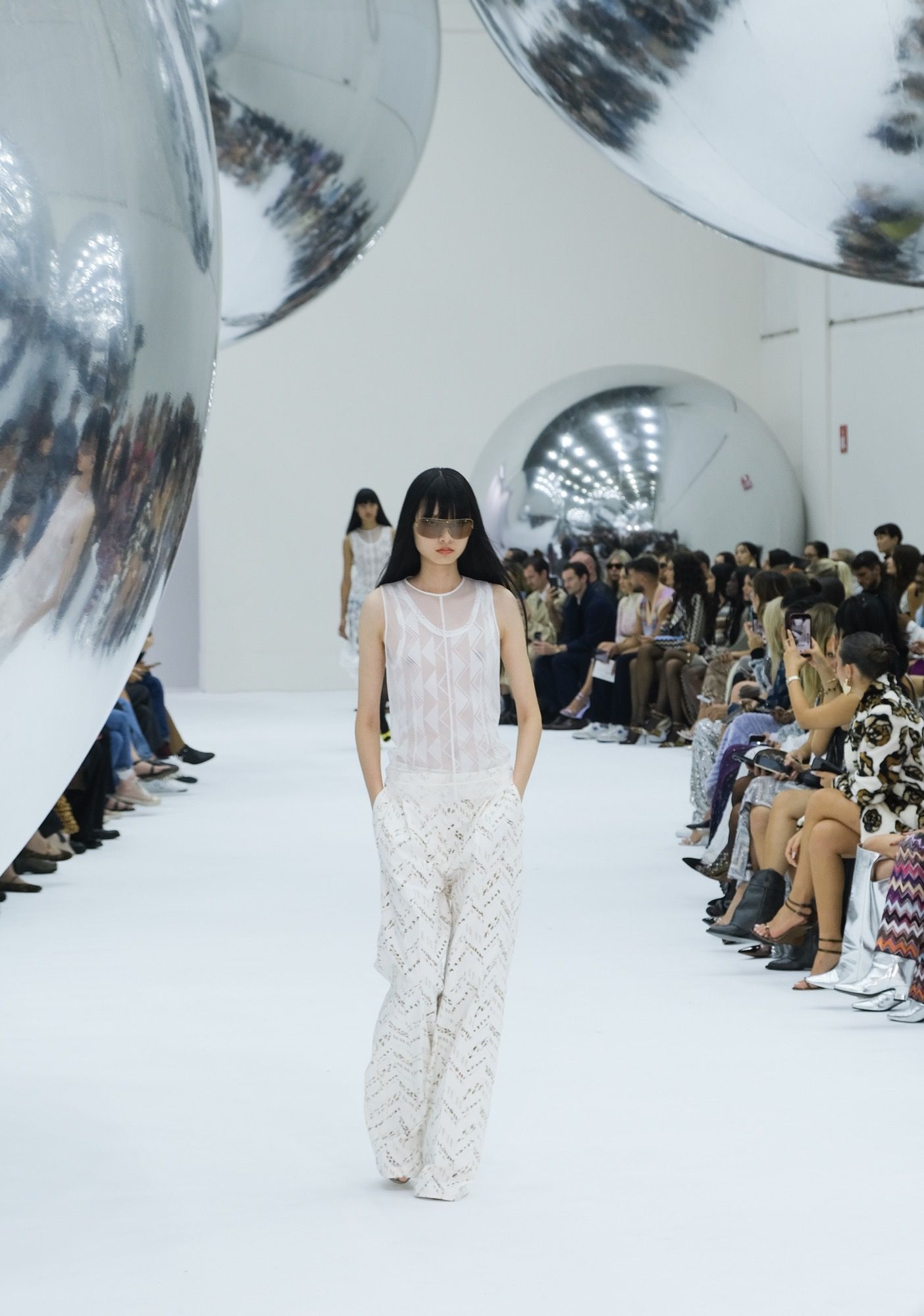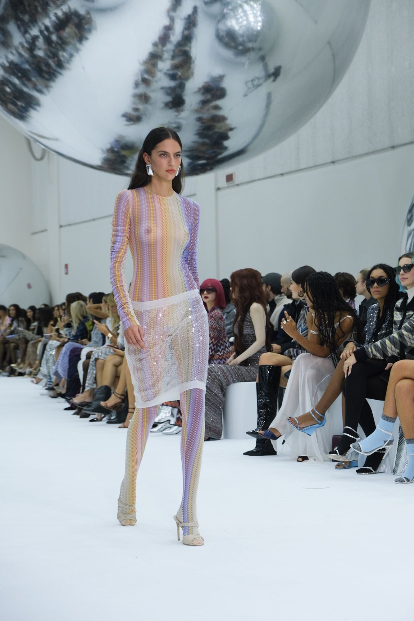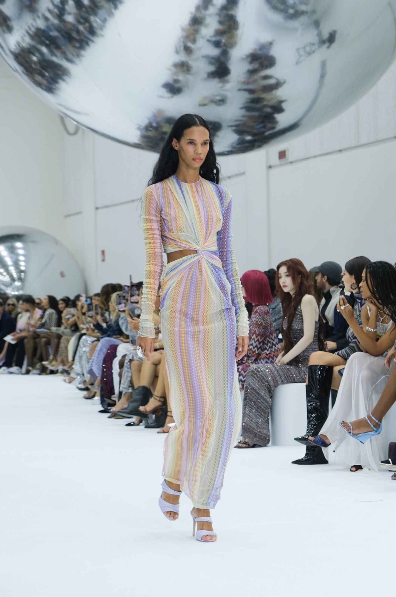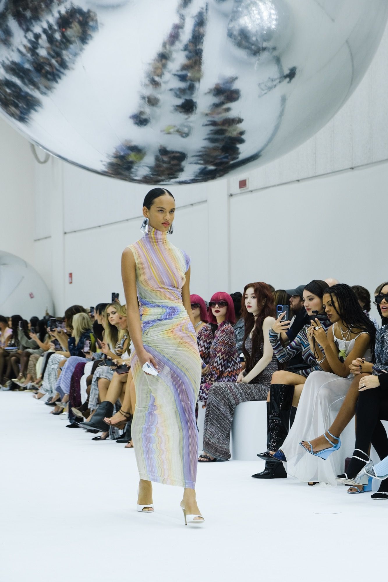 «Per il concetto della nuova collezione ho pensato di creare una nuova realtà,» spiega Grazioli, «ecco perché la domanda di questa collezione è Do you know how to enjoy reality? Quando ho visto il lavoro di Shawn ho pensato che sarebbe stato un ottimo abbinamento, lo spazio che stiamo creando qui è davvero una nuova realtà, un nuovo mondo.» La dimensione proposta dal setting dello show, come rivela Kolodny, è un gioco di riflessi con lo scopo di «vedere il mondo attraverso immagini distorte,» perché quello che rispecchiano le superfici metalliche e curve delle sfere siamo noi, ritratti sotto una luce diversa. Per Grazioli, che guida la direzione artistica di Missoni da marzo 2022, questa filosofia ricorda molto l’approccio investigativo del fondatore della maison. «Stavo leggendo Caleidoscopio Missoni, dove si possono vedere tutte le opere d’arte di Ottavio Missoni realizzate in patchwork di tessuti diversi, e mi è piaciuto questo suo modo nuovo di vedere i pattern,» spiega il designer. In questo senso, la collaborazione con Kolodny è nata per riportare alla luce l’osservazione dello stilista, «la diversa visione che Missoni aveva della grafica, dei colori, dei motivi,» aggiunge il designer, ricordando il ruolo portante che il DNA Missoni ricopre nell’attuale direzione artistica del brand.