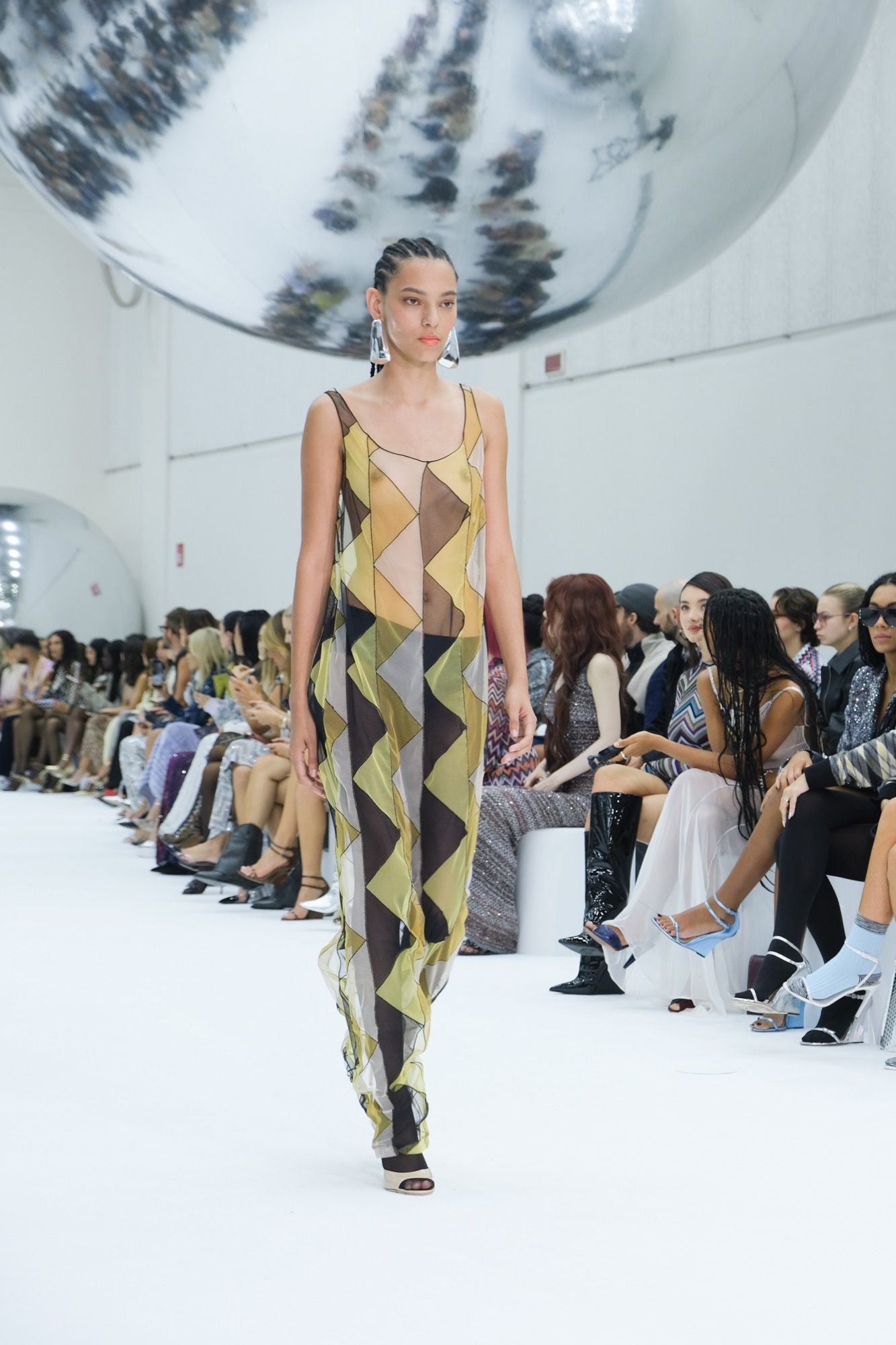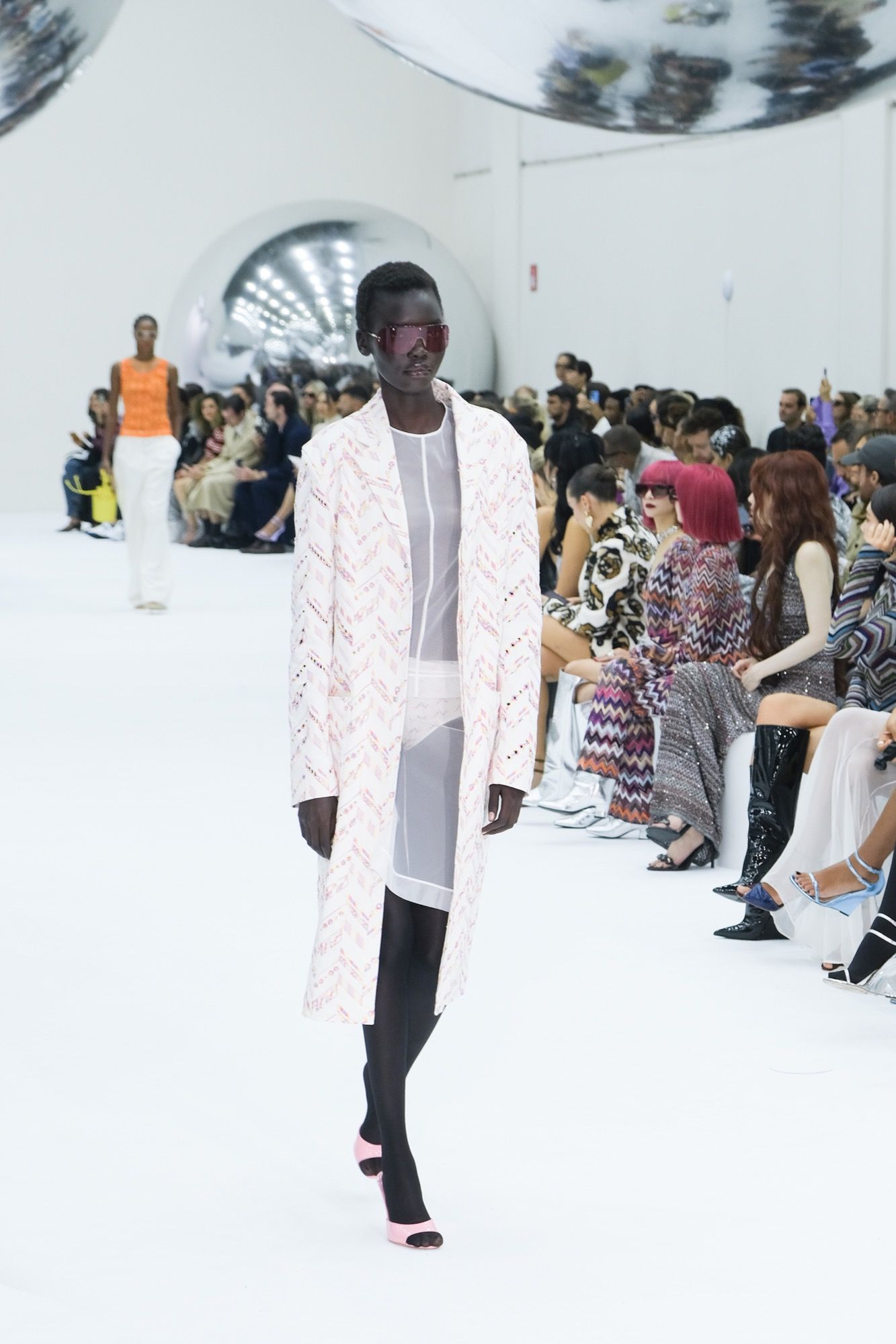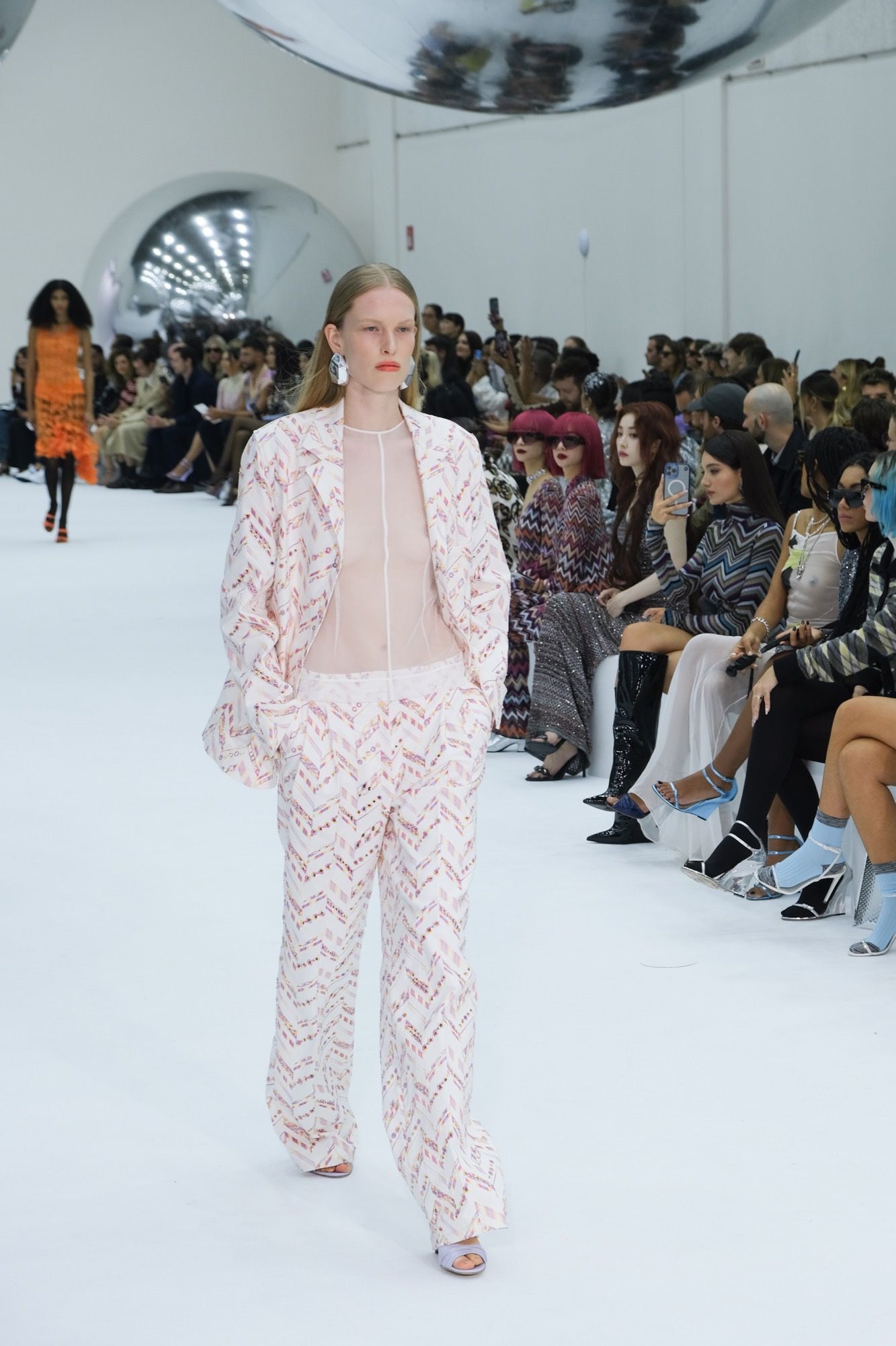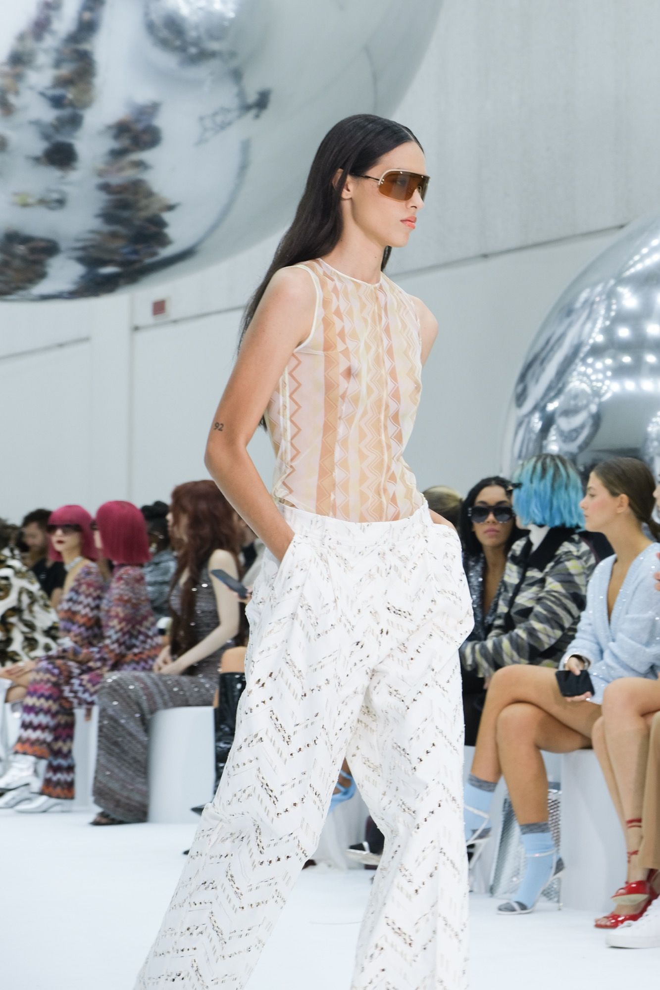 «Per il concetto della nuova collezione ho pensato di creare una nuova realtà,» spiega Grazioli, «ecco perché la domanda di questa collezione è Do you know how to enjoy reality? Quando ho visto il lavoro di Shawn ho pensato che sarebbe stato un ottimo abbinamento, lo spazio che stiamo creando qui è davvero una nuova realtà, un nuovo mondo.» La dimensione proposta dal setting dello show, come rivela Kolodny, è un gioco di riflessi con lo scopo di «vedere il mondo attraverso immagini distorte,» perché quello che rispecchiano le superfici metalliche e curve delle sfere siamo noi, ritratti sotto una luce diversa. Per Grazioli, che guida la direzione artistica di Missoni da marzo 2022, questa filosofia ricorda molto l’approccio investigativo del fondatore della maison. «Stavo leggendo Caleidoscopio Missoni, dove si possono vedere tutte le opere d’arte di Ottavio Missoni realizzate in patchwork di tessuti diversi, e mi è piaciuto questo suo modo nuovo di vedere i pattern,» spiega il designer. In questo senso, la collaborazione con Kolodny è nata per riportare alla luce l’osservazione dello stilista, «la diversa visione che Missoni aveva della grafica, dei colori, dei motivi,» aggiunge il designer, ricordando il ruolo portante che il DNA Missoni ricopre nell’attuale direzione artistica del brand.