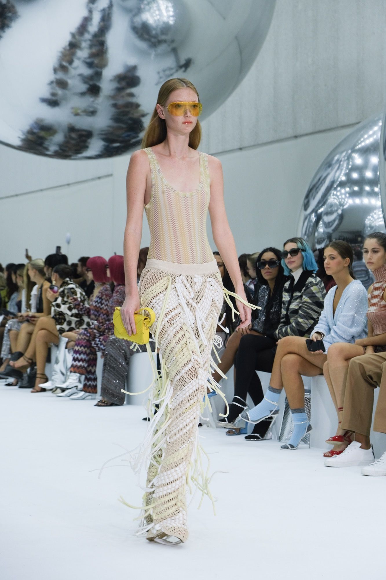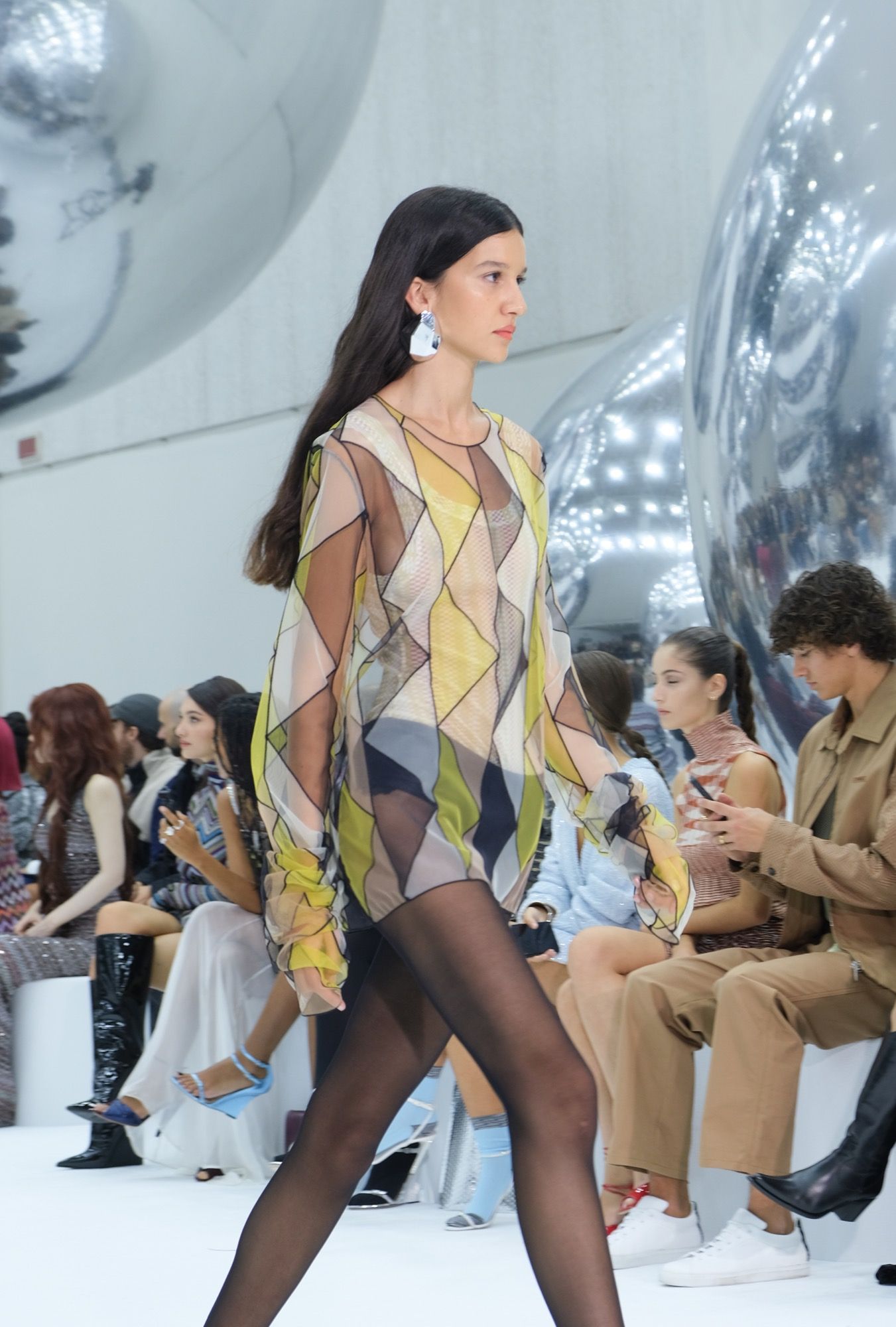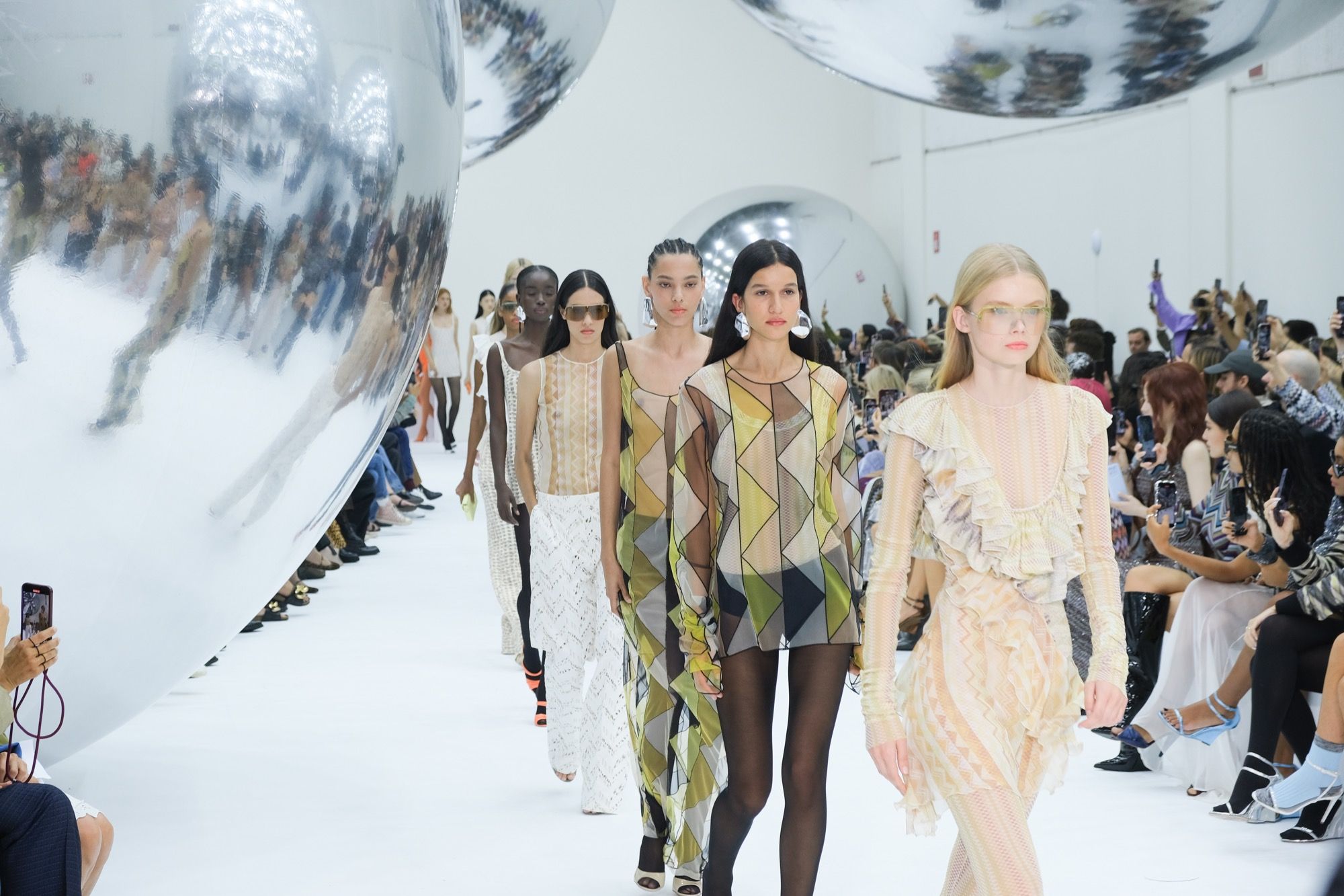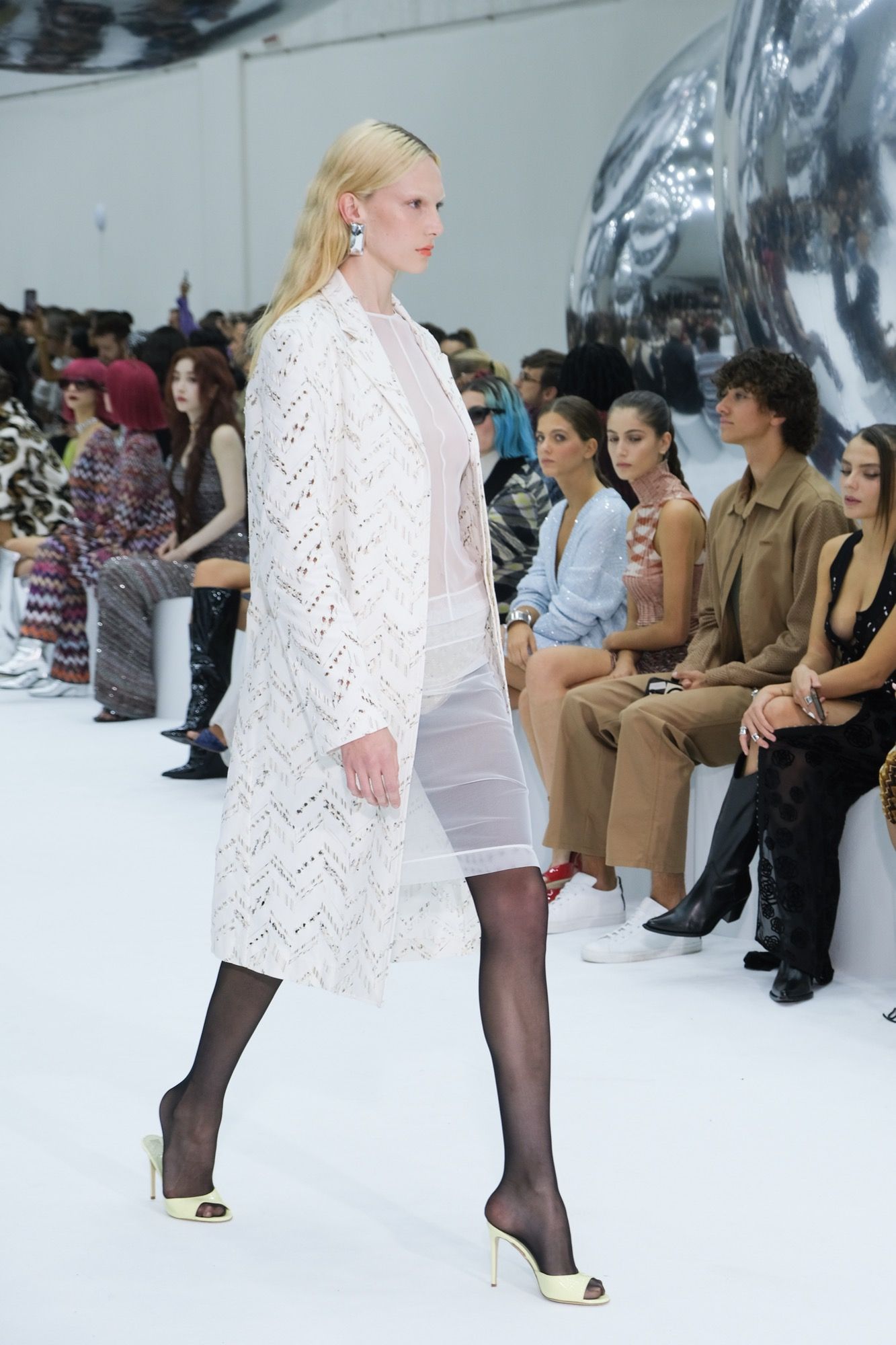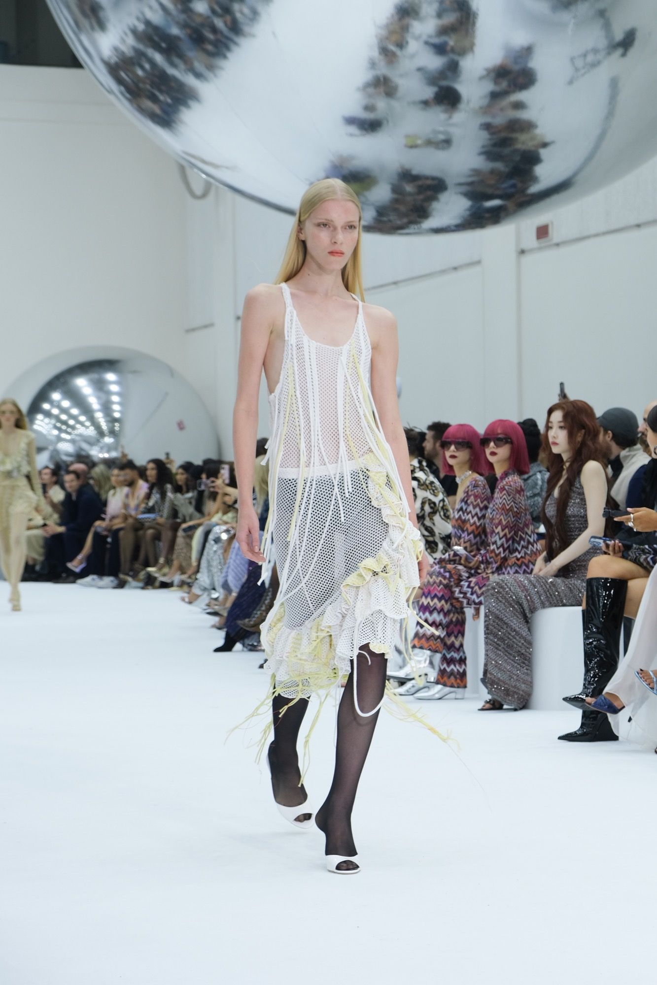 «Per il concetto della nuova collezione ho pensato di creare una nuova realtà,» spiega Grazioli, «ecco perché la domanda di questa collezione è Do you know how to enjoy reality? Quando ho visto il lavoro di Shawn ho pensato che sarebbe stato un ottimo abbinamento, lo spazio che stiamo creando qui è davvero una nuova realtà, un nuovo mondo.» La dimensione proposta dal setting dello show, come rivela Kolodny, è un gioco di riflessi con lo scopo di «vedere il mondo attraverso immagini distorte,» perché quello che rispecchiano le superfici metalliche e curve delle sfere siamo noi, ritratti sotto una luce diversa. Per Grazioli, che guida la direzione artistica di Missoni da marzo 2022, questa filosofia ricorda molto l’approccio investigativo del fondatore della maison. «Stavo leggendo Caleidoscopio Missoni, dove si possono vedere tutte le opere d’arte di Ottavio Missoni realizzate in patchwork di tessuti diversi, e mi è piaciuto questo suo modo nuovo di vedere i pattern,» spiega il designer. In questo senso, la collaborazione con Kolodny è nata per riportare alla luce l’osservazione dello stilista, «la diversa visione che Missoni aveva della grafica, dei colori, dei motivi,» aggiunge il designer, ricordando il ruolo portante che il DNA Missoni ricopre nell’attuale direzione artistica del brand.
