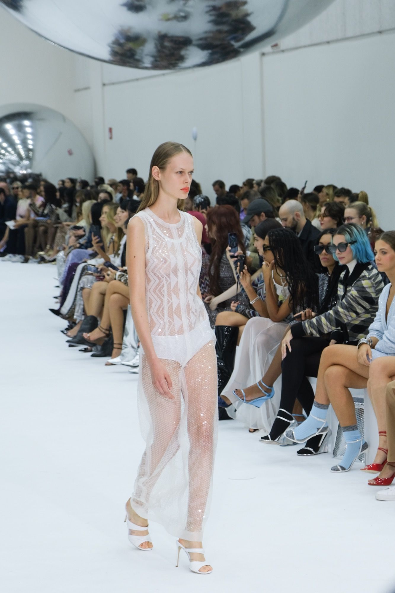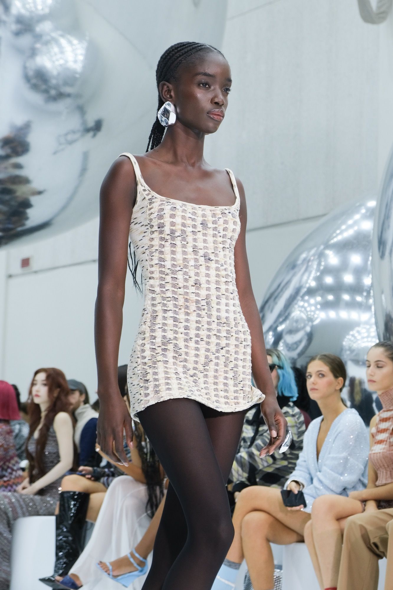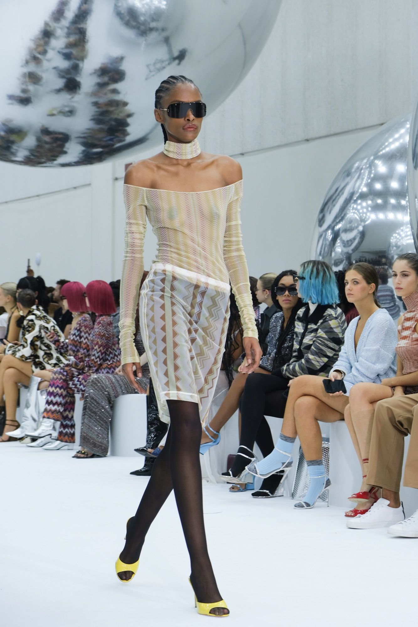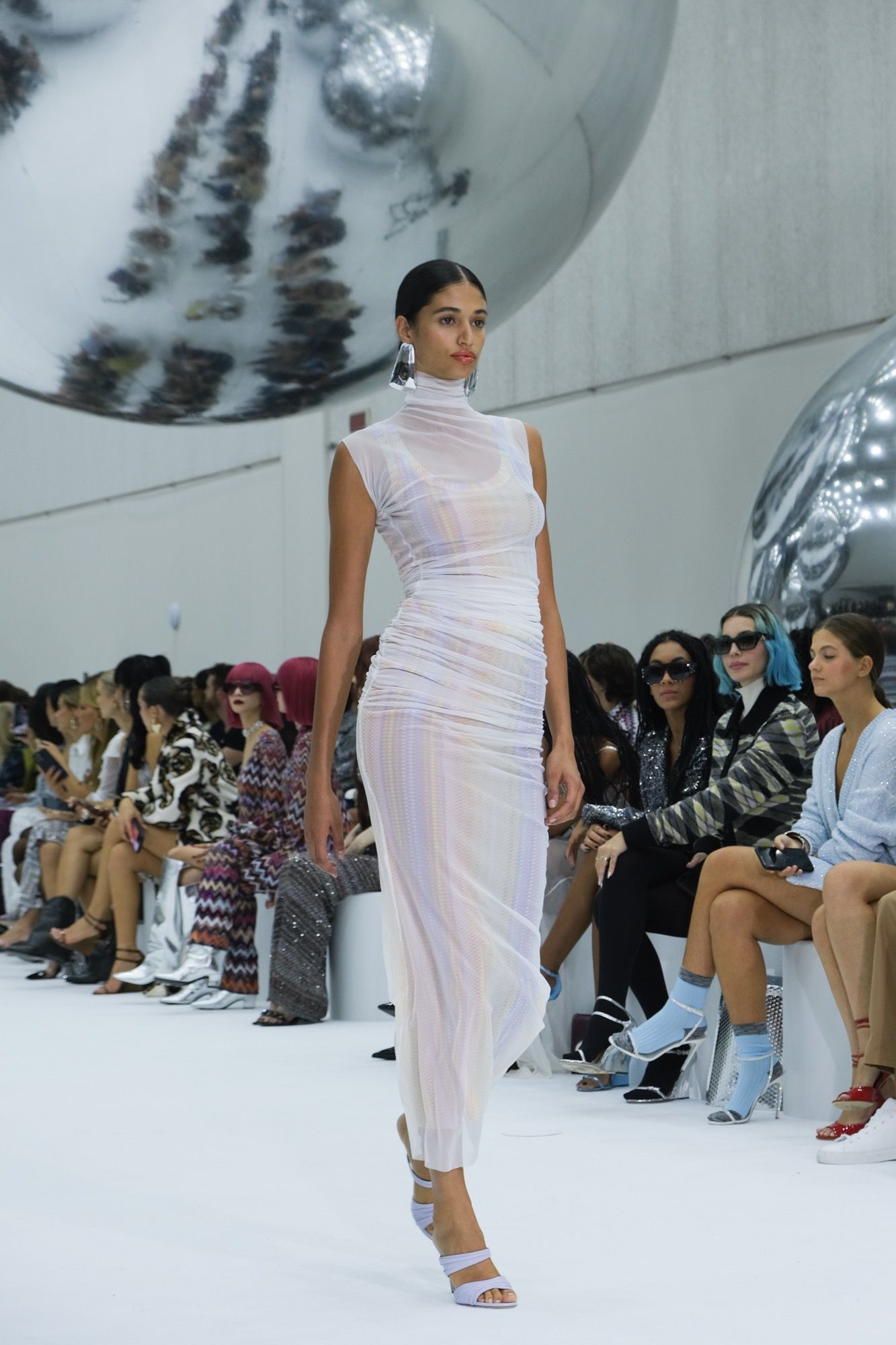 «Per il concetto della nuova collezione ho pensato di creare una nuova realtà,» spiega Grazioli, «ecco perché la domanda di questa collezione è Do you know how to enjoy reality? Quando ho visto il lavoro di Shawn ho pensato che sarebbe stato un ottimo abbinamento, lo spazio che stiamo creando qui è davvero una nuova realtà, un nuovo mondo.» La dimensione proposta dal setting dello show, come rivela Kolodny, è un gioco di riflessi con lo scopo di «vedere il mondo attraverso immagini distorte,» perché quello che rispecchiano le superfici metalliche e curve delle sfere siamo noi, ritratti sotto una luce diversa. Per Grazioli, che guida la direzione artistica di Missoni da marzo 2022, questa filosofia ricorda molto l’approccio investigativo del fondatore della maison. «Stavo leggendo Caleidoscopio Missoni, dove si possono vedere tutte le opere d’arte di Ottavio Missoni realizzate in patchwork di tessuti diversi, e mi è piaciuto questo suo modo nuovo di vedere i pattern,» spiega il designer. In questo senso, la collaborazione con Kolodny è nata per riportare alla luce l’osservazione dello stilista, «la diversa visione che Missoni aveva della grafica, dei colori, dei motivi,» aggiunge il designer, ricordando il ruolo portante che il DNA Missoni ricopre nell’attuale direzione artistica del brand.