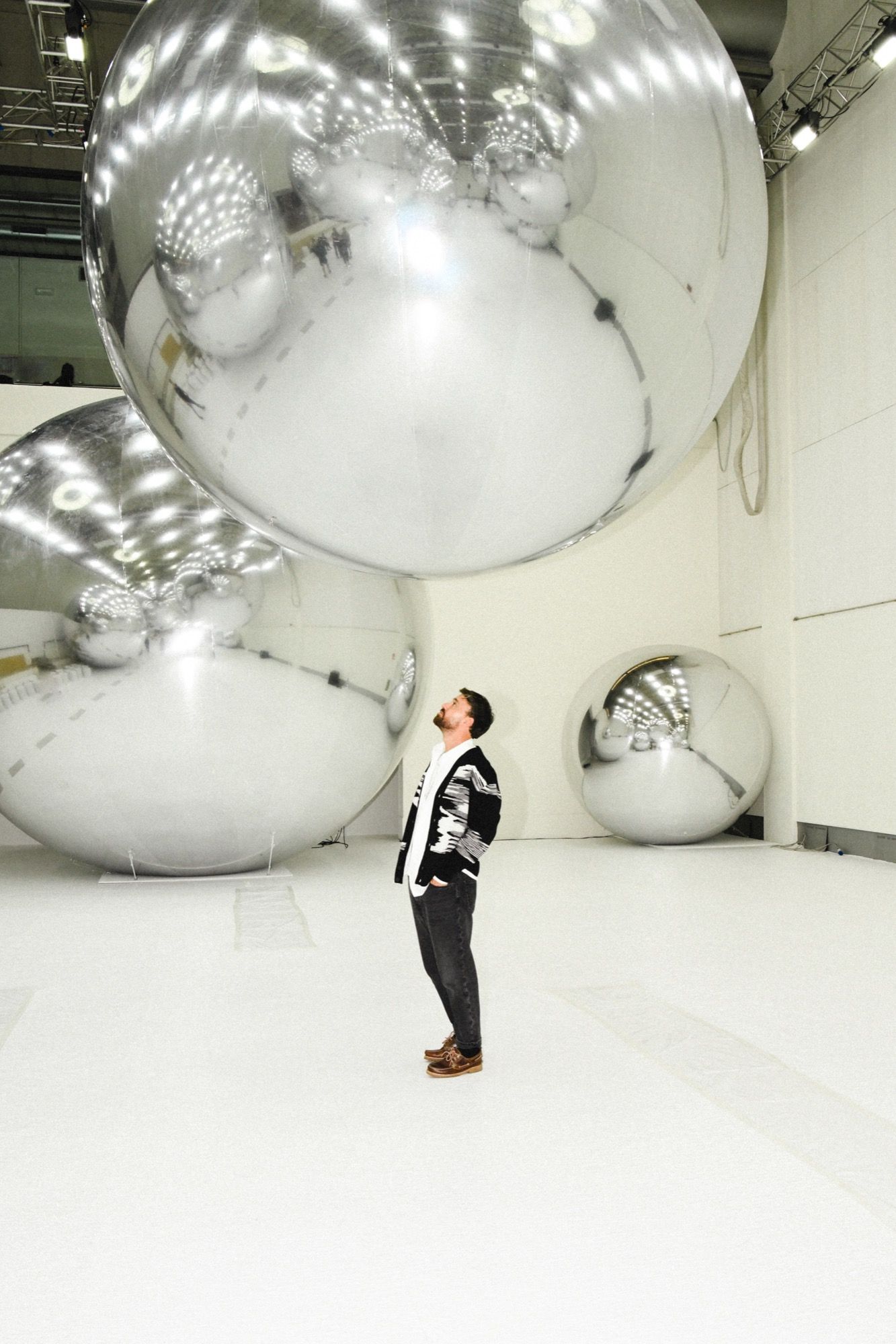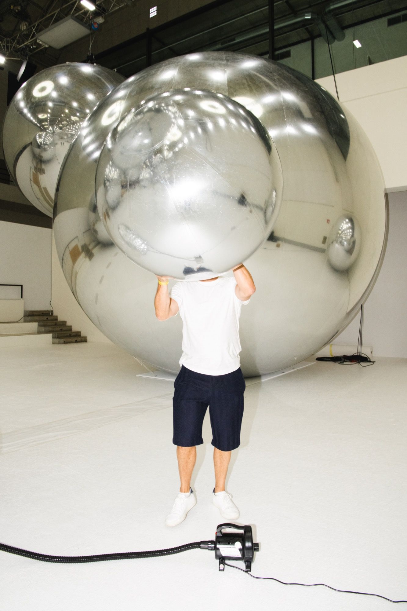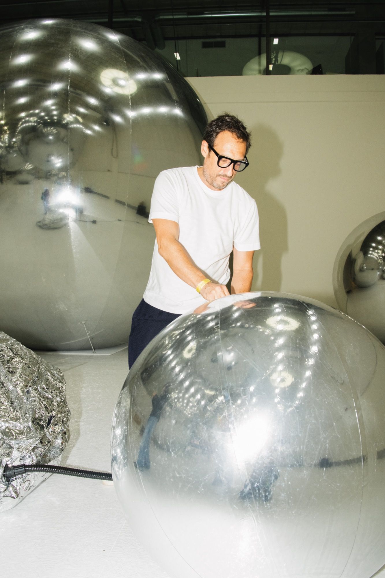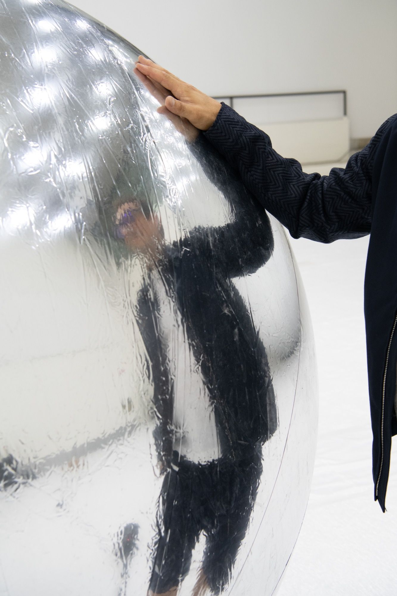 Durante lo shooting di Filippo Grazioli e Shawn Kolodny, il team ruota attorno alle sfere dell’artista sperando di non rimanere fotografato nel riflesso di una delle installazioni. Osservando tutti scappare da una parte all’altra di spazio La Pelota, viene da pensare all’energia dei bambini quando giocano a rincorrersi, e anche al momento in cui, sabato pomeriggio, gli abiti multicolour di Grazioli verranno riflessi sull’argento luccicante di queste immense forme circolari proponendo agli ospiti l’immagine speculare di loro stessi, assieme a quella dei look. Mentre questa sera nella stanza si può udire solo il formicolio della nostra conversazione, sabato prenderà luogo una vera e propria opera d'arte corale, resa ancor più grande grazie agli specchi di Kolodny. «I vestiti definiscono le persone,» spiega l’artista, facendo un paragone tra le sue opere e la moda. «Si prende il proprio interno e lo si mostra all'esterno, che sia flamboyant o conservatore. Il mio lavoro fa la stessa cosa, ti prende e ti riporta a te stesso, con un piccolo twist.» Così come la moda anni ’70, eternamente riconosciuta come la decade della liberazione sessuale, delle proteste e delle provocazioni come atto di rivolta, l'autoriflessione che nasce quando ci si ritrova di fronte alle sfere di Kolodny è irrompente, ma esteticamente poetica. «È provocatorio per le sue dimensioni,» spiega l’artista. «Creare opere immense e monumentali è una cosa che mi piace. È con questo che le persone entrano in contatto, possono interagire, diventarne parte. Fa qualcosa per alcune persone, rende la connessione un po' più speciale.»