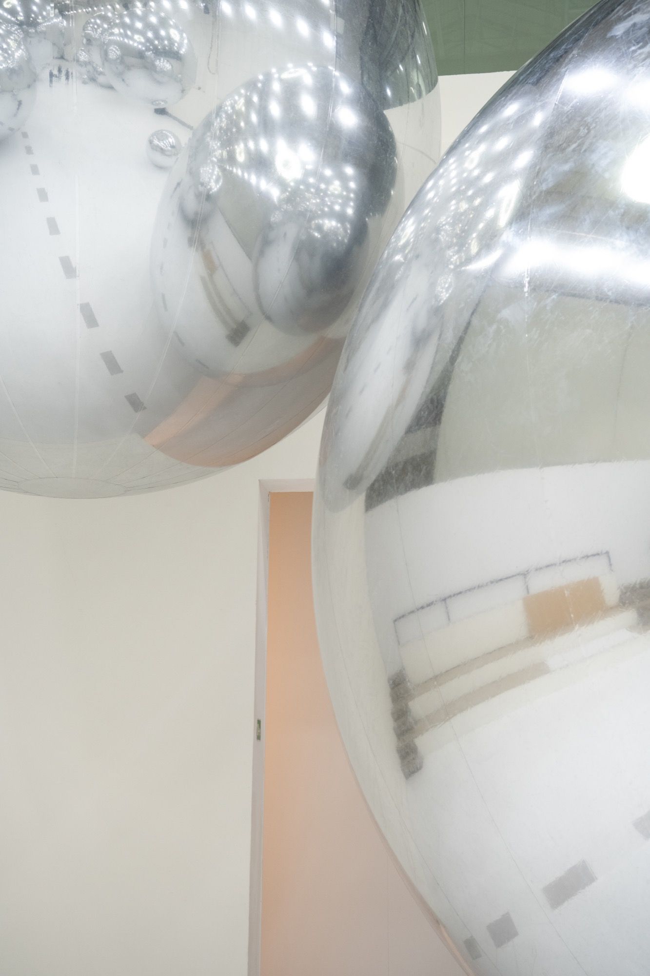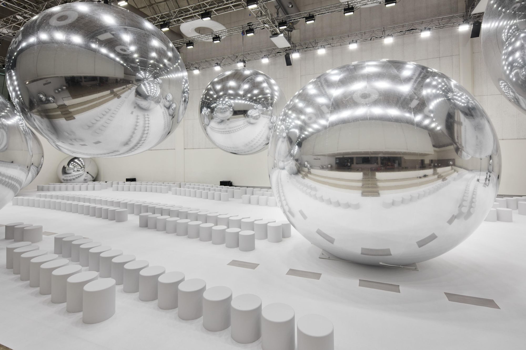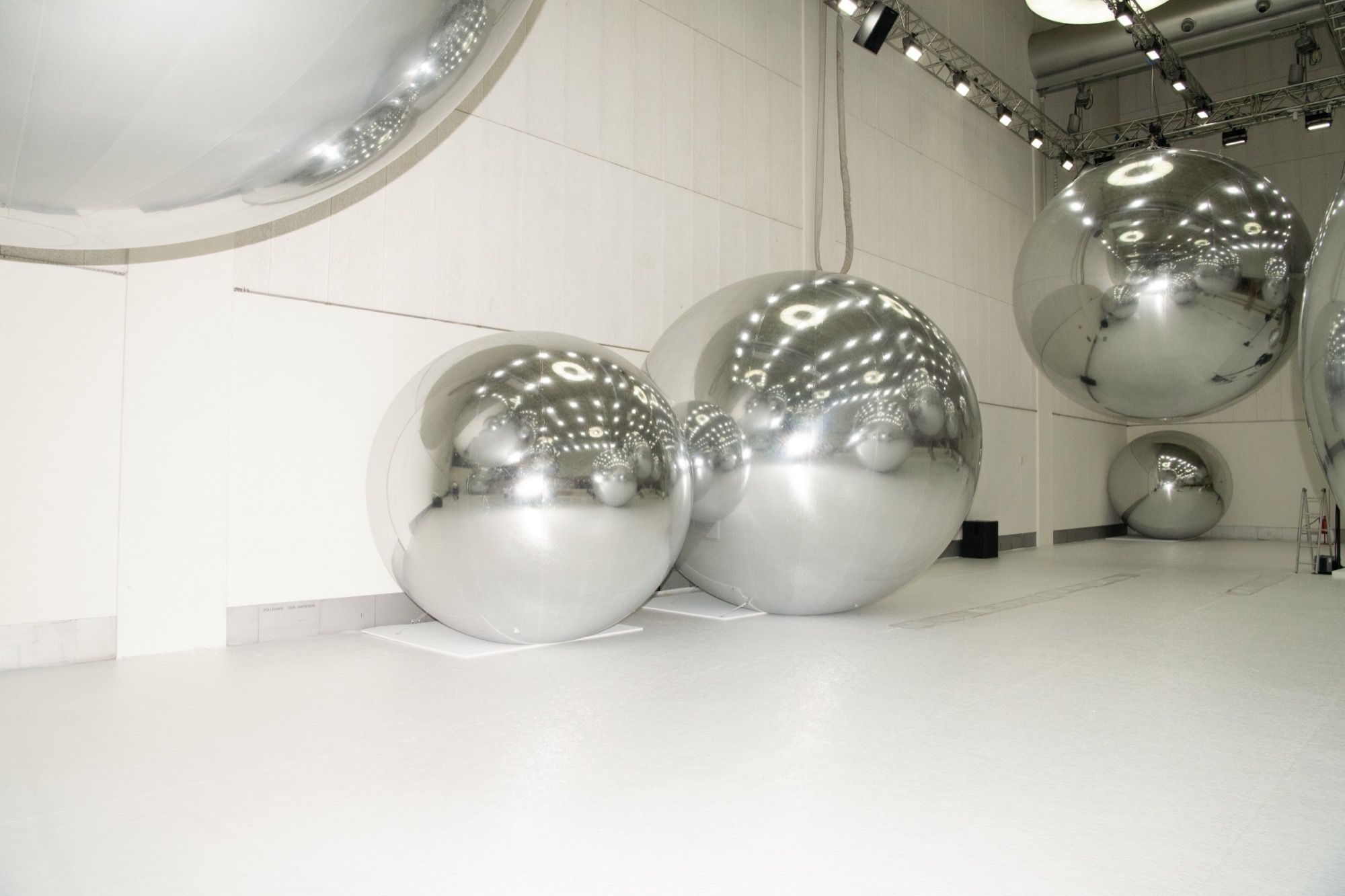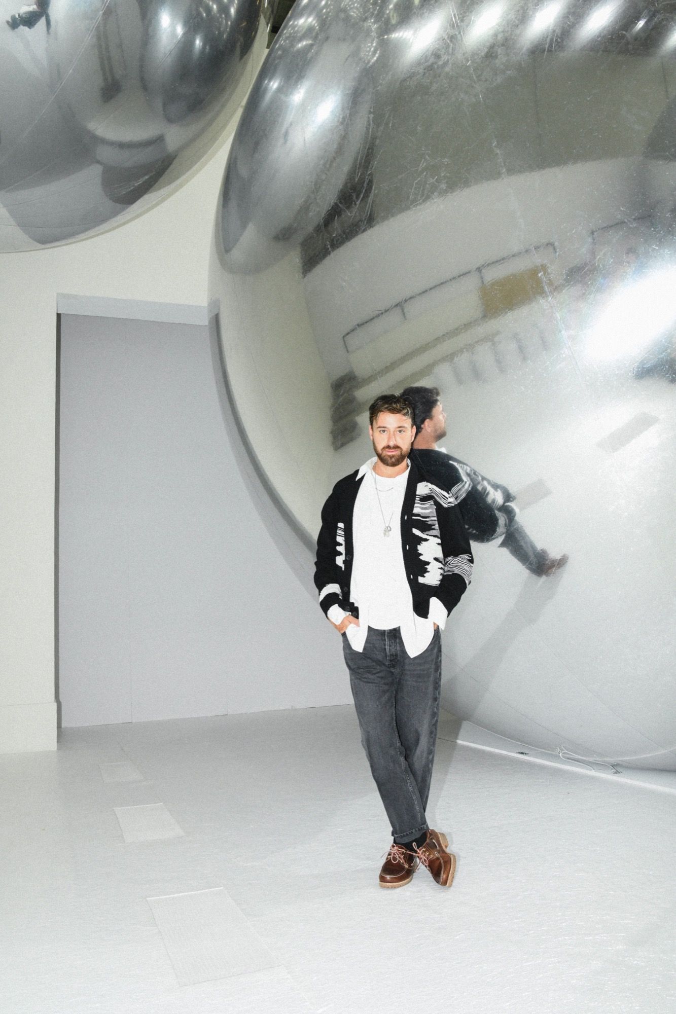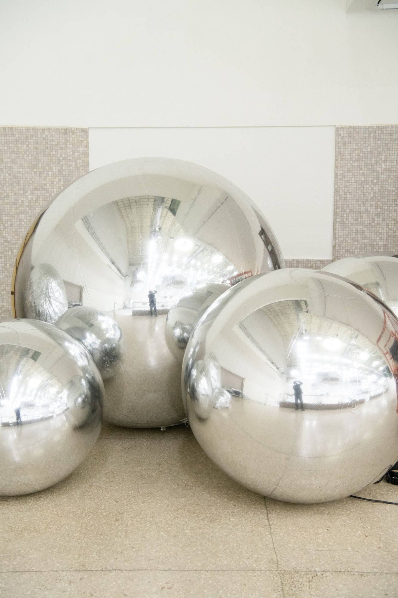 Durante lo shooting di Filippo Grazioli e Shawn Kolodny, il team ruota attorno alle sfere dell’artista sperando di non rimanere fotografato nel riflesso di una delle installazioni. Osservando tutti scappare da una parte all’altra di spazio La Pelota, viene da pensare all’energia dei bambini quando giocano a rincorrersi, e anche al momento in cui, sabato pomeriggio, gli abiti multicolour di Grazioli verranno riflessi sull’argento luccicante di queste immense forme circolari proponendo agli ospiti l’immagine speculare di loro stessi, assieme a quella dei look. Mentre questa sera nella stanza si può udire solo il formicolio della nostra conversazione, sabato prenderà luogo una vera e propria opera d'arte corale, resa ancor più grande grazie agli specchi di Kolodny. «I vestiti definiscono le persone,» spiega l’artista, facendo un paragone tra le sue opere e la moda. «Si prende il proprio interno e lo si mostra all'esterno, che sia flamboyant o conservatore. Il mio lavoro fa la stessa cosa, ti prende e ti riporta a te stesso, con un piccolo twist.» Così come la moda anni ’70, eternamente riconosciuta come la decade della liberazione sessuale, delle proteste e delle provocazioni come atto di rivolta, l'autoriflessione che nasce quando ci si ritrova di fronte alle sfere di Kolodny è irrompente, ma esteticamente poetica. «È provocatorio per le sue dimensioni,» spiega l’artista. «Creare opere immense e monumentali è una cosa che mi piace. È con questo che le persone entrano in contatto, possono interagire, diventarne parte. Fa qualcosa per alcune persone, rende la connessione un po' più speciale.»