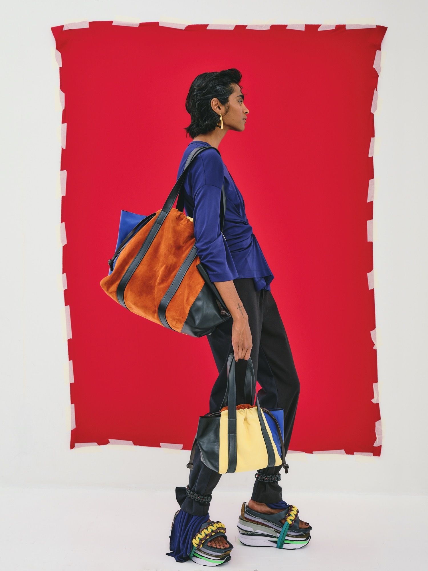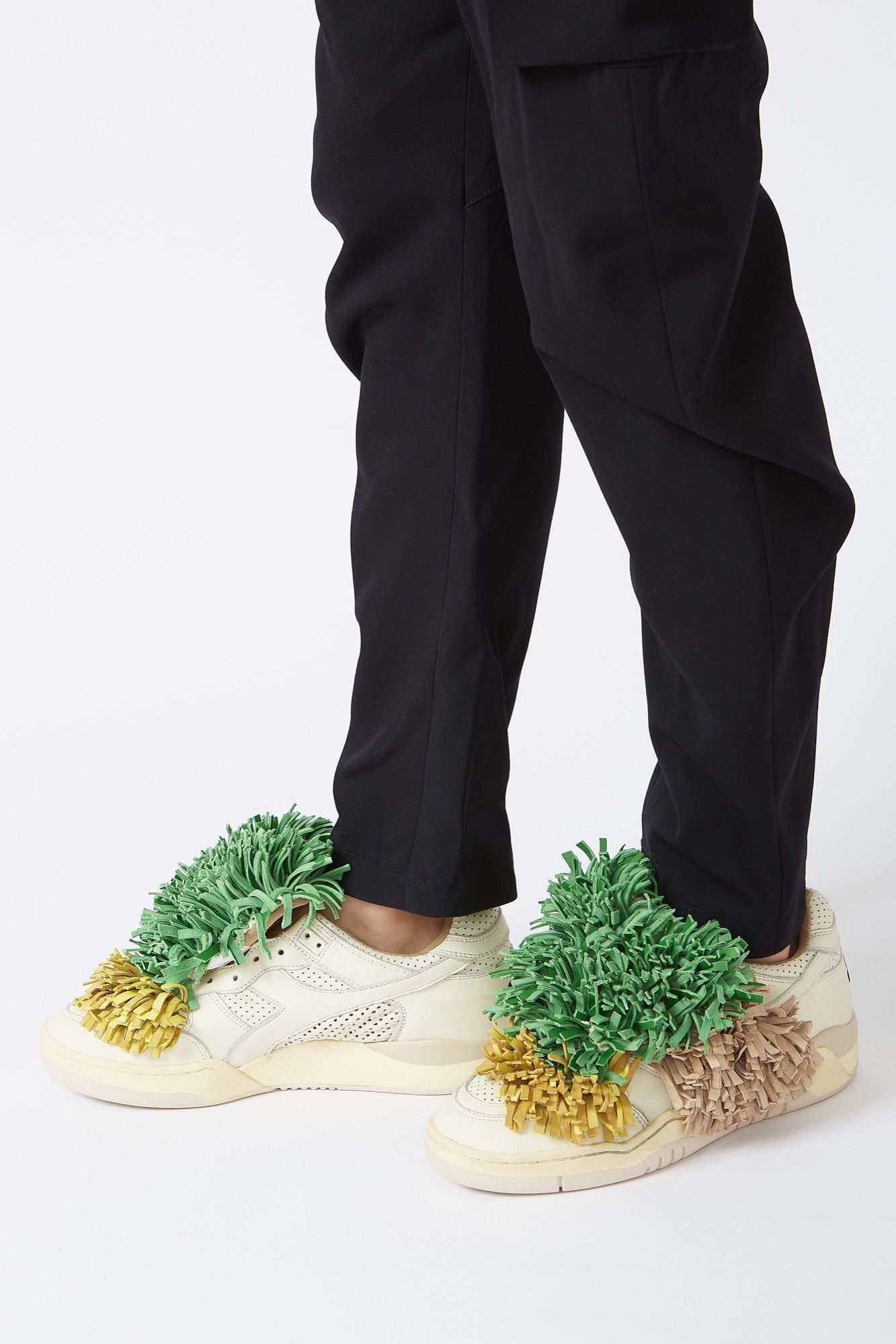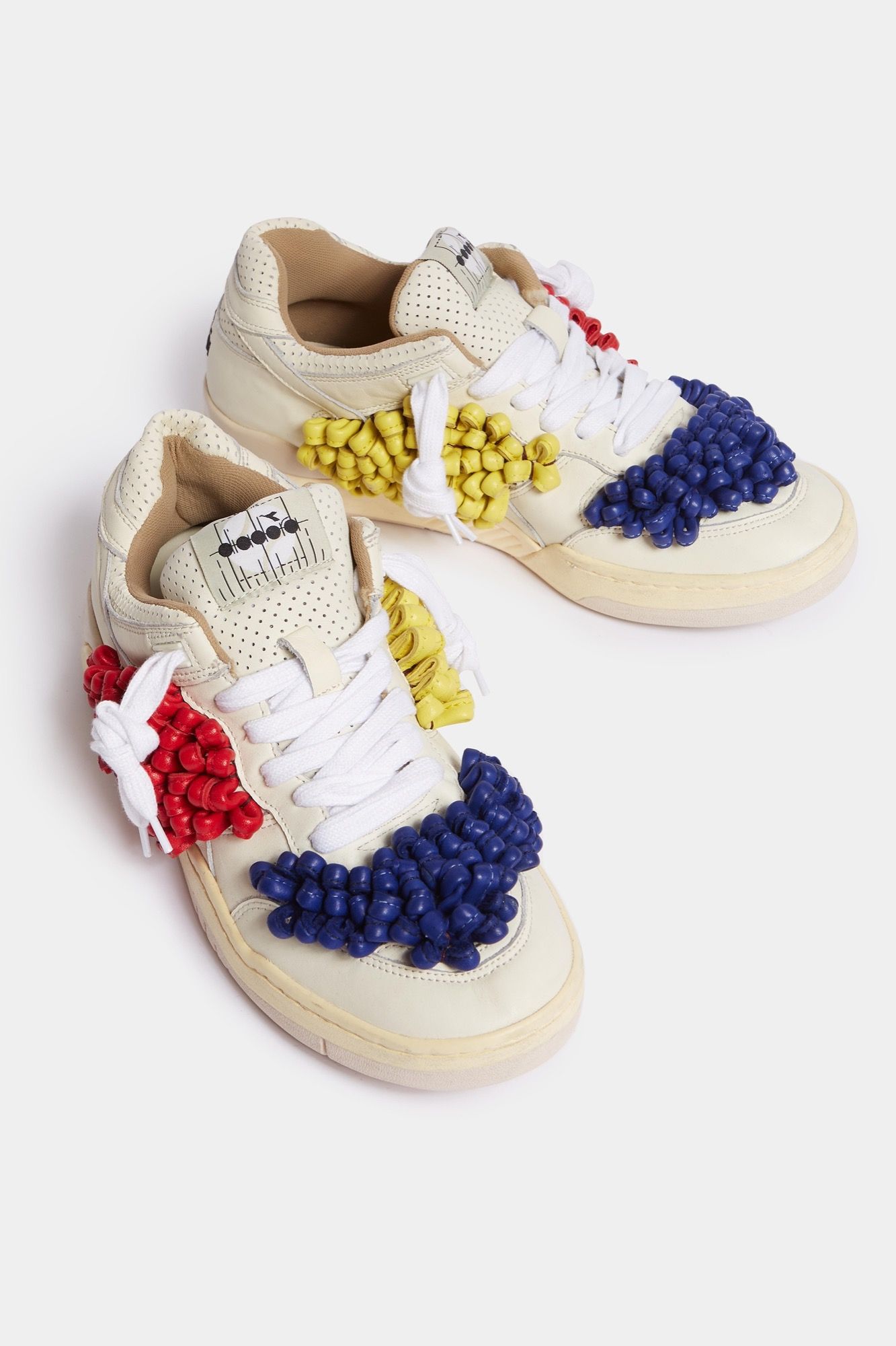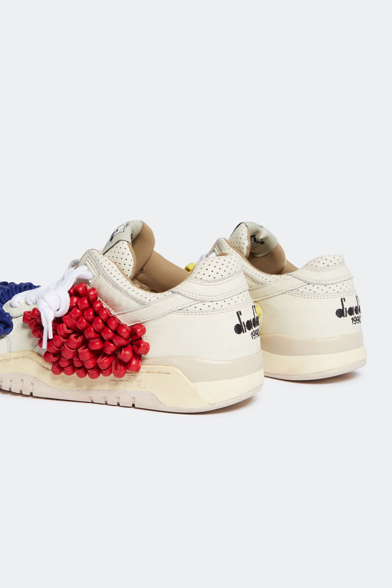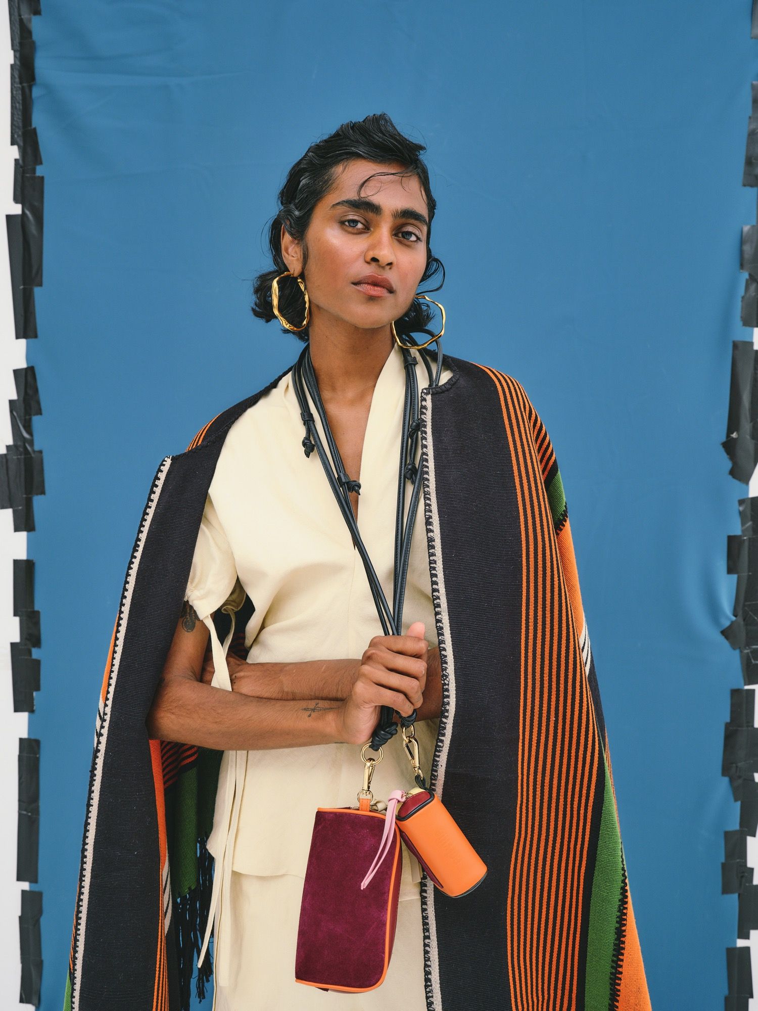 Colville presenta anche una nuova gamma di piccola pelletteria - tra cui l'astuccio e il portachiavi Monday Friday e il marsupio Patch Keeper Zip - in pelle patchwork a righe, indispensabile per contenere l'essenziale (iPhone, rossetto, carta di credito), adatti a una vita sempre in movimento. La nuova borsa di tendenza è la Lullaby Tote, disponibile in due dimensioni - maxi e piccola - e dalla forma morbida ed elastica, che si abbina al mix semplice e idiosincratico di pelli colorate. I gioielli sono audaci, non omologati e divertenti: c'è una nuova versione specchiata dei famosi orecchini Flintstone e collane di speciali perle di vetro veneziano realizzate a mano in modo tradizionale da uno degli artigiani di Colville. Al centro dell'etica di Colville, infatti, c'è sempre stato il sostegno ai produttori, in particolare alle donne artigiane, i cui mezzi di sostentamento e le cui competenze devono essere protetti e sostenuti. L'approccio estetico del marchio - che si concentra su una femminilità senza fronzoli - corrisponde al suo pragmatismo quando si tratta di assicurare lavoro e retribuzione ai suoi partner femminili di lunga data, dalle tessitrici di San Andres Larrainzar, in Messico, che realizzano i poncho di Colville, alla tribù Wayuu della Colombia, che dal 2018 tesse le borse Cylinder firmate Colville. Questa stagione, le prime hanno creato delle nuove versioni del famoso Poncho Noon in eleganti tonalità come: l'ecru e un mix di petrolio e arancio, mentre le seconde hanno prodotto una serie di nuovi motivi dinamici per le borse Colville. In linea con lo spirito di collaborazione creativa del brand, questa stagione segna anche una nuova partnership con il marchio italiano Diadora. Fondato nel 1948, l'azienda è stata pioniera della cultura delle sneaker in Italia.
