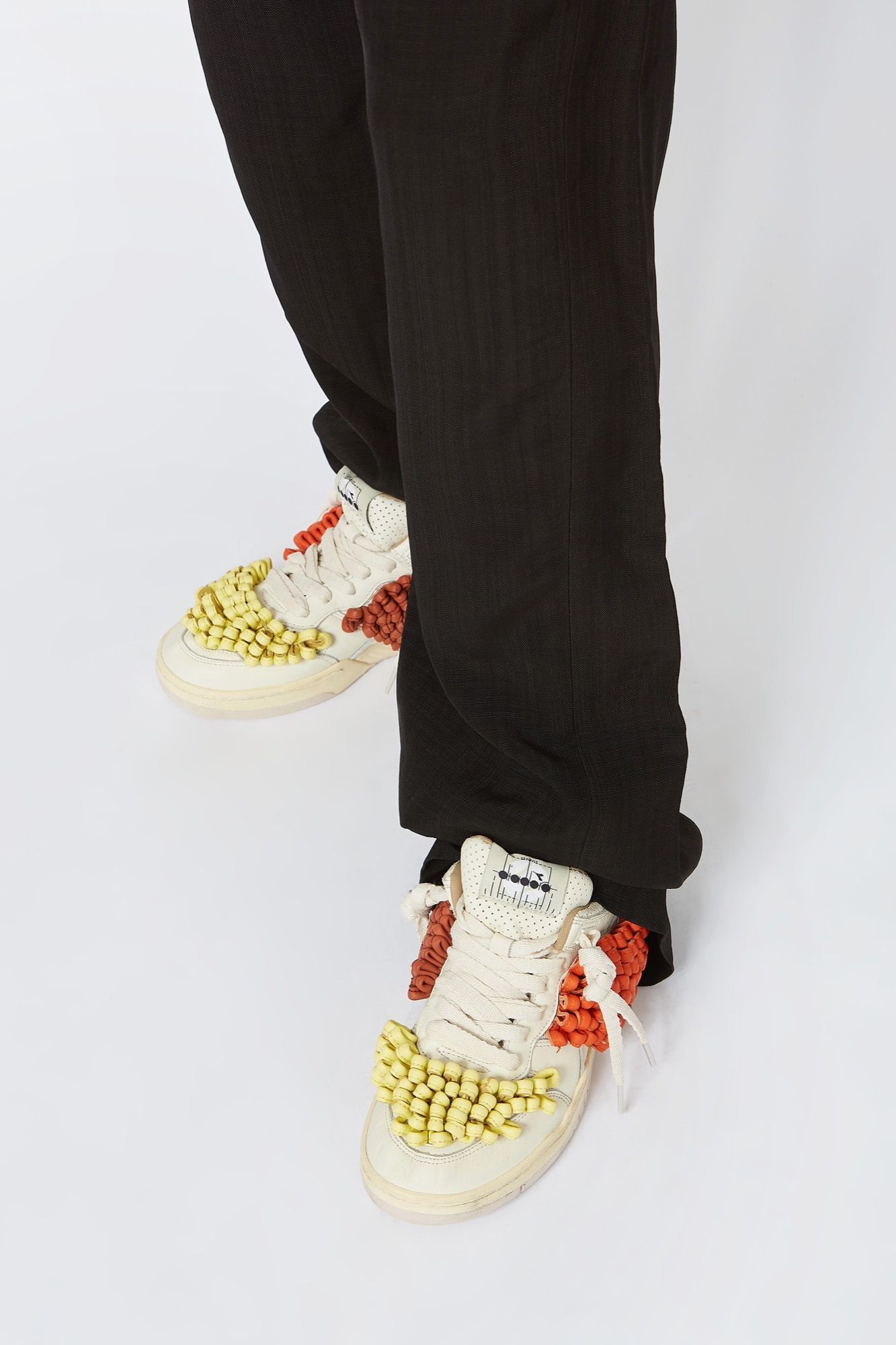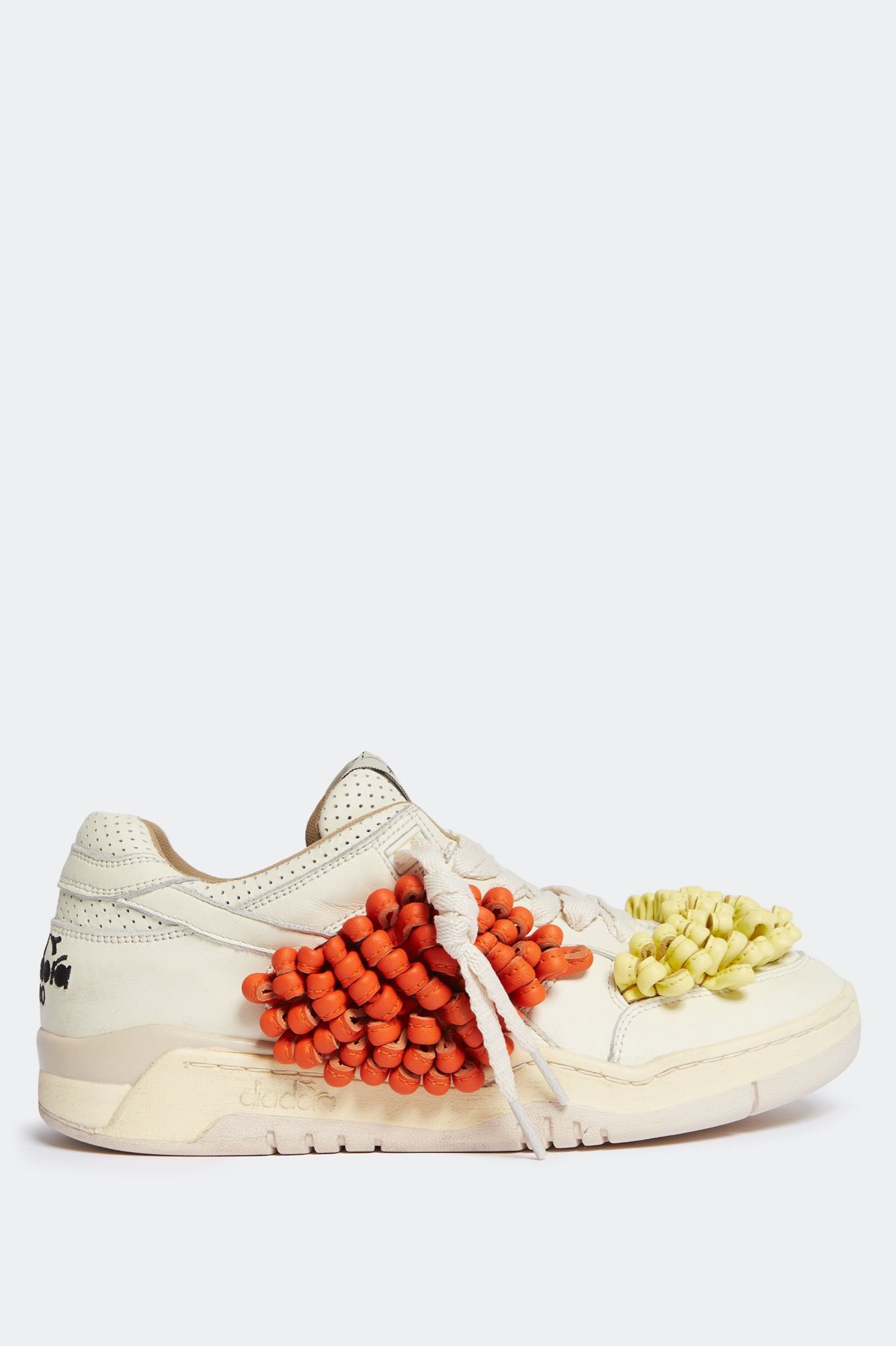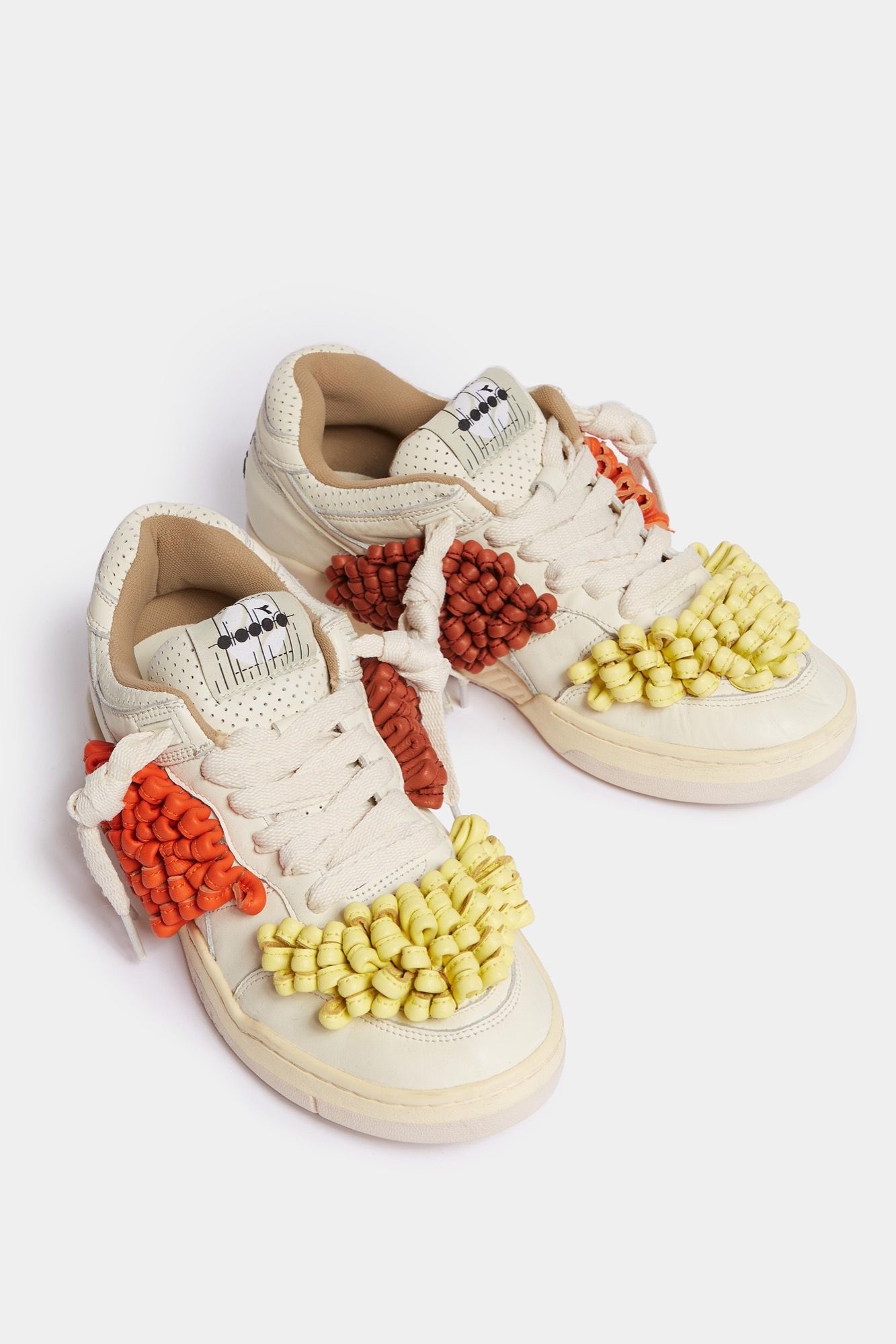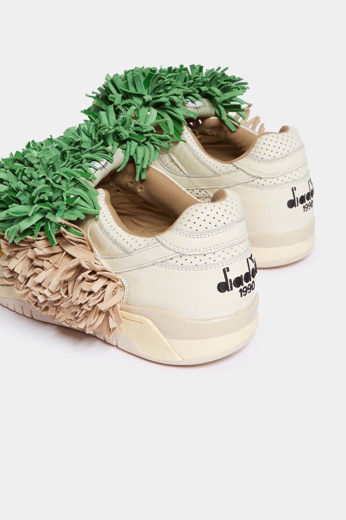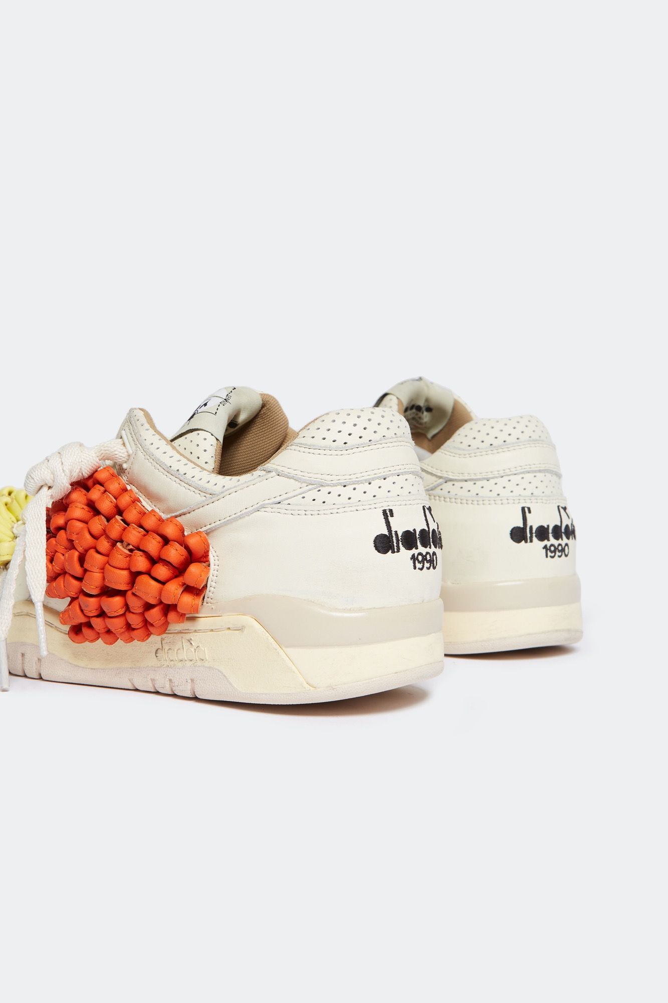 Colville presenta anche una nuova gamma di piccola pelletteria - tra cui l'astuccio e il portachiavi Monday Friday e il marsupio Patch Keeper Zip - in pelle patchwork a righe, indispensabile per contenere l'essenziale (iPhone, rossetto, carta di credito), adatti a una vita sempre in movimento. La nuova borsa di tendenza è la Lullaby Tote, disponibile in due dimensioni - maxi e piccola - e dalla forma morbida ed elastica, che si abbina al mix semplice e idiosincratico di pelli colorate. I gioielli sono audaci, non omologati e divertenti: c'è una nuova versione specchiata dei famosi orecchini Flintstone e collane di speciali perle di vetro veneziano realizzate a mano in modo tradizionale da uno degli artigiani di Colville. Al centro dell'etica di Colville, infatti, c'è sempre stato il sostegno ai produttori, in particolare alle donne artigiane, i cui mezzi di sostentamento e le cui competenze devono essere protetti e sostenuti. L'approccio estetico del marchio - che si concentra su una femminilità senza fronzoli - corrisponde al suo pragmatismo quando si tratta di assicurare lavoro e retribuzione ai suoi partner femminili di lunga data, dalle tessitrici di San Andres Larrainzar, in Messico, che realizzano i poncho di Colville, alla tribù Wayuu della Colombia, che dal 2018 tesse le borse Cylinder firmate Colville. Questa stagione, le prime hanno creato delle nuove versioni del famoso Poncho Noon in eleganti tonalità come: l'ecru e un mix di petrolio e arancio, mentre le seconde hanno prodotto una serie di nuovi motivi dinamici per le borse Colville. In linea con lo spirito di collaborazione creativa del brand, questa stagione segna anche una nuova partnership con il marchio italiano Diadora. Fondato nel 1948, l'azienda è stata pioniera della cultura delle sneaker in Italia.