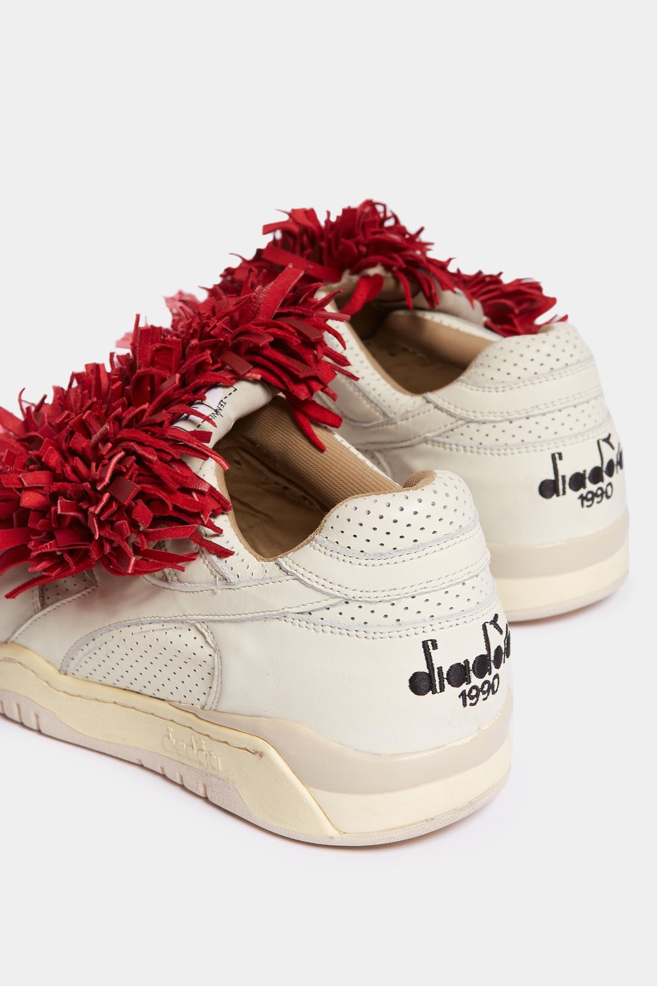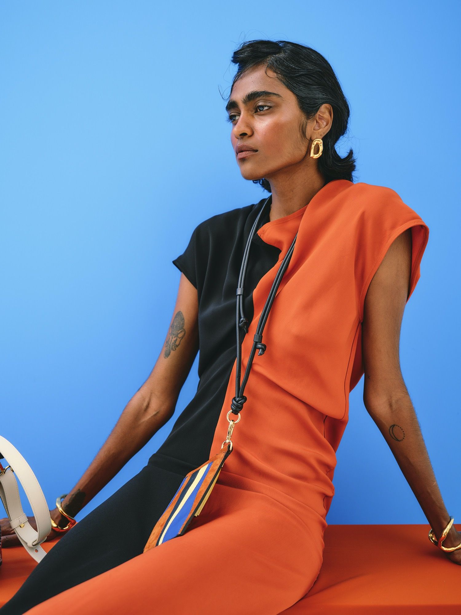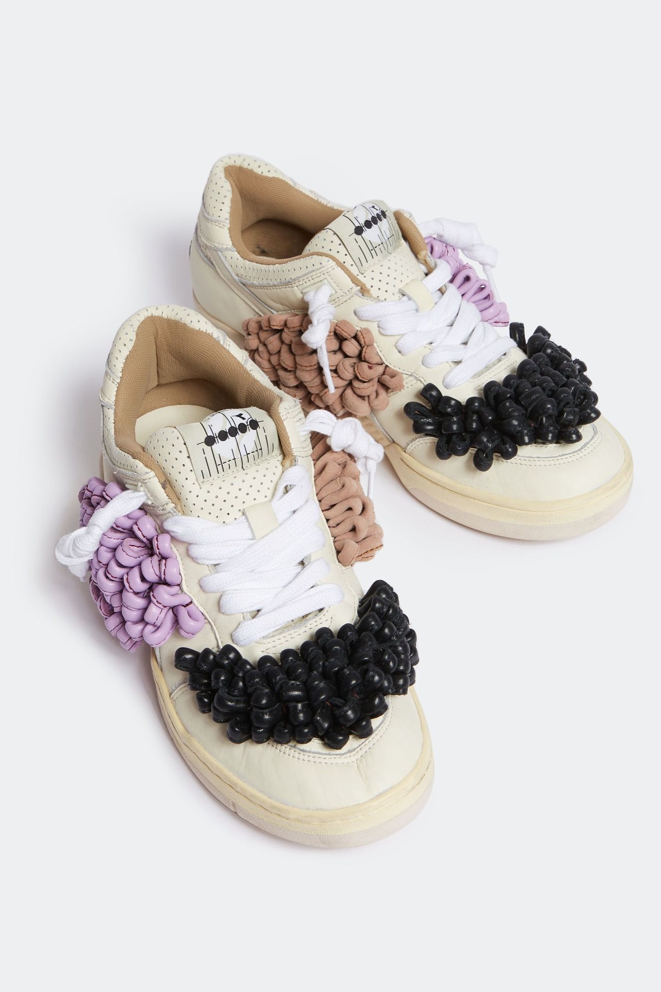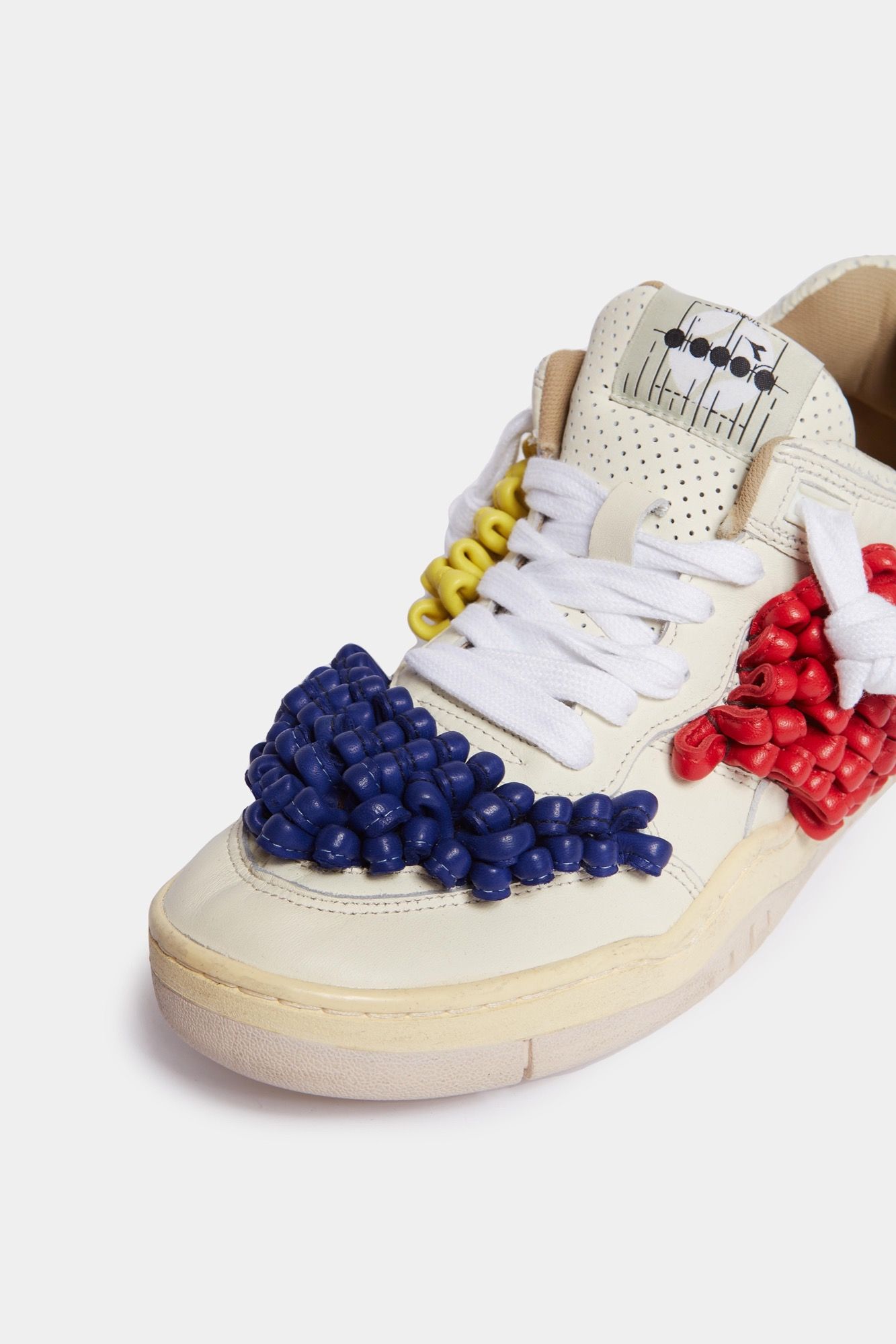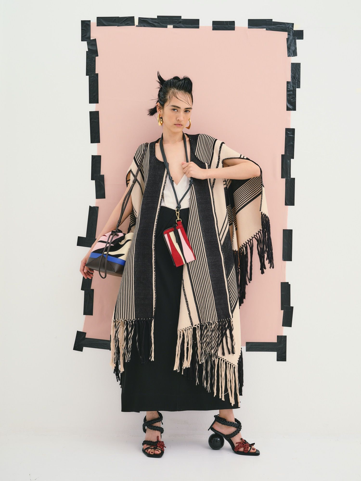 Colville presenta anche una nuova gamma di piccola pelletteria - tra cui l'astuccio e il portachiavi Monday Friday e il marsupio Patch Keeper Zip - in pelle patchwork a righe, indispensabile per contenere l'essenziale (iPhone, rossetto, carta di credito), adatti a una vita sempre in movimento. La nuova borsa di tendenza è la Lullaby Tote, disponibile in due dimensioni - maxi e piccola - e dalla forma morbida ed elastica, che si abbina al mix semplice e idiosincratico di pelli colorate. I gioielli sono audaci, non omologati e divertenti: c'è una nuova versione specchiata dei famosi orecchini Flintstone e collane di speciali perle di vetro veneziano realizzate a mano in modo tradizionale da uno degli artigiani di Colville. Al centro dell'etica di Colville, infatti, c'è sempre stato il sostegno ai produttori, in particolare alle donne artigiane, i cui mezzi di sostentamento e le cui competenze devono essere protetti e sostenuti. L'approccio estetico del marchio - che si concentra su una femminilità senza fronzoli - corrisponde al suo pragmatismo quando si tratta di assicurare lavoro e retribuzione ai suoi partner femminili di lunga data, dalle tessitrici di San Andres Larrainzar, in Messico, che realizzano i poncho di Colville, alla tribù Wayuu della Colombia, che dal 2018 tesse le borse Cylinder firmate Colville. Questa stagione, le prime hanno creato delle nuove versioni del famoso Poncho Noon in eleganti tonalità come: l'ecru e un mix di petrolio e arancio, mentre le seconde hanno prodotto una serie di nuovi motivi dinamici per le borse Colville. In linea con lo spirito di collaborazione creativa del brand, questa stagione segna anche una nuova partnership con il marchio italiano Diadora. Fondato nel 1948, l'azienda è stata pioniera della cultura delle sneaker in Italia.