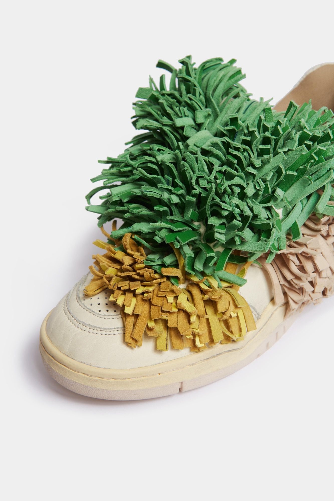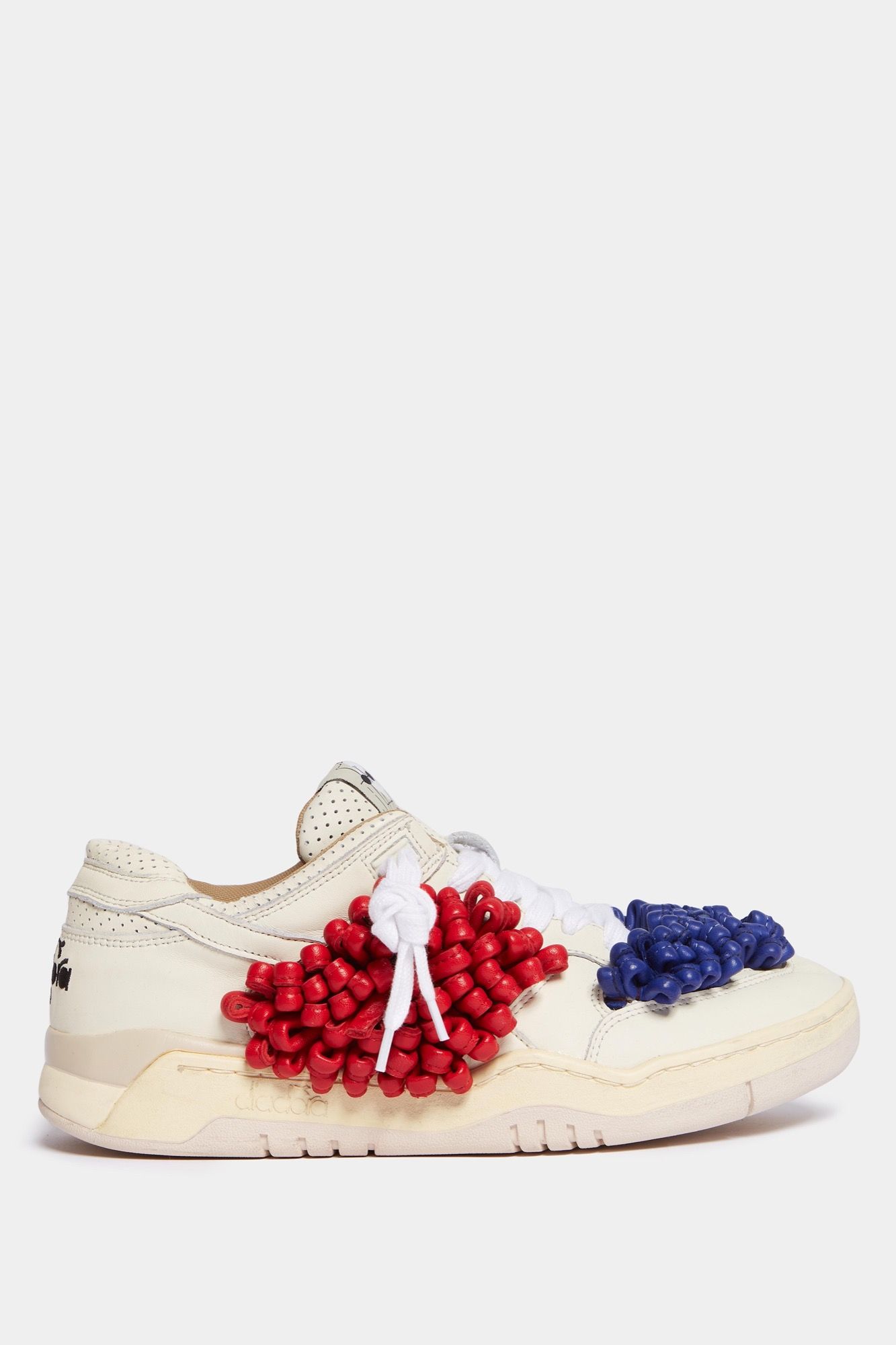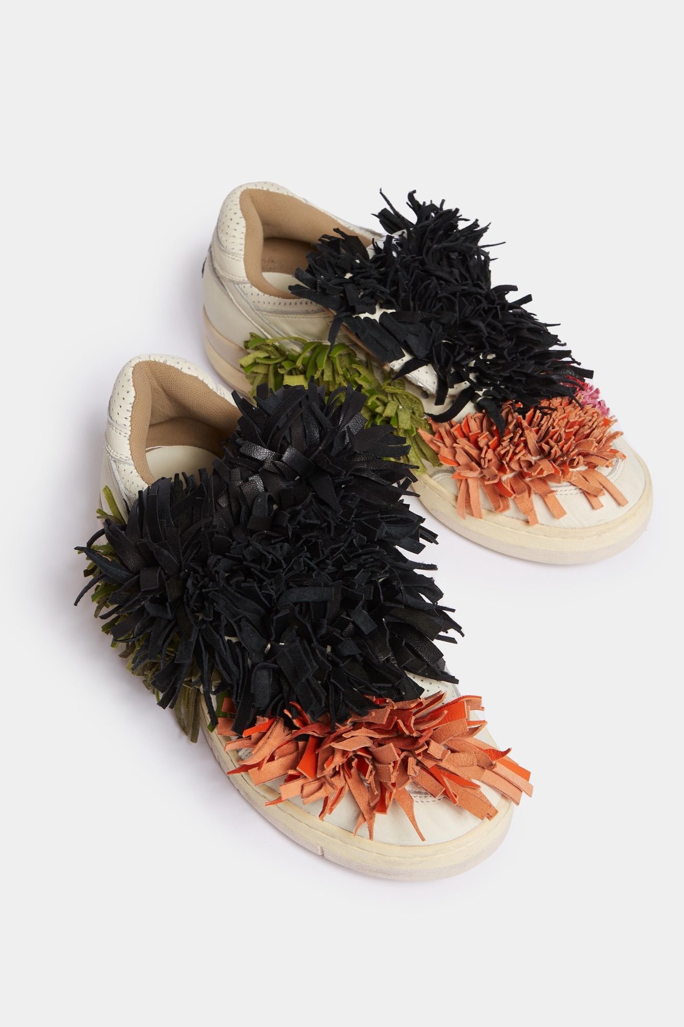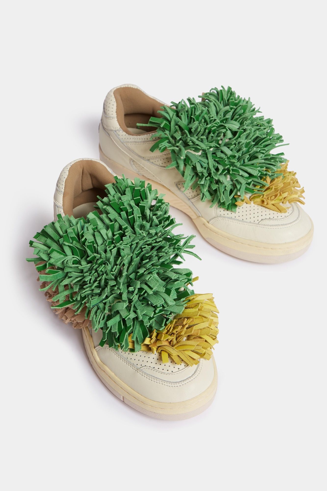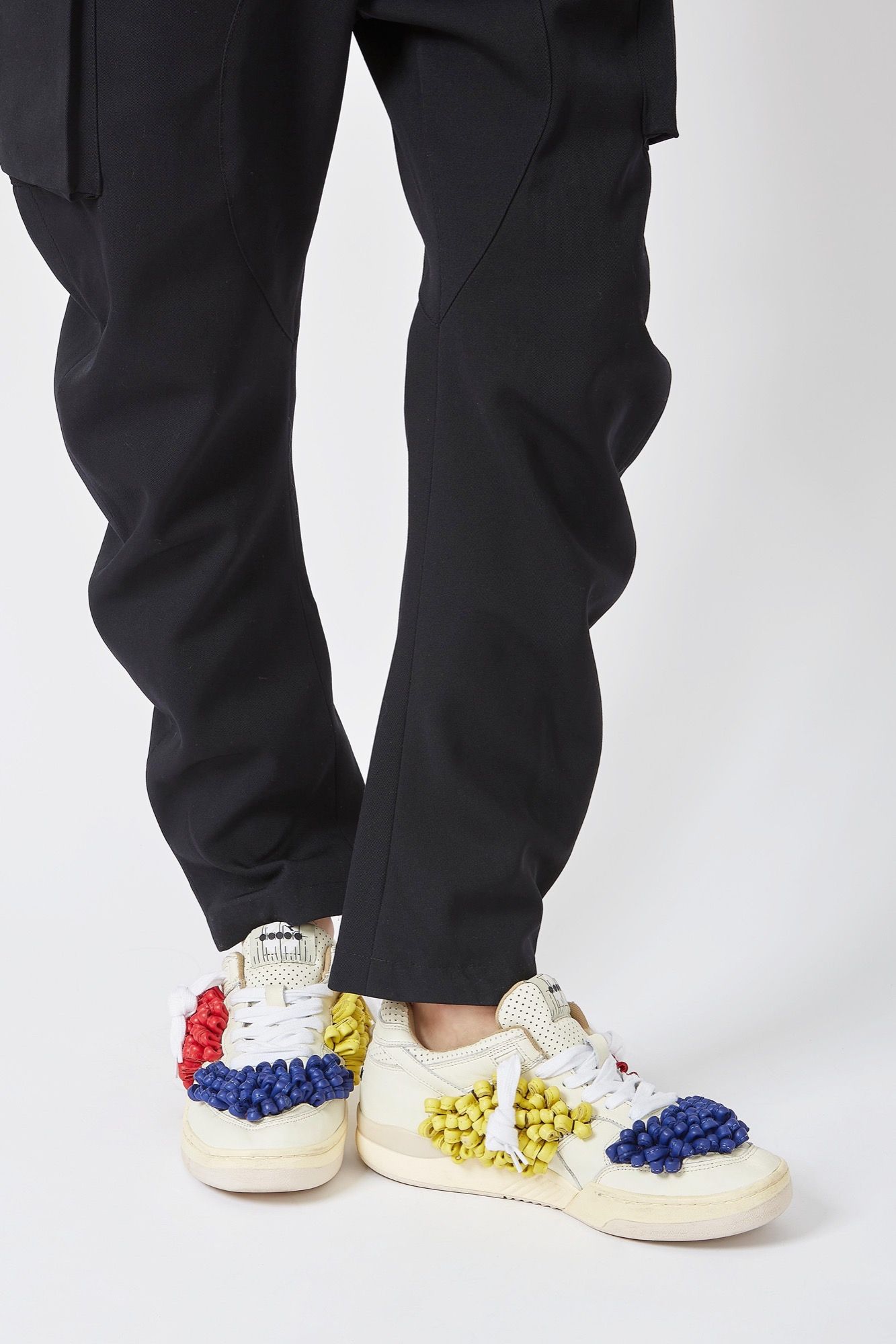 Colville presenta anche una nuova gamma di piccola pelletteria - tra cui l'astuccio e il portachiavi Monday Friday e il marsupio Patch Keeper Zip - in pelle patchwork a righe, indispensabile per contenere l'essenziale (iPhone, rossetto, carta di credito), adatti a una vita sempre in movimento. La nuova borsa di tendenza è la Lullaby Tote, disponibile in due dimensioni - maxi e piccola - e dalla forma morbida ed elastica, che si abbina al mix semplice e idiosincratico di pelli colorate. I gioielli sono audaci, non omologati e divertenti: c'è una nuova versione specchiata dei famosi orecchini Flintstone e collane di speciali perle di vetro veneziano realizzate a mano in modo tradizionale da uno degli artigiani di Colville. Al centro dell'etica di Colville, infatti, c'è sempre stato il sostegno ai produttori, in particolare alle donne artigiane, i cui mezzi di sostentamento e le cui competenze devono essere protetti e sostenuti. L'approccio estetico del marchio - che si concentra su una femminilità senza fronzoli - corrisponde al suo pragmatismo quando si tratta di assicurare lavoro e retribuzione ai suoi partner femminili di lunga data, dalle tessitrici di San Andres Larrainzar, in Messico, che realizzano i poncho di Colville, alla tribù Wayuu della Colombia, che dal 2018 tesse le borse Cylinder firmate Colville. Questa stagione, le prime hanno creato delle nuove versioni del famoso Poncho Noon in eleganti tonalità come: l'ecru e un mix di petrolio e arancio, mentre le seconde hanno prodotto una serie di nuovi motivi dinamici per le borse Colville. In linea con lo spirito di collaborazione creativa del brand, questa stagione segna anche una nuova partnership con il marchio italiano Diadora. Fondato nel 1948, l'azienda è stata pioniera della cultura delle sneaker in Italia.
