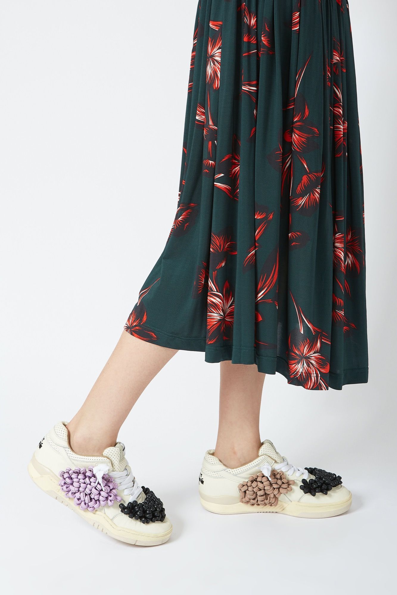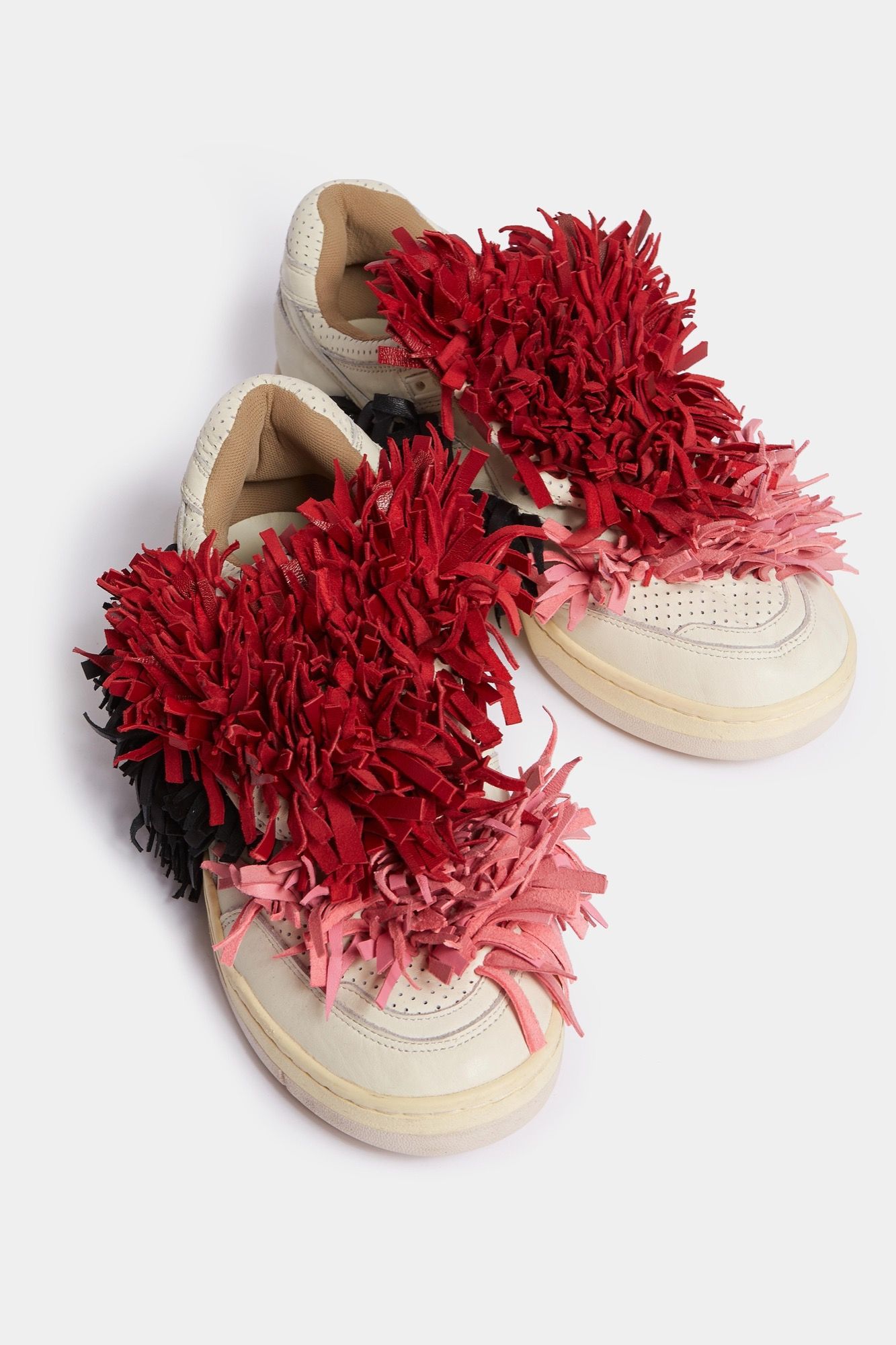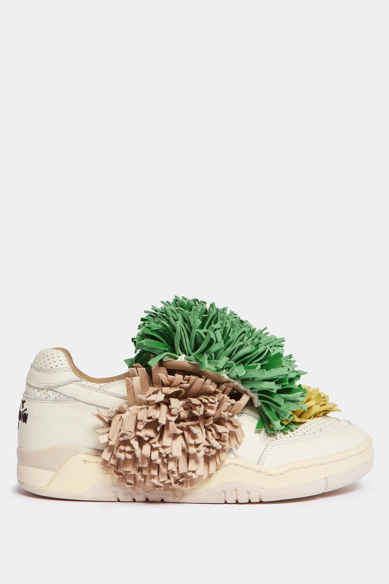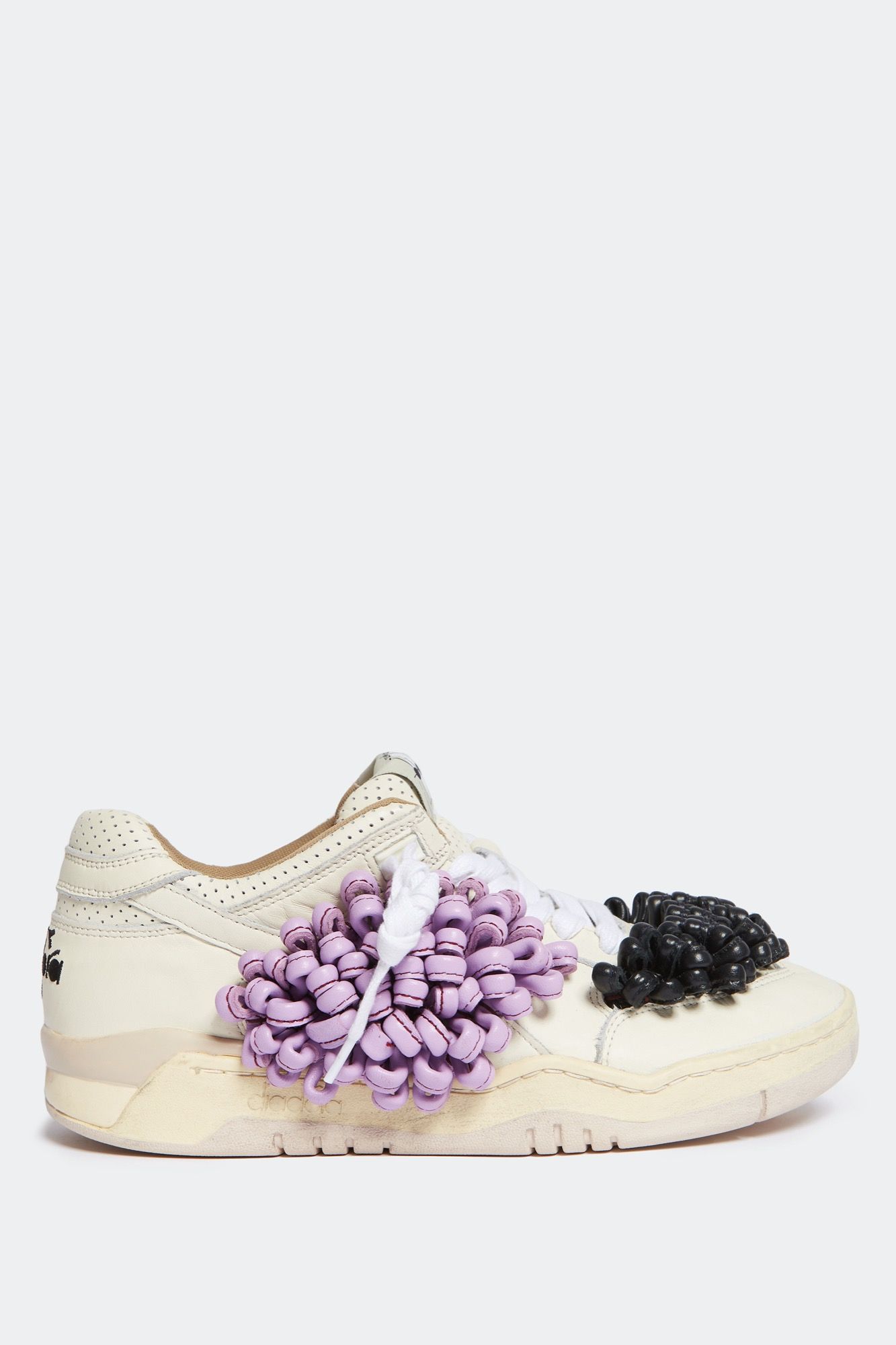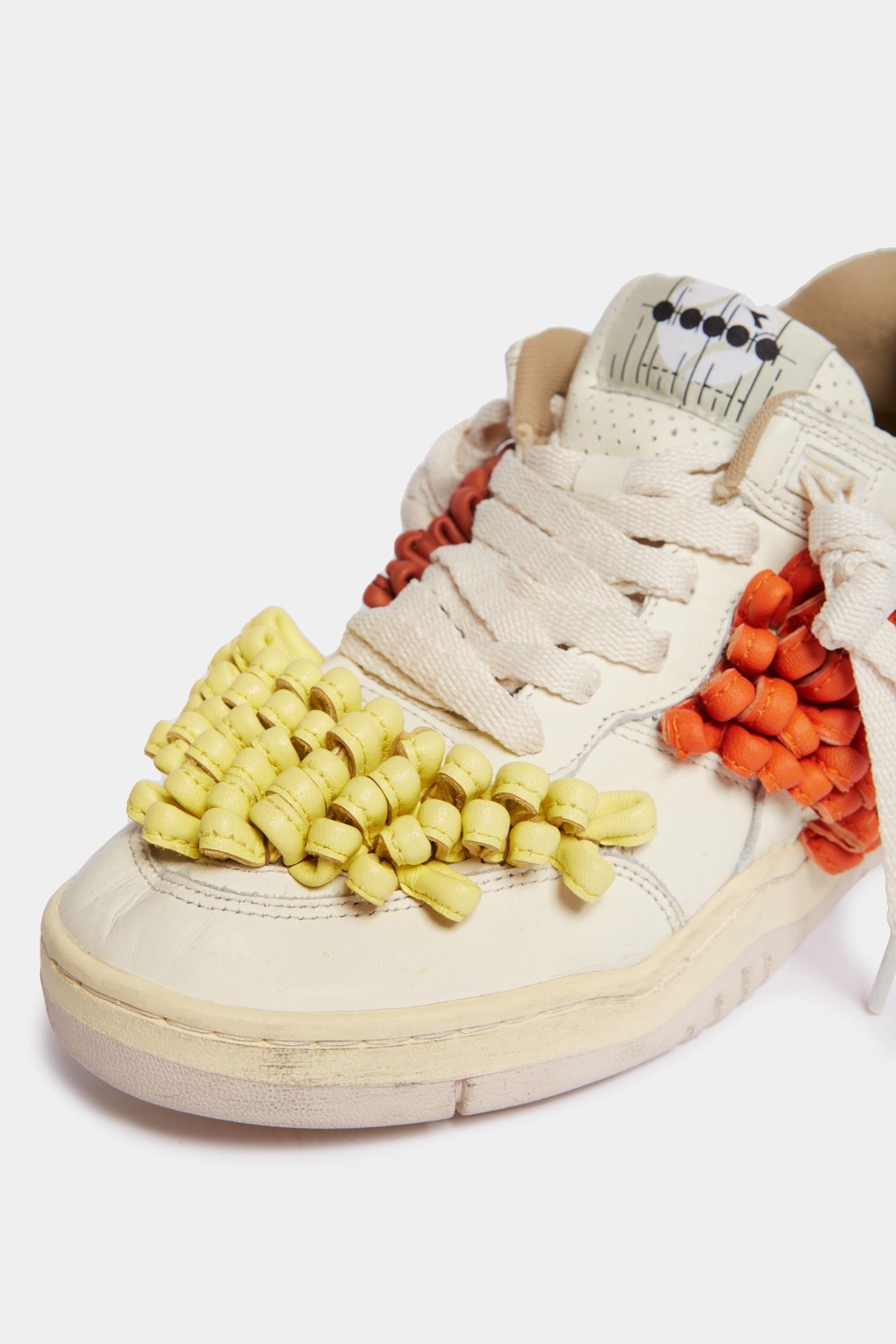 Colville presenta anche una nuova gamma di piccola pelletteria - tra cui l'astuccio e il portachiavi Monday Friday e il marsupio Patch Keeper Zip - in pelle patchwork a righe, indispensabile per contenere l'essenziale (iPhone, rossetto, carta di credito), adatti a una vita sempre in movimento. La nuova borsa di tendenza è la Lullaby Tote, disponibile in due dimensioni - maxi e piccola - e dalla forma morbida ed elastica, che si abbina al mix semplice e idiosincratico di pelli colorate. I gioielli sono audaci, non omologati e divertenti: c'è una nuova versione specchiata dei famosi orecchini Flintstone e collane di speciali perle di vetro veneziano realizzate a mano in modo tradizionale da uno degli artigiani di Colville. Al centro dell'etica di Colville, infatti, c'è sempre stato il sostegno ai produttori, in particolare alle donne artigiane, i cui mezzi di sostentamento e le cui competenze devono essere protetti e sostenuti. L'approccio estetico del marchio - che si concentra su una femminilità senza fronzoli - corrisponde al suo pragmatismo quando si tratta di assicurare lavoro e retribuzione ai suoi partner femminili di lunga data, dalle tessitrici di San Andres Larrainzar, in Messico, che realizzano i poncho di Colville, alla tribù Wayuu della Colombia, che dal 2018 tesse le borse Cylinder firmate Colville. Questa stagione, le prime hanno creato delle nuove versioni del famoso Poncho Noon in eleganti tonalità come: l'ecru e un mix di petrolio e arancio, mentre le seconde hanno prodotto una serie di nuovi motivi dinamici per le borse Colville. In linea con lo spirito di collaborazione creativa del brand, questa stagione segna anche una nuova partnership con il marchio italiano Diadora. Fondato nel 1948, l'azienda è stata pioniera della cultura delle sneaker in Italia.