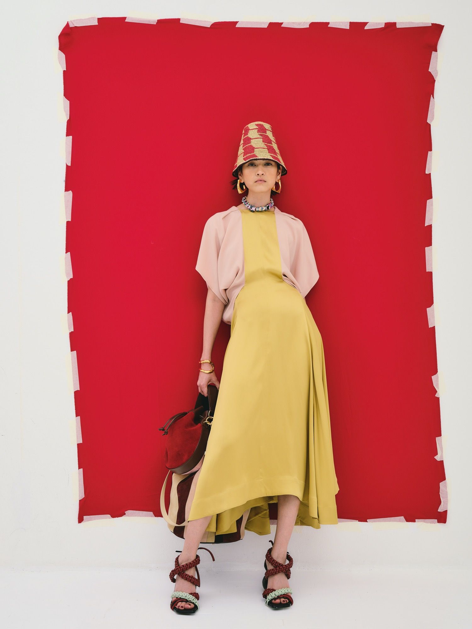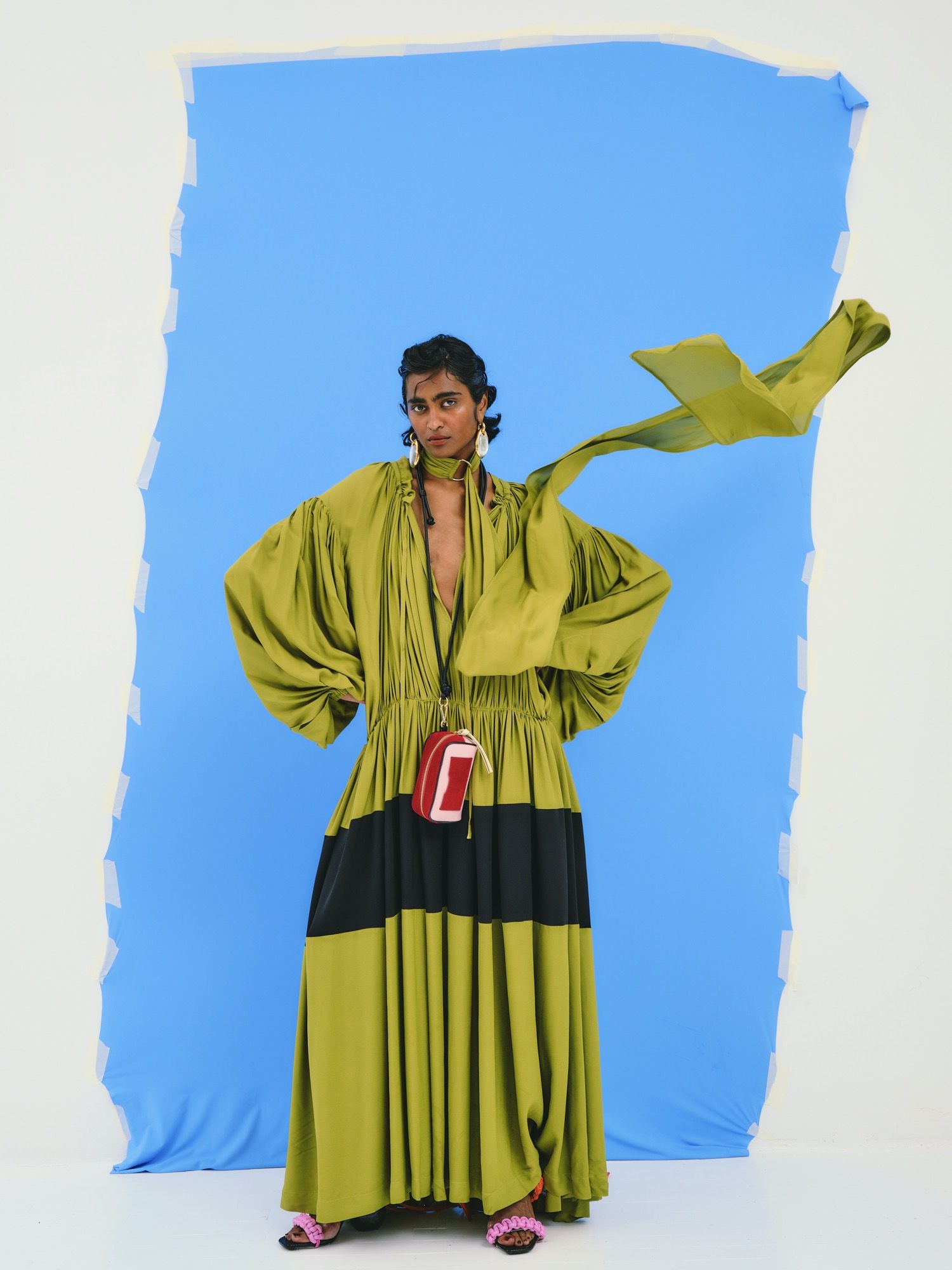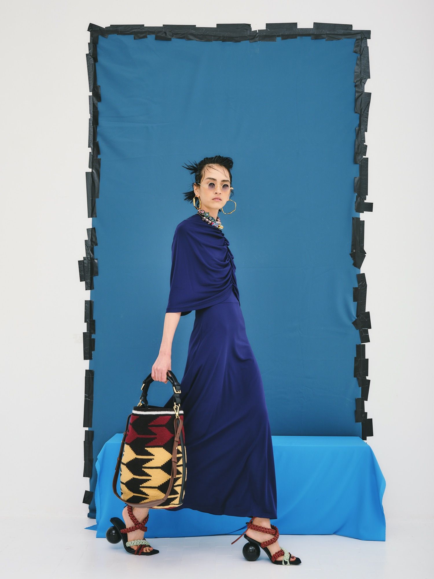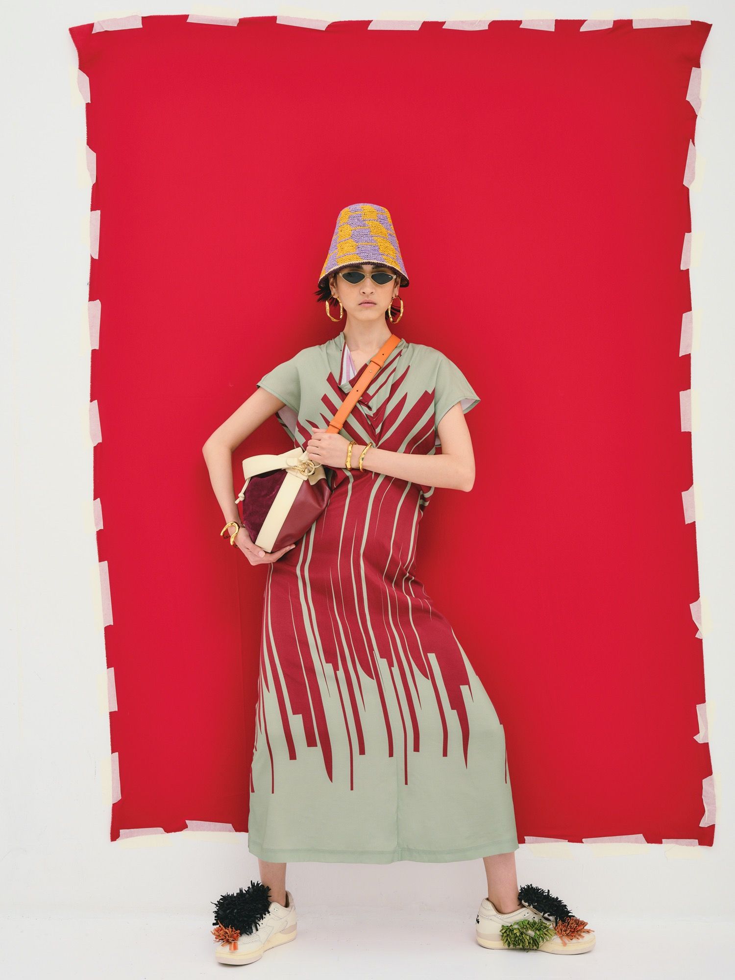 La novità di questa stagione è la Joy Jacket, con maniche esagerate che mettono in evidenza l'abilità di Colville con i volumi. La giacca è realizzata in una combinazione di lino e poliestere riciclato, ottenuto dalla fusione di materie plastiche e dalla loro trasformazione in fibre. Può essere abbinata al pantalone Fred, in lino e poliestere riciclato, nero con una striscia rossa, o in crema, realizzato in un tessuto di canapa traspirante, resistente e morbido. Altrettanto audaci e particolarmente divertenti sono: la nuova gonna e la camicia Sottsass, disponibili in una doppia tonalità navy e cammello e caratterizzate da accattivanti linee ondulate che strizzano l'occhio a Memphis. Per quanto riguarda gli abiti, vediamo nuove versioni dell'ondeggiante Drape Dress e del sensuale Love Dress, che questa stagione si presenta con una stampa floreale nei sorprendenti toni del blu chiaro, del bordeaux e del giallo. Una novità assoluta per la SS24 è l'abito Bersanetti, disponibile in verde oliva con un'accattivante banda nera o in una stampa nera e gialla. Diversi capi mettono in luce l'abilità di Colville con il jersey sottile, tra cui il nuovo Full Moon Dress nell'intramontabile colore nero e il Seung Dress asimmetrico, con una particolare stampa lilla e verde. Per quello che riguarda gli accessori, c'è il giocoso cappello Carousel, realizzato in rafia e disponibile in una gamma di colori vivaci. Ognuno viene realizzato da artigiani del Madagascar in modo etico e sostenibile, utilizzando pigmenti naturali.