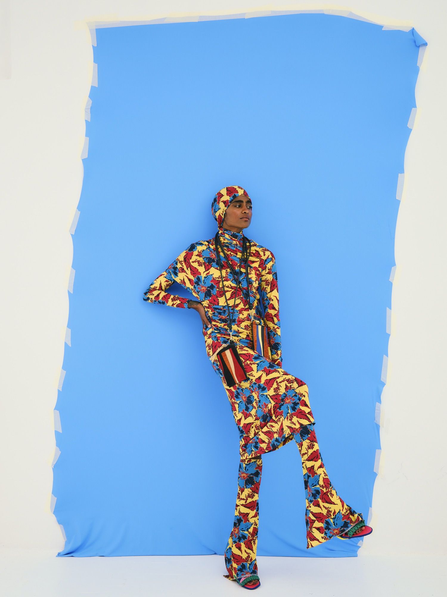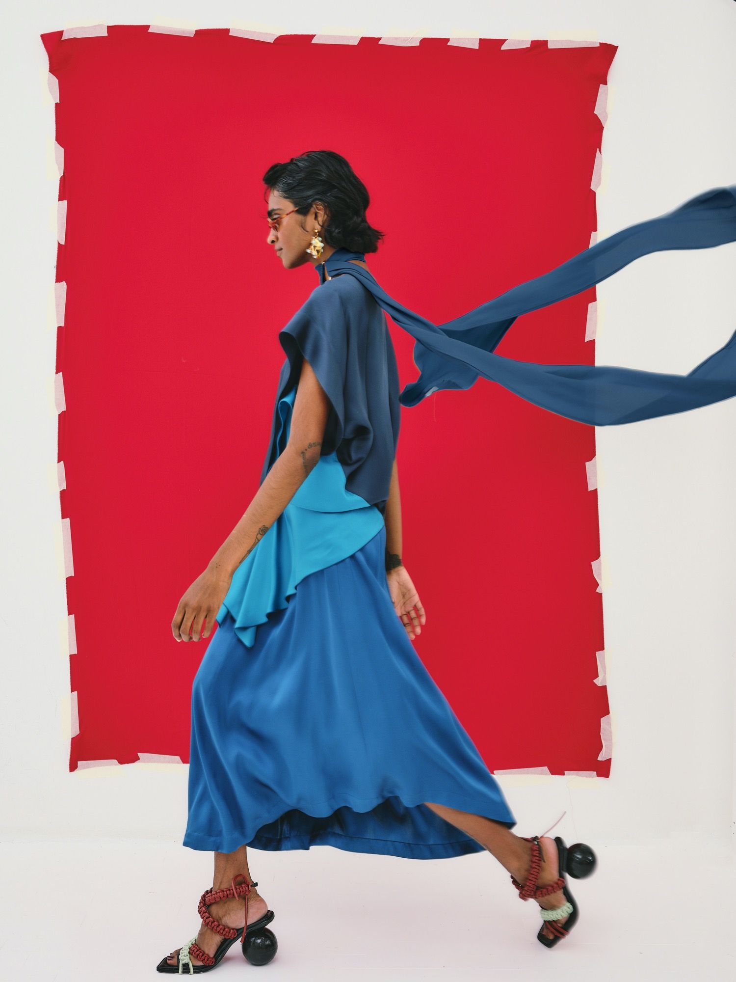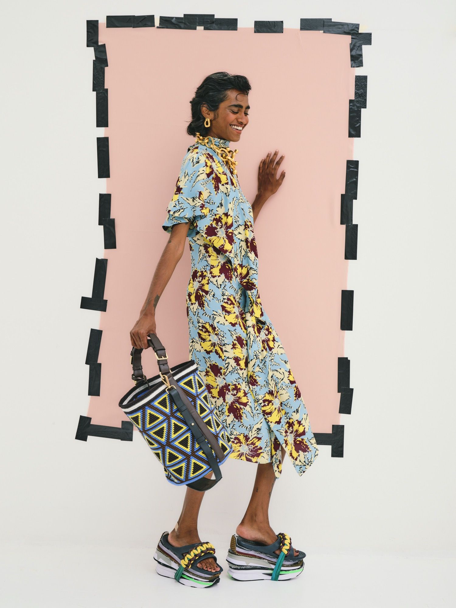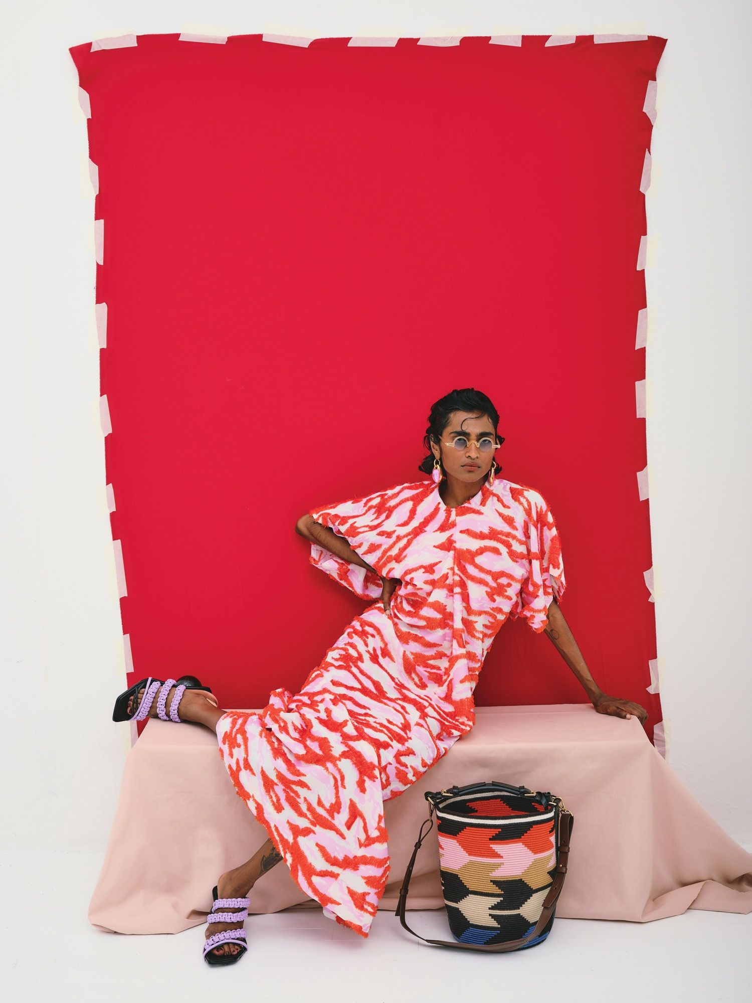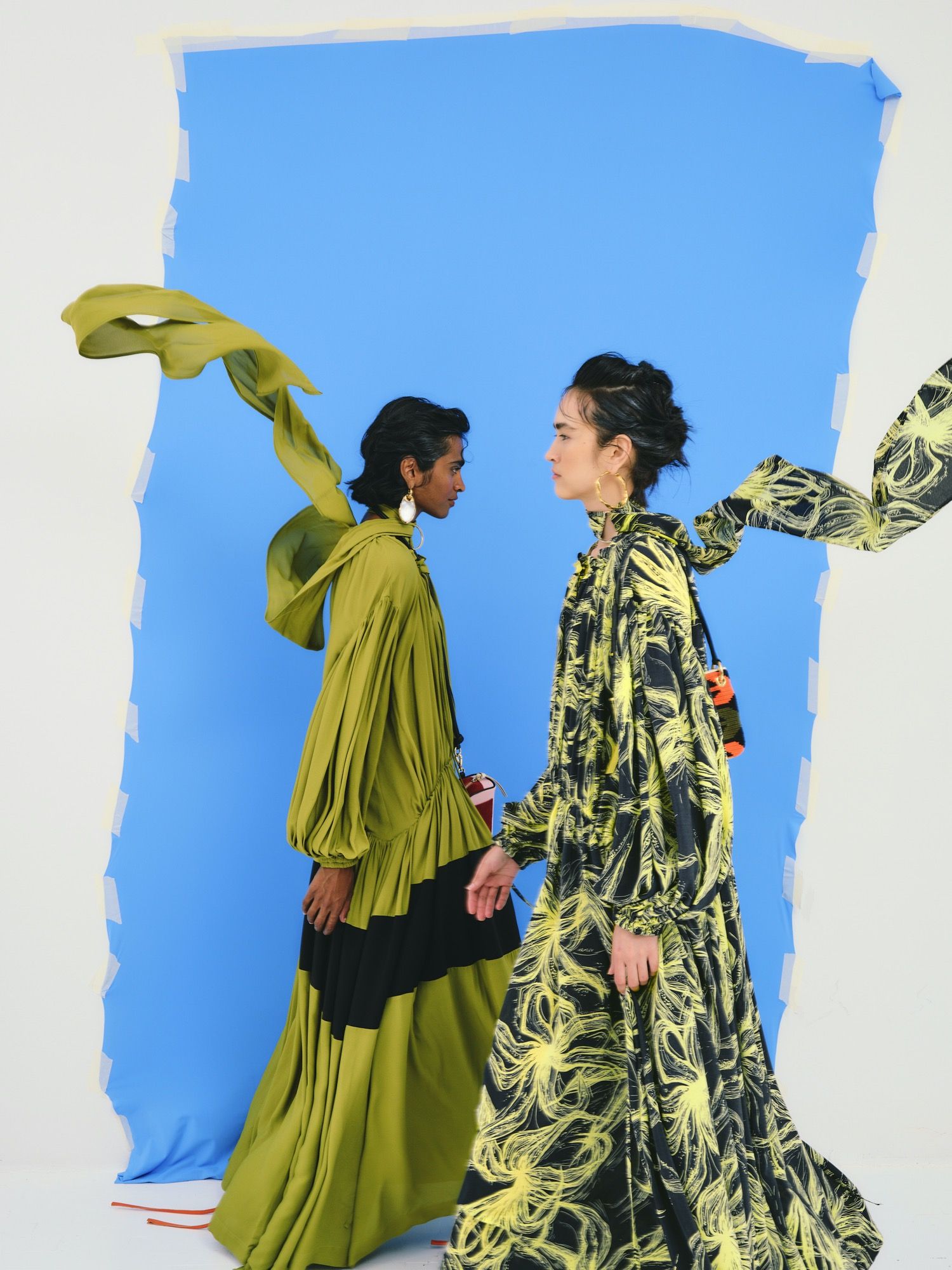 La novità di questa stagione è la Joy Jacket, con maniche esagerate che mettono in evidenza l'abilità di Colville con i volumi. La giacca è realizzata in una combinazione di lino e poliestere riciclato, ottenuto dalla fusione di materie plastiche e dalla loro trasformazione in fibre. Può essere abbinata al pantalone Fred, in lino e poliestere riciclato, nero con una striscia rossa, o in crema, realizzato in un tessuto di canapa traspirante, resistente e morbido. Altrettanto audaci e particolarmente divertenti sono: la nuova gonna e la camicia Sottsass, disponibili in una doppia tonalità navy e cammello e caratterizzate da accattivanti linee ondulate che strizzano l'occhio a Memphis. Per quanto riguarda gli abiti, vediamo nuove versioni dell'ondeggiante Drape Dress e del sensuale Love Dress, che questa stagione si presenta con una stampa floreale nei sorprendenti toni del blu chiaro, del bordeaux e del giallo. Una novità assoluta per la SS24 è l'abito Bersanetti, disponibile in verde oliva con un'accattivante banda nera o in una stampa nera e gialla. Diversi capi mettono in luce l'abilità di Colville con il jersey sottile, tra cui il nuovo Full Moon Dress nell'intramontabile colore nero e il Seung Dress asimmetrico, con una particolare stampa lilla e verde. Per quello che riguarda gli accessori, c'è il giocoso cappello Carousel, realizzato in rafia e disponibile in una gamma di colori vivaci. Ognuno viene realizzato da artigiani del Madagascar in modo etico e sostenibile, utilizzando pigmenti naturali.