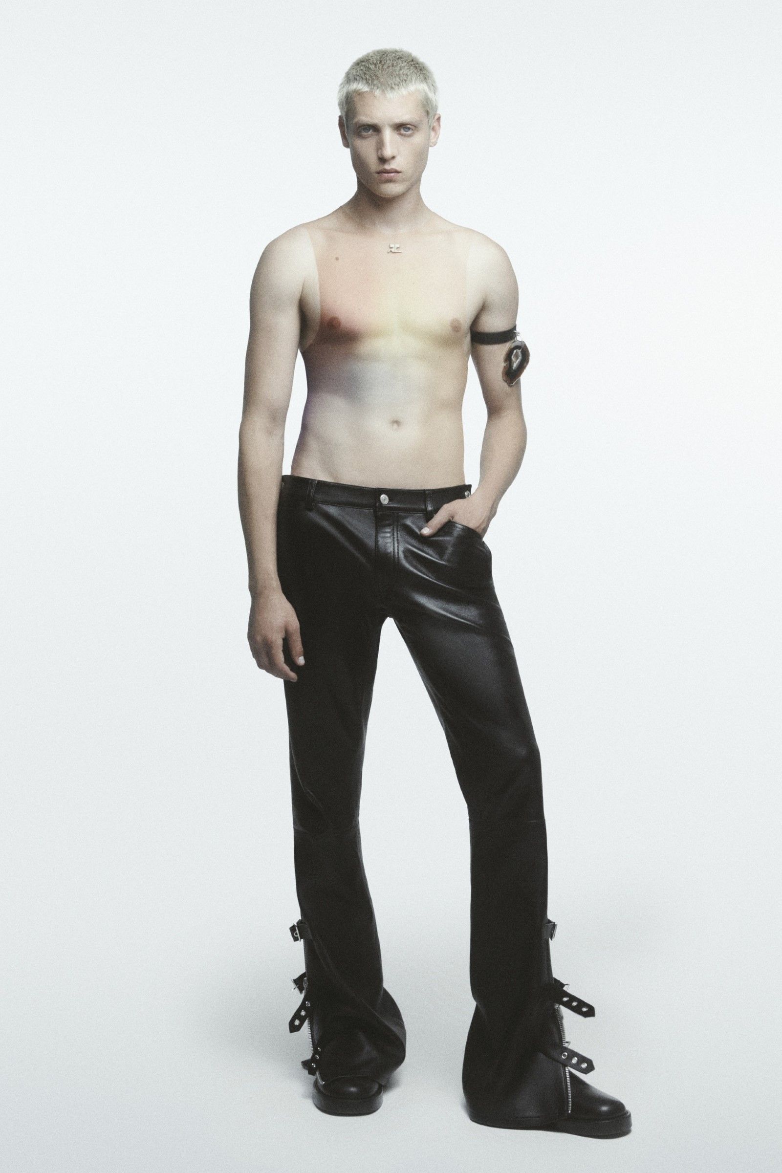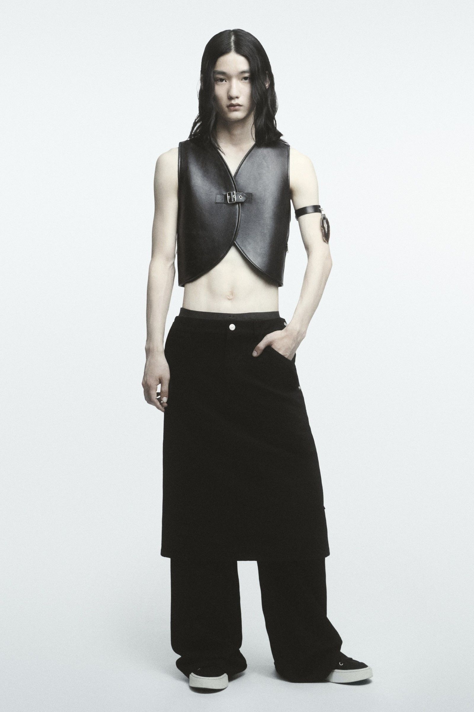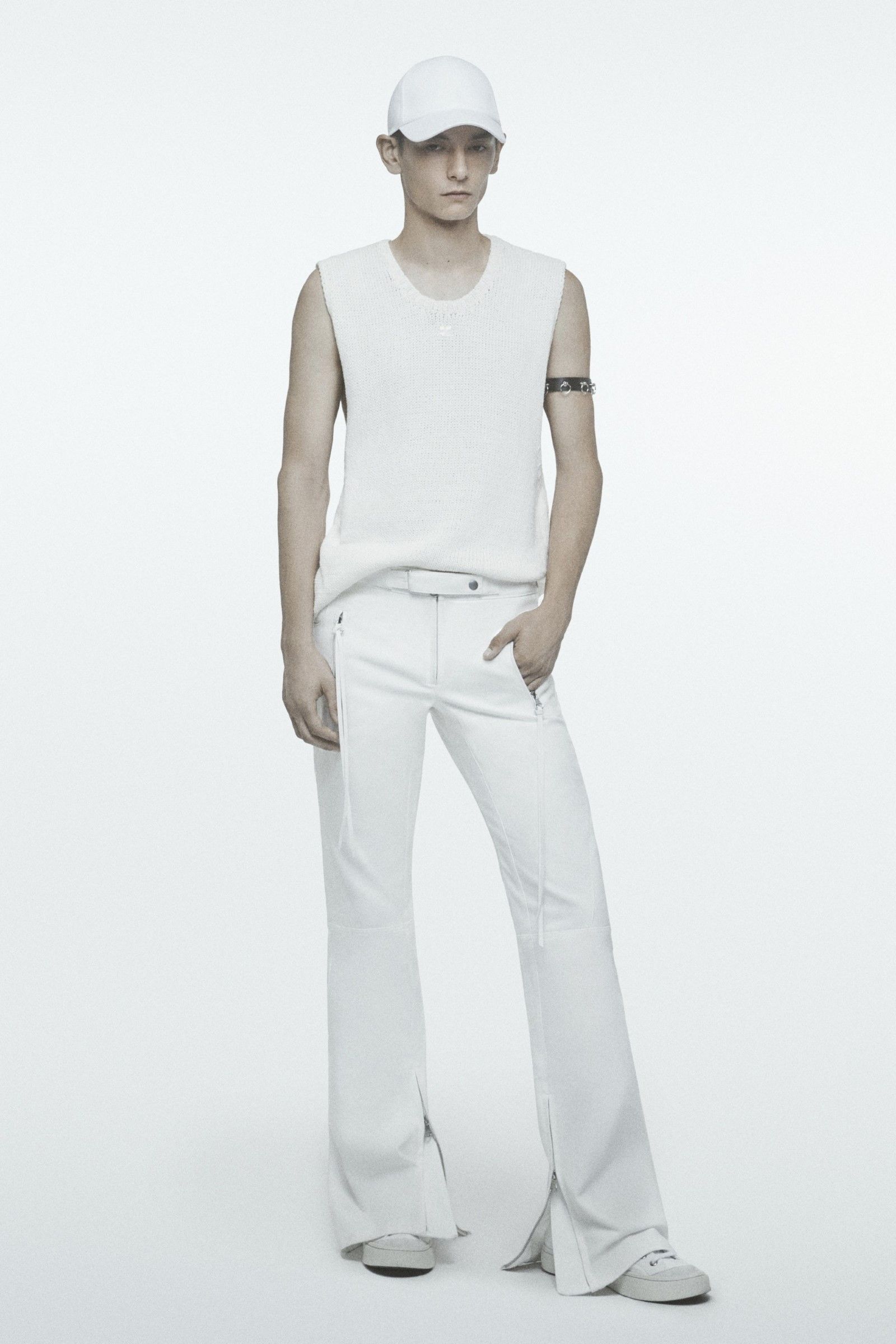 Tutte le molte caratteristiche che rendono modernissimi gli abiti vintage (e in particolar modo le giacche) e che sono ancora presenti nel nuovo Courrèges ma Di Felice le ha reinterpretate, in termini assai generali, attraverso design funzionali dalle linee terse, tessuti visivamente densi, geometrie essenziali e precise che si ritrovano nelle simmetrie e negli incastri dei diversi elementi sartoriali. Del tutto eliminati appaiono i colori sgargianti delle origini, il rosso a parte, così come i rigidi abiti in gabardine di lana anni ’70 sono diventati canotte asimmetriche, body e abiti in jersey e denim morbidi e trucker jacket dai grandi baveri. È interessante invece notare il discorso sui colori: Courrèges credeva che le donne dell’epoca fossero «arcaiche d’aspetto» e che si potessero «rendere più felici portando il bianco e i colori nelle loro vite» proprio perché i colori dominanti fino ad allora erano stati i grigi, i neri e i blu della couture classica – negli anni ’50 non si vedeva molto arancione in giro. Di Felice ha capovolto il ragionamento: essendo la nostra epoca anche troppo colorata, la sua palette è diventata più severa, rispondendo alle medesime esigenze con esiti opposti. È una proposta del tutto diversa da quella delle origini ma, allo stesso tempo, ne pare una prosecuzione ideale.