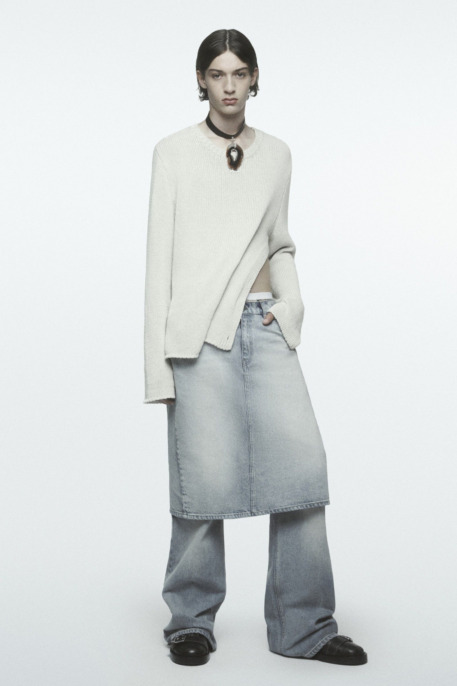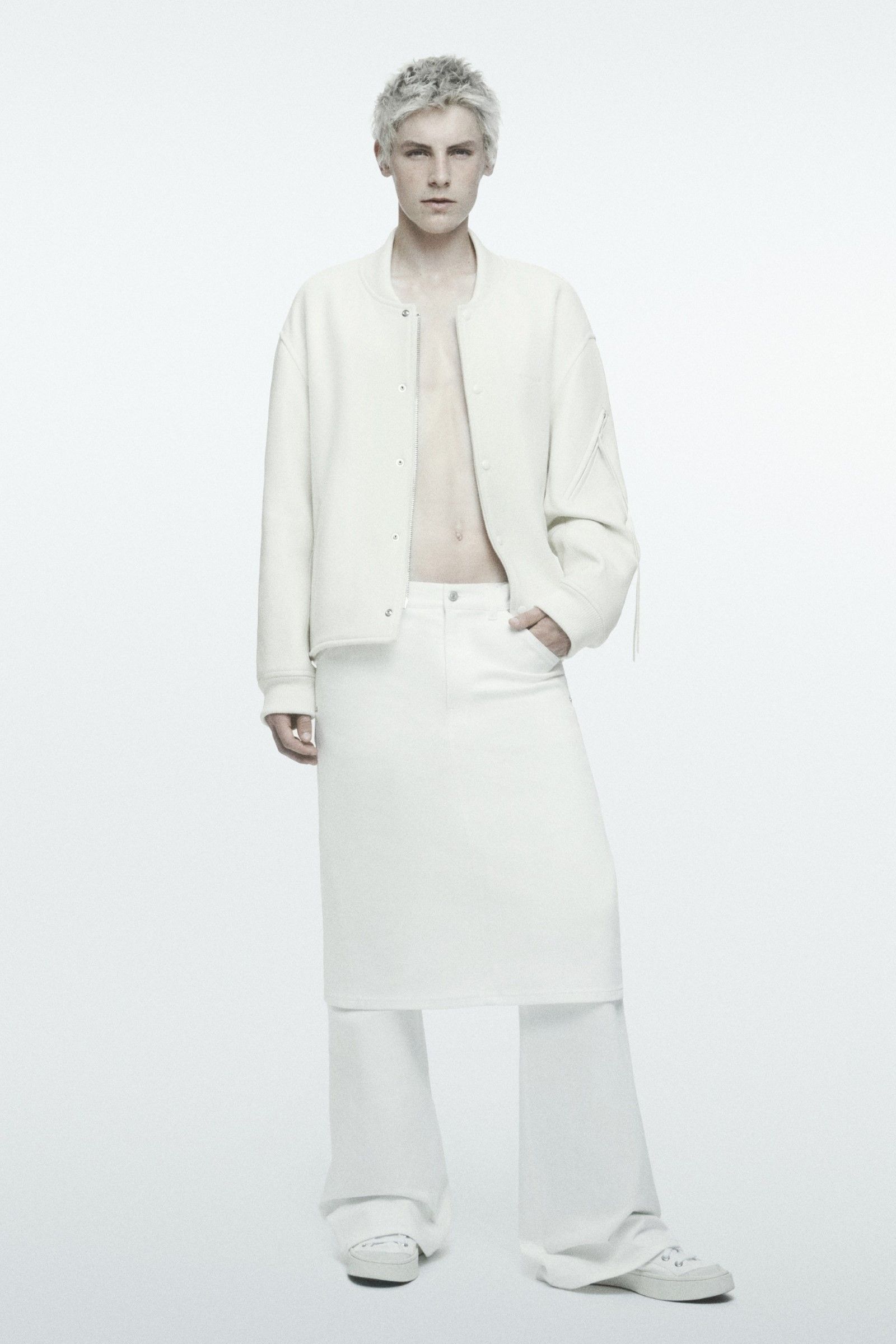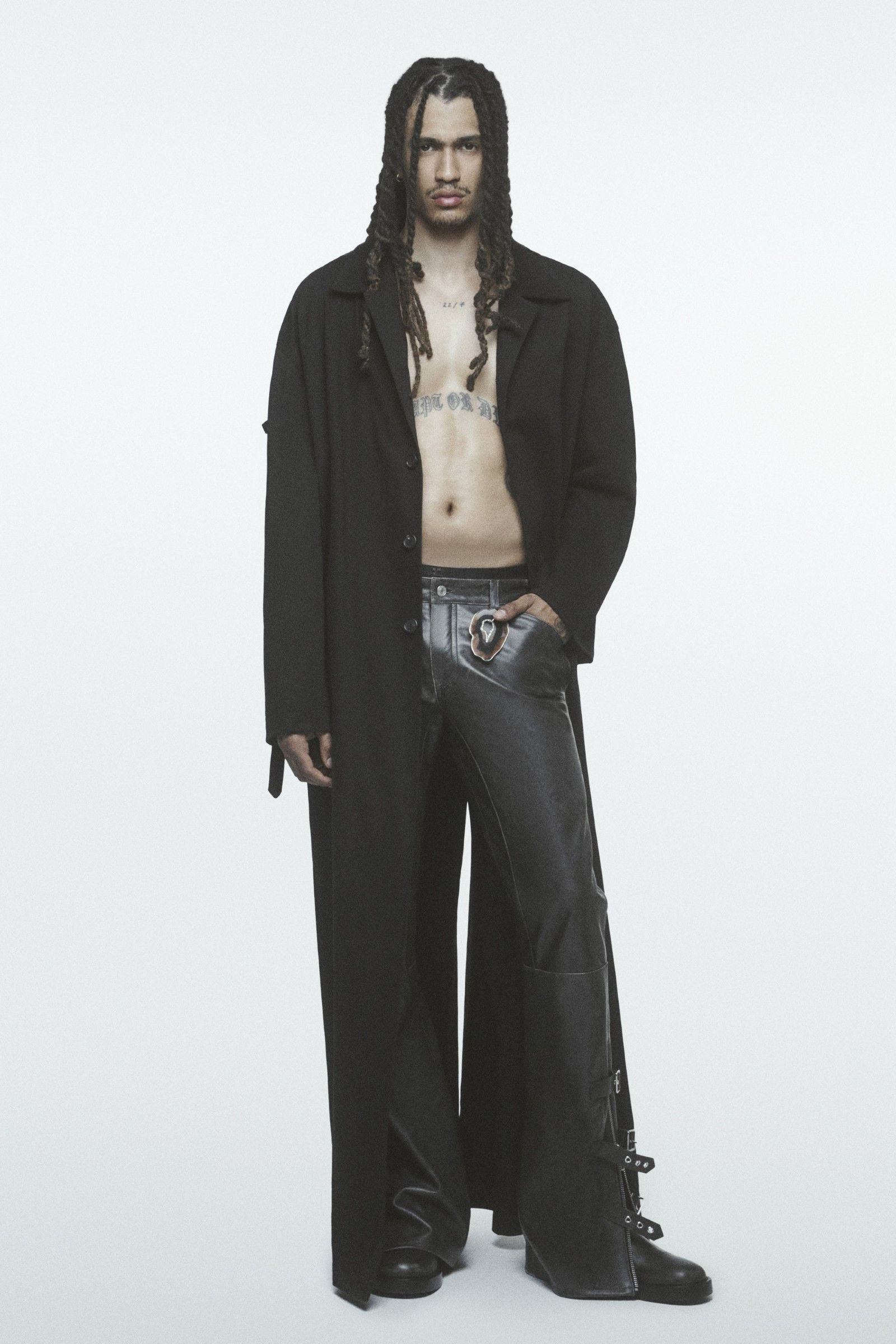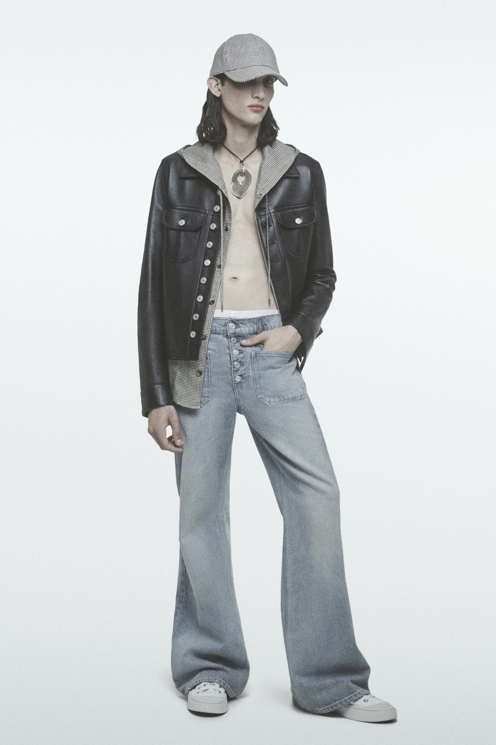 Tutte le molte caratteristiche che rendono modernissimi gli abiti vintage (e in particolar modo le giacche) e che sono ancora presenti nel nuovo Courrèges ma Di Felice le ha reinterpretate, in termini assai generali, attraverso design funzionali dalle linee terse, tessuti visivamente densi, geometrie essenziali e precise che si ritrovano nelle simmetrie e negli incastri dei diversi elementi sartoriali. Del tutto eliminati appaiono i colori sgargianti delle origini, il rosso a parte, così come i rigidi abiti in gabardine di lana anni ’70 sono diventati canotte asimmetriche, body e abiti in jersey e denim morbidi e trucker jacket dai grandi baveri. È interessante invece notare il discorso sui colori: Courrèges credeva che le donne dell’epoca fossero «arcaiche d’aspetto» e che si potessero «rendere più felici portando il bianco e i colori nelle loro vite» proprio perché i colori dominanti fino ad allora erano stati i grigi, i neri e i blu della couture classica – negli anni ’50 non si vedeva molto arancione in giro. Di Felice ha capovolto il ragionamento: essendo la nostra epoca anche troppo colorata, la sua palette è diventata più severa, rispondendo alle medesime esigenze con esiti opposti. È una proposta del tutto diversa da quella delle origini ma, allo stesso tempo, ne pare una prosecuzione ideale.