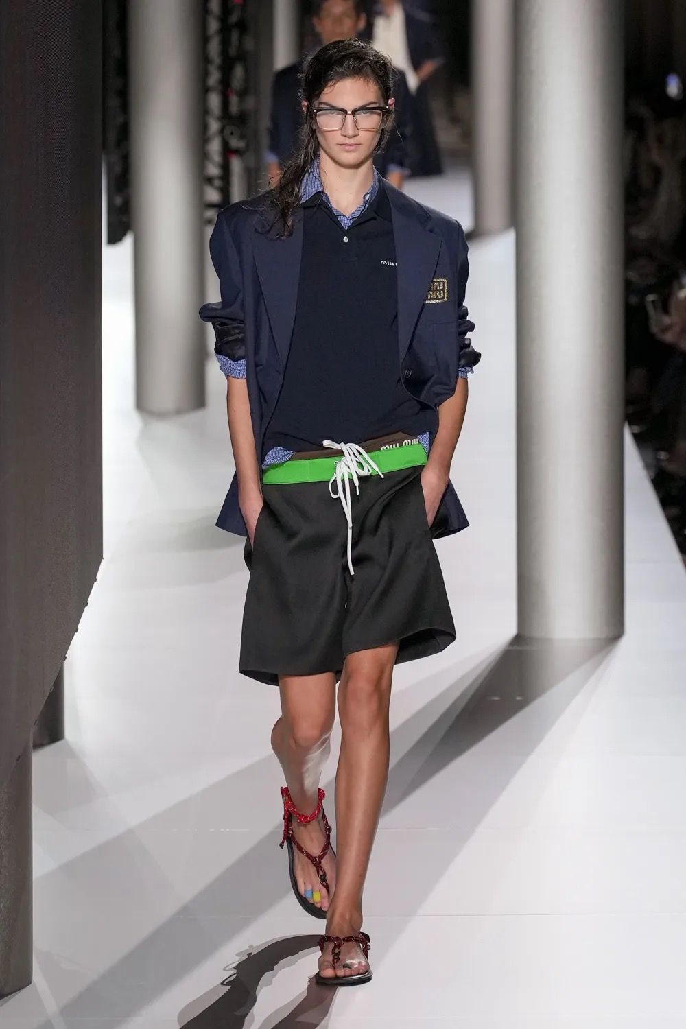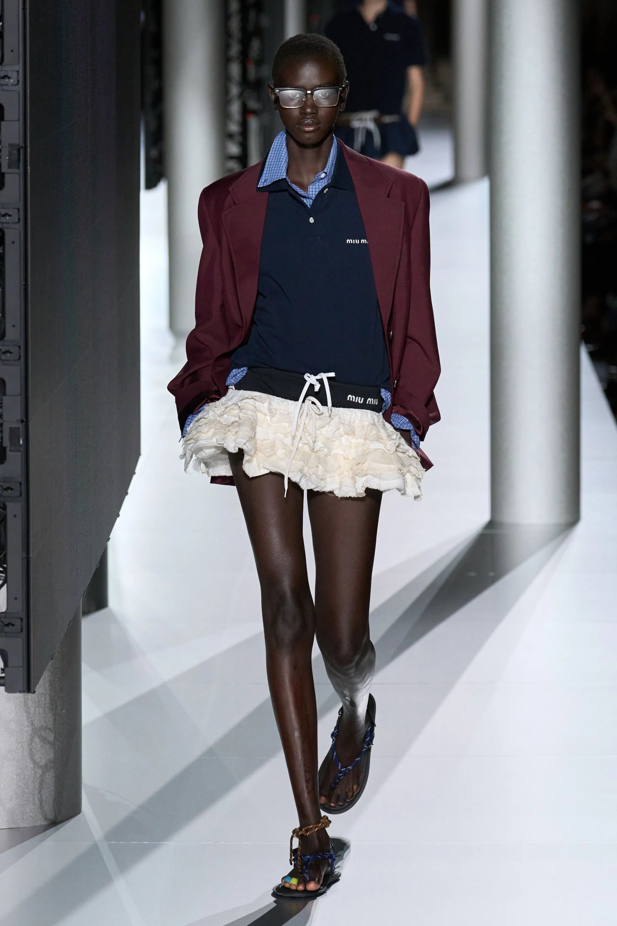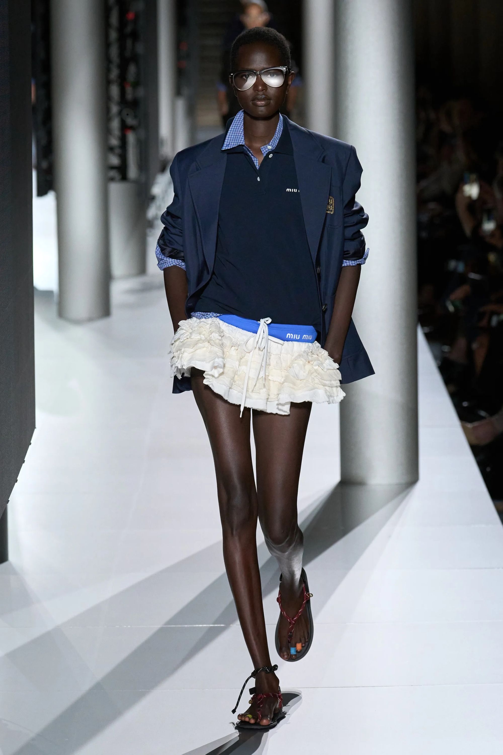 Lo show è iniziato con un forte boato, il richiamo dell’inizio di un temporale. Al termine del lampeggiare dei fulmini, il cast Miu Miu ha preso a sfilare a ritmo di una soundtrack solenne. Giacche blu oversize con le cifre del brand ricamate in oro sul petto hanno coperto le spalle di modelle in slip da nuoto maschili, sostituiti poi da gonne in cotone blu elettrico, minigonne a palloncino ricche di frou frou e di balze bianche o blu notte. Ai piedi sfoggiavano sandali colorati, alle caviglie quelli che potevano essere braccialetti dell’amicizia. I primi look della SS24 di Miu Miu hanno evocato le immagini di un'estate in collegio, dall’uniforme rubata al ragazzo della classe accanto ai costumi della squadra di canottaggio che penzolavano da borse in pelle marrone, ricche di cianfrusaglie. Gli accostamenti sono stati volutamente creati per sembrare affrettati, sintomo di una routine mattutina compiuta svogliatamente e senza troppa attenzione, perché il completo da indossare è sempre il solito e la sveglia non è stata sentita.