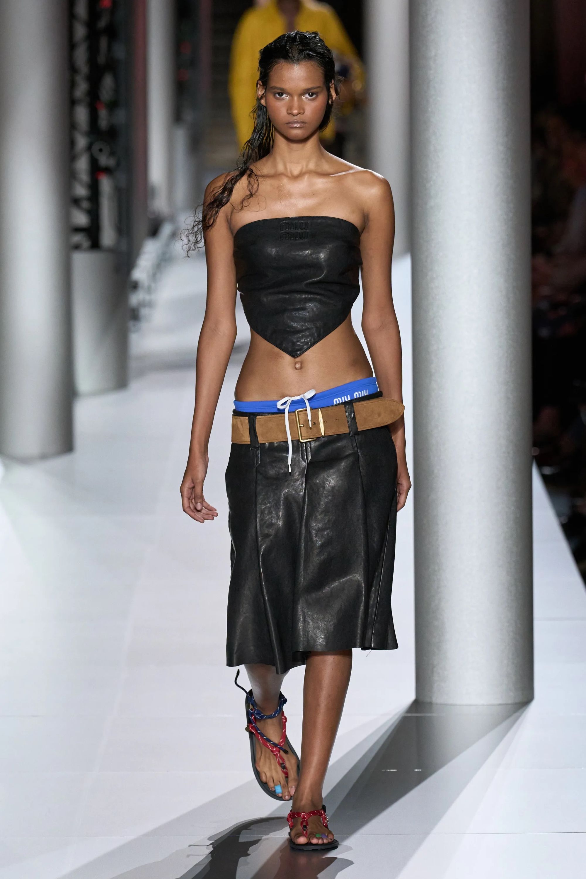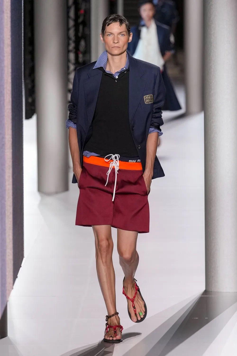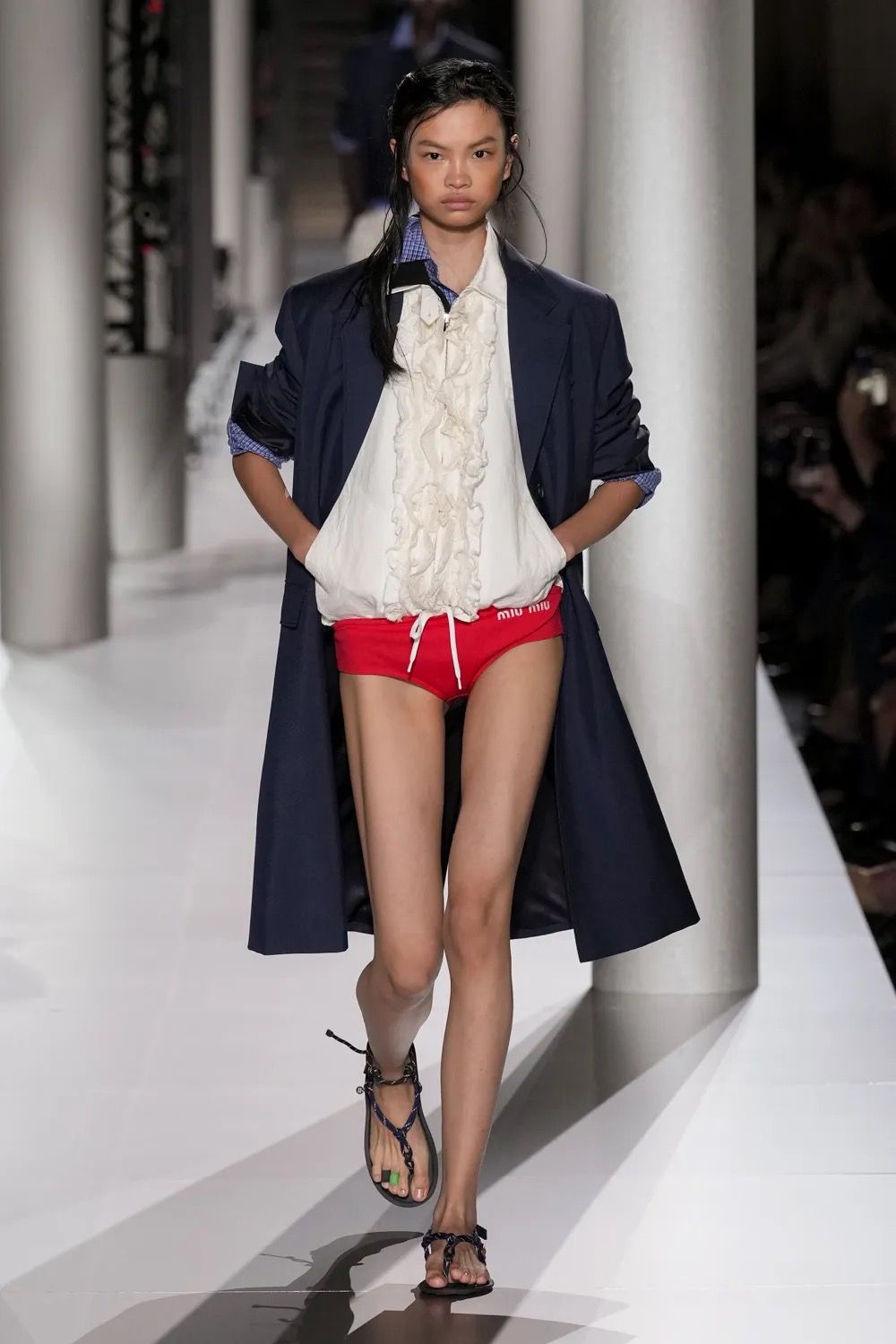 Lo show è iniziato con un forte boato, il richiamo dell’inizio di un temporale. Al termine del lampeggiare dei fulmini, il cast Miu Miu ha preso a sfilare a ritmo di una soundtrack solenne. Giacche blu oversize con le cifre del brand ricamate in oro sul petto hanno coperto le spalle di modelle in slip da nuoto maschili, sostituiti poi da gonne in cotone blu elettrico, minigonne a palloncino ricche di frou frou e di balze bianche o blu notte. Ai piedi sfoggiavano sandali colorati, alle caviglie quelli che potevano essere braccialetti dell’amicizia. I primi look della SS24 di Miu Miu hanno evocato le immagini di un'estate in collegio, dall’uniforme rubata al ragazzo della classe accanto ai costumi della squadra di canottaggio che penzolavano da borse in pelle marrone, ricche di cianfrusaglie. Gli accostamenti sono stati volutamente creati per sembrare affrettati, sintomo di una routine mattutina compiuta svogliatamente e senza troppa attenzione, perché il completo da indossare è sempre il solito e la sveglia non è stata sentita.