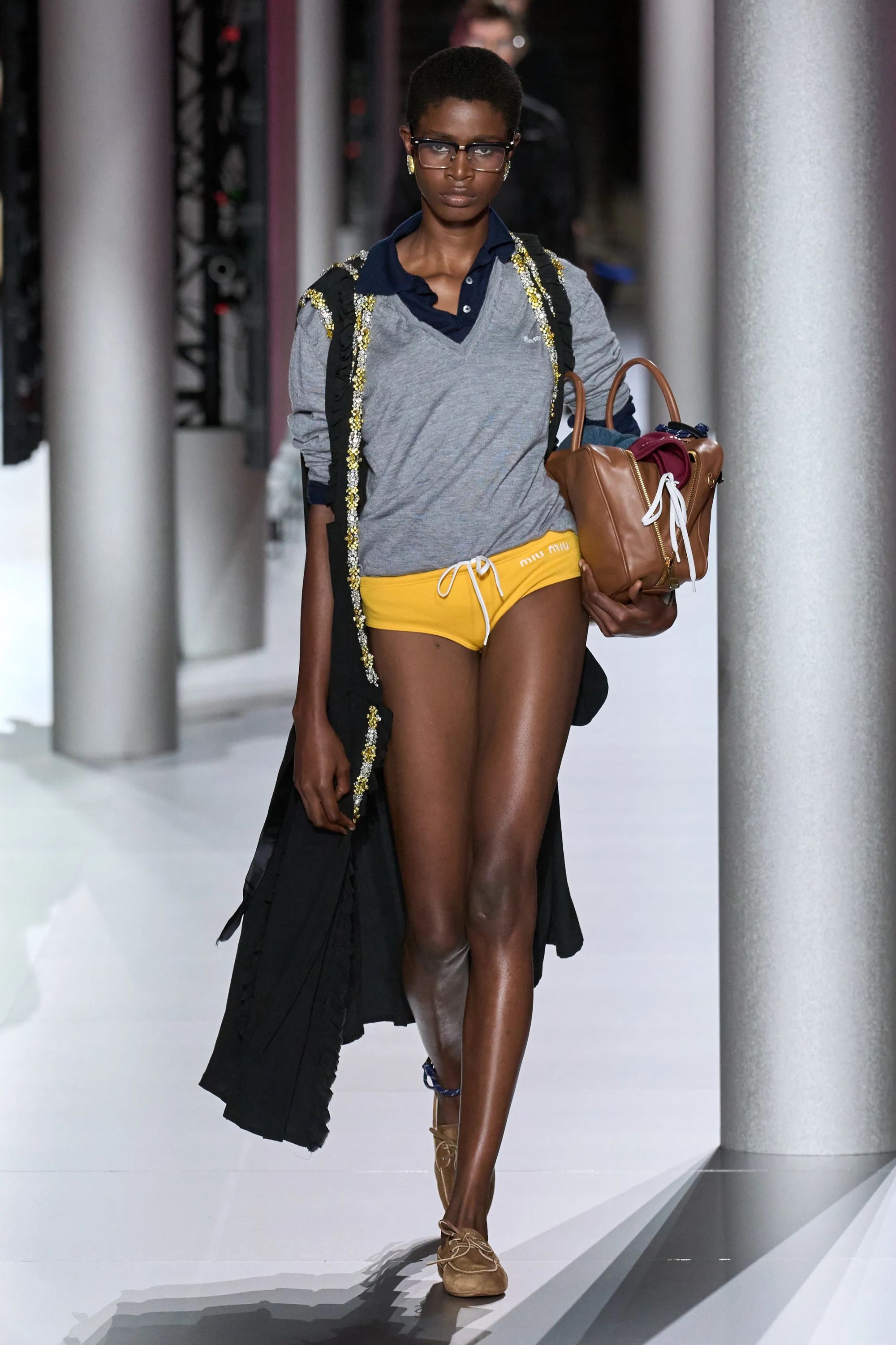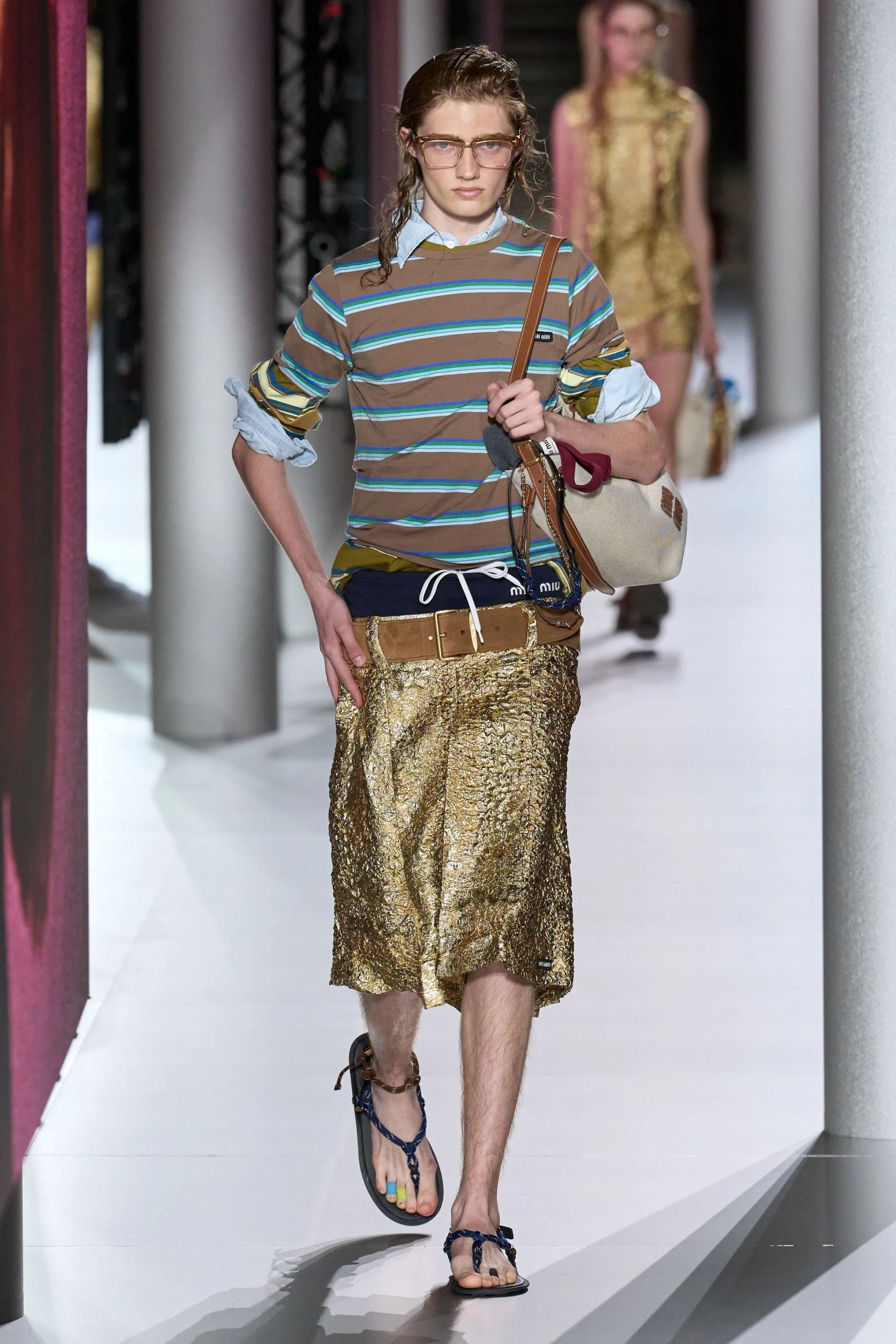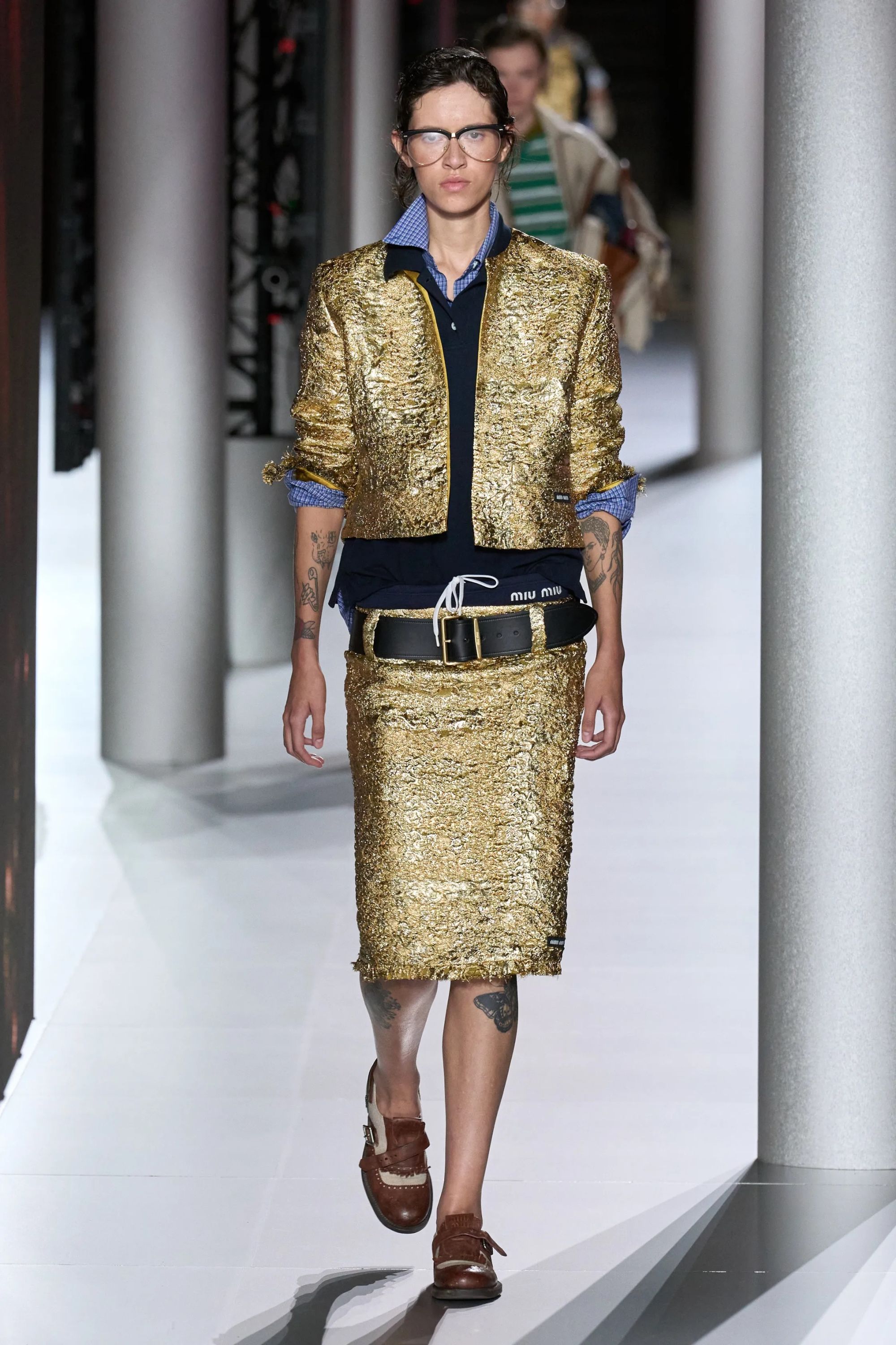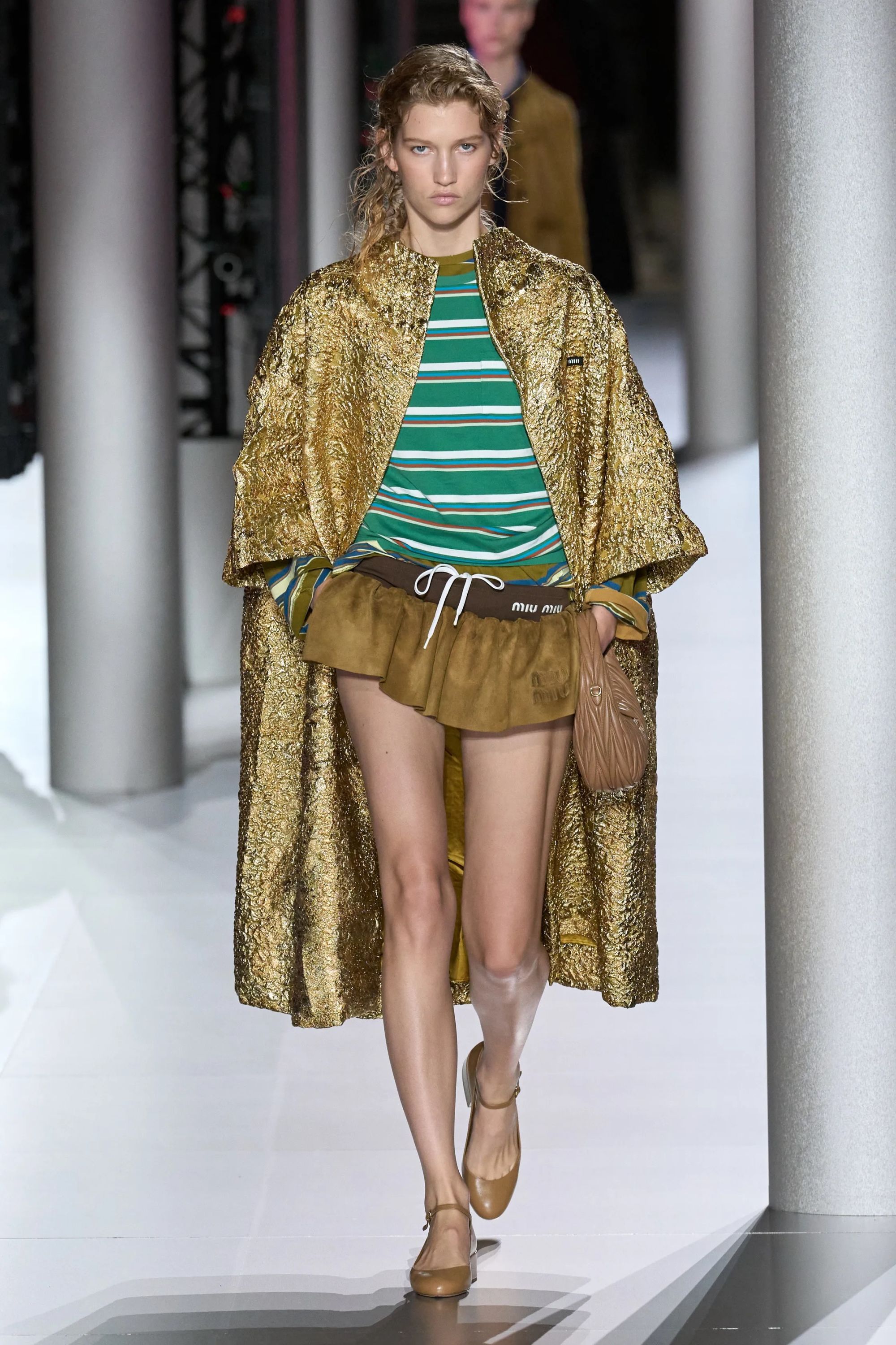 Alcuni look hanno aggiunto un altro elemento vecchia scuola tramite abiti drop waist in ricami di paillette dorate e camicie da notte color avorio, mentre sono state inserite, al fianco delle Church della stagione scorsa - questa volta slacciate, chiuse malamente - nuove proposte footwear, dalle scarpe da barca a delle nuove sneaker New Balance. Con indumenti appartenenti ad un immaginario classico e classista, legato alla vita in campus e alle feste organizzate all’oscuro dei professori, lo styling di Miu Miu ha portato in passerella un’opera di narrativa il cui climax è stato introdotto da un drammatico cambio di ritmo, della musica come dei look. Dopo aver ribadito alcuni dei codici portanti del brand, tra la vita bassa, il layering verde menta e lo scontro tra sportswear e stile preppy, la passerella ha visto l’arrivo di modelle con il volto preoccupato. Indossando mantelle coprenti, tailleur e abiti in un materiale simile a quello dei teli isotermici, i look in carta dorata hanno motivato lo spettatore a domandarsi se, durante la festa in barca di Miu Miu, non fosse avvenuto un naufragio.