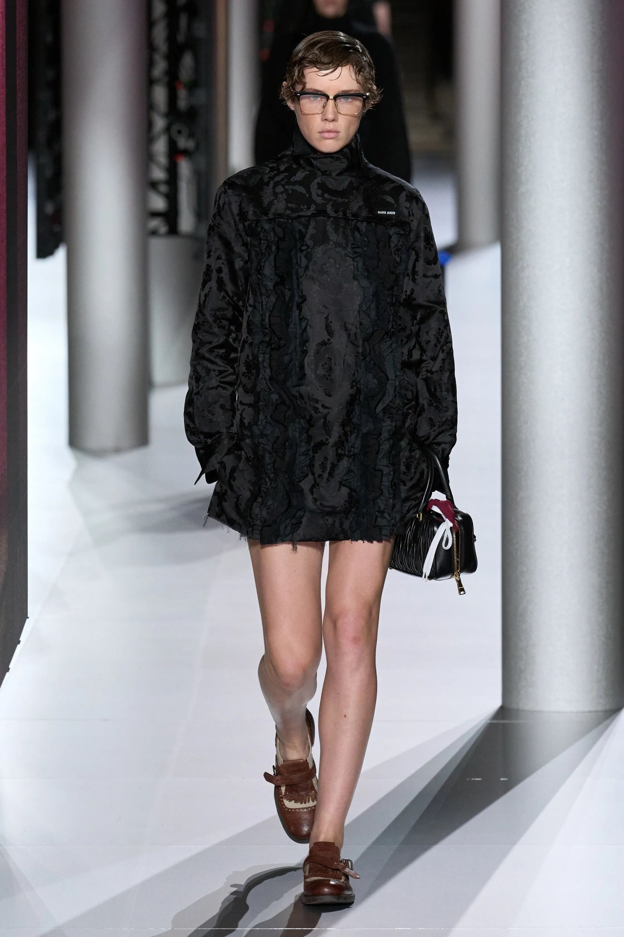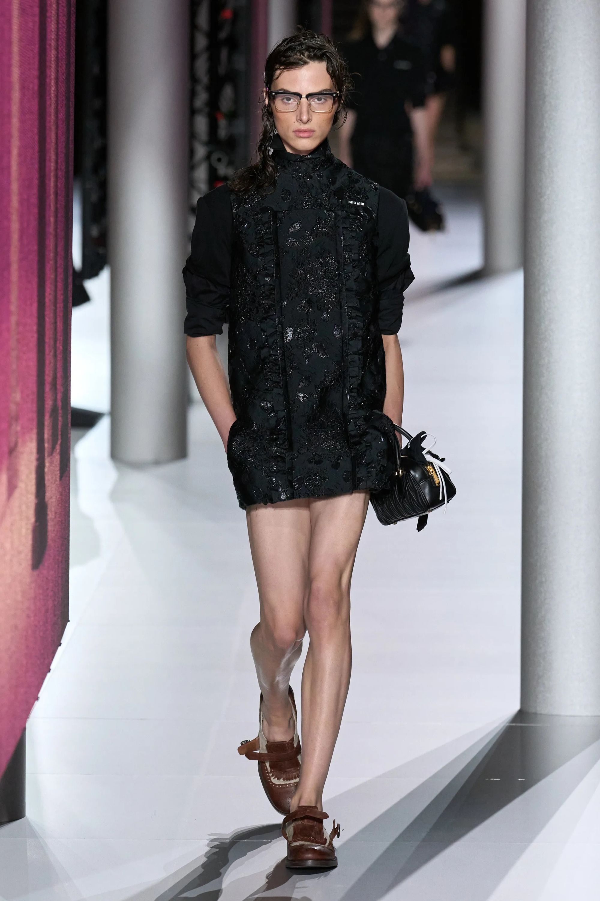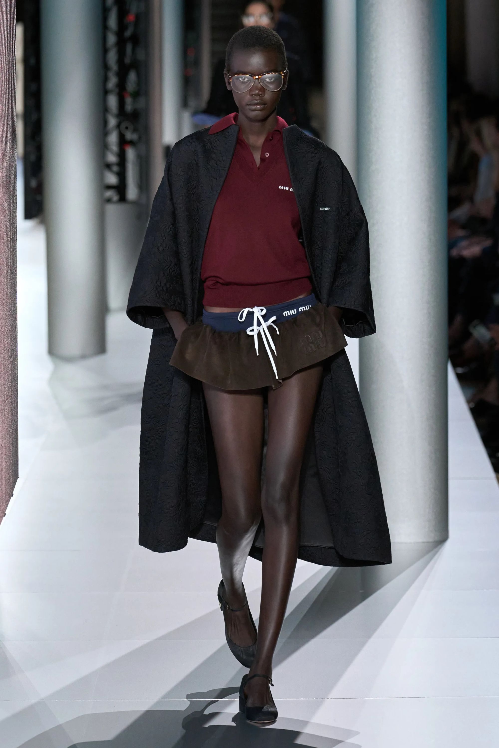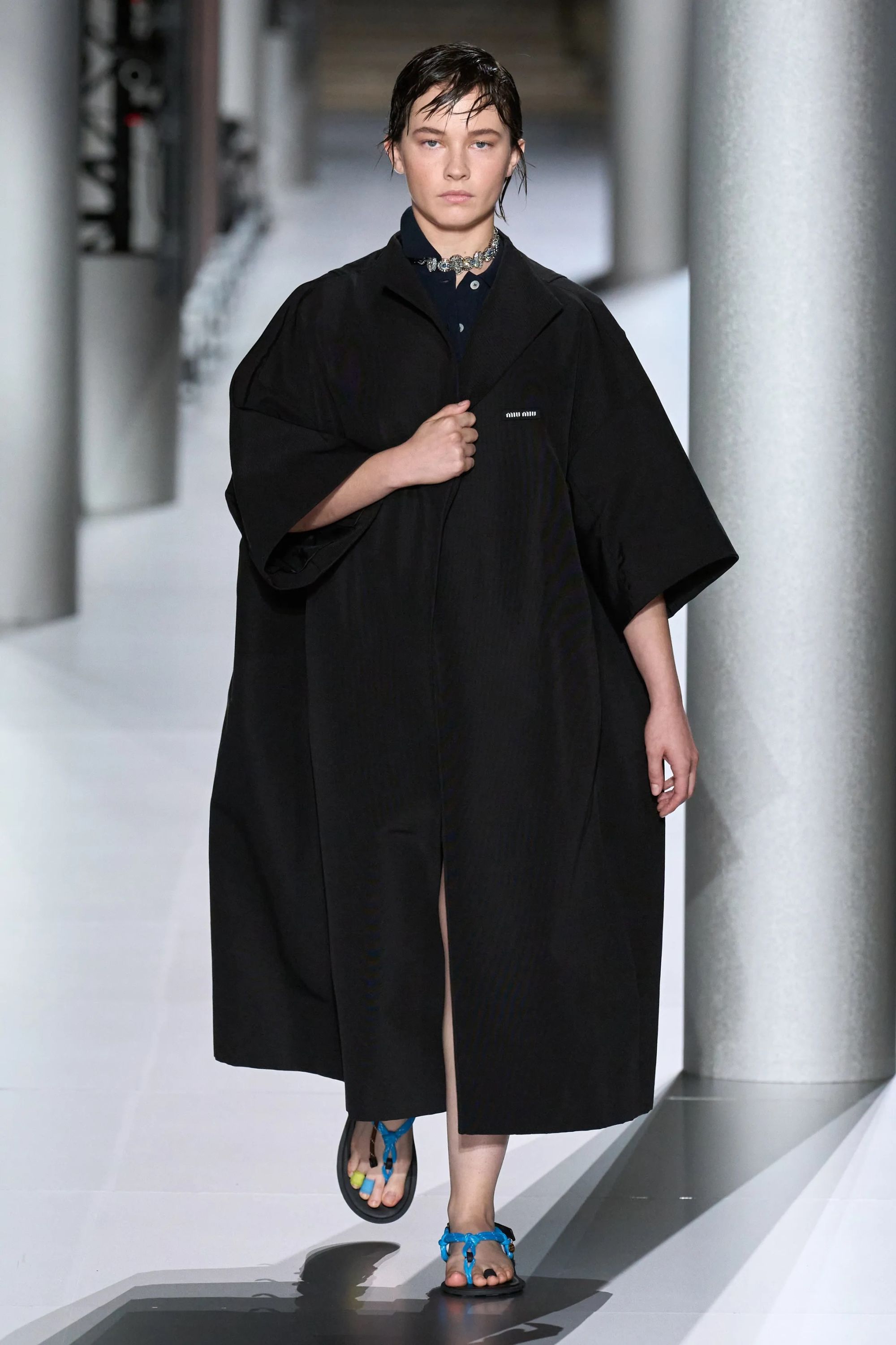 Alcuni look hanno aggiunto un altro elemento vecchia scuola tramite abiti drop waist in ricami di paillette dorate e camicie da notte color avorio, mentre sono state inserite, al fianco delle Church della stagione scorsa - questa volta slacciate, chiuse malamente - nuove proposte footwear, dalle scarpe da barca a delle nuove sneaker New Balance. Con indumenti appartenenti ad un immaginario classico e classista, legato alla vita in campus e alle feste organizzate all’oscuro dei professori, lo styling di Miu Miu ha portato in passerella un’opera di narrativa il cui climax è stato introdotto da un drammatico cambio di ritmo, della musica come dei look. Dopo aver ribadito alcuni dei codici portanti del brand, tra la vita bassa, il layering verde menta e lo scontro tra sportswear e stile preppy, la passerella ha visto l’arrivo di modelle con il volto preoccupato. Indossando mantelle coprenti, tailleur e abiti in un materiale simile a quello dei teli isotermici, i look in carta dorata hanno motivato lo spettatore a domandarsi se, durante la festa in barca di Miu Miu, non fosse avvenuto un naufragio.