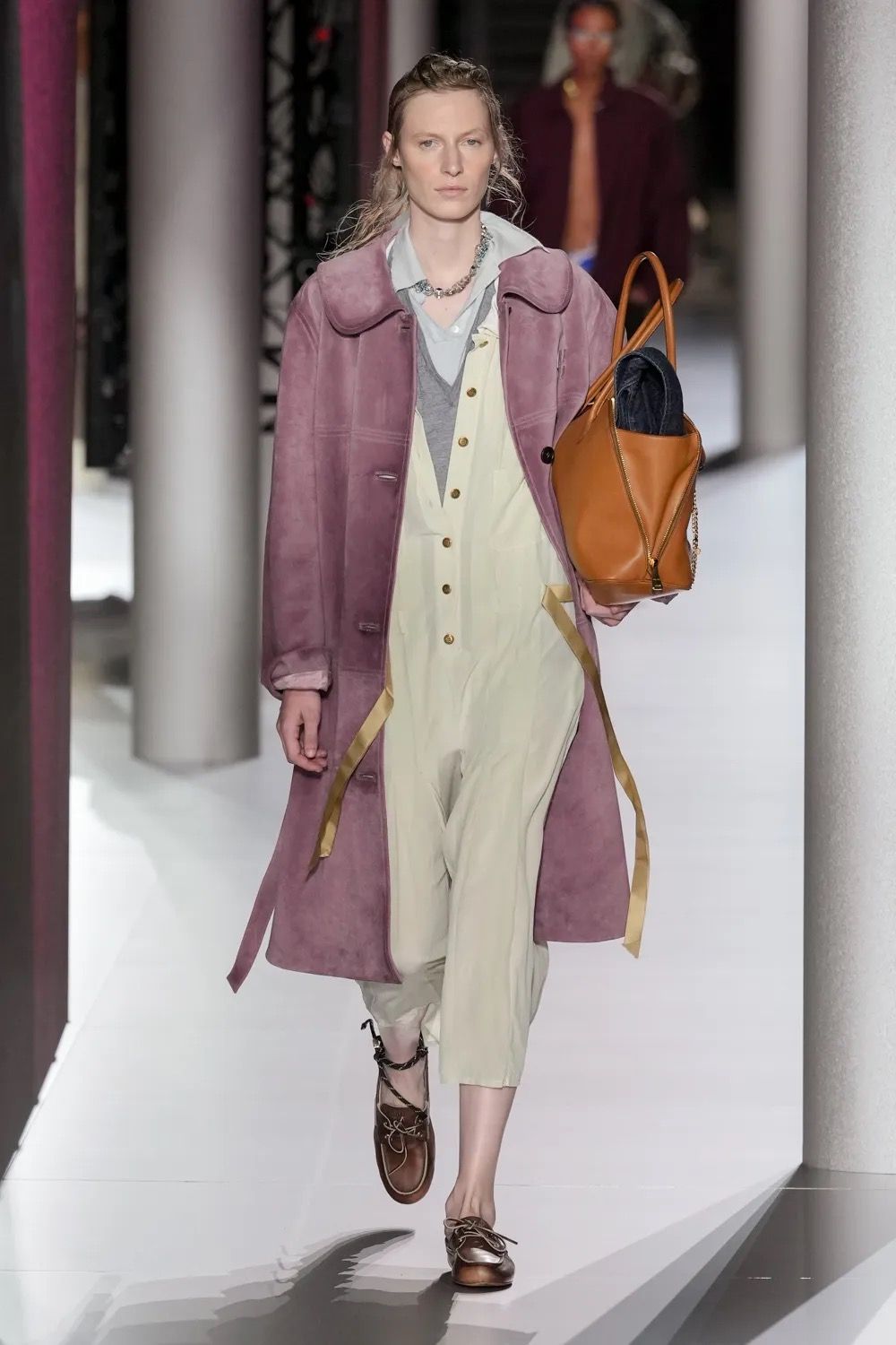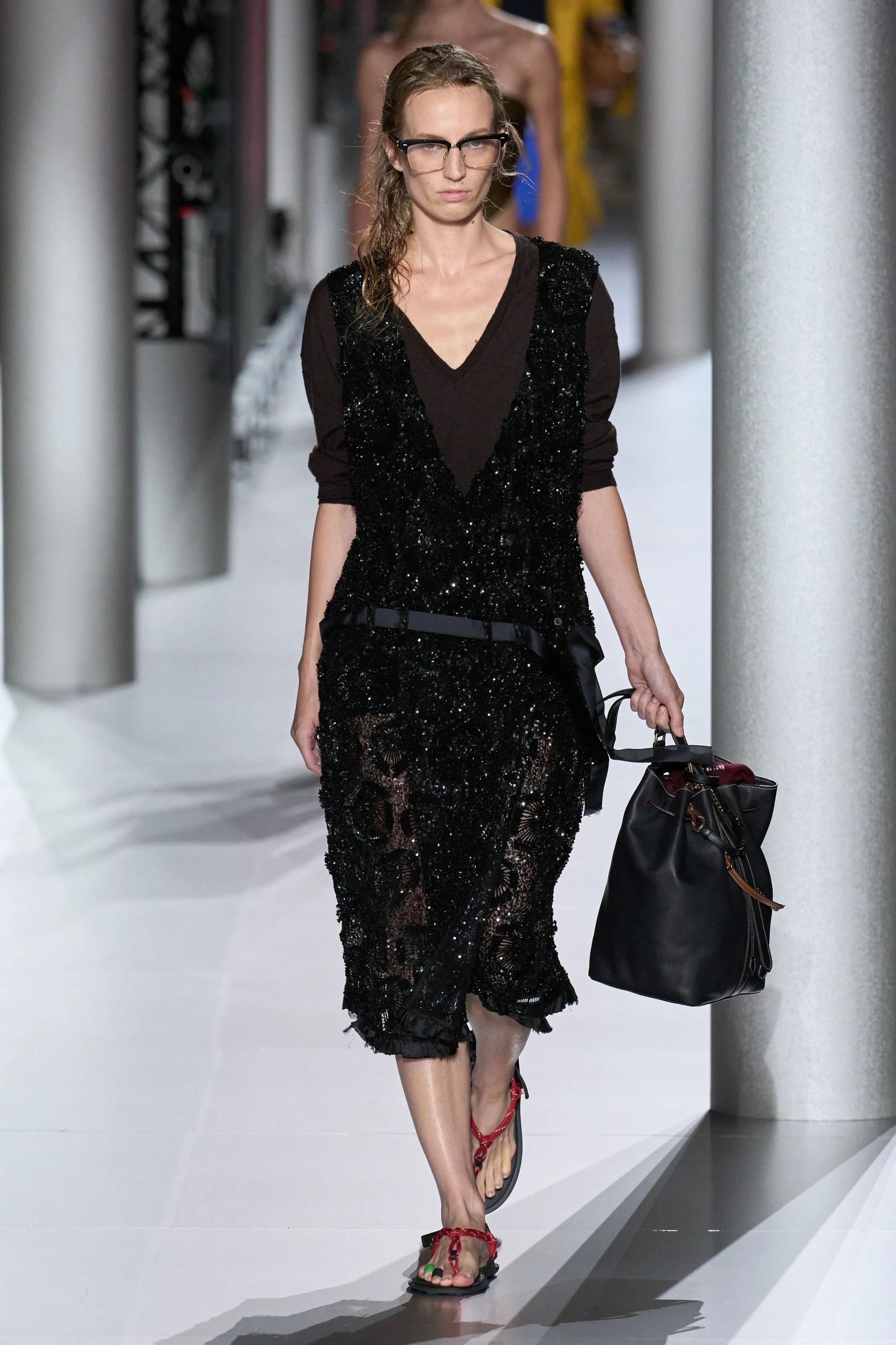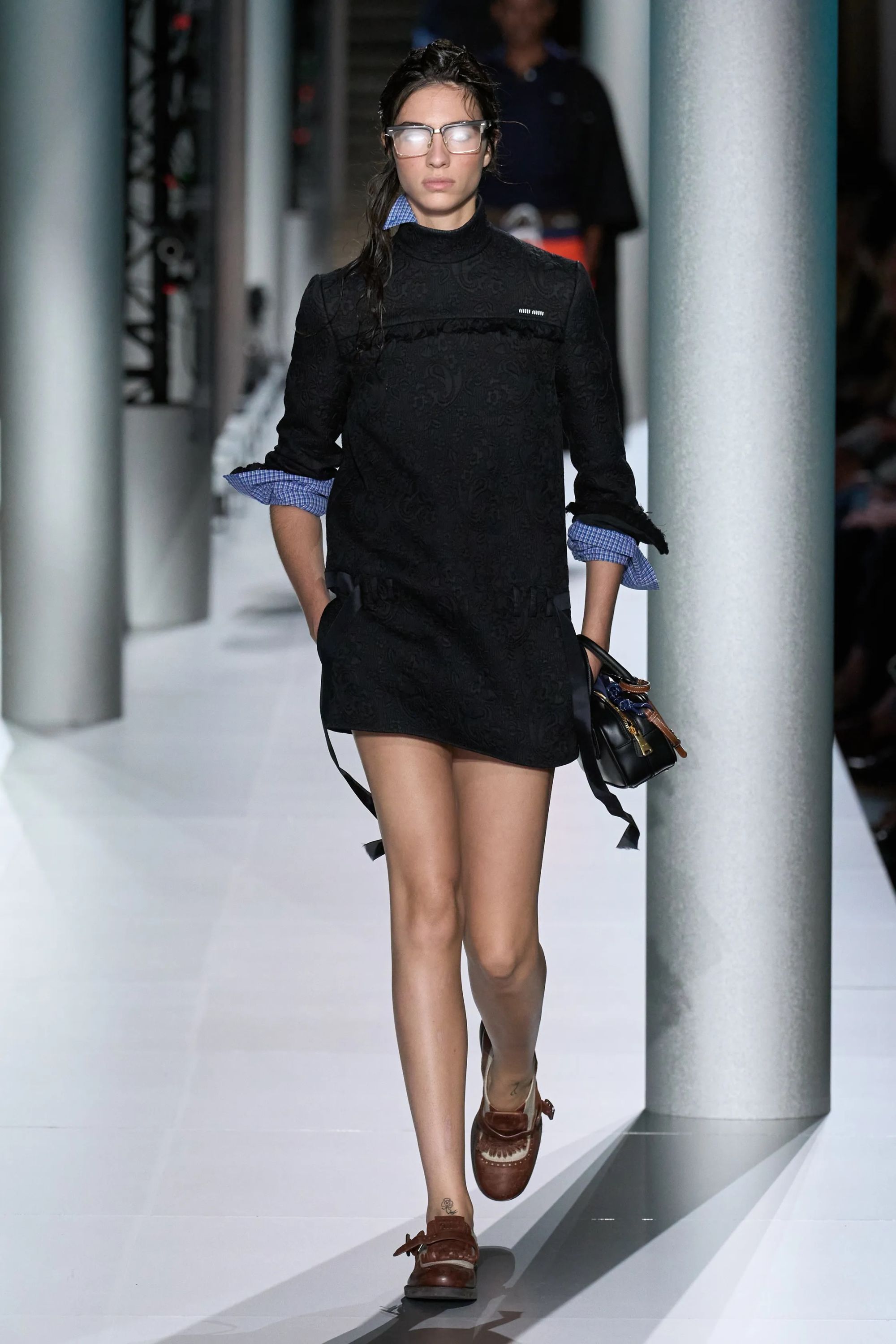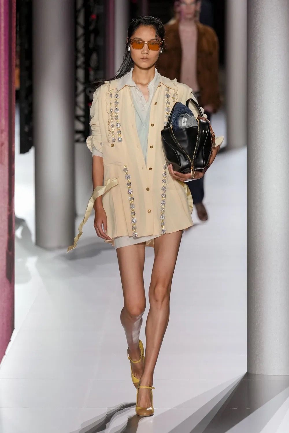 Alcuni look hanno aggiunto un altro elemento vecchia scuola tramite abiti drop waist in ricami di paillette dorate e camicie da notte color avorio, mentre sono state inserite, al fianco delle Church della stagione scorsa - questa volta slacciate, chiuse malamente - nuove proposte footwear, dalle scarpe da barca a delle nuove sneaker New Balance. Con indumenti appartenenti ad un immaginario classico e classista, legato alla vita in campus e alle feste organizzate all’oscuro dei professori, lo styling di Miu Miu ha portato in passerella un’opera di narrativa il cui climax è stato introdotto da un drammatico cambio di ritmo, della musica come dei look. Dopo aver ribadito alcuni dei codici portanti del brand, tra la vita bassa, il layering verde menta e lo scontro tra sportswear e stile preppy, la passerella ha visto l’arrivo di modelle con il volto preoccupato. Indossando mantelle coprenti, tailleur e abiti in un materiale simile a quello dei teli isotermici, i look in carta dorata hanno motivato lo spettatore a domandarsi se, durante la festa in barca di Miu Miu, non fosse avvenuto un naufragio.